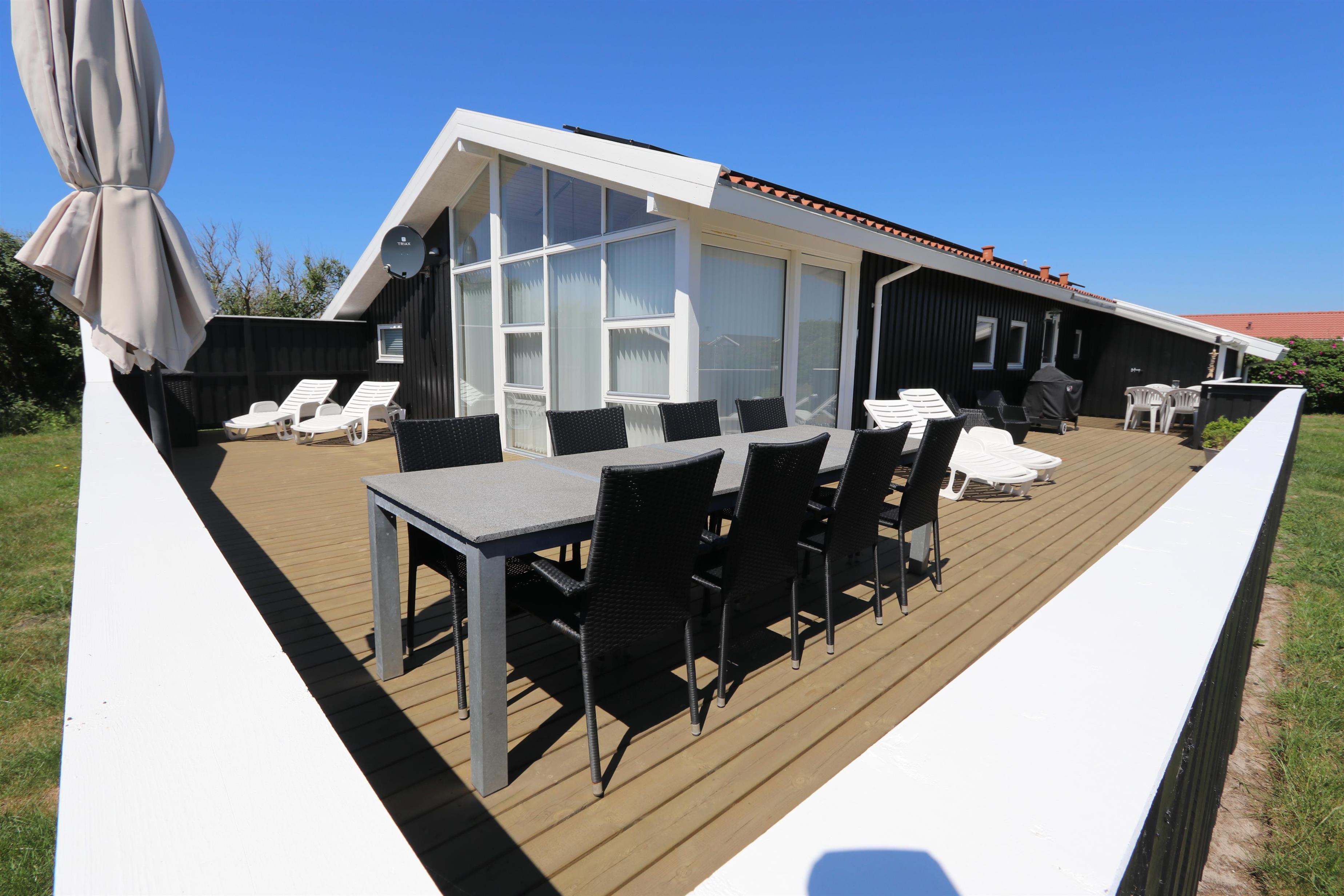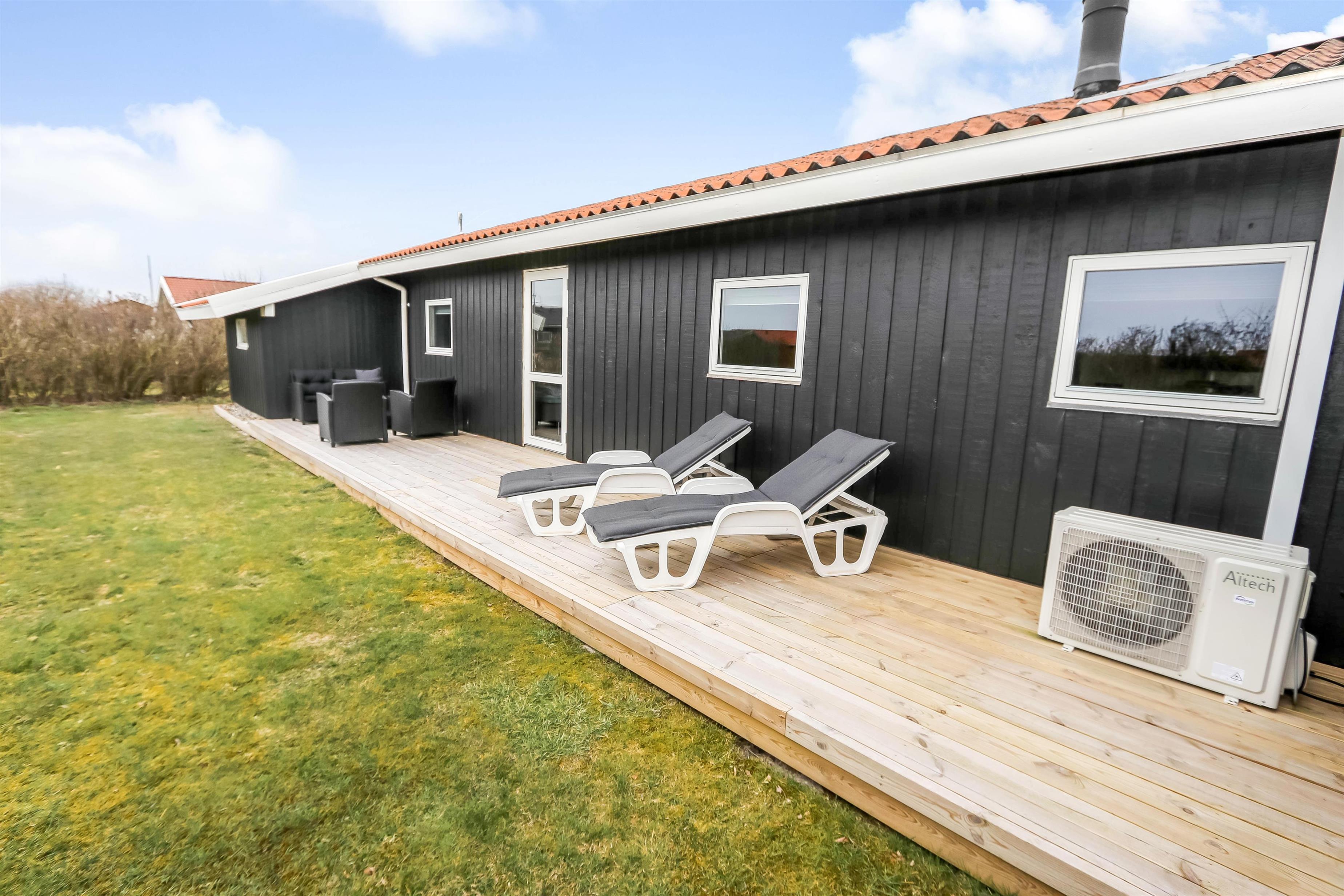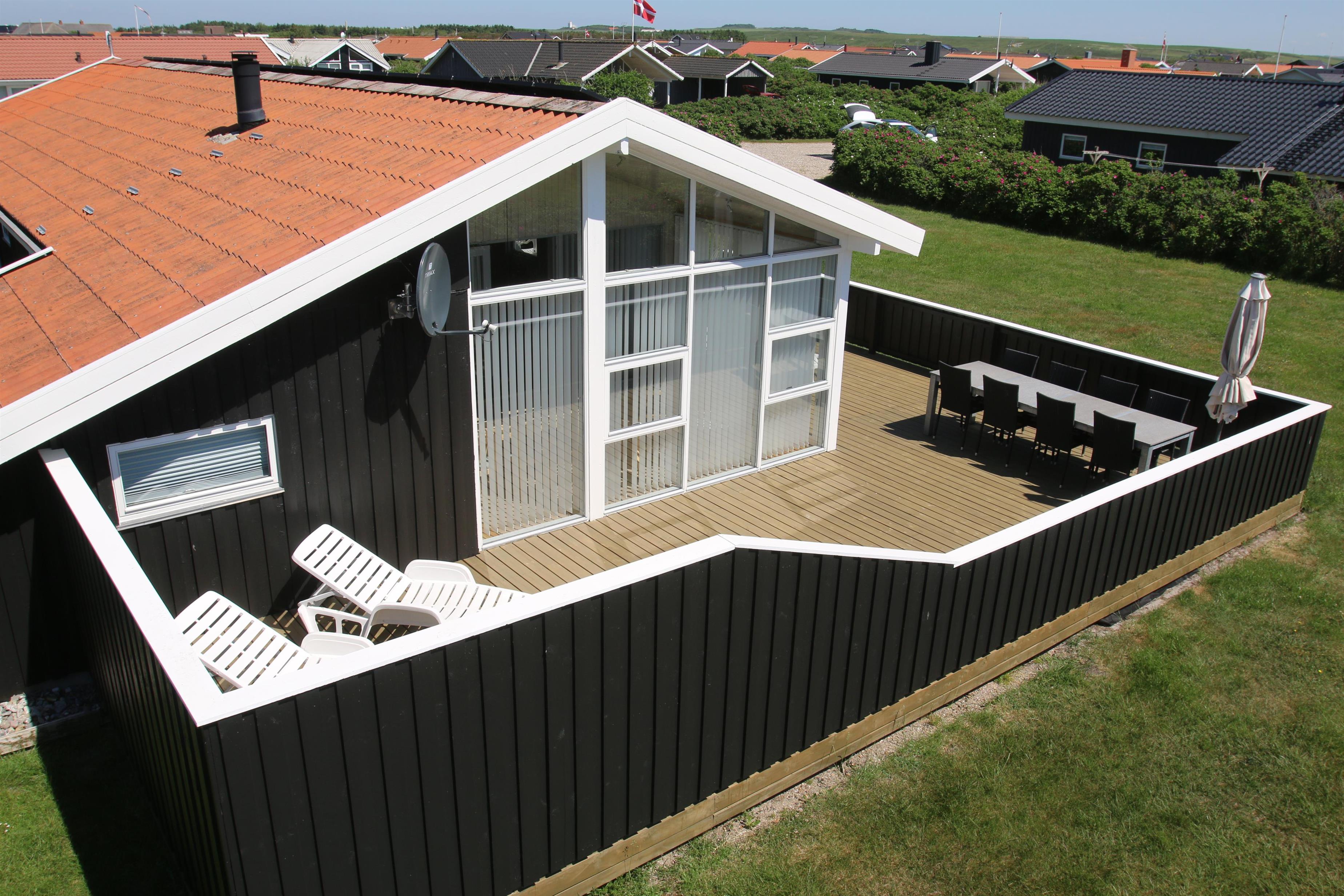Huset er omgivet at et stort træterrasseanlæg som i 2022 er udvidet med en dejlig vestterrasse. Hele terrassen er omkranset af et stakit. Havemøbler, parasol og grill. Området omkring Vejlby og Ferring sø ligger ikke langt fra det brusende Vesterhav, indkøbsmuligheder, legeplads og stranden. Naturen indbyder til udendørsaktiviteter året rundt - uanset om det er gåture i landskabet omkring søen eller en strandtur. Der er ikke langt til dagligvarebutikker i både Vejlby og Harboøre - Og er du i bil kan du køre til Lemvig - 'Smilets by' eller den meget populære turistby Thyborøn, hvor du begge steder finder flere dagligvarebutikker samt velfungerende detailhandel.