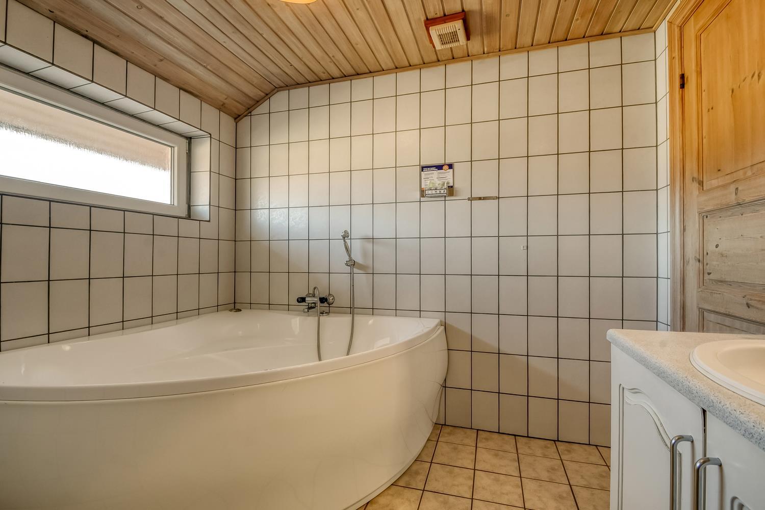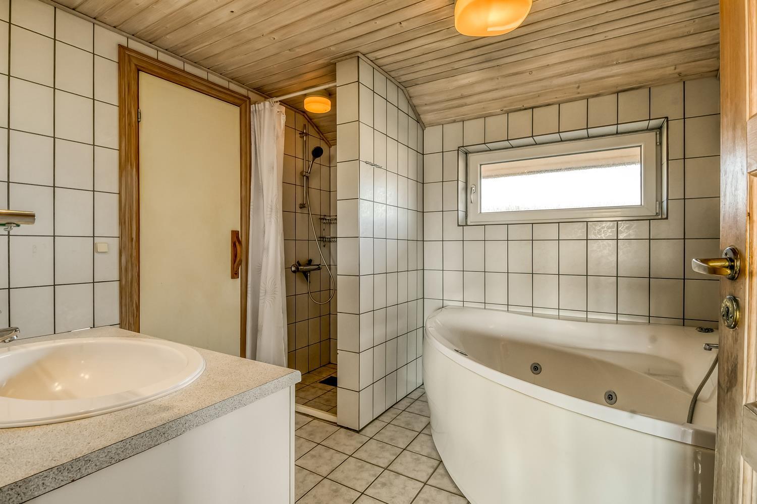 Der findes to dejlige badeværelser, hvoraf det ene byder på en luksuriøs 2-personers whirlpool og direkte adgang til husets sauna – en ideel oase efter en dag ved havet.