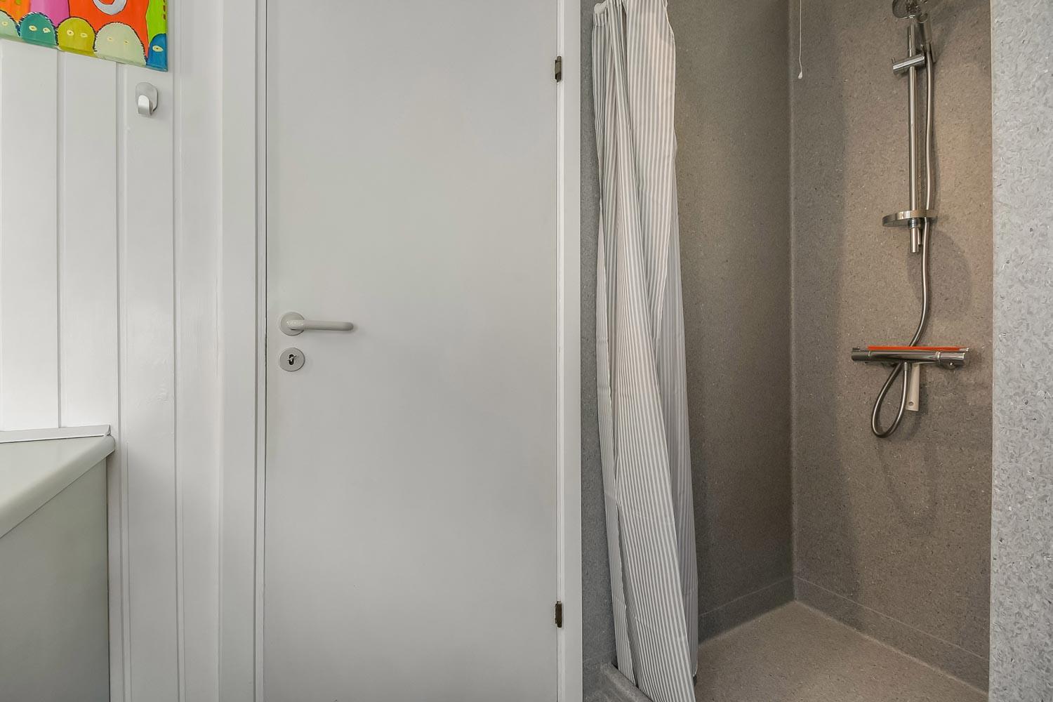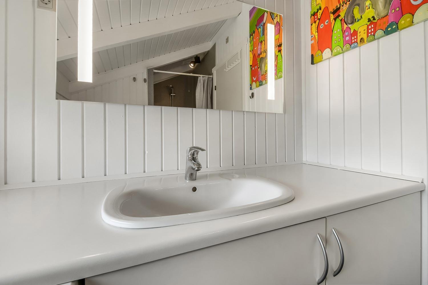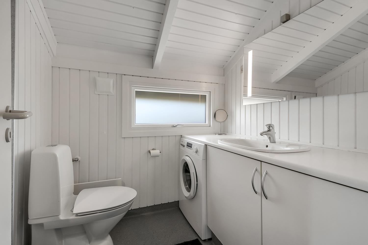 Badeværelset er indrettet med toilet, håndvask og ny brusekabine samt vaskemaskine. Huset er desuden udstyret med en varmepumpe, der giver mulighed for at holde energiforbruget nede, uden at det går ud over komforten.
