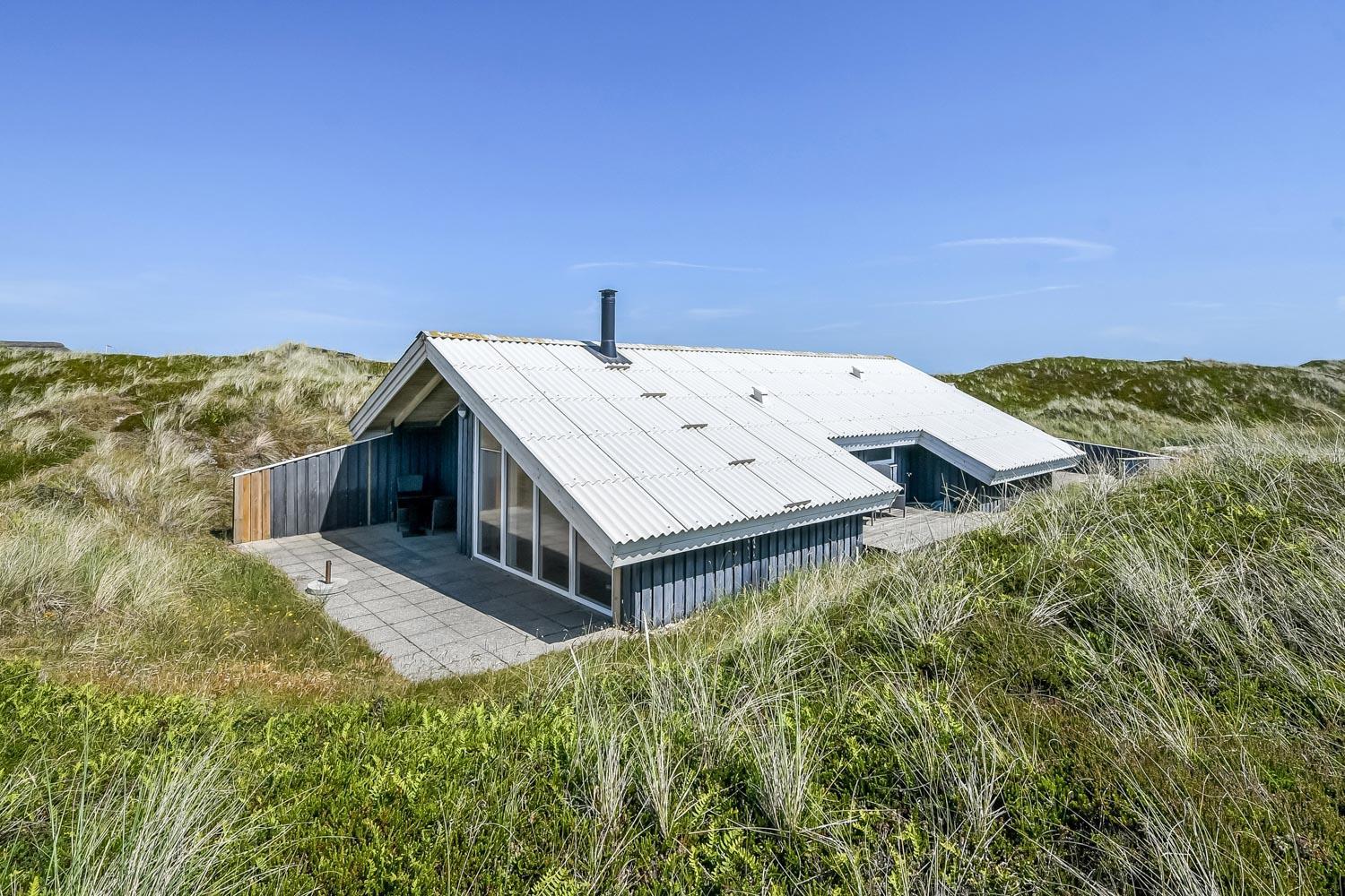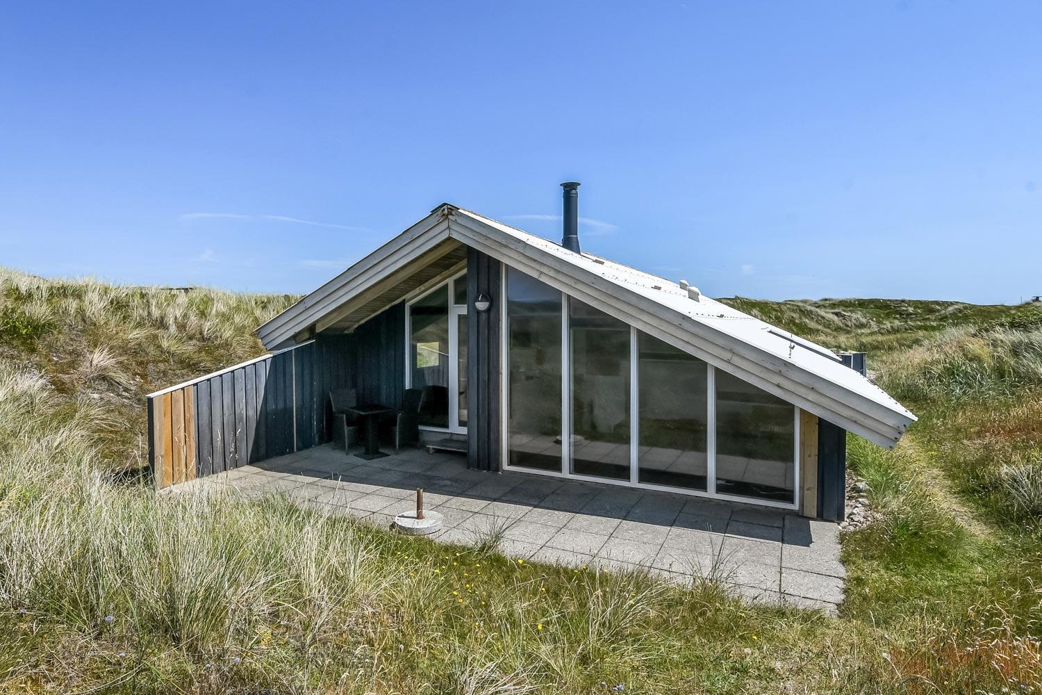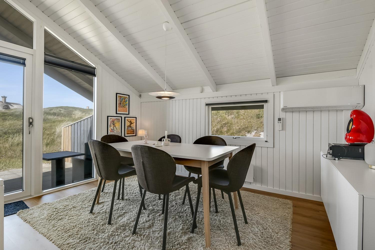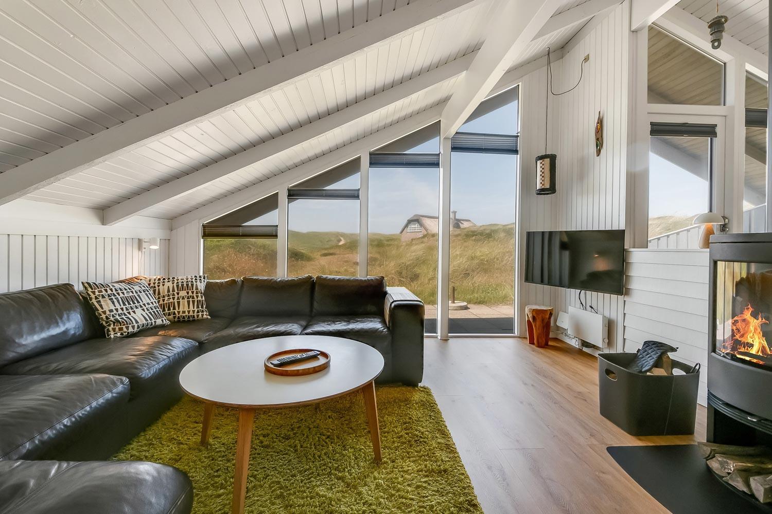 Når I ankommer til huset, vil I straks bemærke den unikke beliggenhed i en klitgryde, hvorfra I kan nyde den betagende udsigt over klitterne. Indvendigt er huset moderne og indbydende, og det er blevet malet i lyse, friske farver, hvilket skaber en åben og behagelig atmosfære. Den rummelige stue har en forsænket pejsestue med komfortable møbler, perfekt til afslapning foran den hyggelige brændeovn. Her er også et TV med både danske og tyske programmer. Spiseafdelingen giver dig et fantastisk udsyn over klitterne og naturen omkring huset, hvilket gør måltiderne endnu mere specielle.