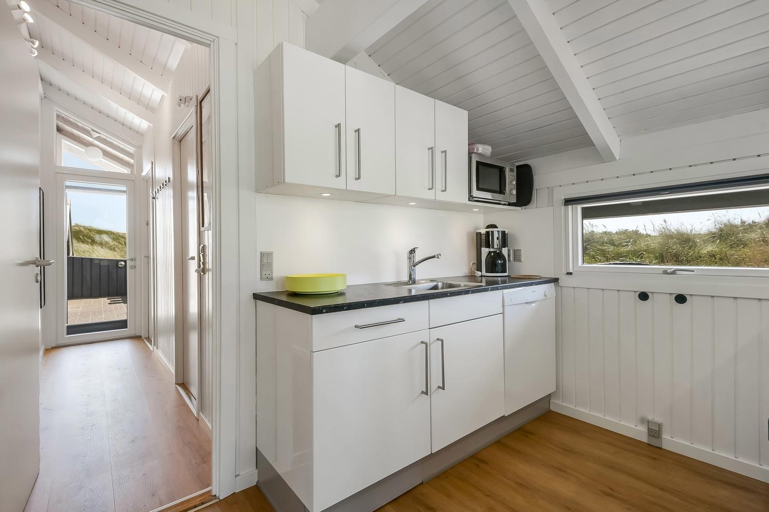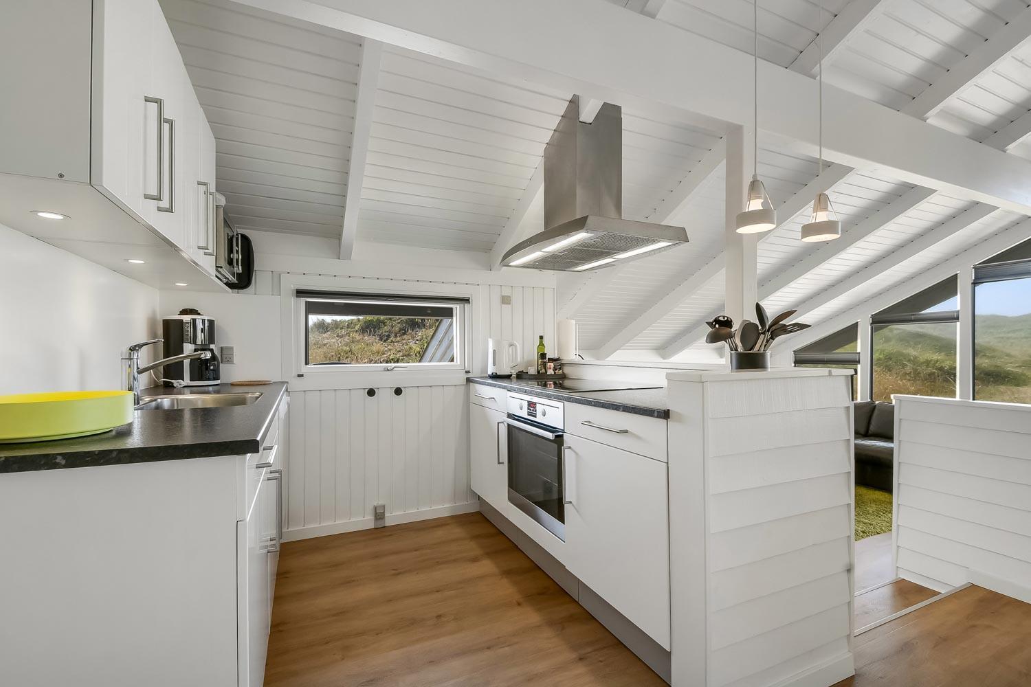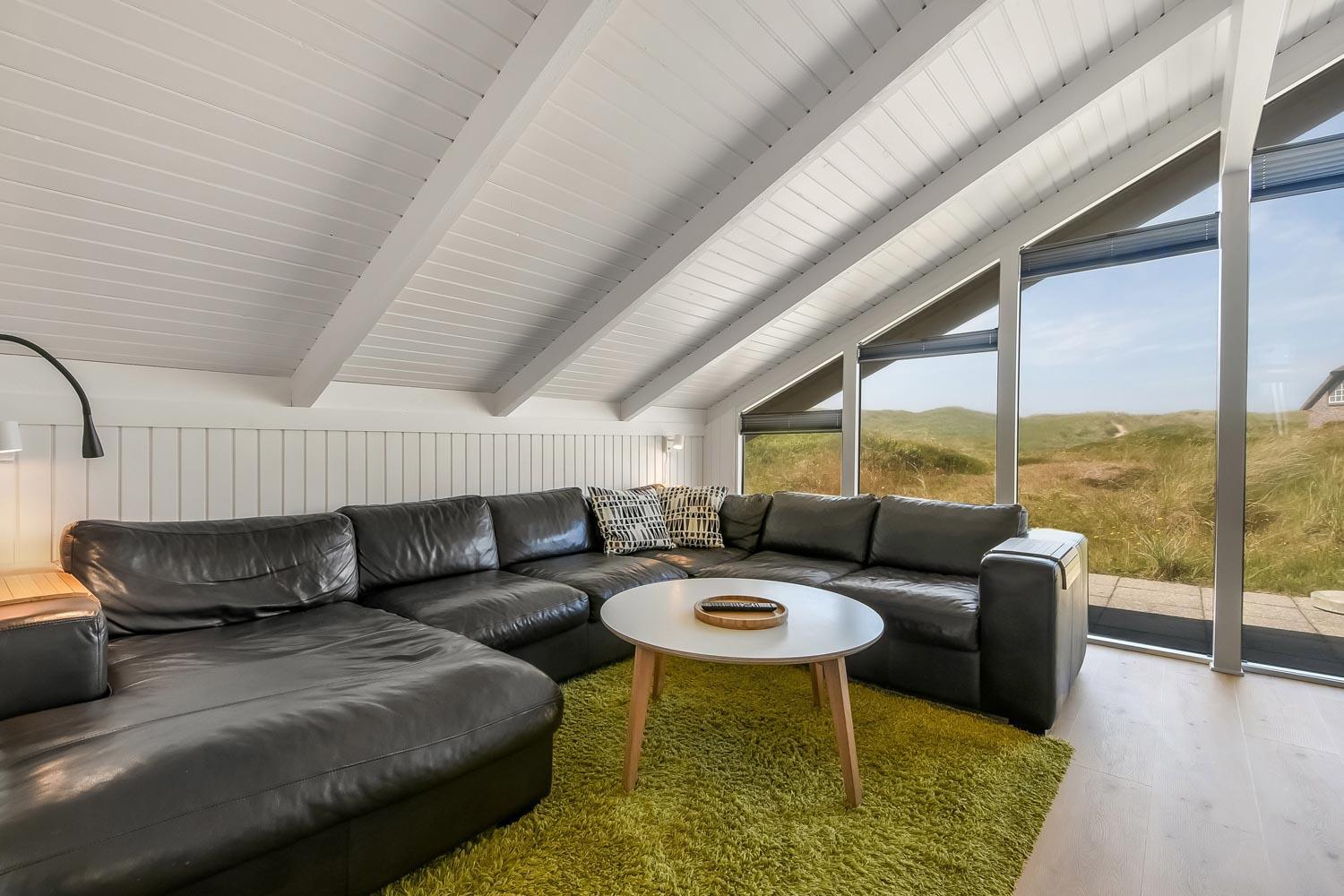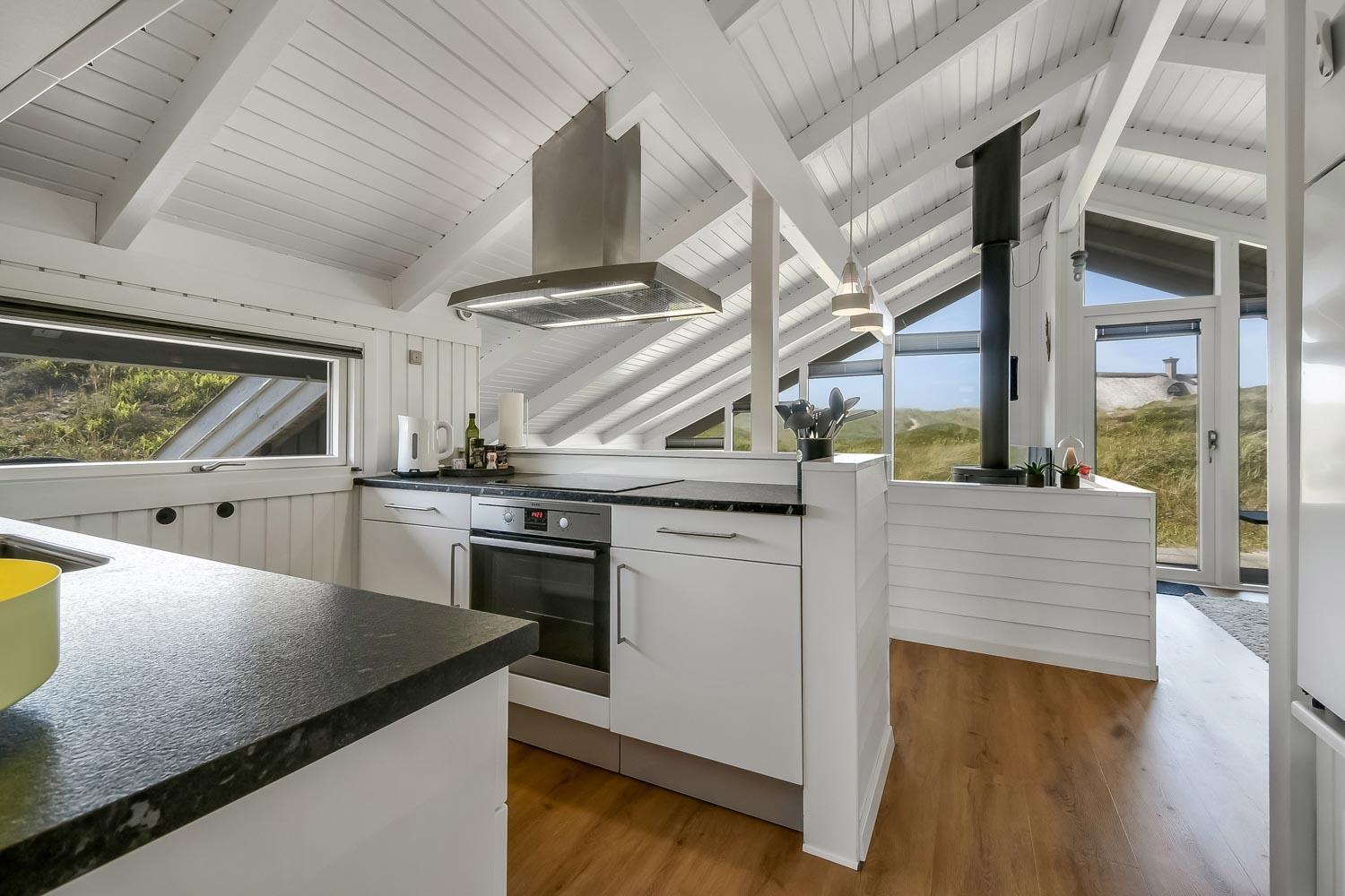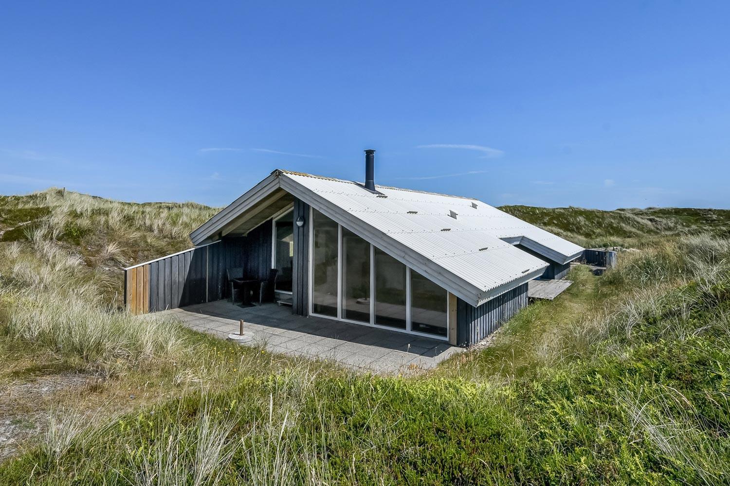 Når I ankommer til huset, vil I straks bemærke den unikke beliggenhed i en klitgryde, hvorfra I kan nyde den betagende udsigt over klitterne. Indvendigt er huset moderne og indbydende, og det er blevet malet i lyse, friske farver, hvilket skaber en åben og behagelig atmosfære. Den rummelige stue har en forsænket pejsestue med komfortable møbler, perfekt til afslapning foran den hyggelige brændeovn. Her er også et TV med både danske og tyske programmer. Spiseafdelingen giver dig et fantastisk udsyn over klitterne og naturen omkring huset, hvilket gør måltiderne endnu mere specielle.