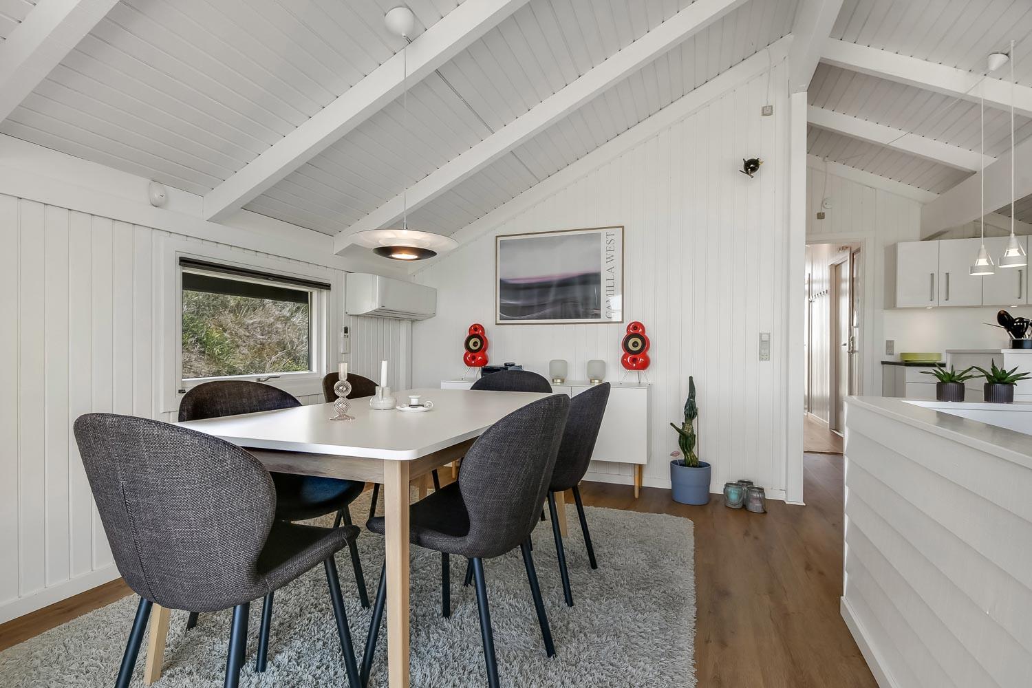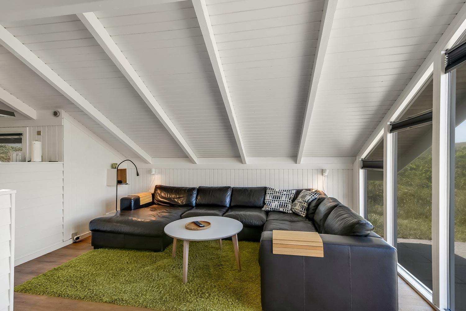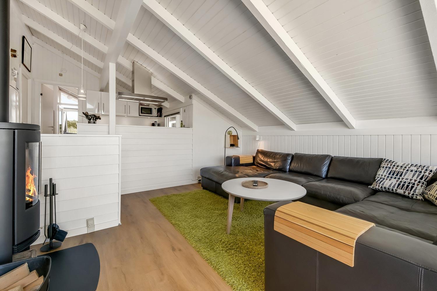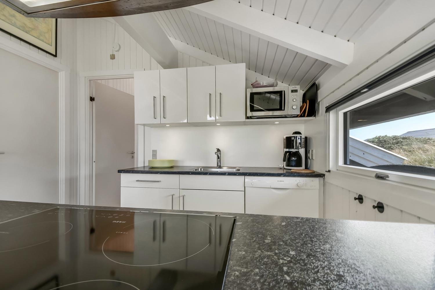 Når I ankommer til huset, vil I straks bemærke den unikke beliggenhed i en klitgryde, hvorfra I kan nyde den betagende udsigt over klitterne. Indvendigt er huset moderne og indbydende, og det er blevet malet i lyse, friske farver, hvilket skaber en åben og behagelig atmosfære. Den rummelige stue har en forsænket pejsestue med komfortable møbler, perfekt til afslapning foran den hyggelige brændeovn. Her er også et TV med både danske og tyske programmer. Spiseafdelingen giver dig et fantastisk udsyn over klitterne og naturen omkring huset, hvilket gør måltiderne endnu mere specielle.