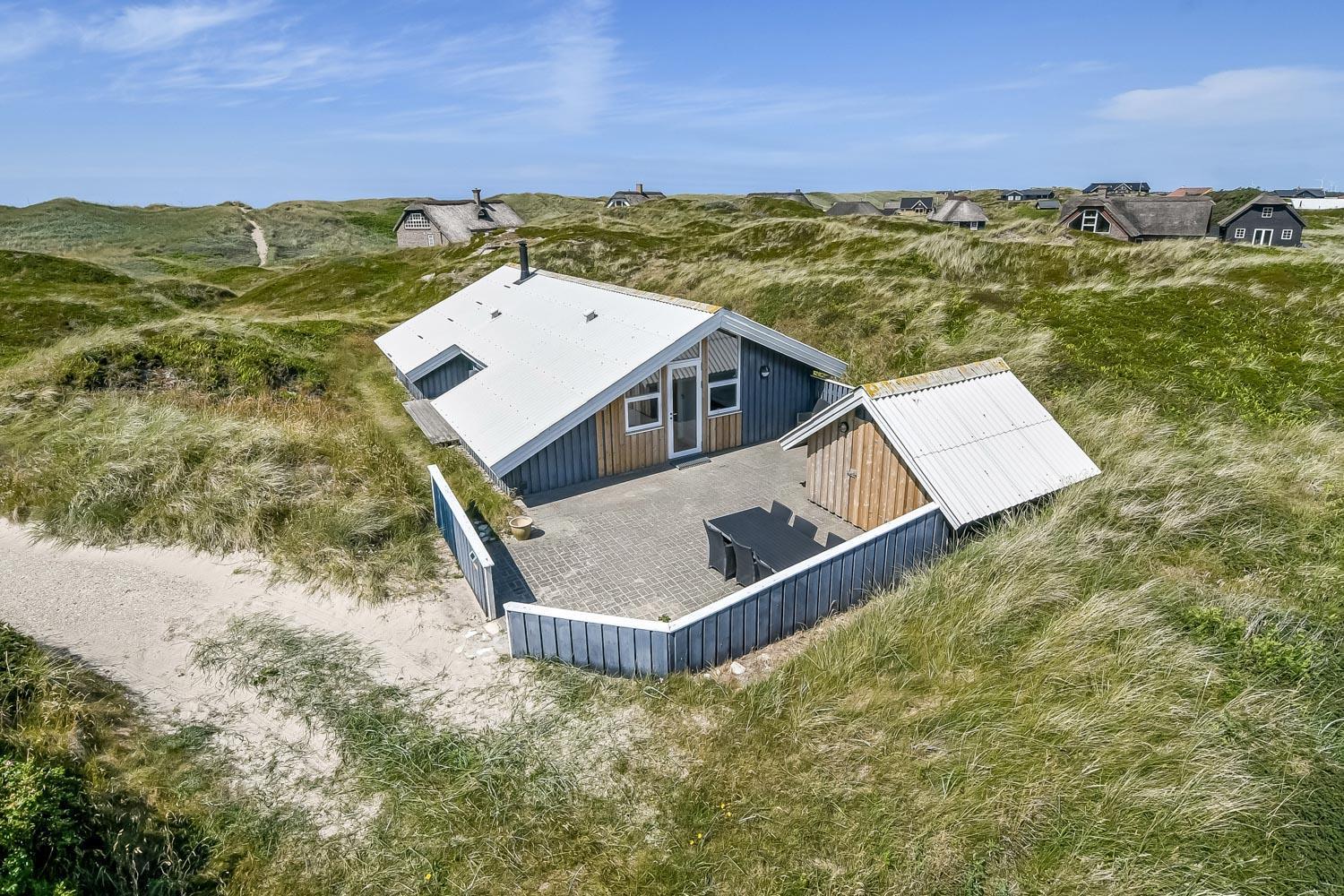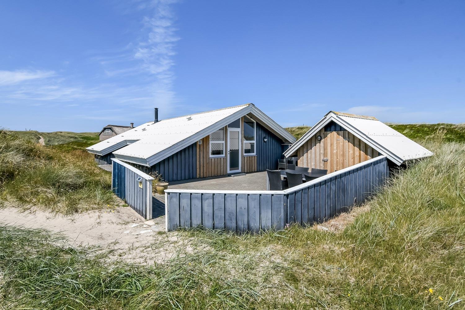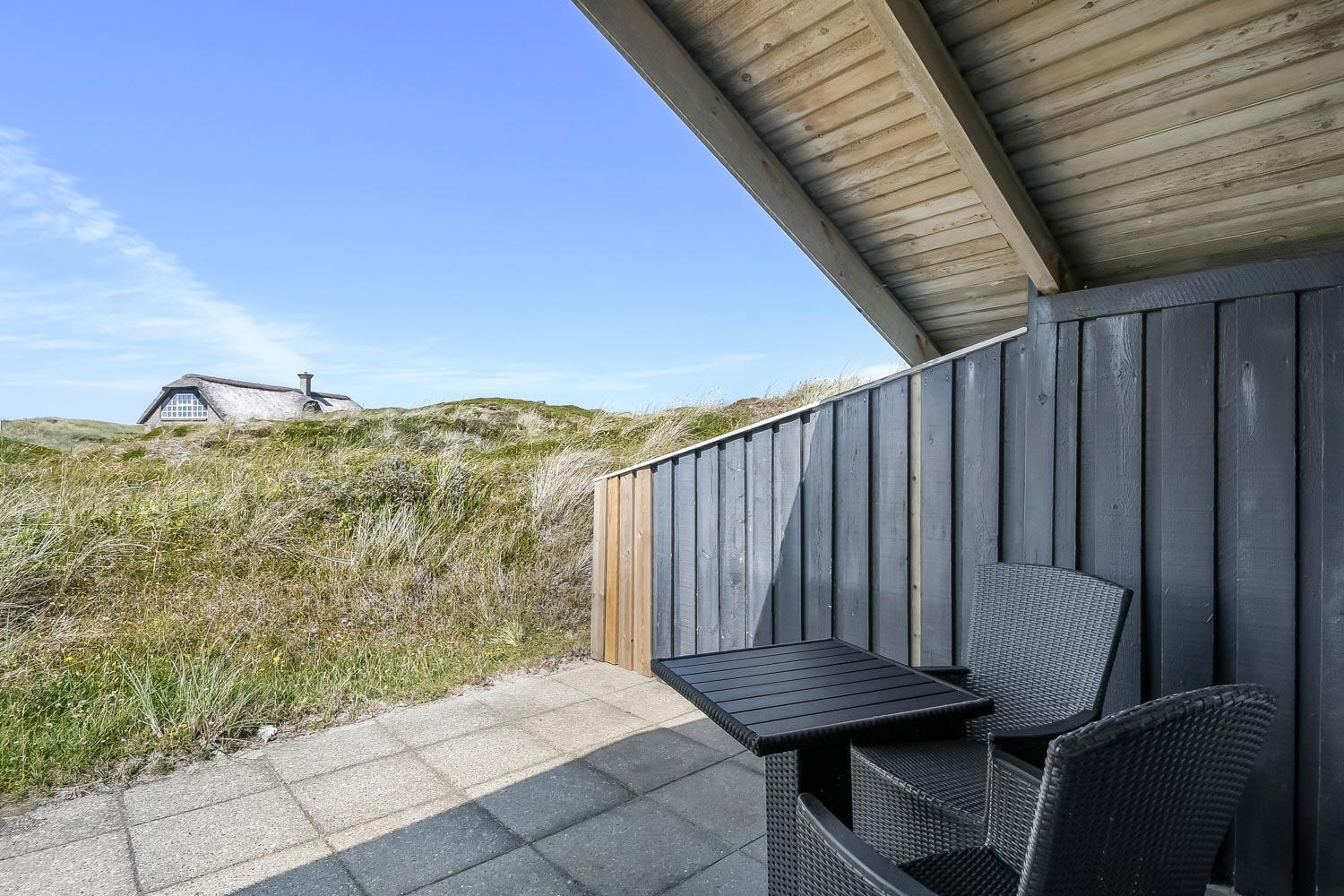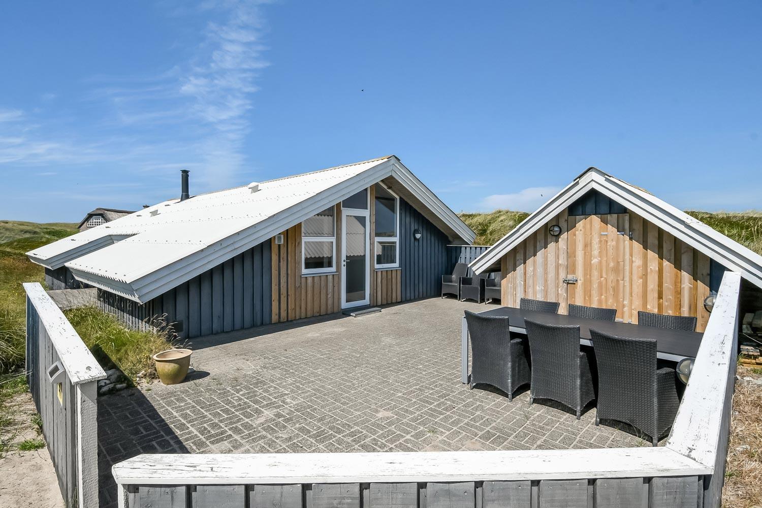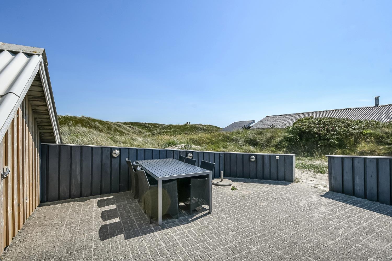 Dette hus har to dejlige terrasser, hvoraf den ene er en solgård på hele 40 m², perfekt til afslapning i solen. Begge terrasser er udstyret med havemøbler, solvogne og grill, så du kan nyde hyggelige måltider og solrige dage udendørs. Fra terrasserne kan du høre Vesterhavets brusen i baggrunden, hvilket tilføjer en ekstra dimension af ro og natur.