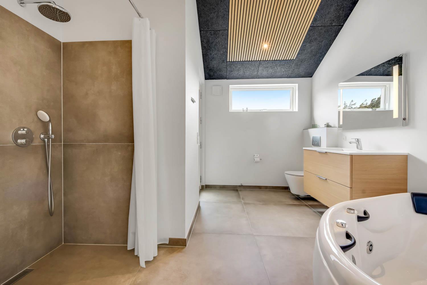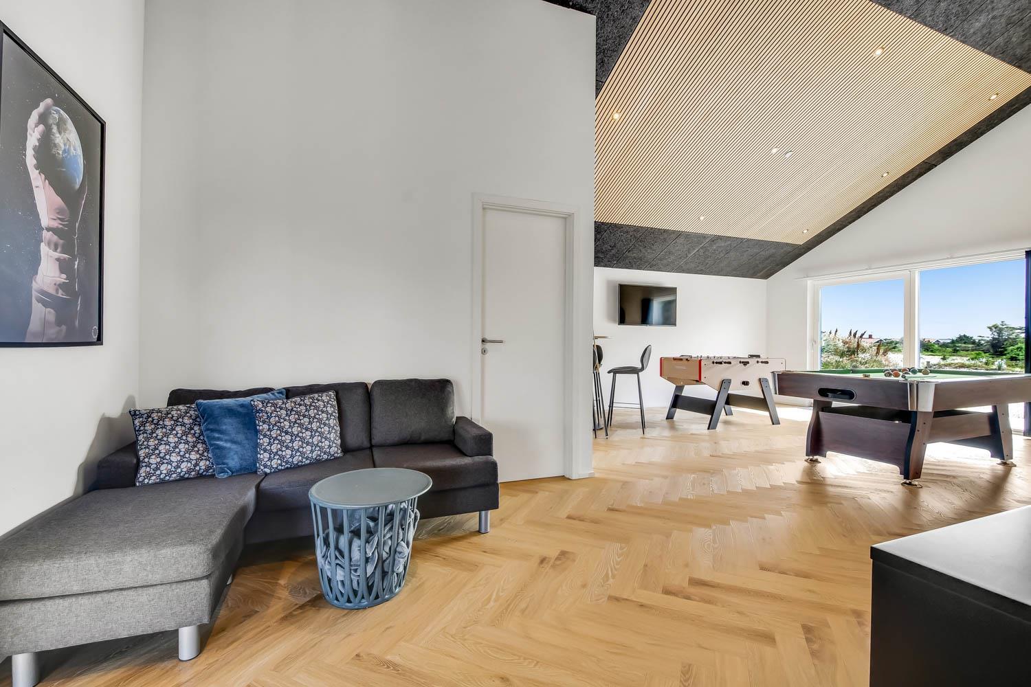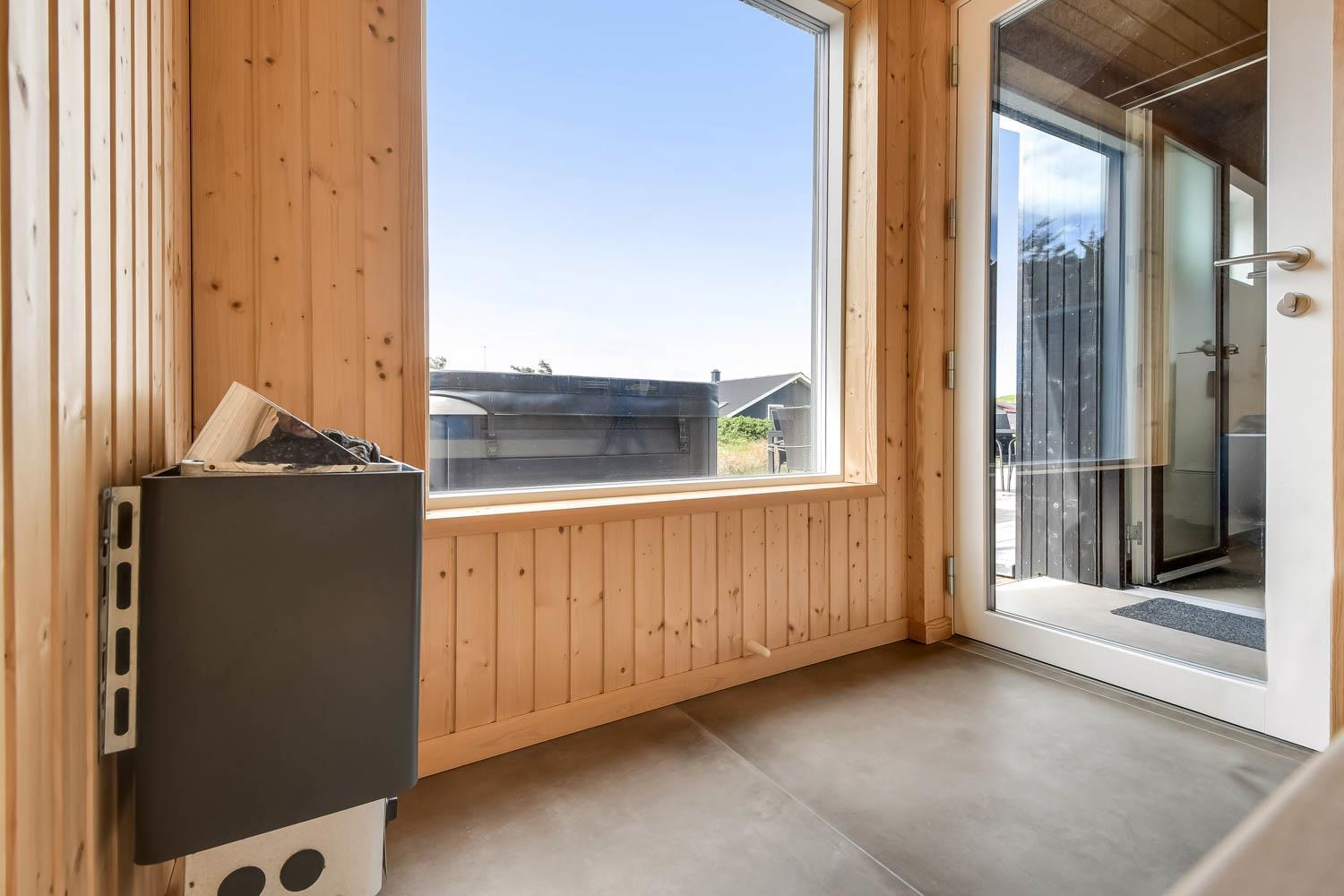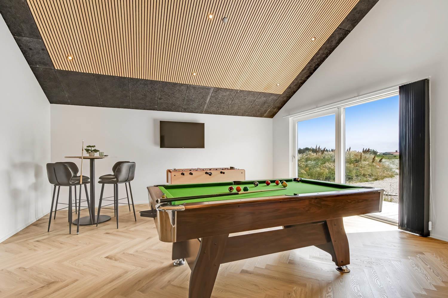 Husets wellness afdeling har bla. indendørs spabad. Der er udgang til det store og unikke terrasse anlæg, hvor der hvor der også er en udendørs spa og sauna. Det separat aktivitetsrummet indeholder: Bordfodbold og billardbord. Her kan man få flere timer til at gå. 2 badeværelser, med dobbelt brusekabine i hver samt toilet, håndvask og gulvvarme. Vaskemaskiner og tørretumblere er en selvfølge. Luft til vand varmepumpe gør huset særdeles energivenligt og bevirker også et billigere forbrug. Huset lejes ikke ud til ungdomsgrupper. Har man el-bil eller en Plug-in hybrid, så er der lade boks til Type 2 lade stik, der kan lade op til 11 kWh. Ikke ryger hus. Max. 1 hund tilladt. Obligatorisk rengøring.