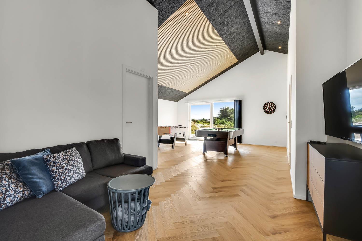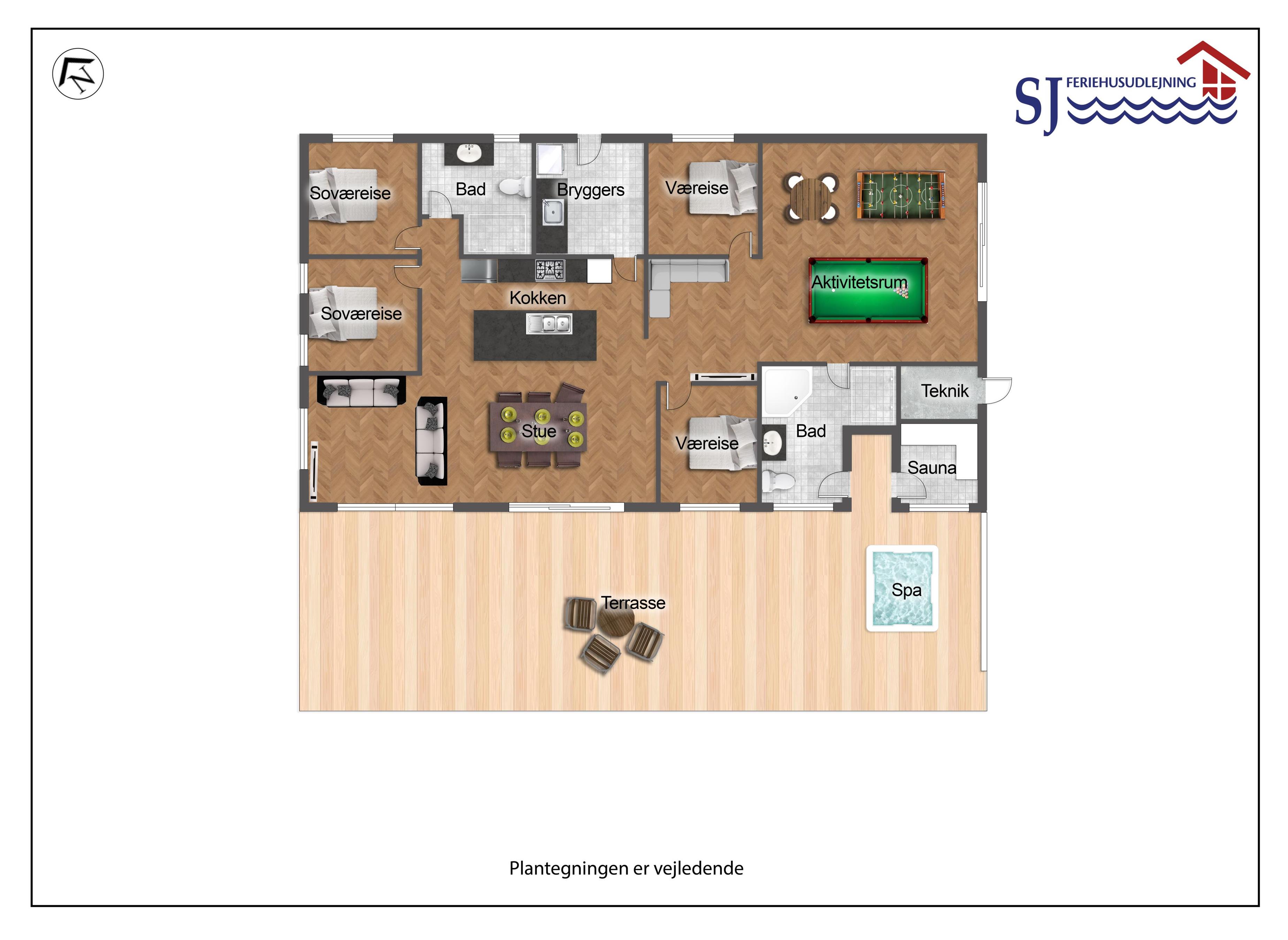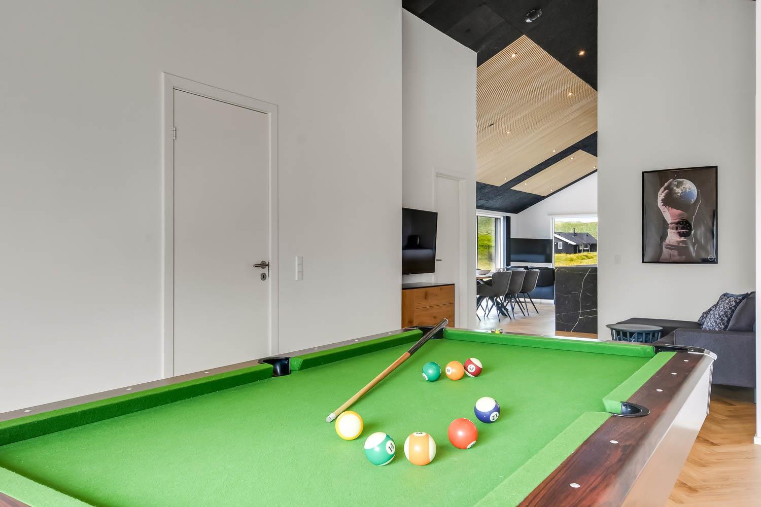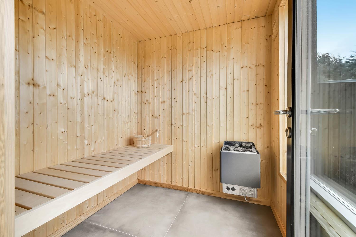 Husets wellness afdeling har bla. indendørs spabad. Der er udgang til det store og unikke terrasse anlæg, hvor der hvor der også er en udendørs spa og sauna. Det separat aktivitetsrummet indeholder: Bordfodbold og billardbord. Her kan man få flere timer til at gå. 2 badeværelser, med dobbelt brusekabine i hver samt toilet, håndvask og gulvvarme. Vaskemaskiner og tørretumblere er en selvfølge. Luft til vand varmepumpe gør huset særdeles energivenligt og bevirker også et billigere forbrug. Huset lejes ikke ud til ungdomsgrupper. Har man el-bil eller en Plug-in hybrid, så er der lade boks til Type 2 lade stik, der kan lade op til 11 kWh. Ikke ryger hus. Max. 1 hund tilladt. Obligatorisk rengøring.
