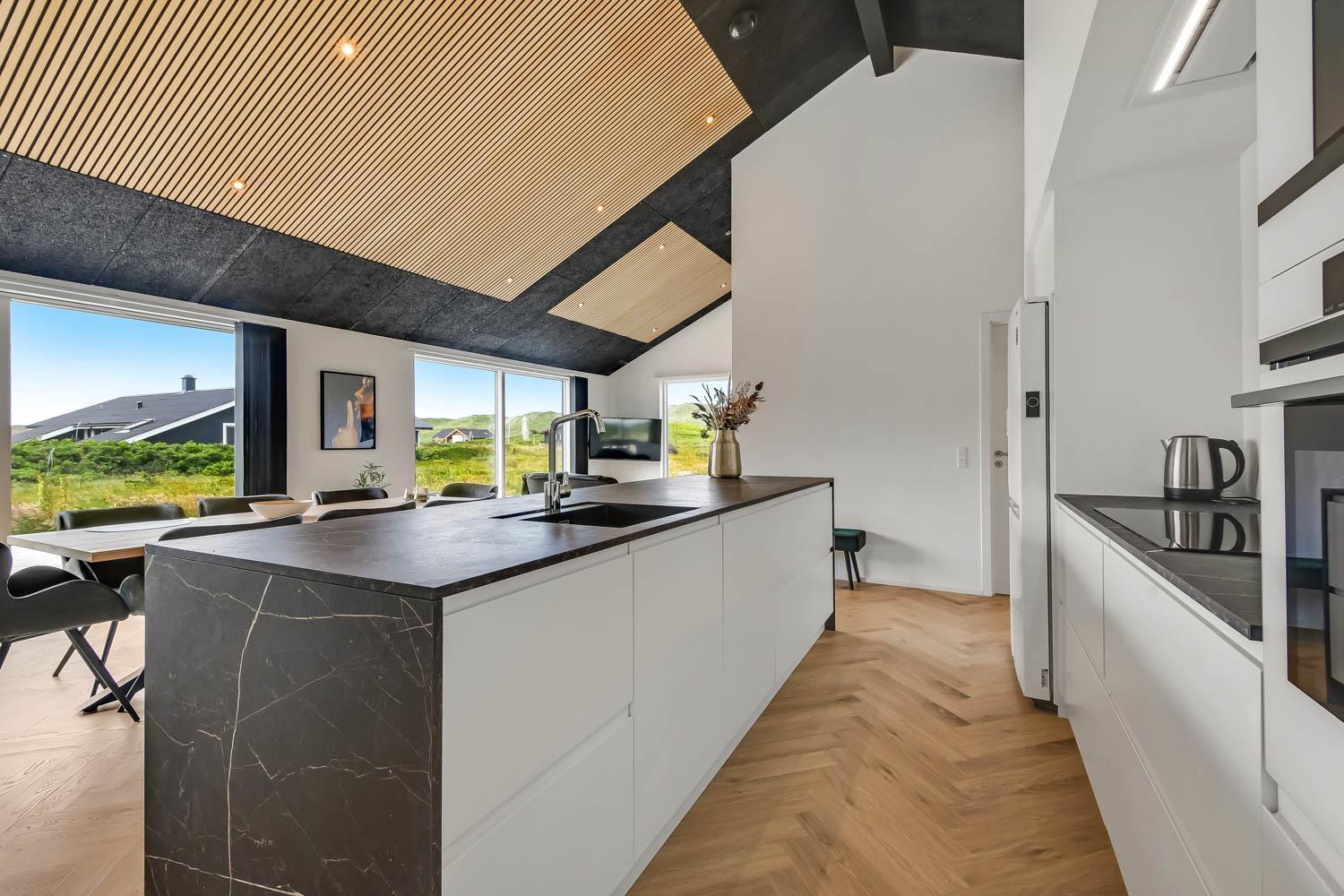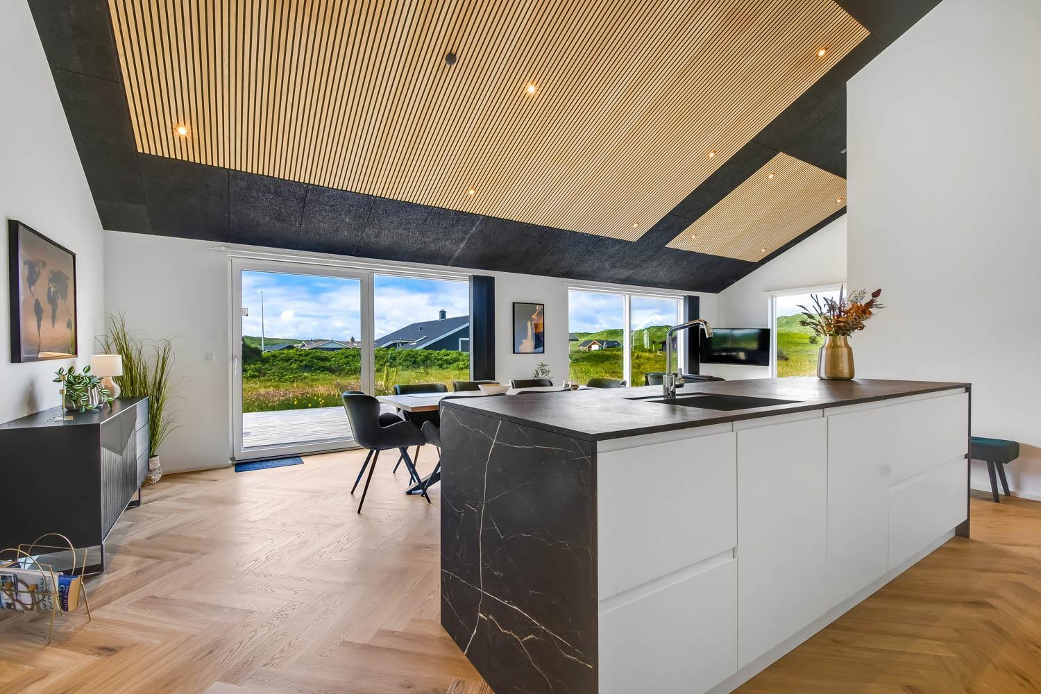 Allerede når bilen rammer grusvejen, med få meter til huset, bliver det klart at beliggenhed og hus er noget ganske særligt. Huset ligger på en meget privat grund med høj beplantning for enden af en lukket grusvej. Huset er 120 m2 og har 4 dejlige soverum (1DS, 1DS, 1DS, 1DS) – men alle værelser er udstyret med løse senge som kan stilles efter behov. I hjertet af huset findes et stort, veludstyret køkken/alrum med alt i service/køkkengrej og alt i hårde hvidevarer. Det åbne køkken har bl.a. keramiske kogeplade, indbygningsovn, stor emhætte, opvaskemaskine, mikroovn, køleskab med fryseboks, vinkøler, isterningmaskine og meget mere. Nyd den tilberedte mad ved spisebordet, som er placeret tæt ved køkkenet. Bliv betaget af at kigge ud ad vinduerne og nyd udsigten til klitterne ved Vesterhavet. Slap af i de nye, bløde kvalitetsmøbler. Se TV på husets smart-TV med soundbar og som har indbygget danske og tyske TV-programmer, radio og mulighed for streamingstjenester. Der er praktiske hårde gulve med gulvvarme i hele huset, som også er særdeles rengøringsvenlige og de praktiske og flotte akustikpaneler søger for et dæmpet og behageligt lydniveau for alle.