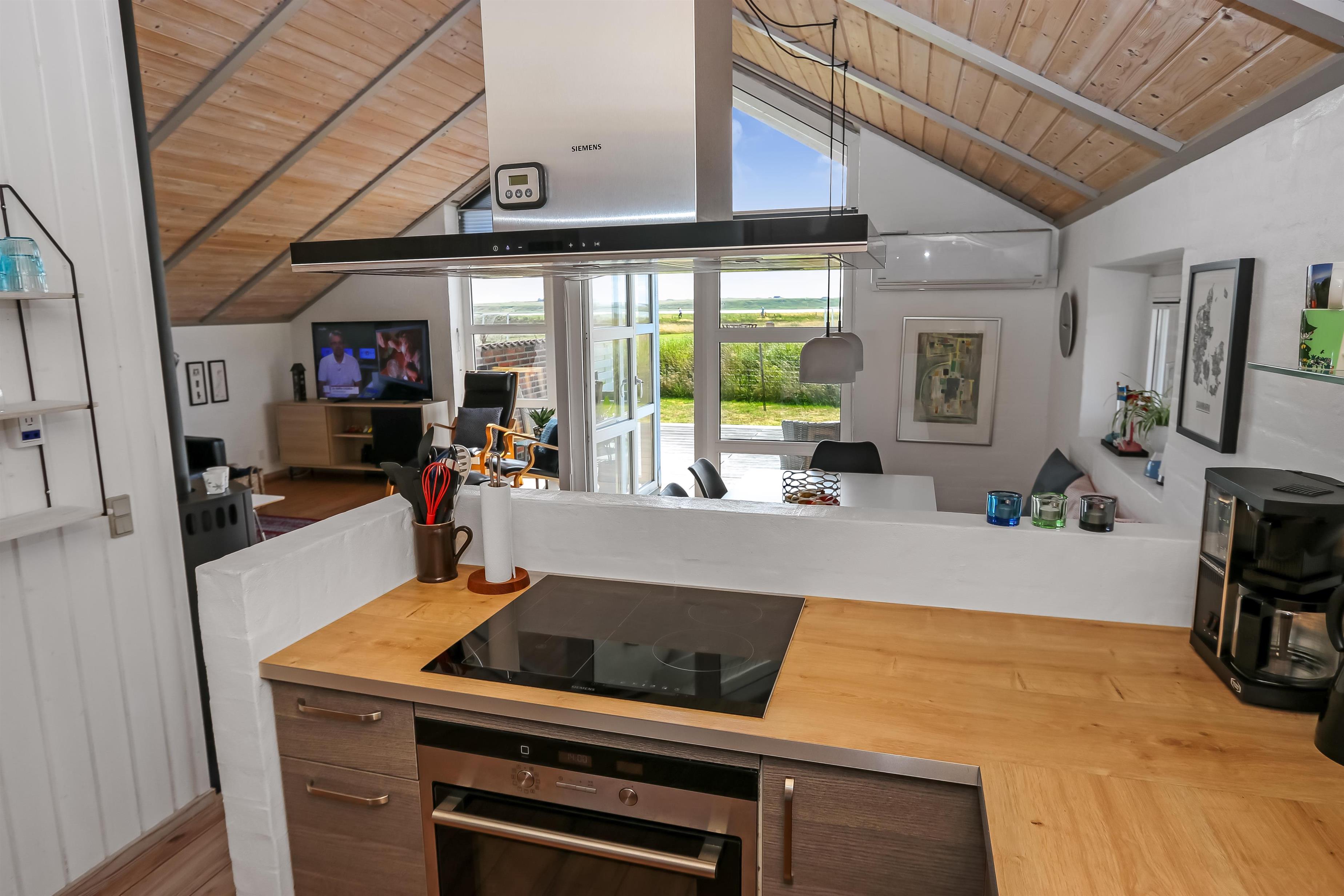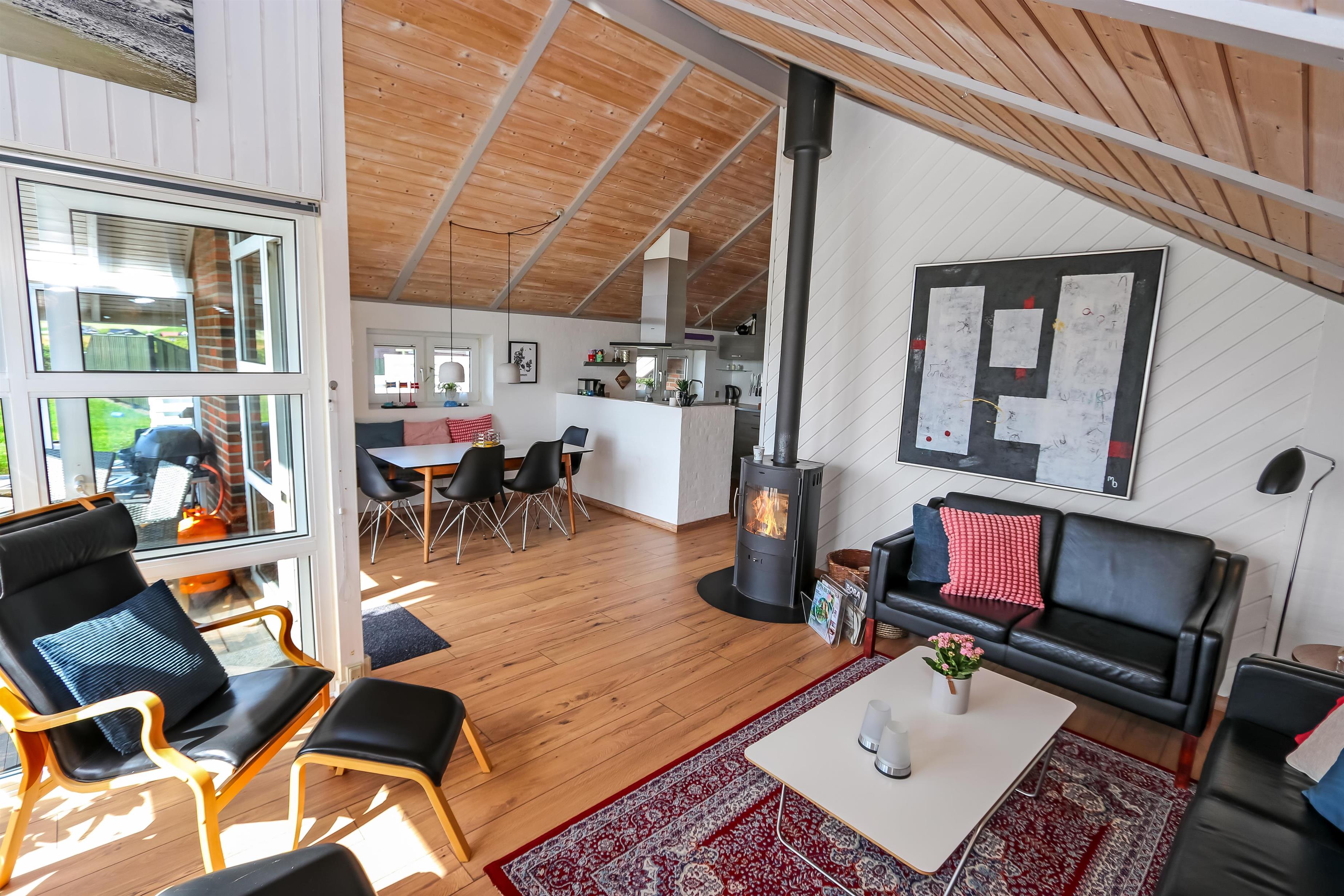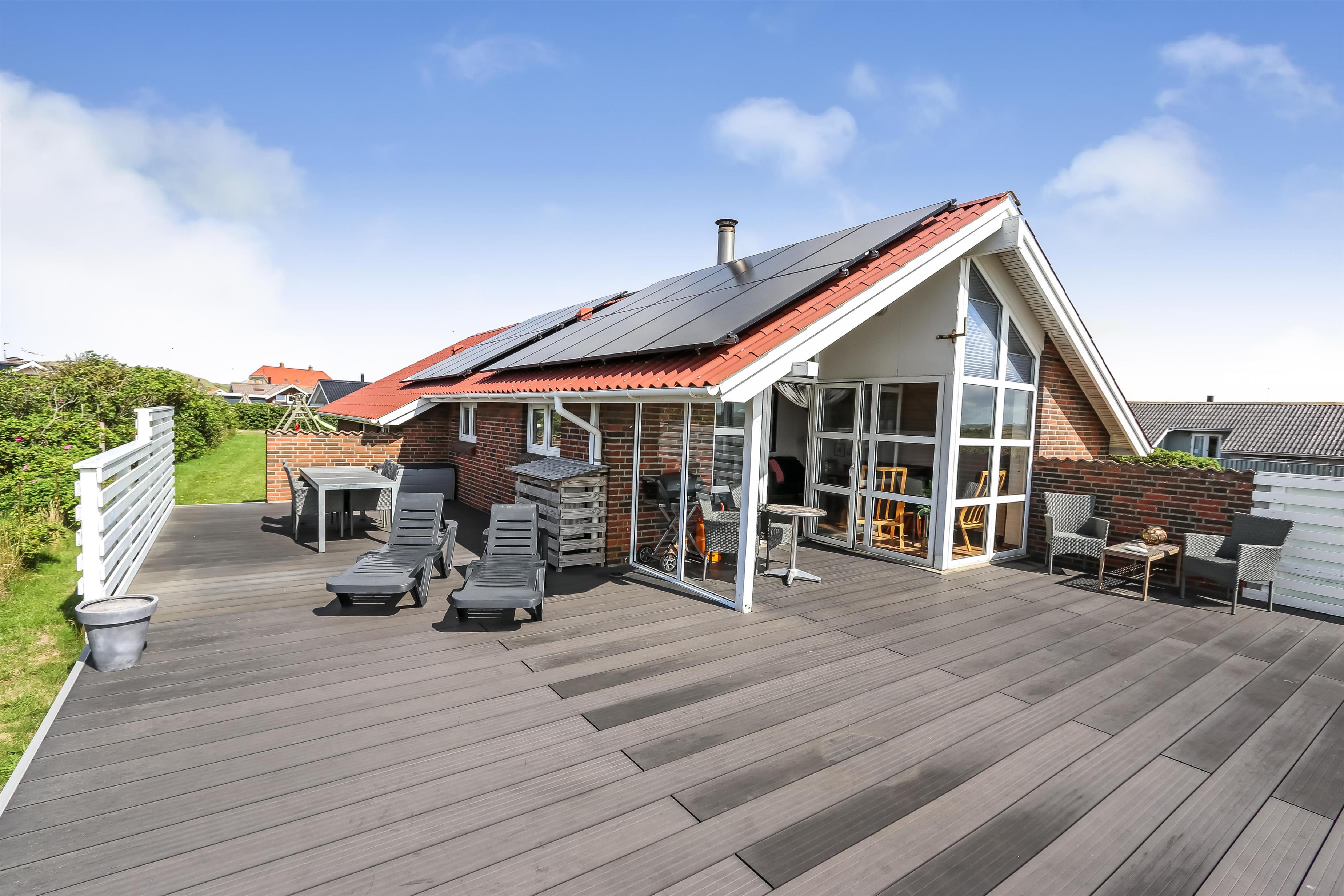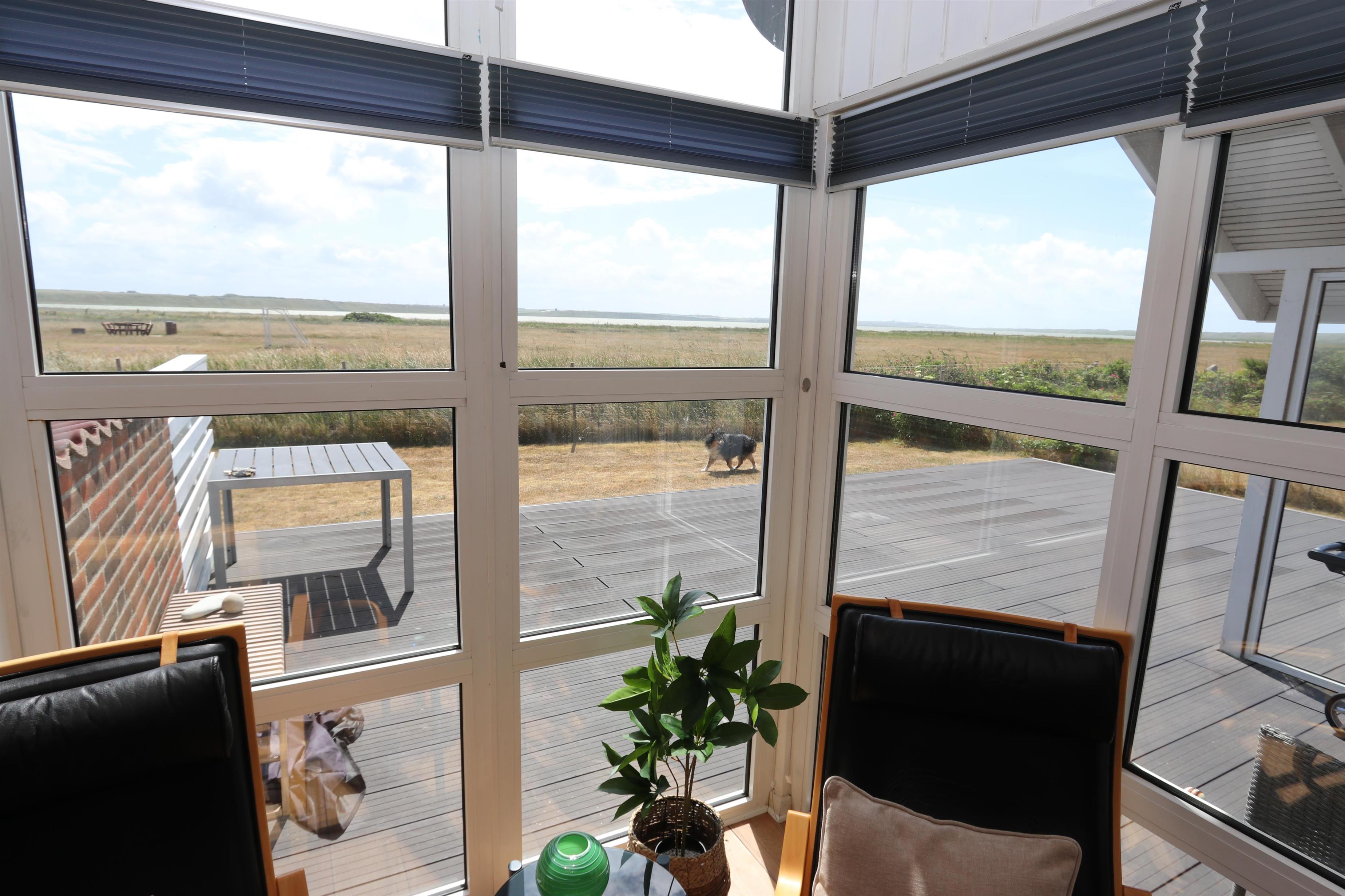 Dette velbeliggende feriehus har 4 soverum (1DS + 1DS + 2ES + 2ES). Lys og åben opholdsrum som er bygget i kip. Hyggeligt indrettet med lædermøbler, spiseplads, stort smart-TV med tyske og danske kanaler, samt Chromecast til streaming. Huset er 110 m2 stort og er bygget i 1994. Dejlig, hyggelig brændeovn og 2 økonomiske varmepumper i hver sin ende af huset sørger for hygge, samt muliggør et altid varmt og rart hus, uanset vejr og årstid. Herudover har huset solceller på taget, samt batteri som lagre op tl 5 kw. Huset har derfor grøn energi og minimalt forbrug når der bruges el. Det lækre køkken er veludstyret. Der er bl.a. kaffemaskine, mikrooven, varmluftsovn og induktions kogeplade, emhætte, opvaskemaskine og køleskab med fryser. Der er 2 lækre badeværelser i huset. Begge har toilet, bruser, håndvask og klinkegulv og det ene med gulvvarme. Fra både terrasse og stue har man en fantastisk panorama-udsigt til Ferring Sø, samt udsigt til de høje klitter ved Vesterhavet. Ikke ryger hus. Max 1 husdyr er tilladt.
