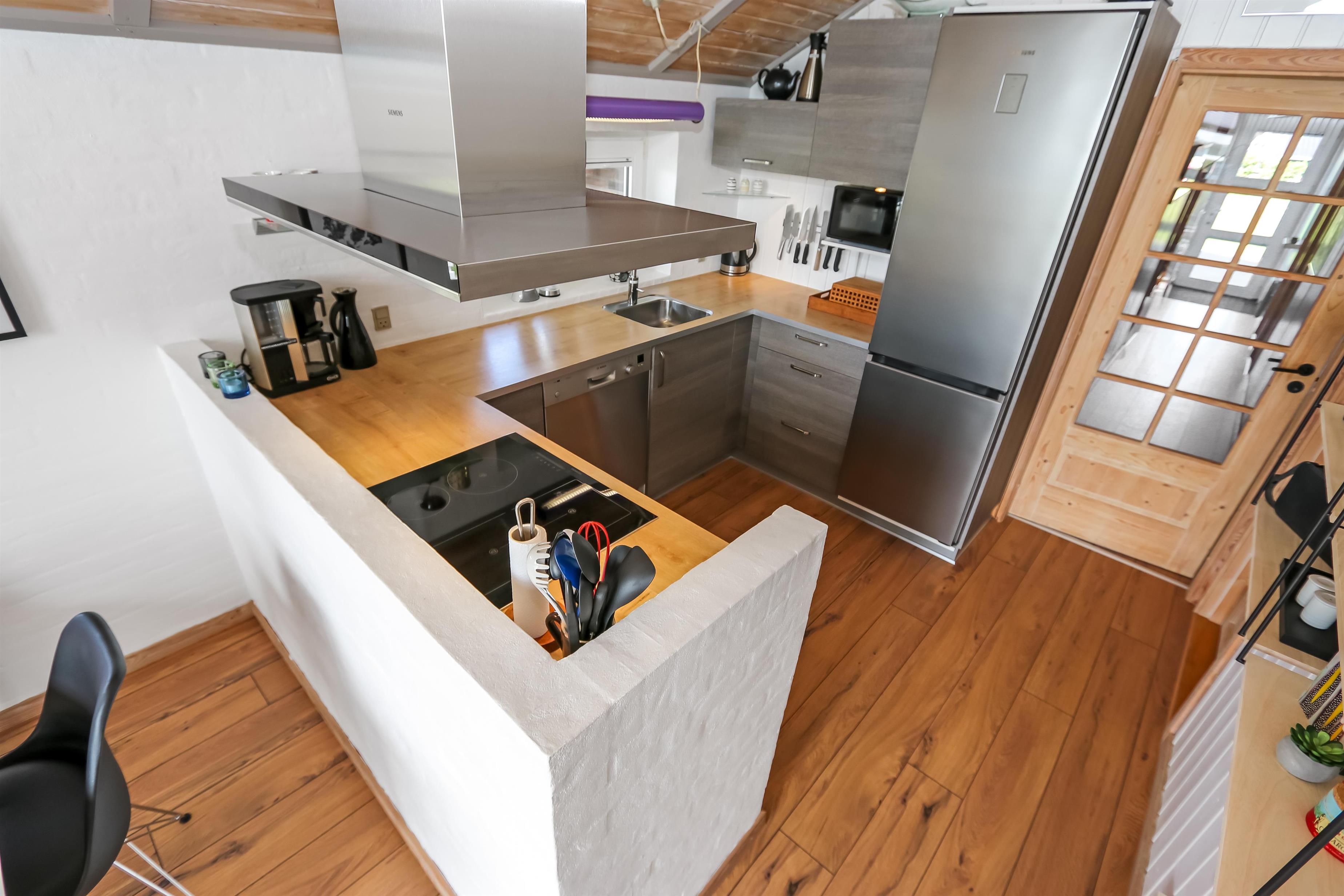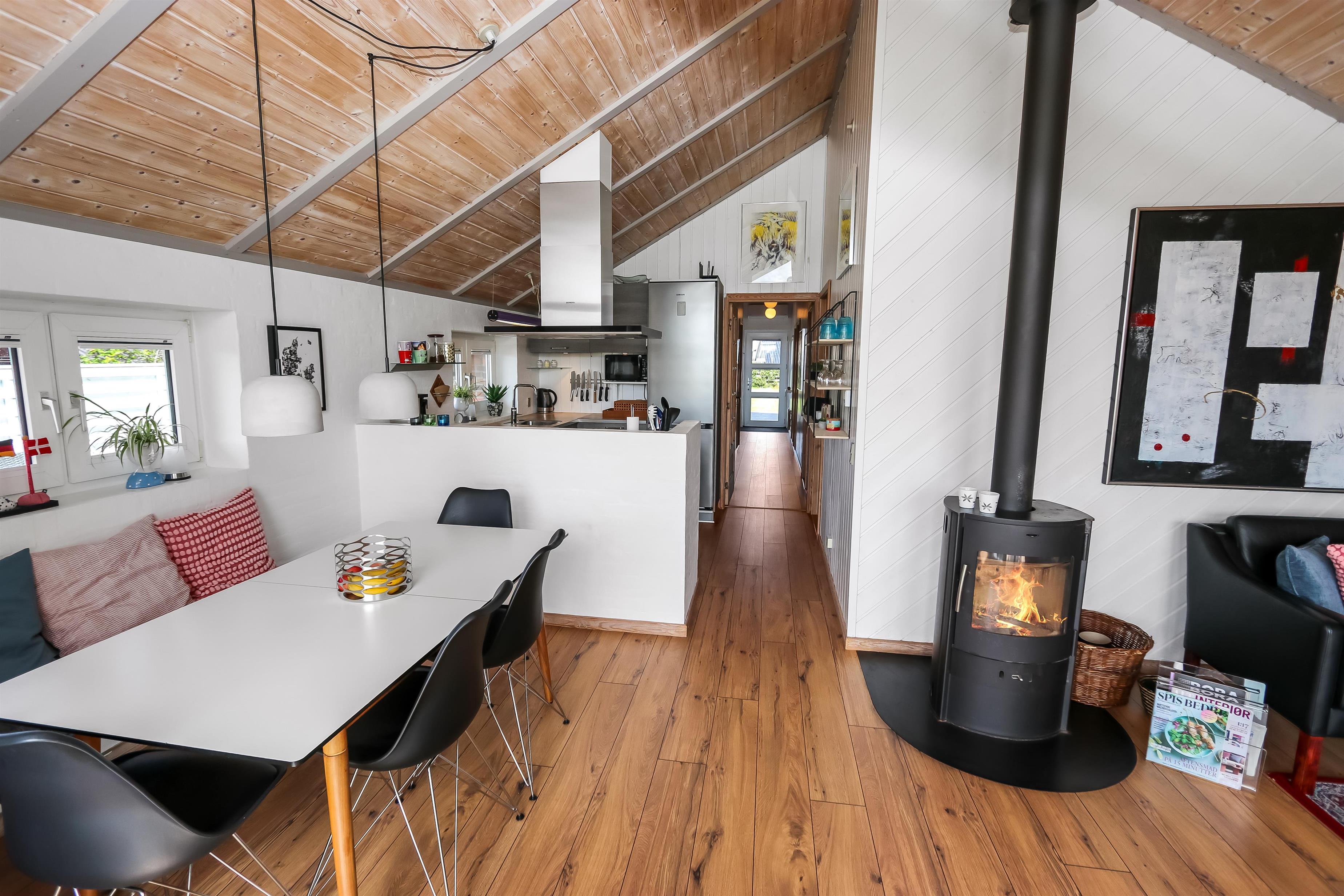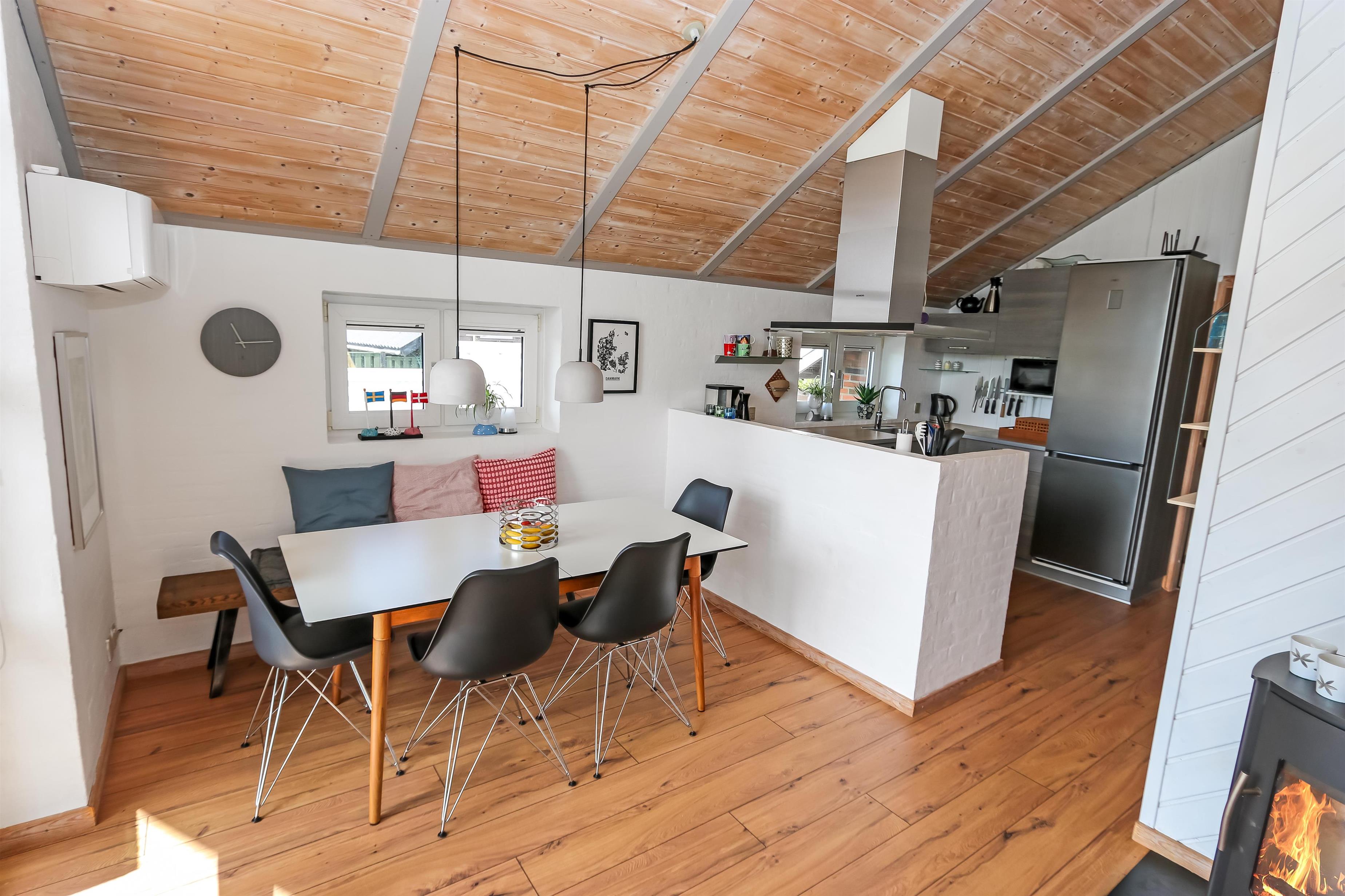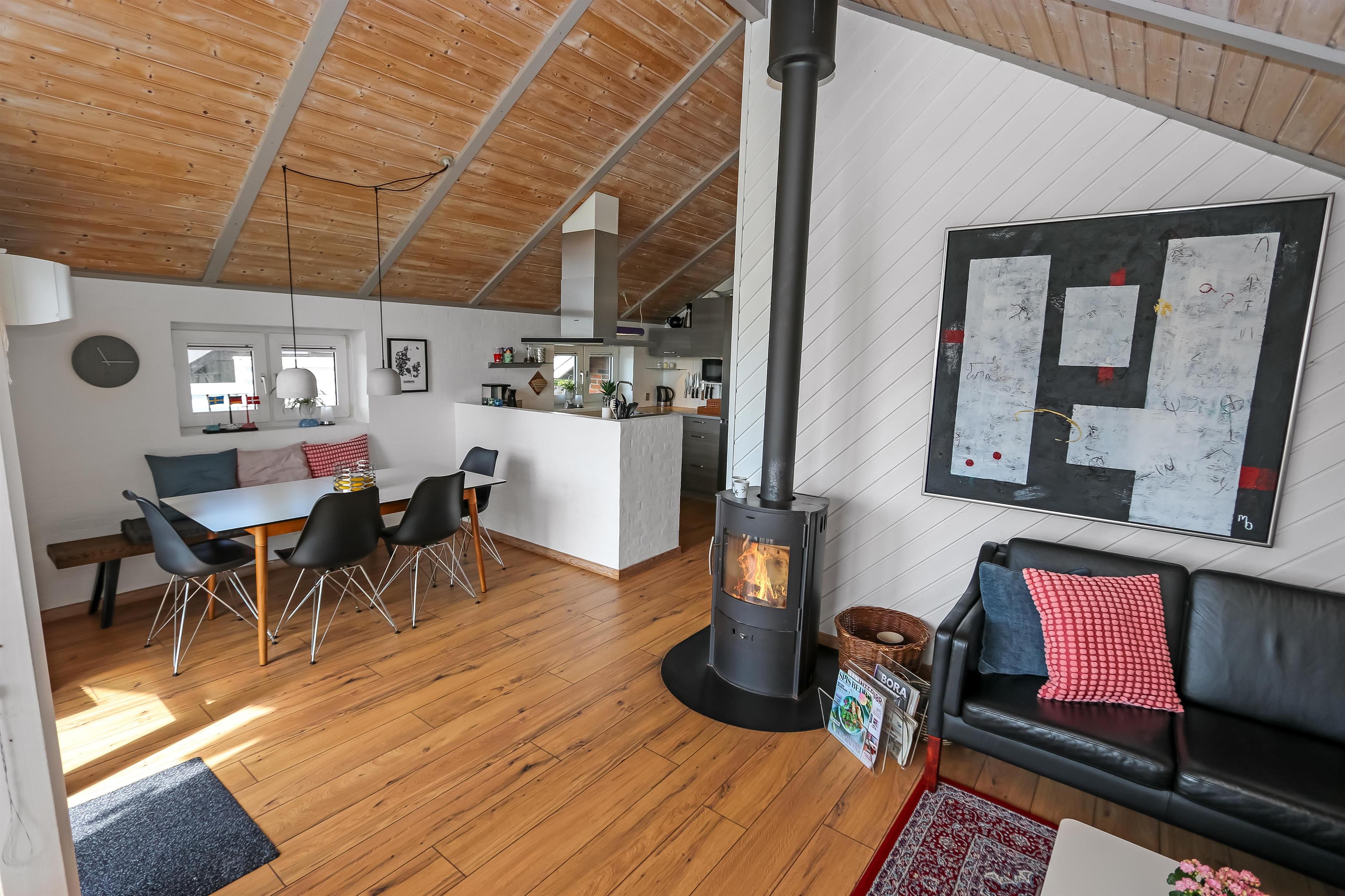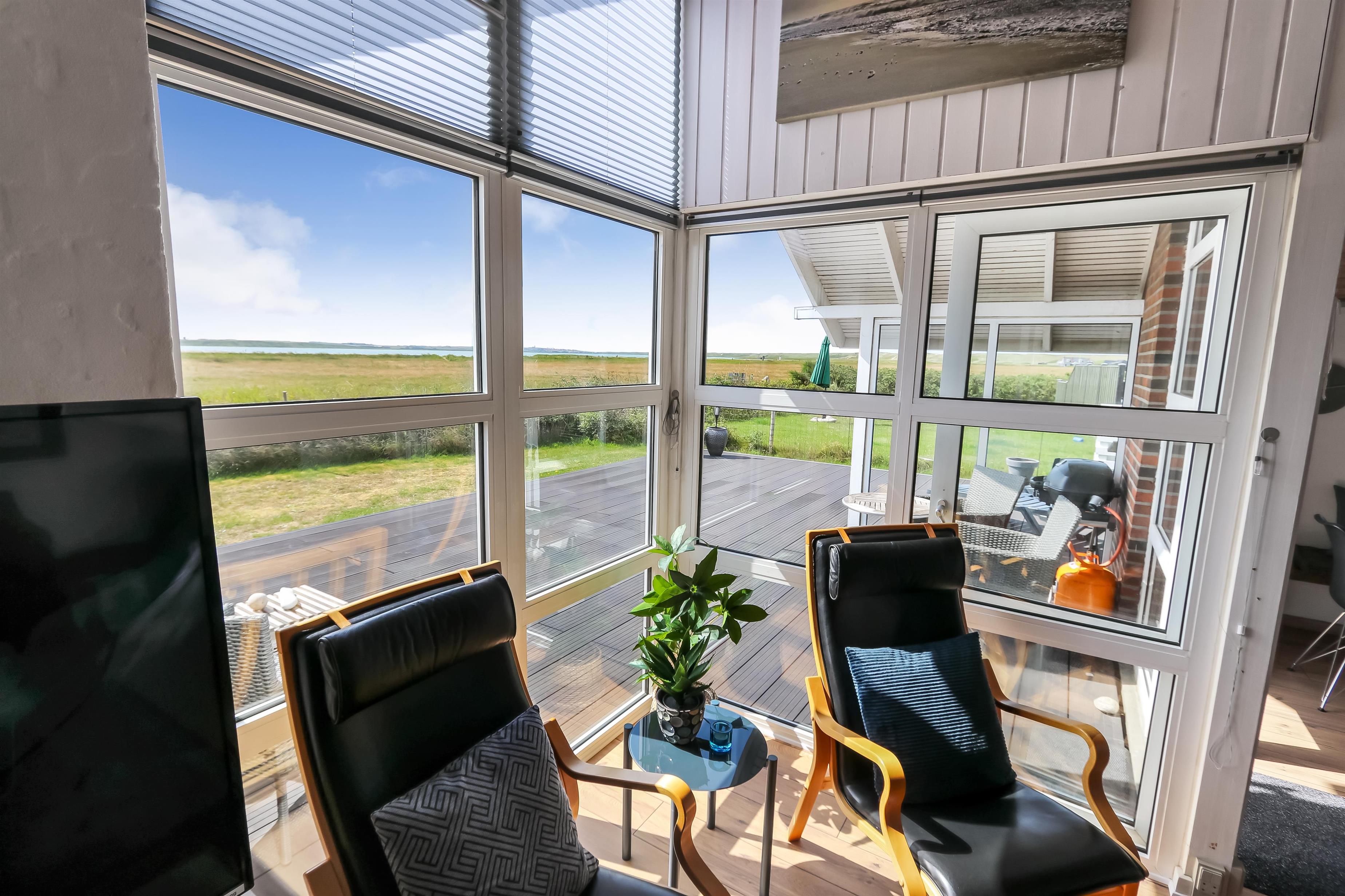 Dette velbeliggende feriehus har 4 soverum (1DS + 1DS + 2ES + 2ES). Lys og åben opholdsrum som er bygget i kip. Hyggeligt indrettet med lædermøbler, spiseplads, stort smart-TV med tyske og danske kanaler, samt Chromecast til streaming. Huset er 110 m2 stort og er bygget i 1994. Dejlig, hyggelig brændeovn og 2 økonomiske varmepumper i hver sin ende af huset sørger for hygge, samt muliggør et altid varmt og rart hus, uanset vejr og årstid. Herudover har huset solceller på taget, samt batteri som lagre op tl 5 kw. Huset har derfor grøn energi og minimalt forbrug når der bruges el. Det lækre køkken er veludstyret. Der er bl.a. kaffemaskine, mikrooven, varmluftsovn og induktions kogeplade, emhætte, opvaskemaskine og køleskab med fryser. Der er 2 lækre badeværelser i huset. Begge har toilet, bruser, håndvask og klinkegulv og det ene med gulvvarme. Fra både terrasse og stue har man en fantastisk panorama-udsigt til Ferring Sø, samt udsigt til de høje klitter ved Vesterhavet. Ikke ryger hus. Max 1 husdyr er tilladt.