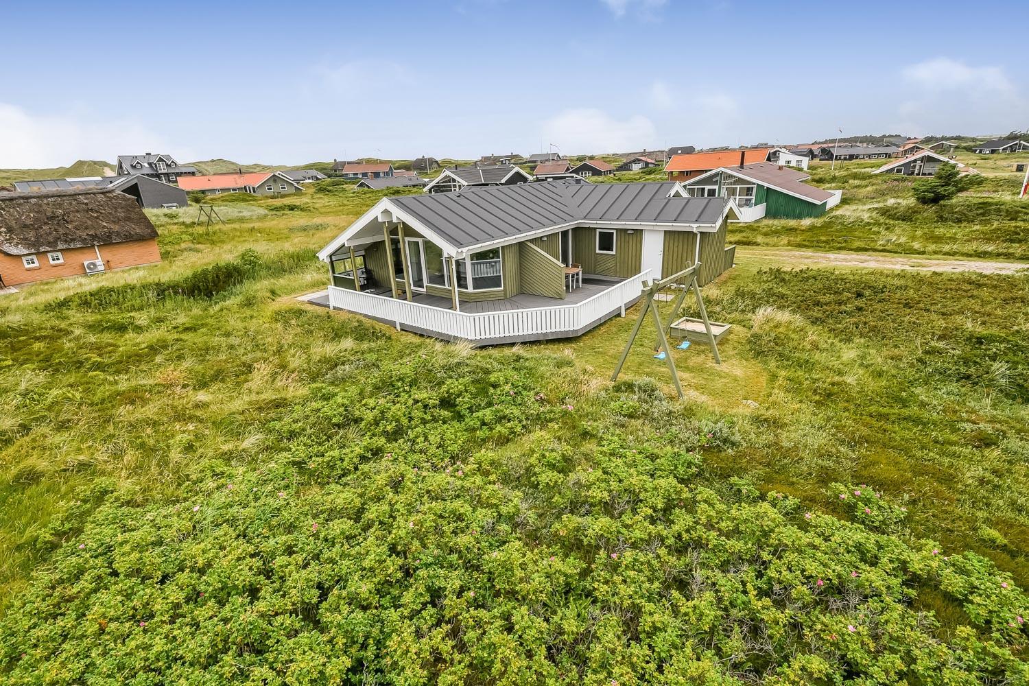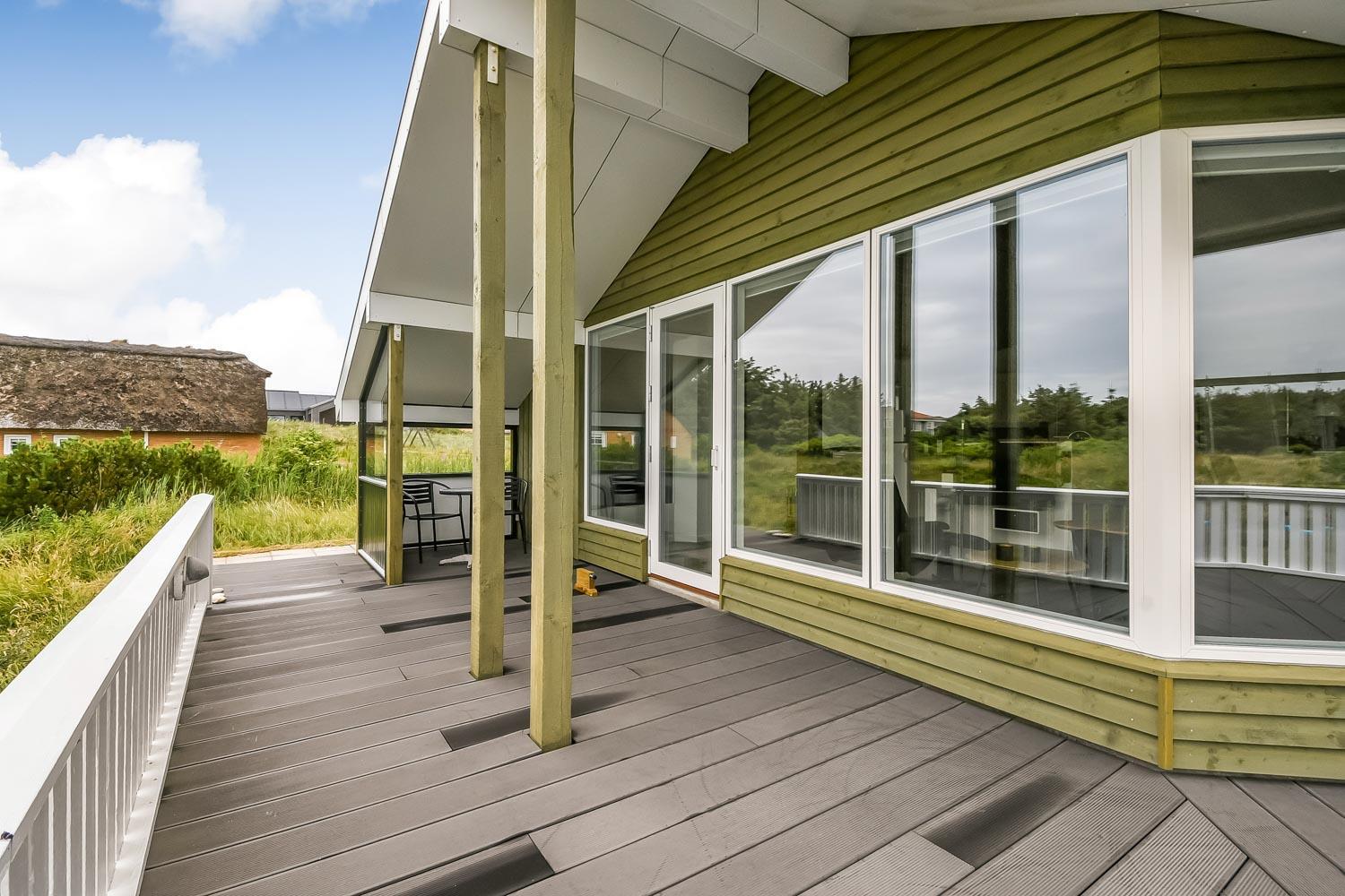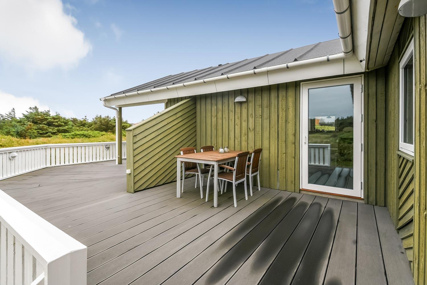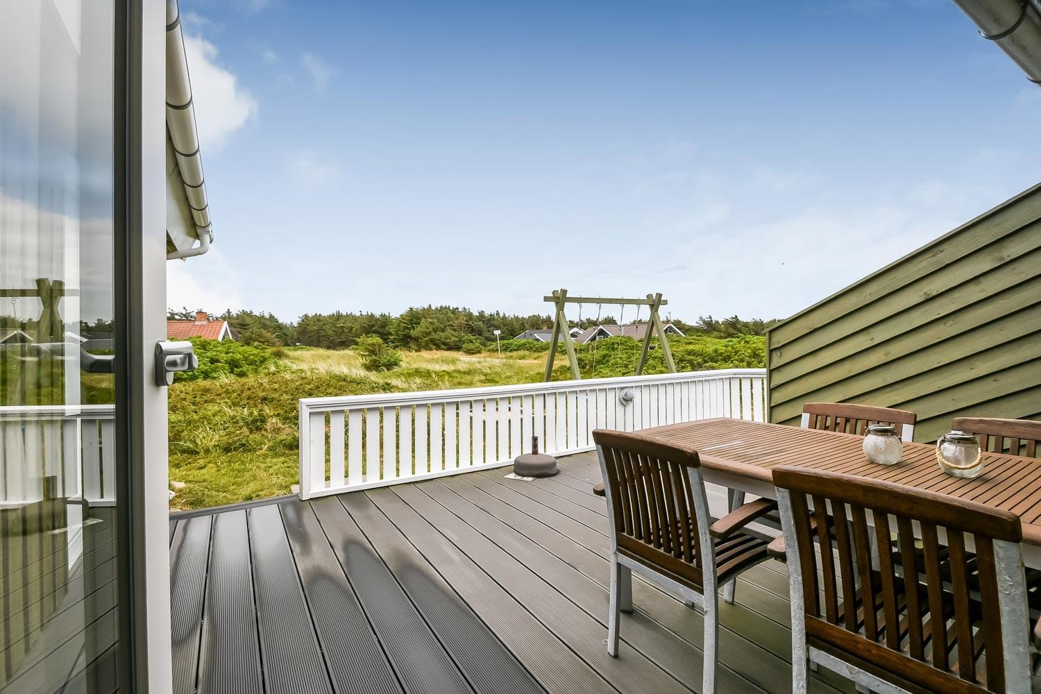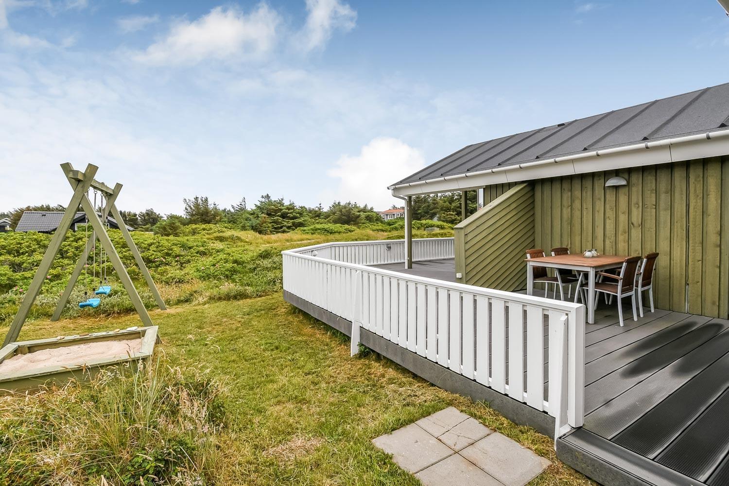 Terrasseforholdene ved huset er gode. Der er åbne og overdækkede områder ligesom der er meget gode læ forhold og terrassen er indhegnet. Der er selvfølgelig havemøbler, solvogne og grill som kan stilles efter behov, så man altid kan finde et sted i læ, i solen eller i skyggen. Fra huset er der en flot udsigt til de høje klitter ved Vesterhavet. Huset er også blot 250 m fra Vesterhavet, som hver dag byder på nye maleriske oplevelser. Til de mindste gæster er der en sandkasse og gynger. Området omkring huset er meget velegnet til vandre og cykelture. Et fantastisk hus som er perfekt for en familie eller et par som gerne vil bo tæt på Vesterhavet i et meget velholdt hus.