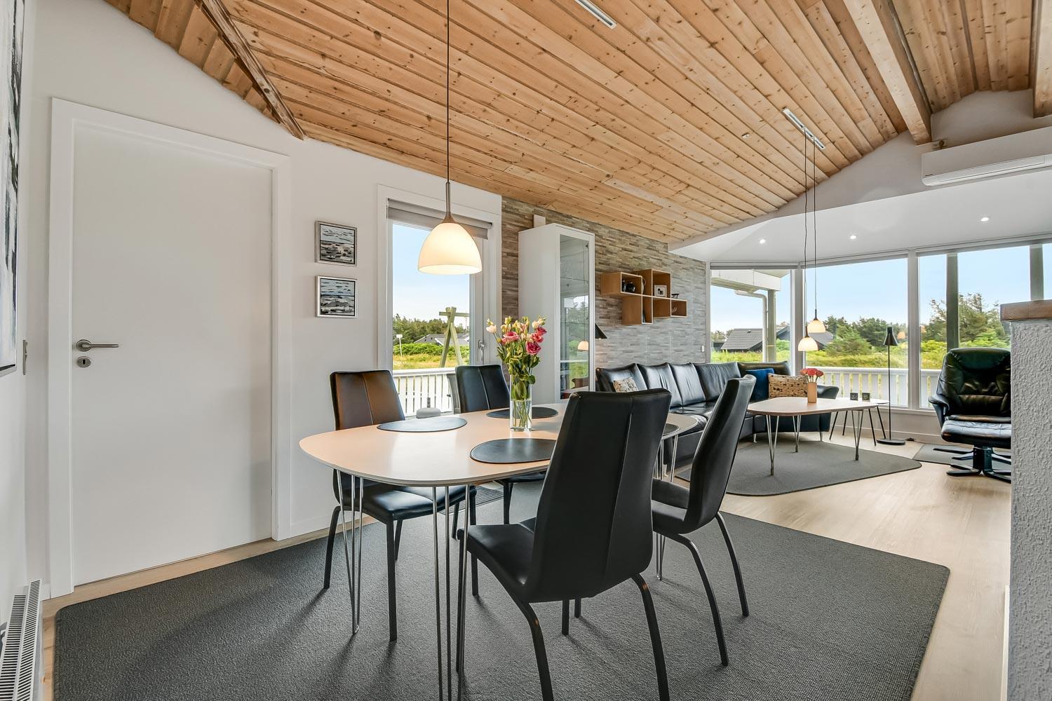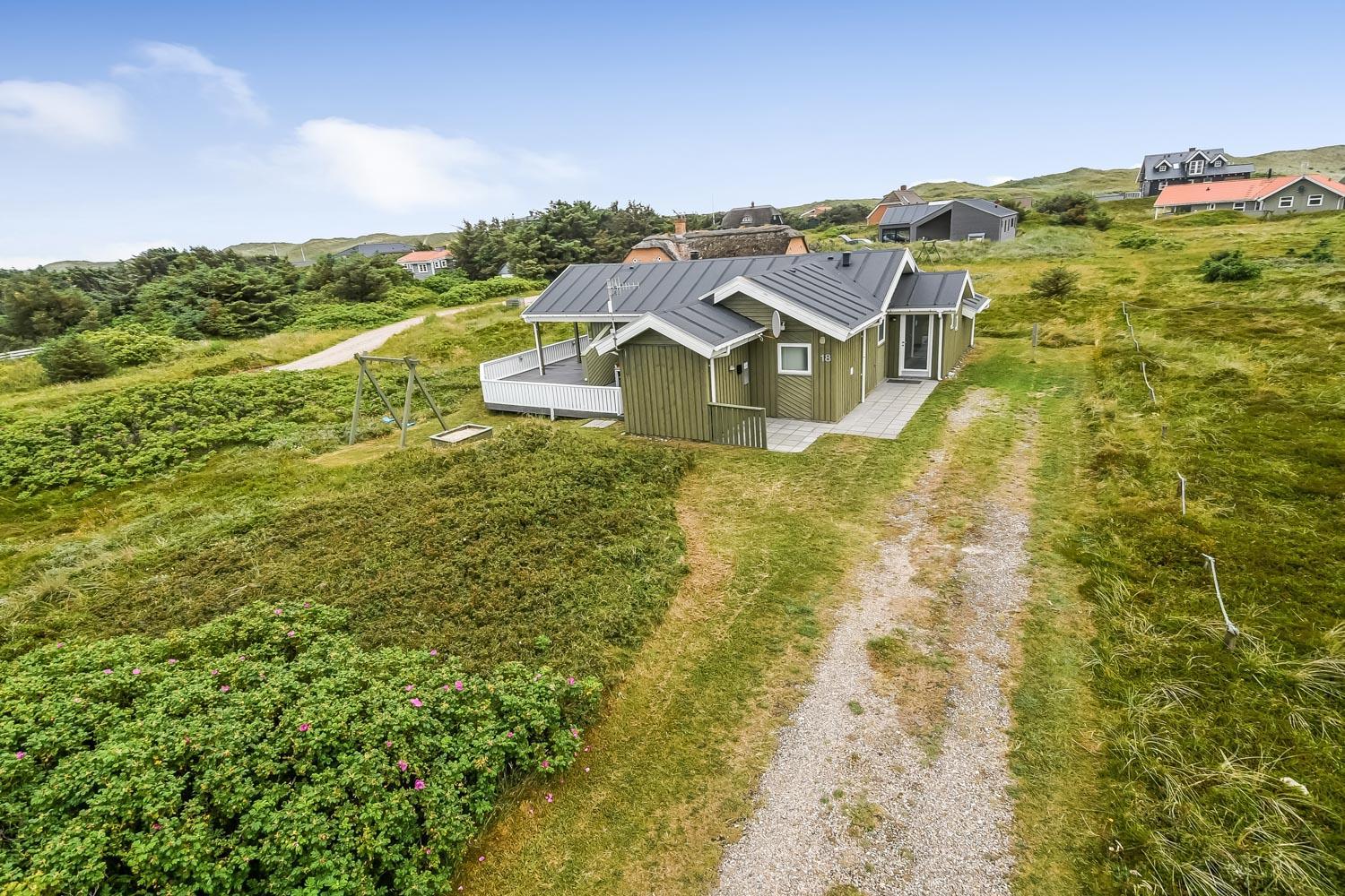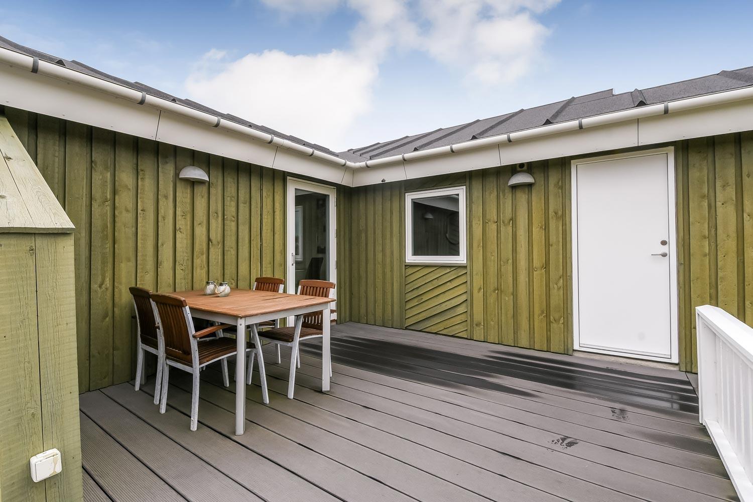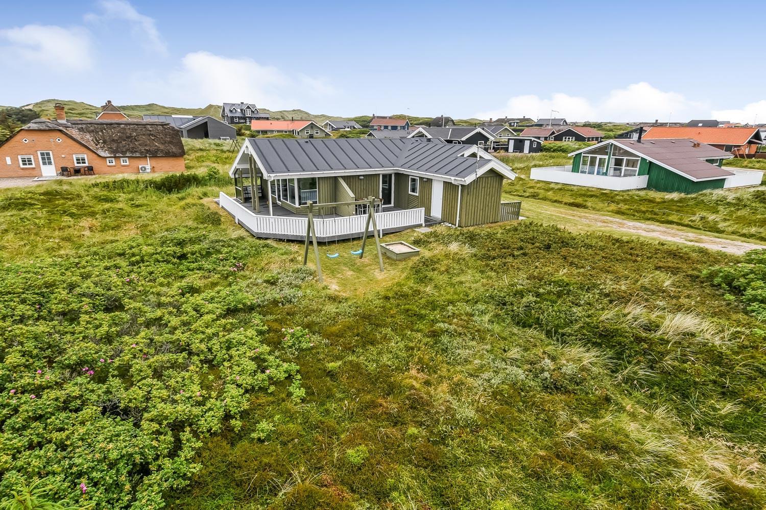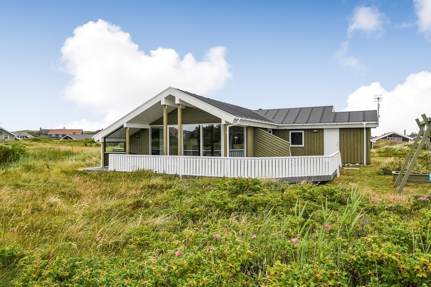 Terrasseforholdene ved huset er gode. Der er åbne og overdækkede områder ligesom der er meget gode læ forhold og terrassen er indhegnet. Der er selvfølgelig havemøbler, solvogne og grill som kan stilles efter behov, så man altid kan finde et sted i læ, i solen eller i skyggen. Fra huset er der en flot udsigt til de høje klitter ved Vesterhavet. Huset er også blot 250 m fra Vesterhavet, som hver dag byder på nye maleriske oplevelser. Til de mindste gæster er der en sandkasse og gynger. Området omkring huset er meget velegnet til vandre og cykelture. Et fantastisk hus som er perfekt for en familie eller et par som gerne vil bo tæt på Vesterhavet i et meget velholdt hus.