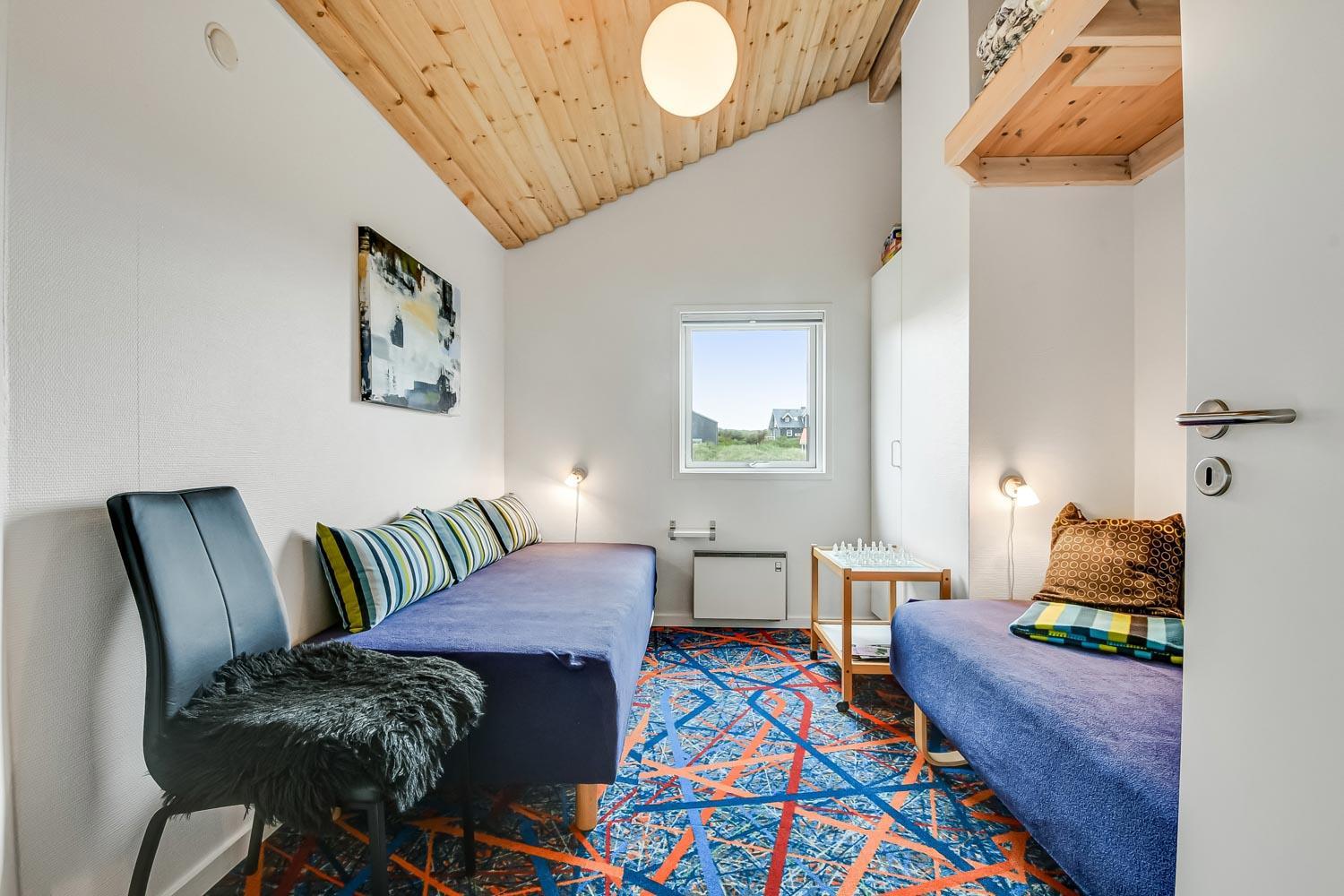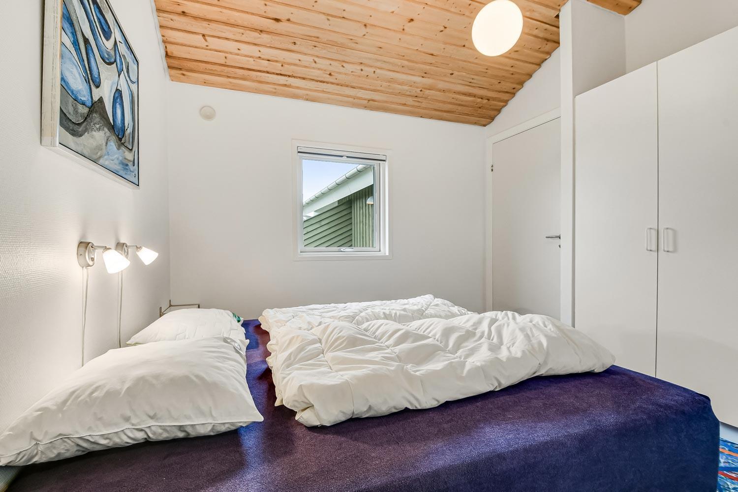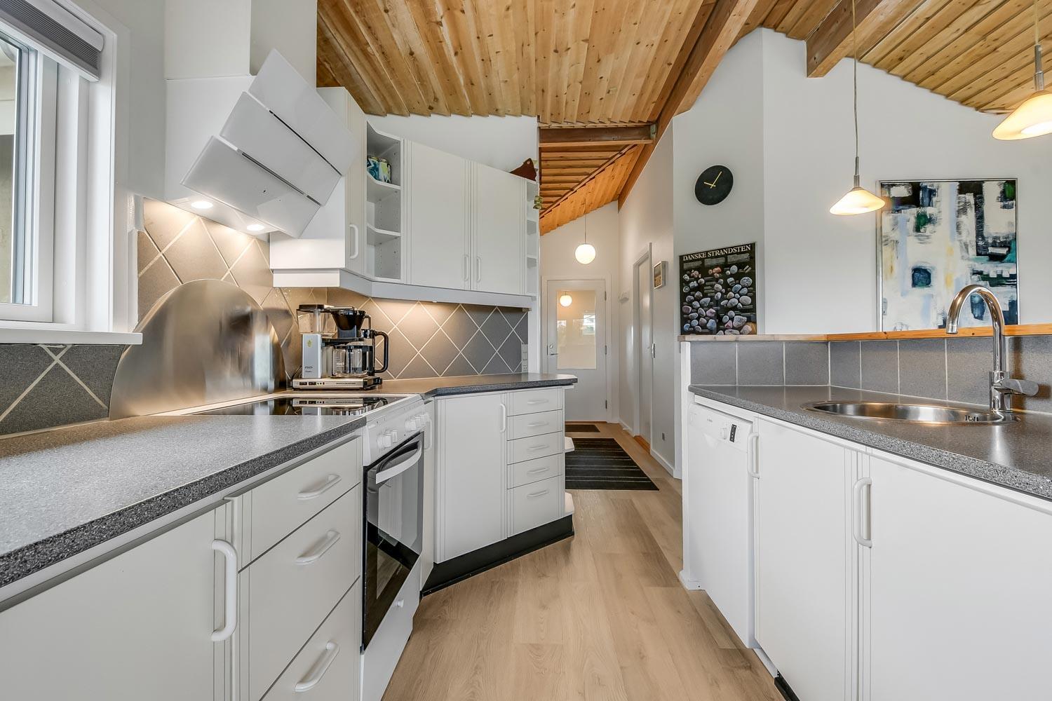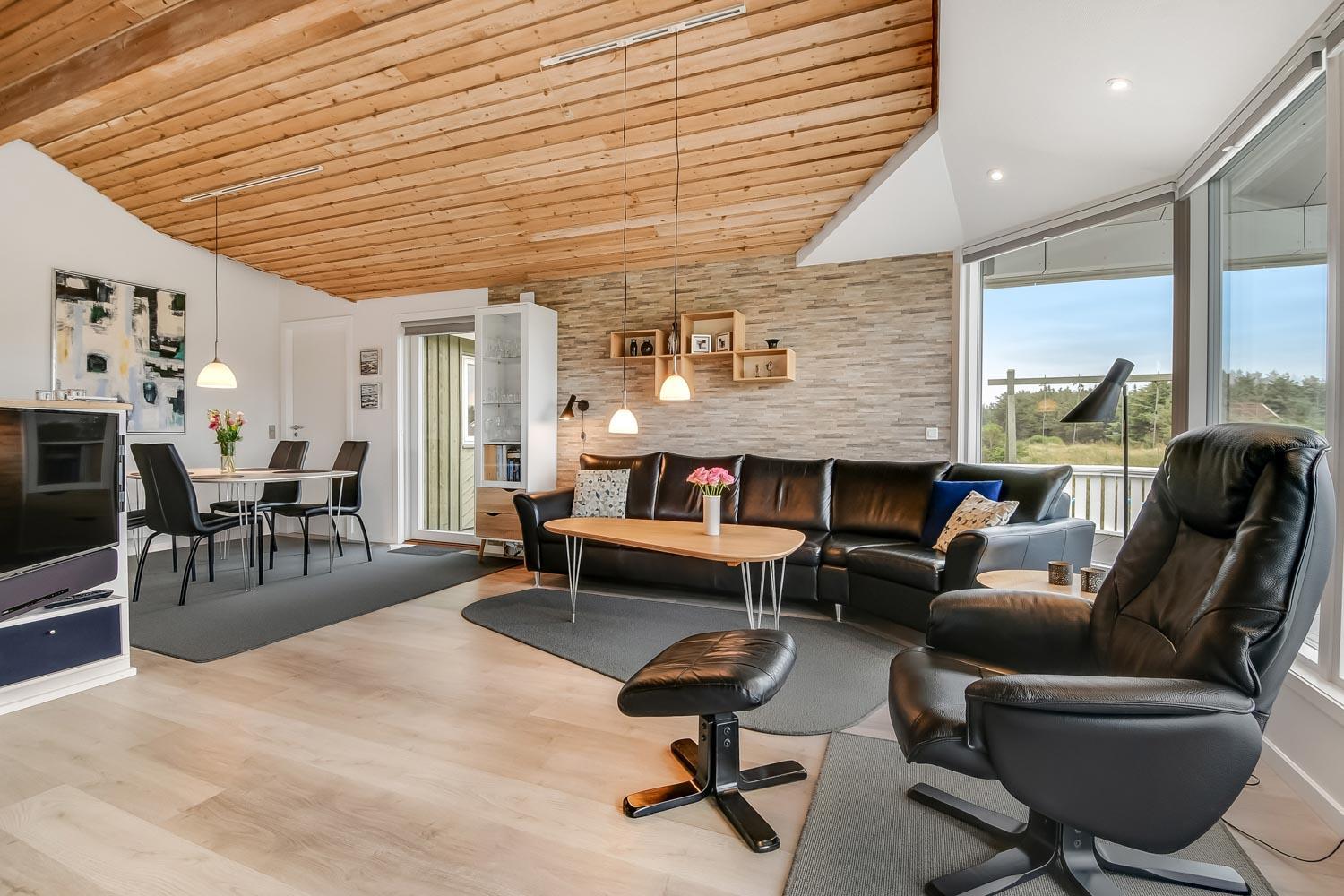 Dette meget smagfuldt og velholdte feriehus i træ er på 100 m2. Huset er indrettet med 3 dejlige værelser 1DS + 1DS + 2S og dertil kommer 2 ligge- muligheder i stuen (i en alkove). Stuen og køkken er kombineret og de store vinduespartier giver et godt lysindfald i hele rummet, der er trægulv i stueafdelingen og klinker i køkkenafdelingen. Stuen er indrettet med lædermøbler og spisebord som står tæt på køkkenet. Der er TV med parabol (kun tyske programmer) og danske programmer og der er ligeledes mulighed for at streame jeres egne TV eller radioprogrammer. Flot og meget veludstyret køkken med glaskeramisk komfur, kele-/fryseskab, opvaskemaskine og mikroovn. Meget flot badeværelse som er med toilet, håndvask, bruser, spa og indgang til sauna samt gulvvarme. Der er også et gæstetoilet med toilet og håndvask, her står også husets vaskemaskine og tørretumbler. I stuen er der også en skøn brændeovn som sammen med varmepumpen giver en behagelig varme også i de kolde perioder. Husdyr er ikke tilladt og rygning er ikke tilladt. Har man el-bil eller en Plug-In hybrid, så er der opsat ladeboks ved huset.