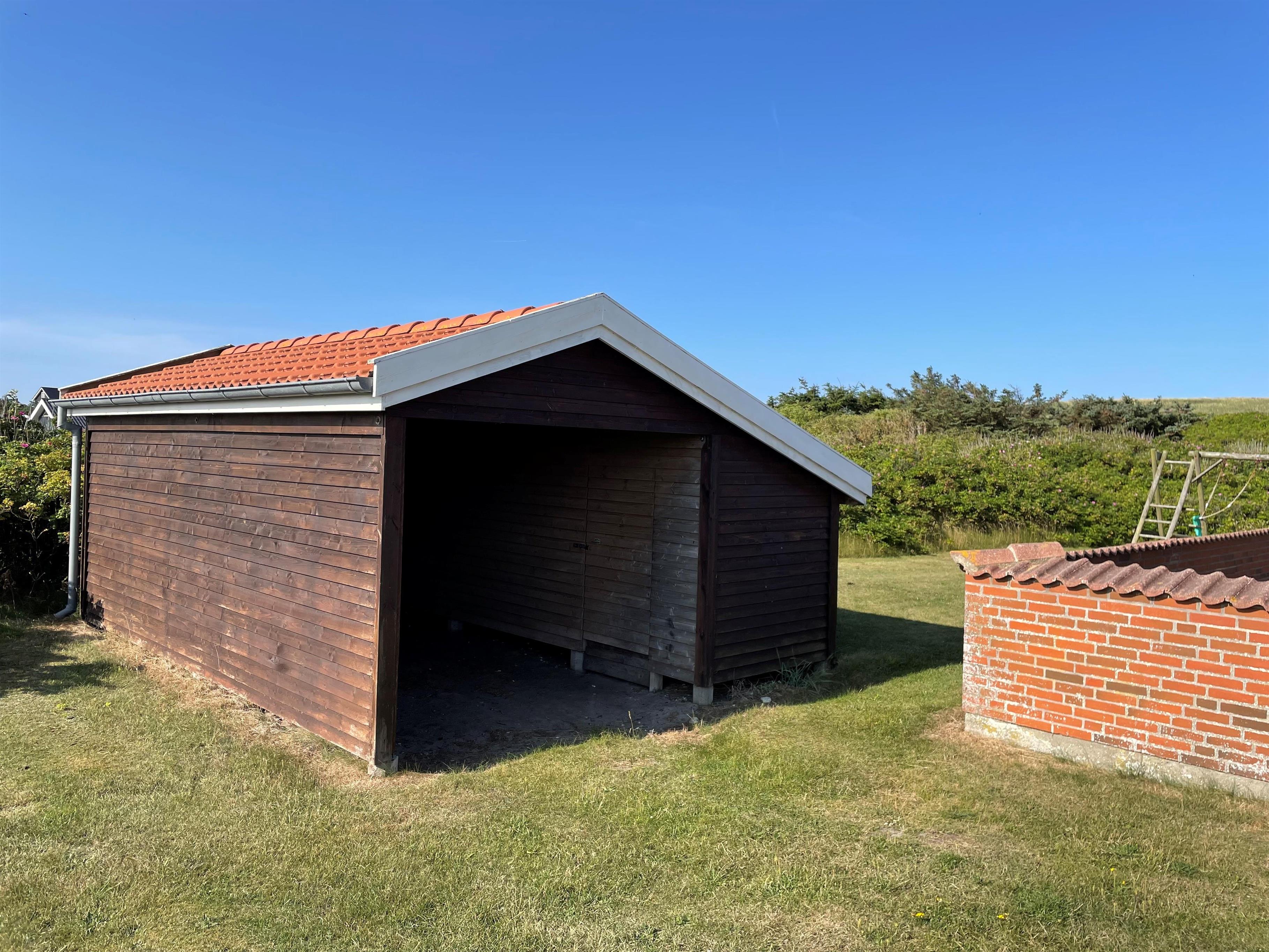 Feriehuset er beliggende på en stor naturgrund på 1.340 m2 blot 100 meter fra Vesterhavet. Bilen kan parkeres i husets carport.