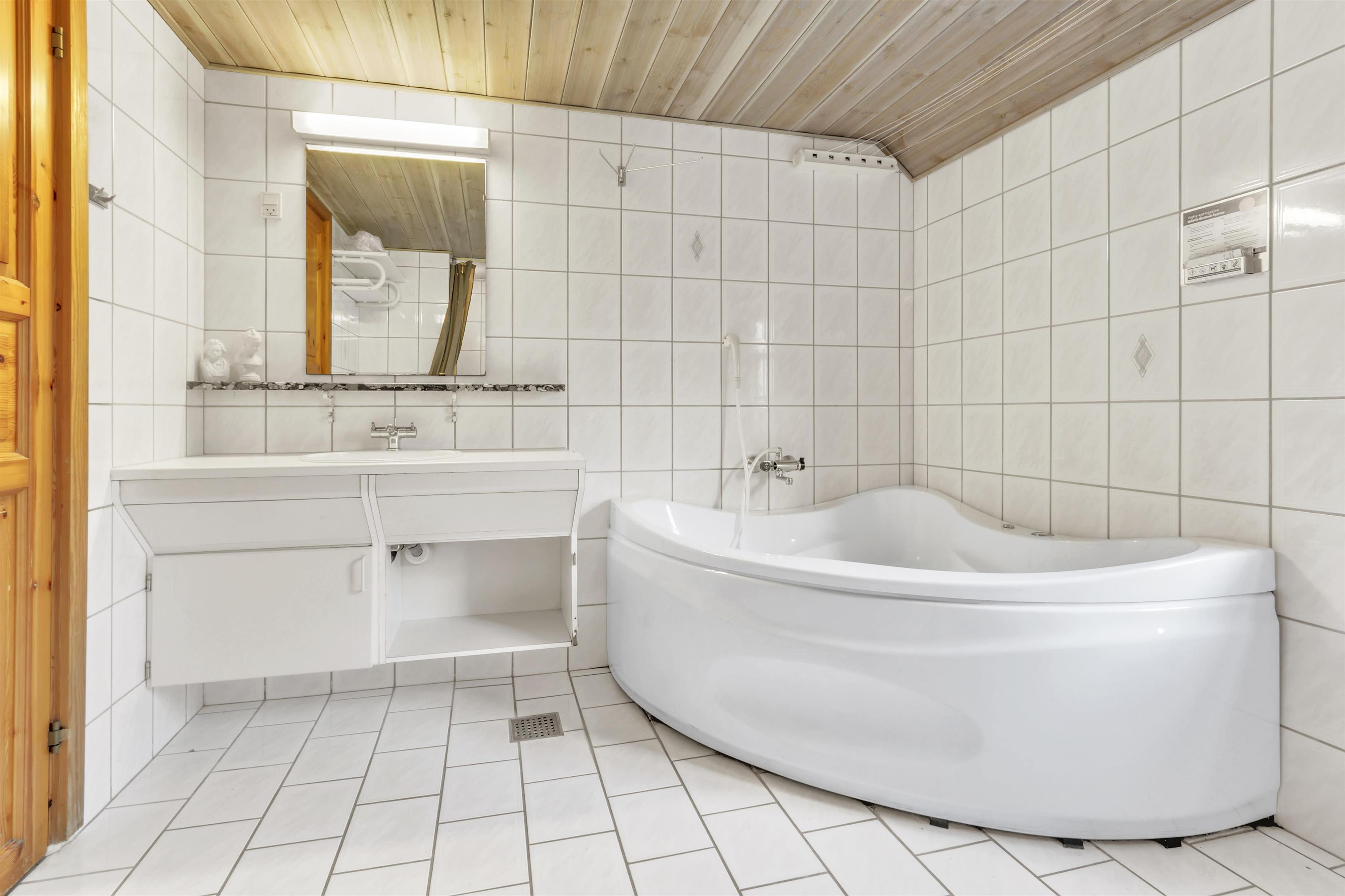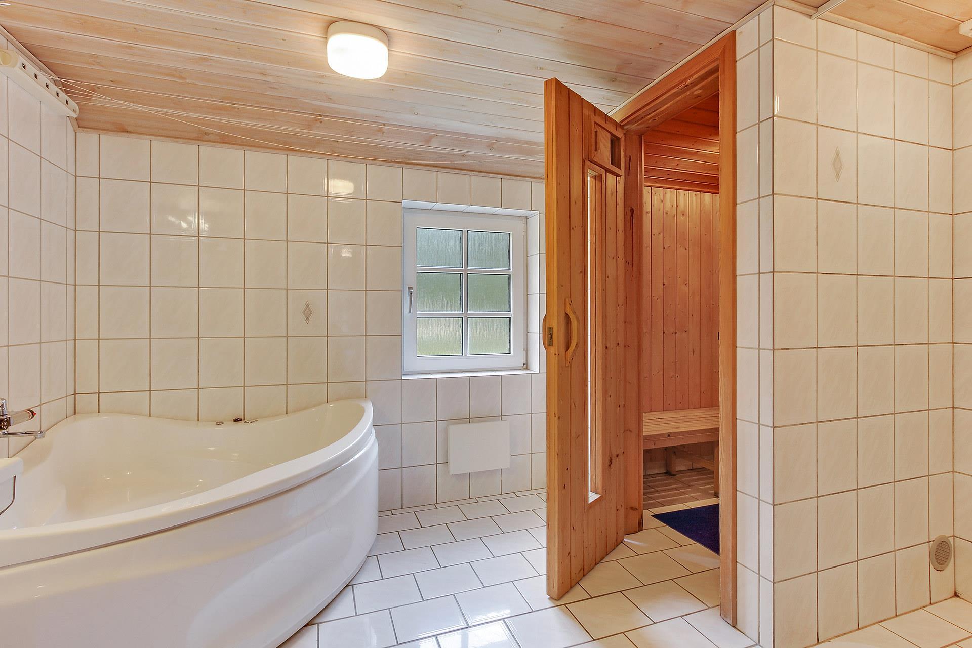 Indendørs mødes I af vandskurede vægge, smukke trælofter med synlige bjælker og opvarmede klinkegulve, der skaber en hyggelig og behagelig atmosfære. Huset rummer et stort badeværelse med 2-personers spa, bruseniche, toilet, håndvask og direkte adgang til en god sauna, samt et ekstra badeværelse med toilet, håndvask og bruser. Der er fire soverum med plads til hele familien, hvoraf tre har dobbeltsenge og ét har to enkeltsenge. Boxmadrasserne til dobbeltsengene måler 90x200 cm. Køkkenafdelingen er veludstyret med alt, hvad man behøver, herunder opvaskemaskine, varmluftovn, mikrobølgeovn og fryser. Den flotte og rummelige stue byder på brændeovn og varmepumpe, som begge bidrager til at reducere elforbruget, samt stereoanlæg med CD-afspiller og TV via internet med forskellige kanaler. Huset er desuden udstyret med vaskemaskine, barneseng og høj barnestol, hvilket gør det ideelt for familier.