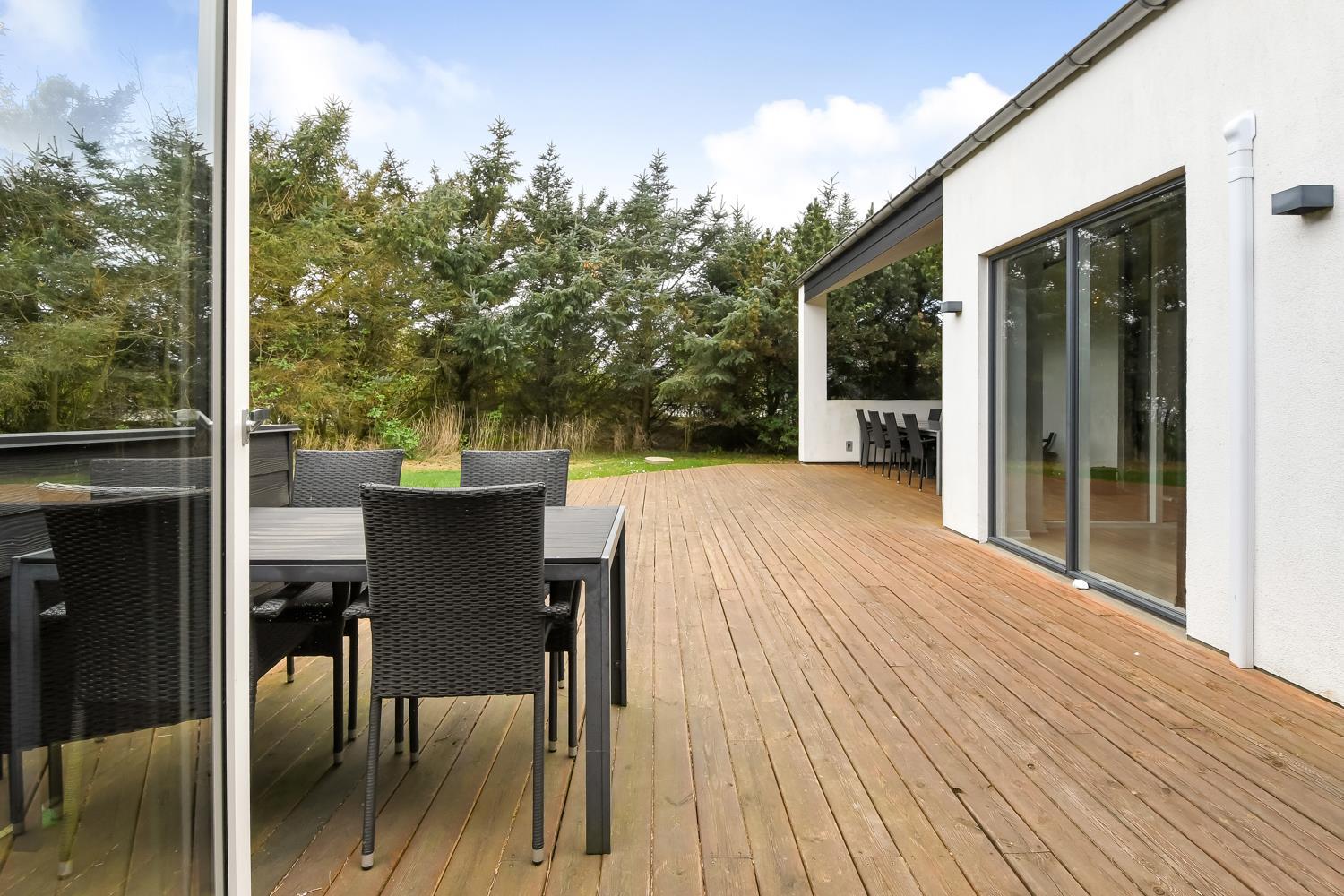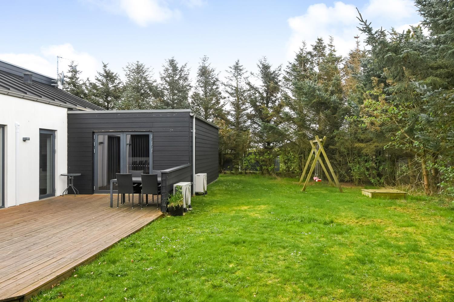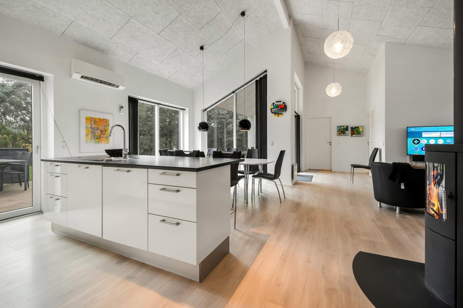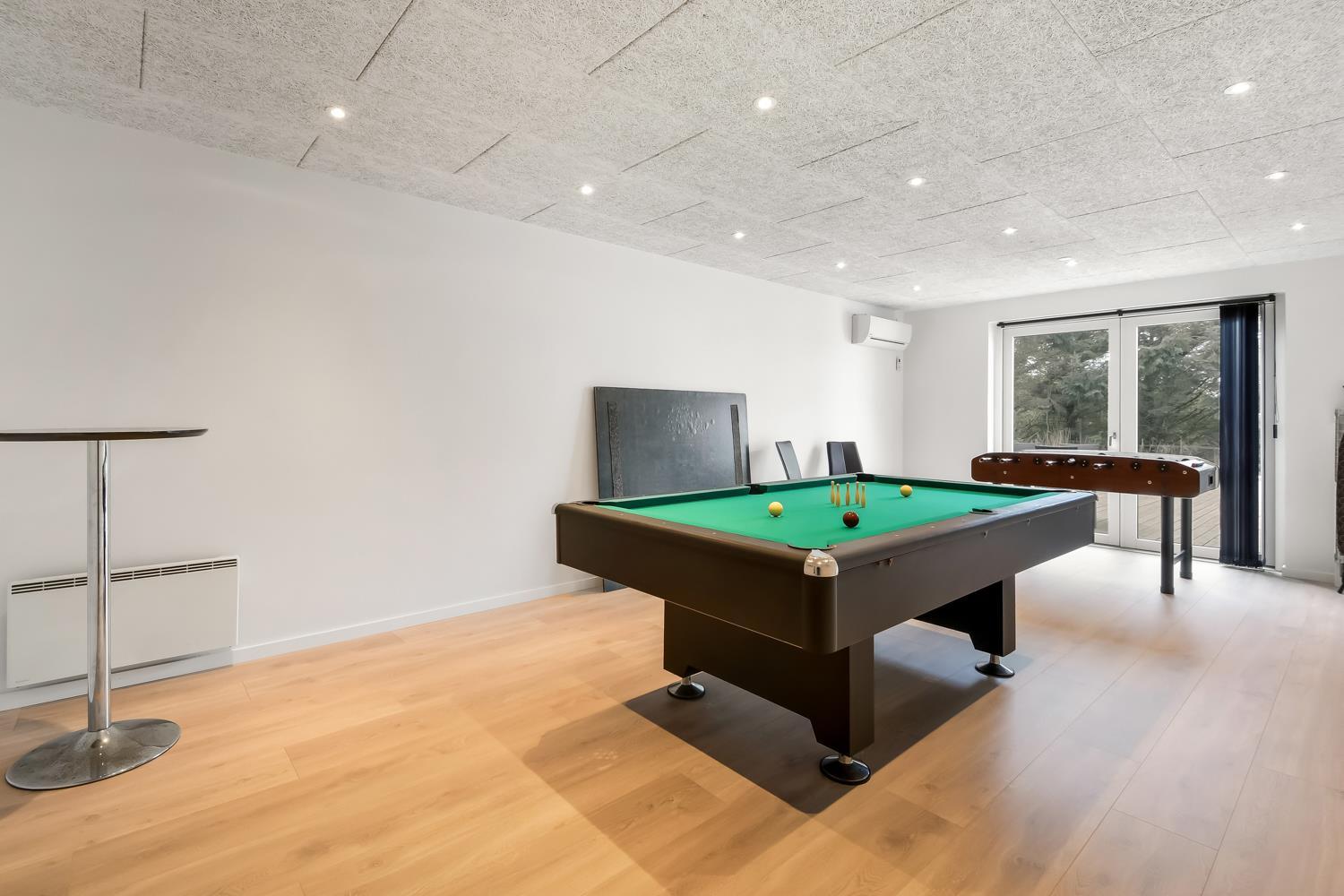 Fantastisk hus som er bygget i 2011 og er 160 m2 stort. Efter at have parkeret bilen ved huset byder en flot entré velkommen. Fra entréen er der adgang til husets flotte kombineret opholdsrum og køkkenhjørne. 4 rummelige soveværelser (1DS, 1DS, 1DS, 1DS+1S over dobbeltsengen) som alle har gode boksmadrasser og skabsplads. Huset har et fantastiske hovedrum, som består af et flot åbent samtalekøkken og en dejlig kombineret opholdsstue med spiseplads og lædermøbler. Det stilfulde åbne køkken er moderne indrettet og byder på alt i hårde hvidevare og service / køkkengrej. Opvasken klares nemt i opvaskemaskinen. Dagligvarerindkøbene opbevares på køl i det store køleskab / fryseskab og måltiderne klares ubesværet ved den keramiske kogeplade, mikroovnen og den indbyggede ovn. Mados suges væk af den kraftige emhætte i køkkenet. Selvfølgelig kan den tilberedte mad serveres på terrassen via døren fra køkkenet, som fører direkte ud til terrassen. Et flot spisebord med plads til alle mand er placeret praktisk lige ved køkkenet. Opholdsstuen byder på lædermøbler ved husets smart-TV, som har indbygget danske og tyske TV-programmer og mulighed for streamingstjenester og der er også radio / CD / DVD. Nyd flammerne i brændeovnen, som både sørger for god varme og ekstra hygge ligesom varmepumpen også hjælper til at spare på forbrugsomkostningerne og sørger for et super indeklima. Fra opholdsstuen er der også udgang til husets terrasseanlæg. Aktivitetsrum med billardbord, som også kan laves om til et bordtennisbord, bordfodbold, varmepumpe samt udgang til terrasseanlægget. I den ene ende af huset er det store, rummelige badeværelse har spabad, direkte adgang til saunaen, toilet, håndvask, klinkegulv med gulvvarme og bruseniche med glasdør. I den anden ende af huset er der endnu et badeværelse med toilet, håndvask, bruseniche, vaskemaskine og klinkegulv med gulvvarme.