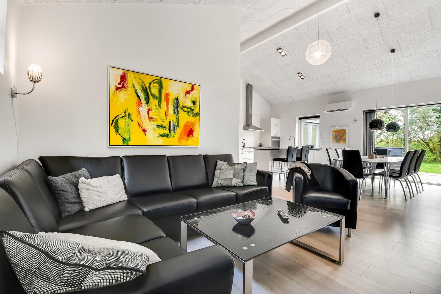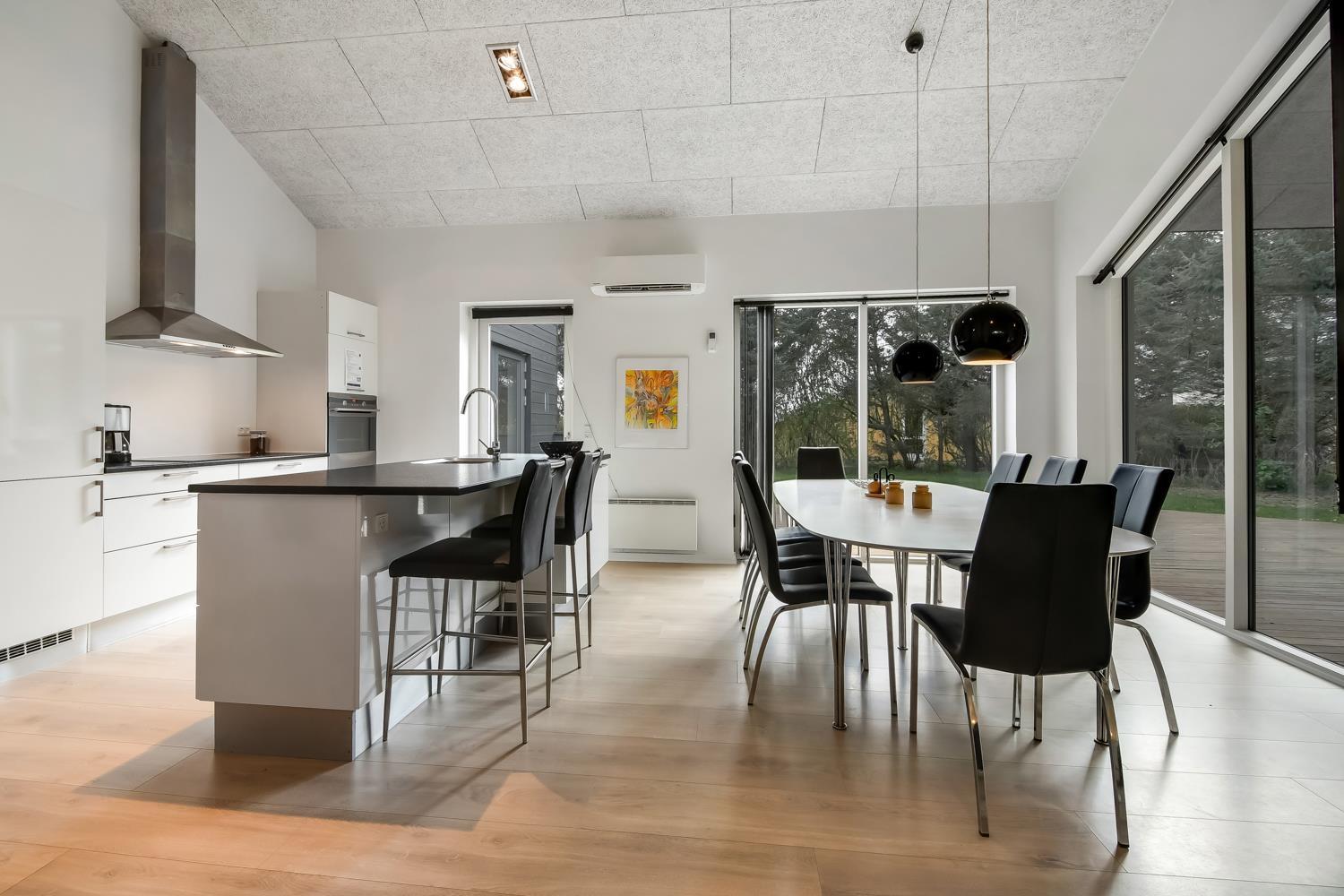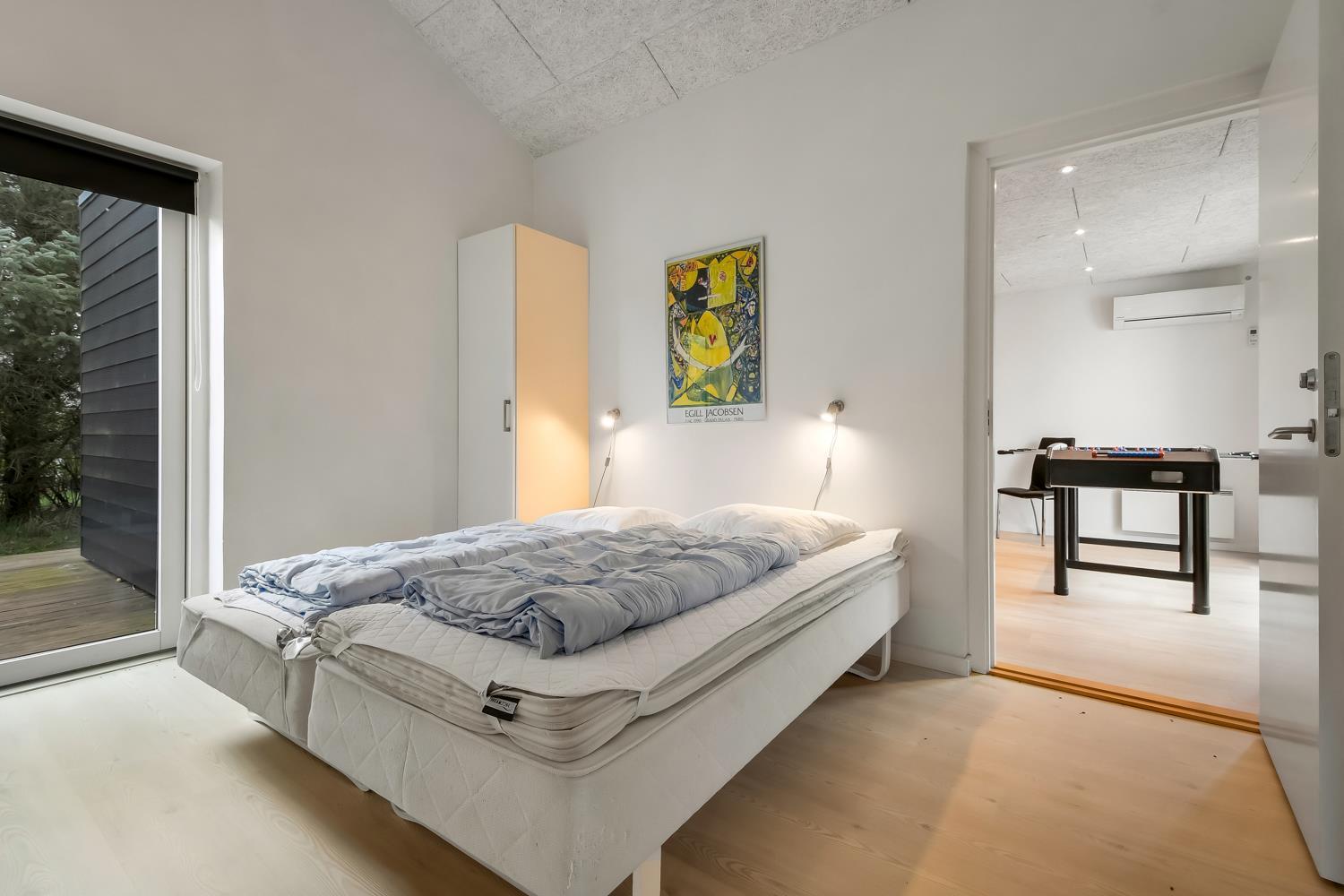 Fantastisk hus som er bygget i 2011 og er 160 m2 stort. Efter at have parkeret bilen ved huset byder en flot entré velkommen. Fra entréen er der adgang til husets flotte kombineret opholdsrum og køkkenhjørne. 4 rummelige soveværelser (1DS, 1DS, 1DS, 1DS+1S over dobbeltsengen) som alle har gode boksmadrasser og skabsplads. Huset har et fantastiske hovedrum, som består af et flot åbent samtalekøkken og en dejlig kombineret opholdsstue med spiseplads og lædermøbler. Det stilfulde åbne køkken er moderne indrettet og byder på alt i hårde hvidevare og service / køkkengrej. Opvasken klares nemt i opvaskemaskinen. Dagligvarerindkøbene opbevares på køl i det store køleskab / fryseskab og måltiderne klares ubesværet ved den keramiske kogeplade, mikroovnen og den indbyggede ovn. Mados suges væk af den kraftige emhætte i køkkenet. Selvfølgelig kan den tilberedte mad serveres på terrassen via døren fra køkkenet, som fører direkte ud til terrassen. Et flot spisebord med plads til alle mand er placeret praktisk lige ved køkkenet. Opholdsstuen byder på lædermøbler ved husets smart-TV, som har indbygget danske og tyske TV-programmer og mulighed for streamingstjenester og der er også radio / CD / DVD. Nyd flammerne i brændeovnen, som både sørger for god varme og ekstra hygge ligesom varmepumpen også hjælper til at spare på forbrugsomkostningerne og sørger for et super indeklima. Fra opholdsstuen er der også udgang til husets terrasseanlæg. Aktivitetsrum med billardbord, som også kan laves om til et bordtennisbord, bordfodbold, varmepumpe samt udgang til terrasseanlægget. I den ene ende af huset er det store, rummelige badeværelse har spabad, direkte adgang til saunaen, toilet, håndvask, klinkegulv med gulvvarme og bruseniche med glasdør. I den anden ende af huset er der endnu et badeværelse med toilet, håndvask, bruseniche, vaskemaskine og klinkegulv med gulvvarme.