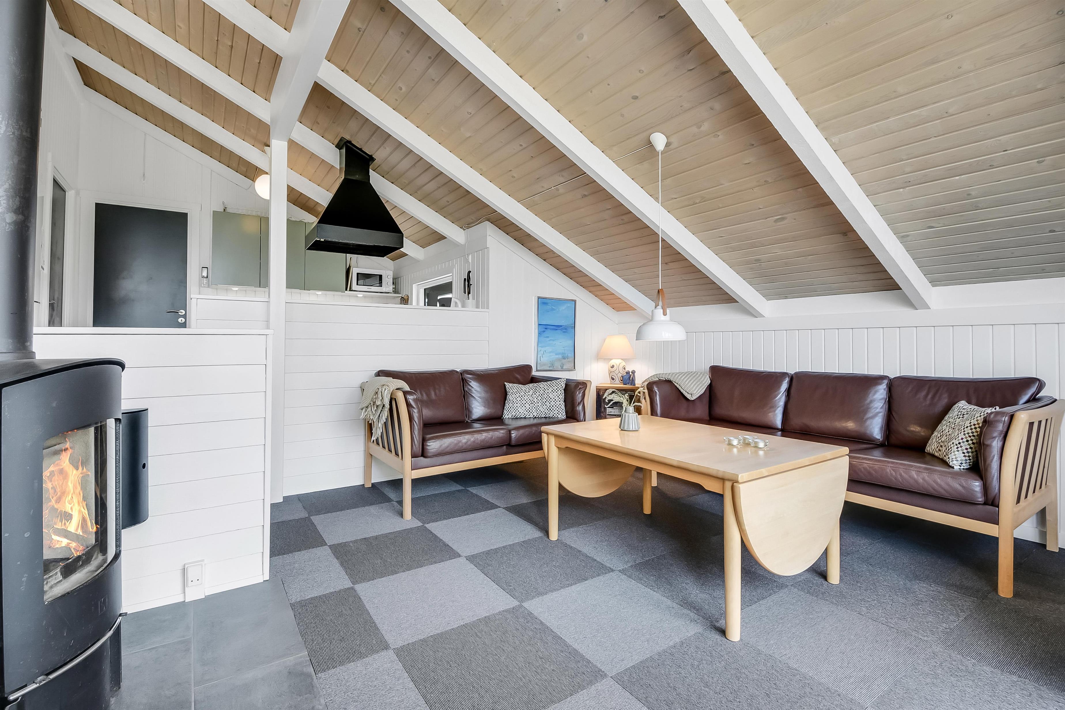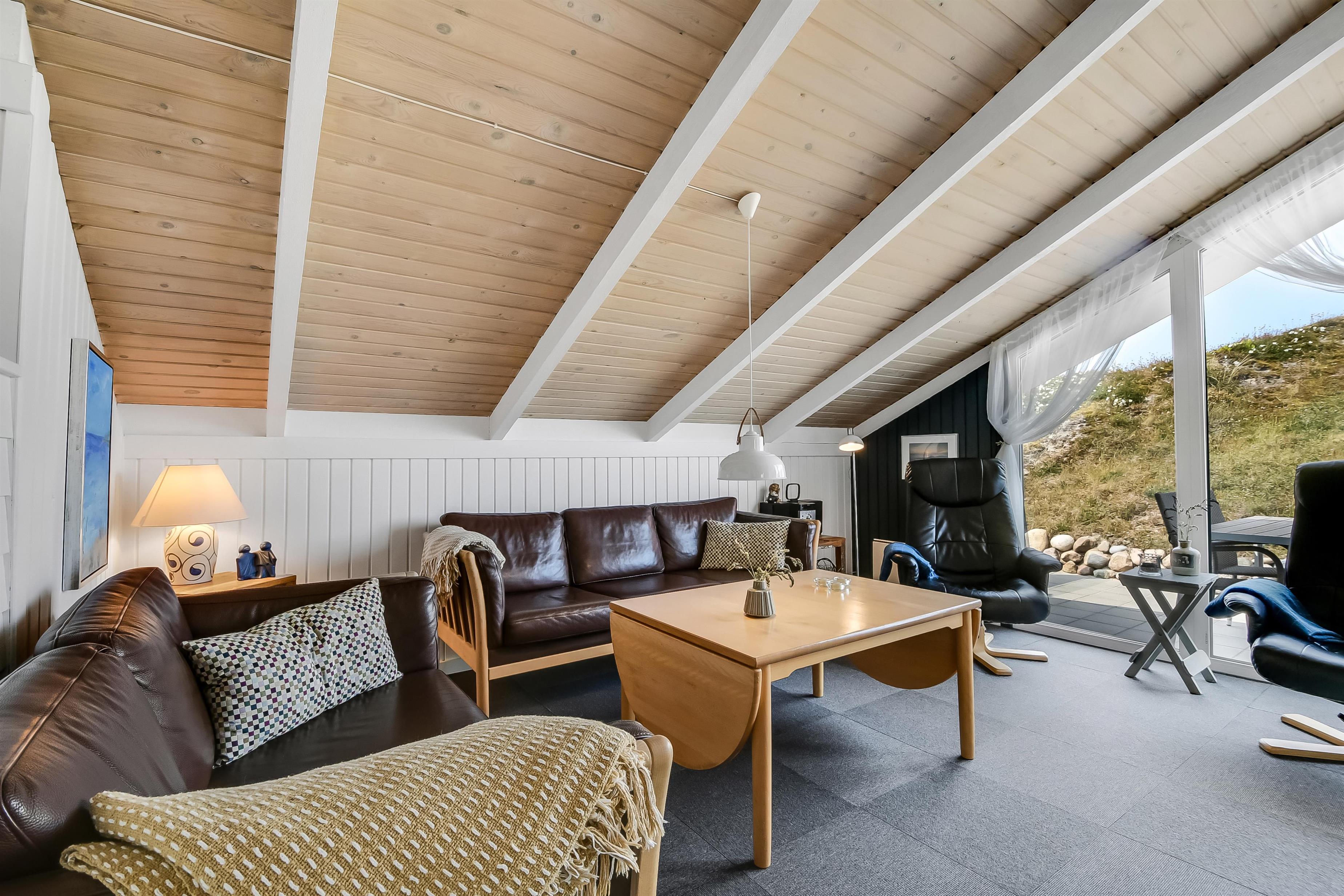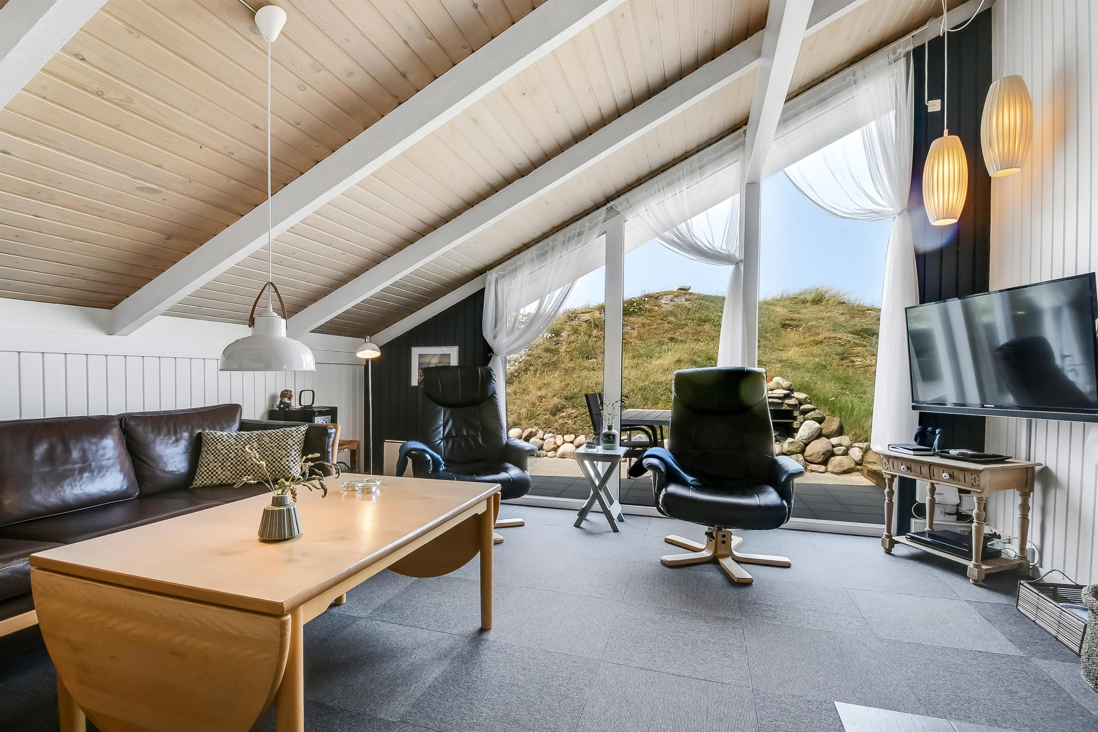 Huset indeholder en forsænket pejsestue kombineret med spisestue og køkken. Køkkenet er åbent og veludstyret. Pejsestuen er indrettet med lædermøbler, TV med danske og tyske programmer og en skøn brændeovn, som giver en hyggelig varme i de kolde perioder på året. Der er desuden DVD og stereoanlæg med CD. Spisestuen har et stort vinduesparti, så man fra spisebordet har en flot udsigt ud over området. Nyrenoveret badeværelse med toilet, håndvask og bruser og vaskemaskine. Huset har 4 soverum: 3 med dobbeltsenge og et med 2 enkeltsenge. Fra gangen er der adgang til husets sauna. Huset har 2 nyrenoverede terrasser, som er udstyret med havemøbler og liggestole. 1 husdyr er tilladt. Ikke ryger-hus.