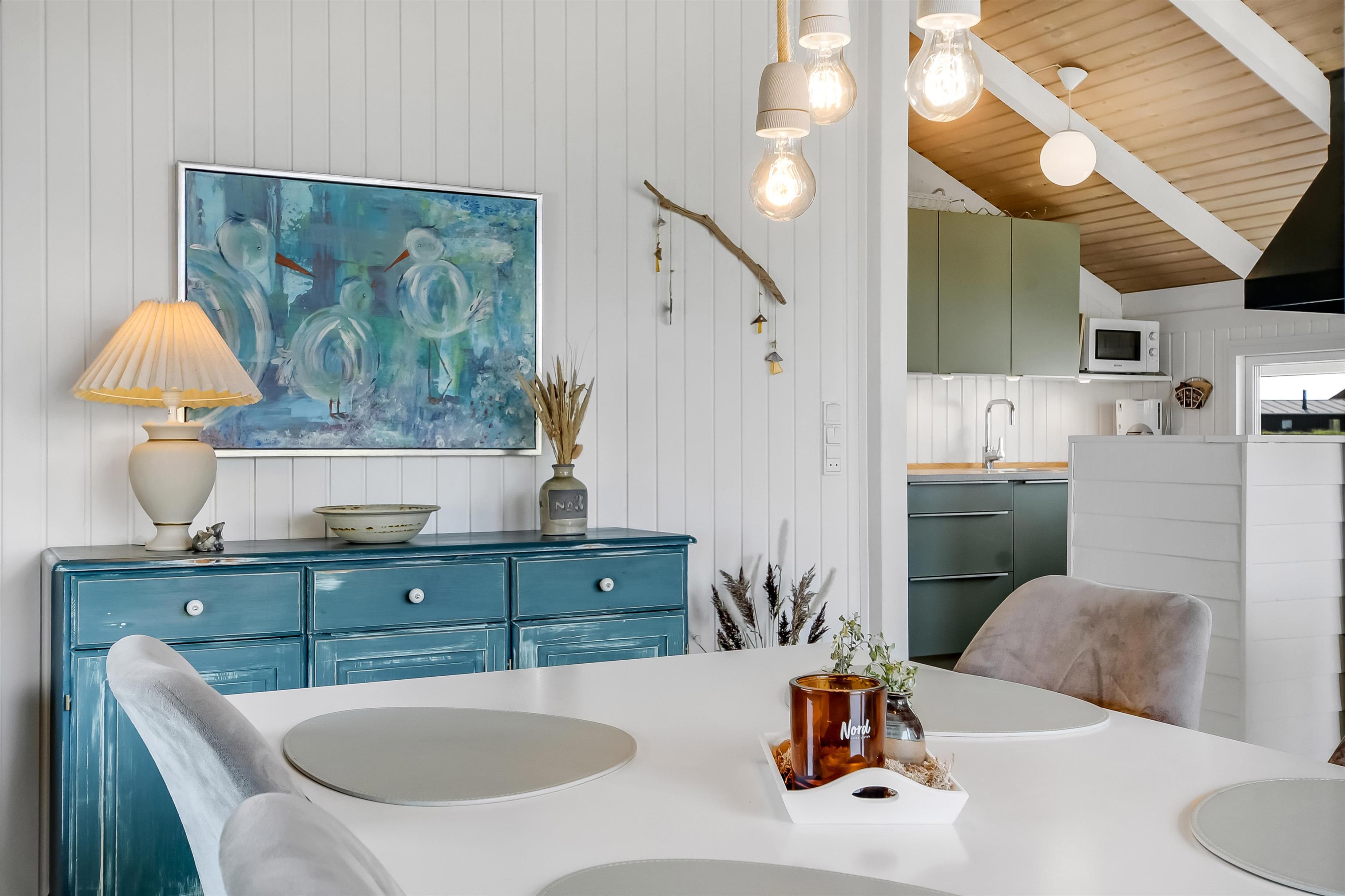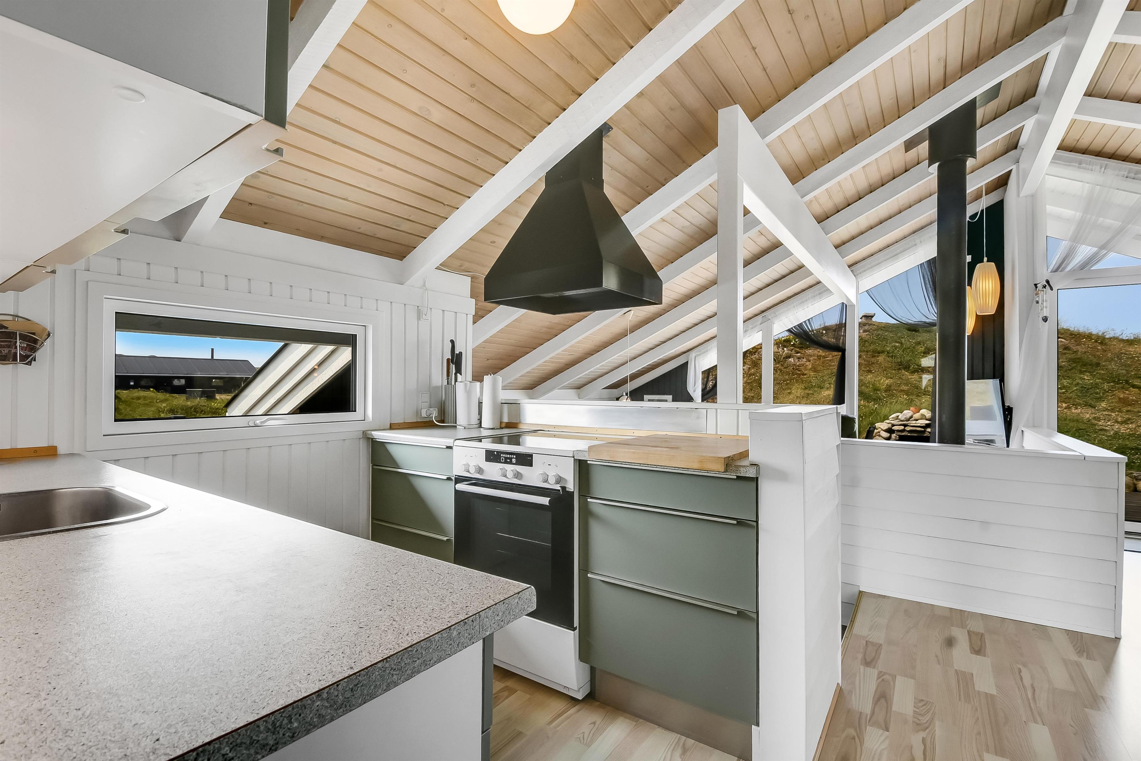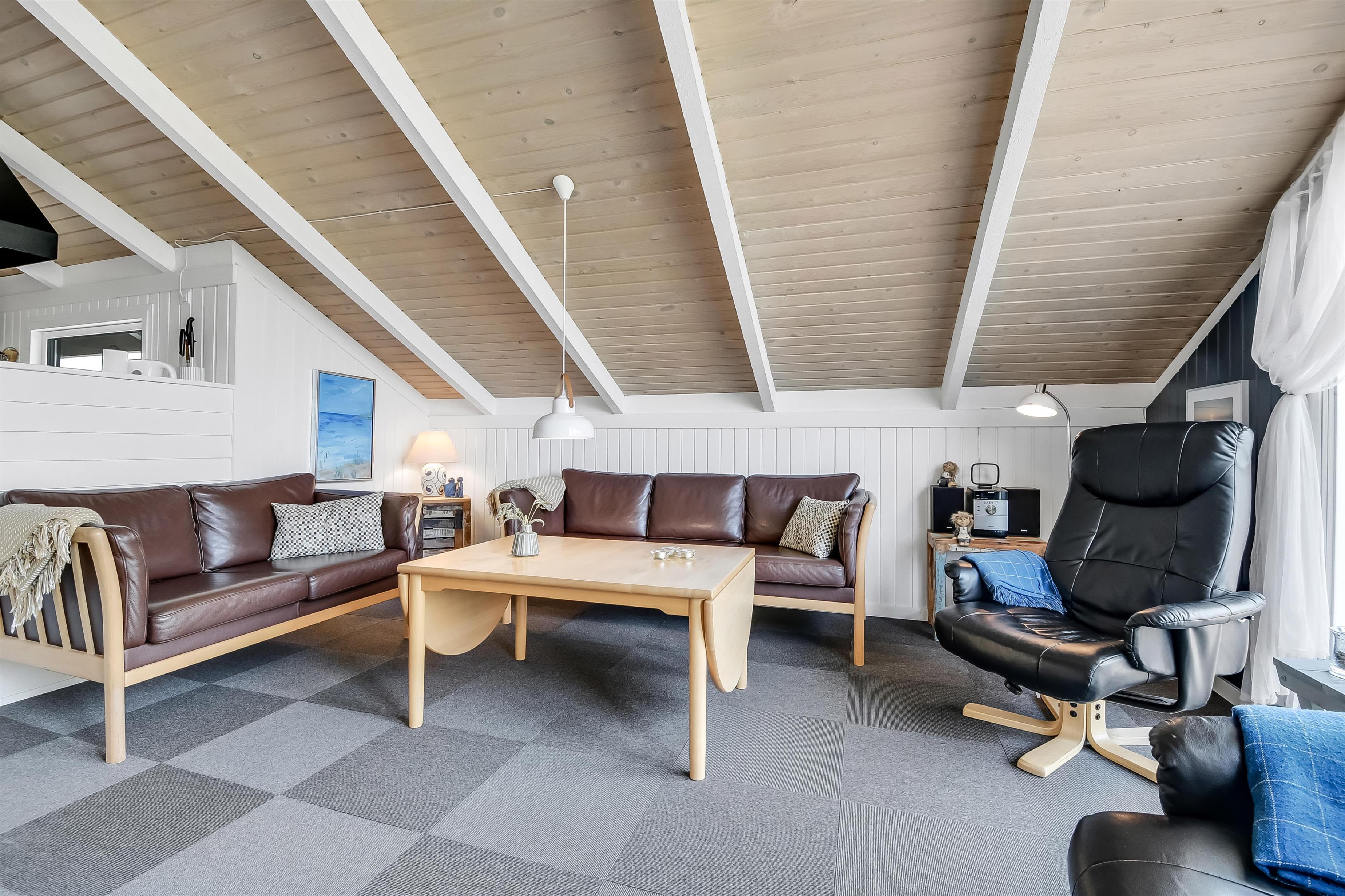 Huset indeholder en forsænket pejsestue kombineret med spisestue og køkken. Køkkenet er åbent og veludstyret. Pejsestuen er indrettet med lædermøbler, TV med danske og tyske programmer og en skøn brændeovn, som giver en hyggelig varme i de kolde perioder på året. Der er desuden DVD og stereoanlæg med CD. Spisestuen har et stort vinduesparti, så man fra spisebordet har en flot udsigt ud over området. Nyrenoveret badeværelse med toilet, håndvask og bruser og vaskemaskine. Huset har 4 soverum: 3 med dobbeltsenge og et med 2 enkeltsenge. Fra gangen er der adgang til husets sauna. Huset har 2 nyrenoverede terrasser, som er udstyret med havemøbler og liggestole. 1 husdyr er tilladt. Ikke ryger-hus.
