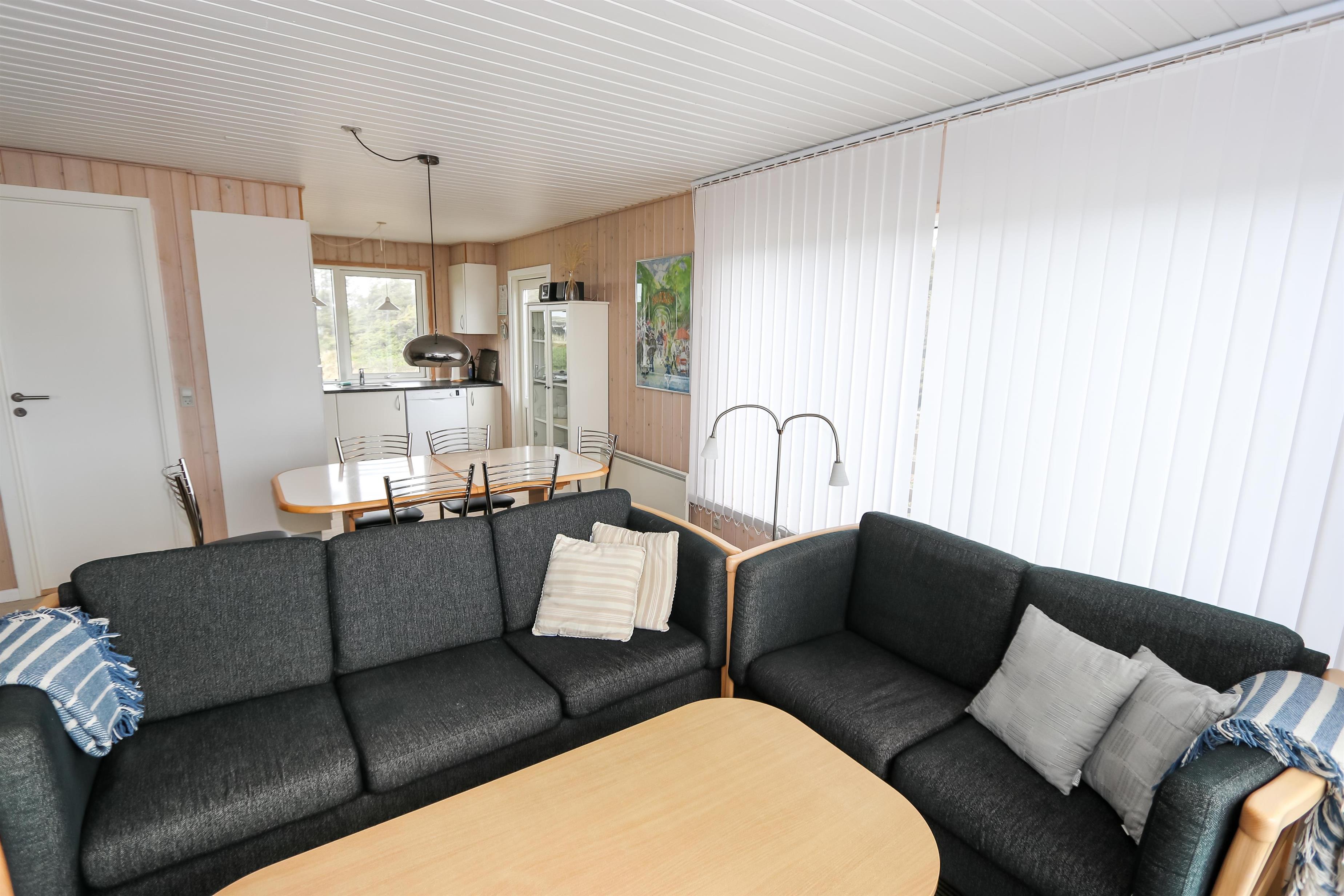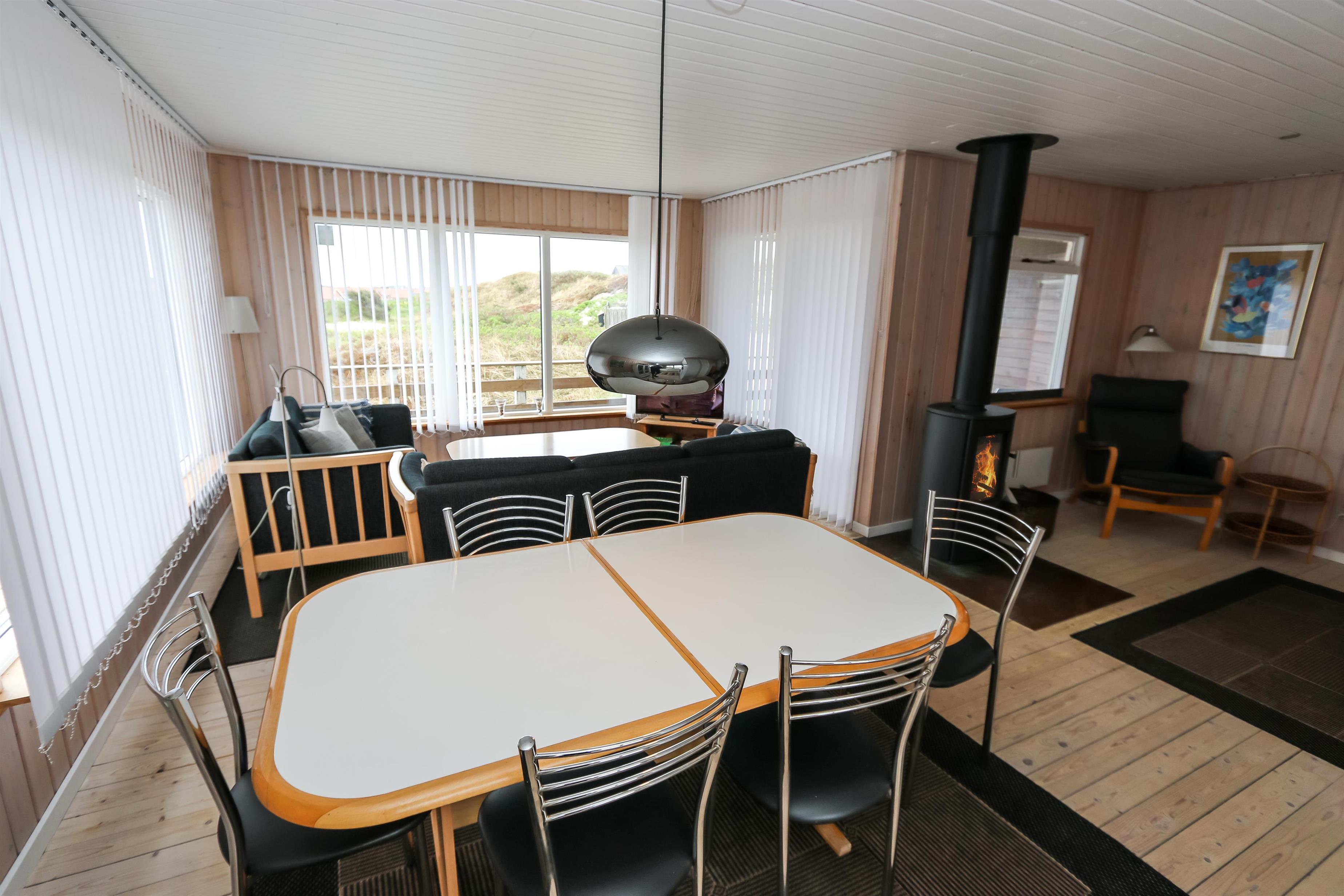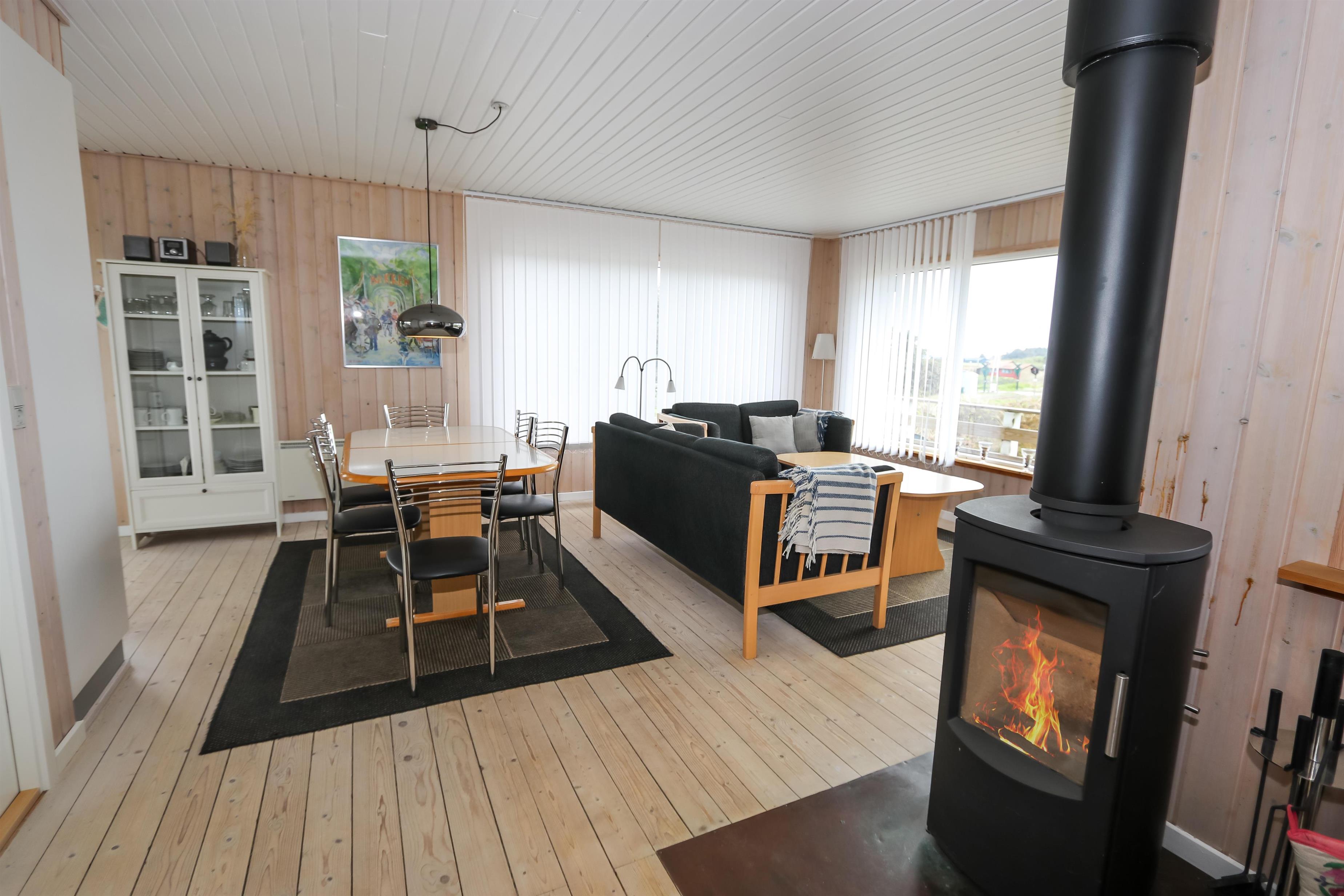 Indvendigt byder huset på smukke trælofter og trægulve med løse tæpper, som skaber en varm og hyggelig atmosfære. Den rummelige opholdsstue er indrettet med pæne og komfortable møbler og indbyder til afslapning efter en dag ved havet. Her kan I nyde varmen fra brændeovnen på køligere dage eller slappe af foran fladskærms-tv med parabol og et bredt udvalg af kanaler.