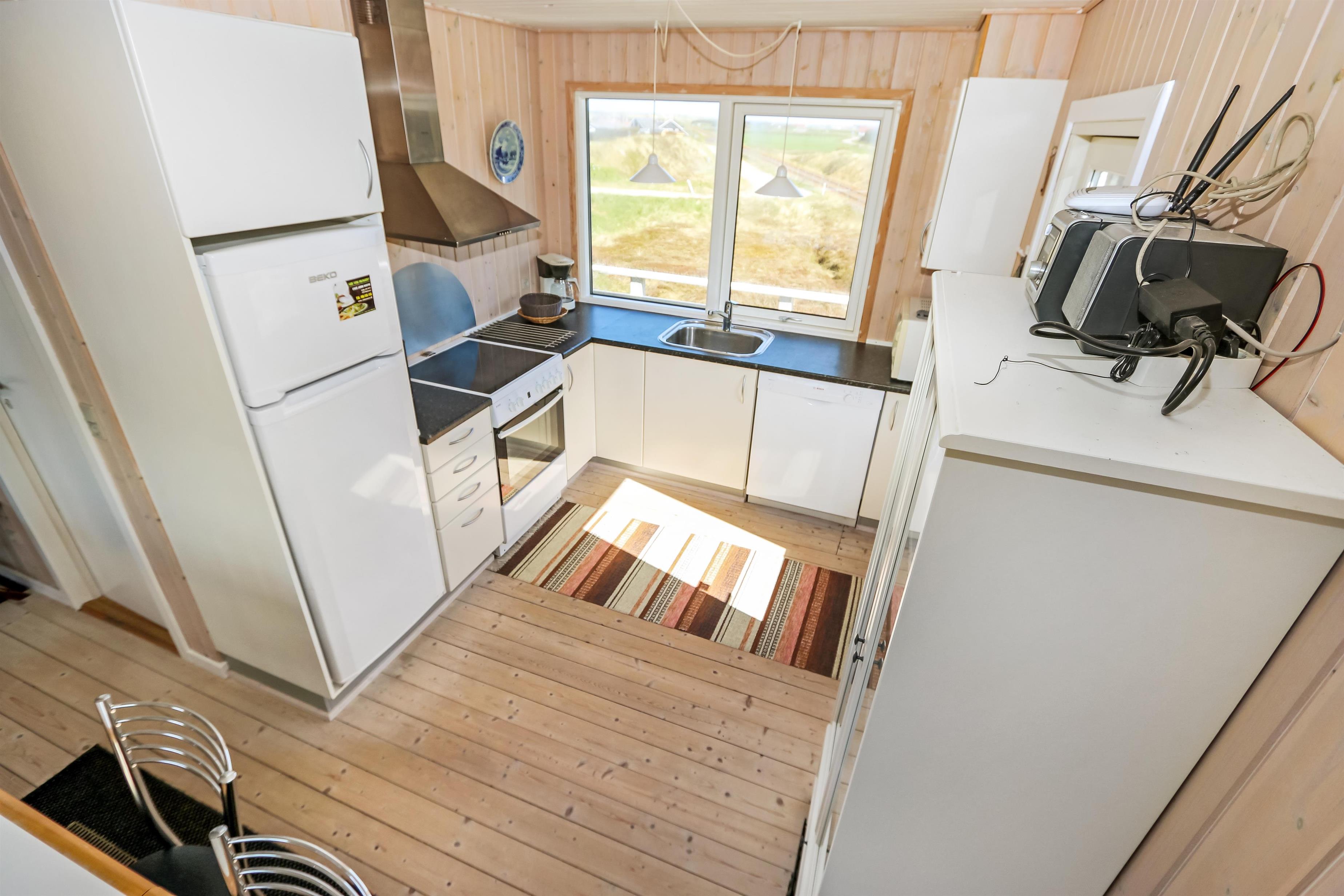 Køkkenet er funktionelt og veludstyret med glaskeramisk komfur, opvaskemaskine, mikroovn samt køle-/fryseskab – perfekt til både hurtige feriemåltider og hyggelige middage. Spisepladsen ligger i naturlig forbindelse med opholdsstuen, så samvær og nærvær er i centrum.