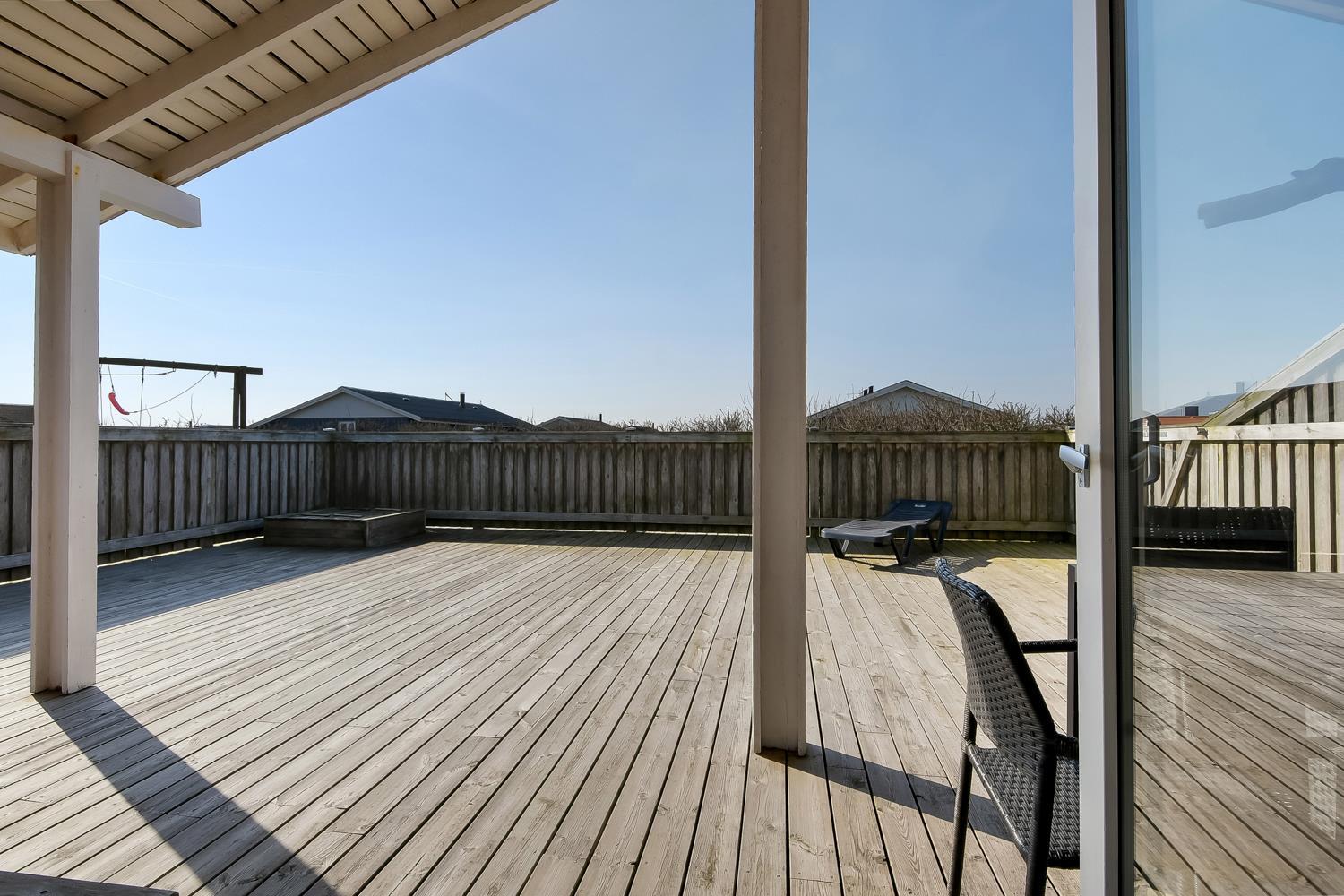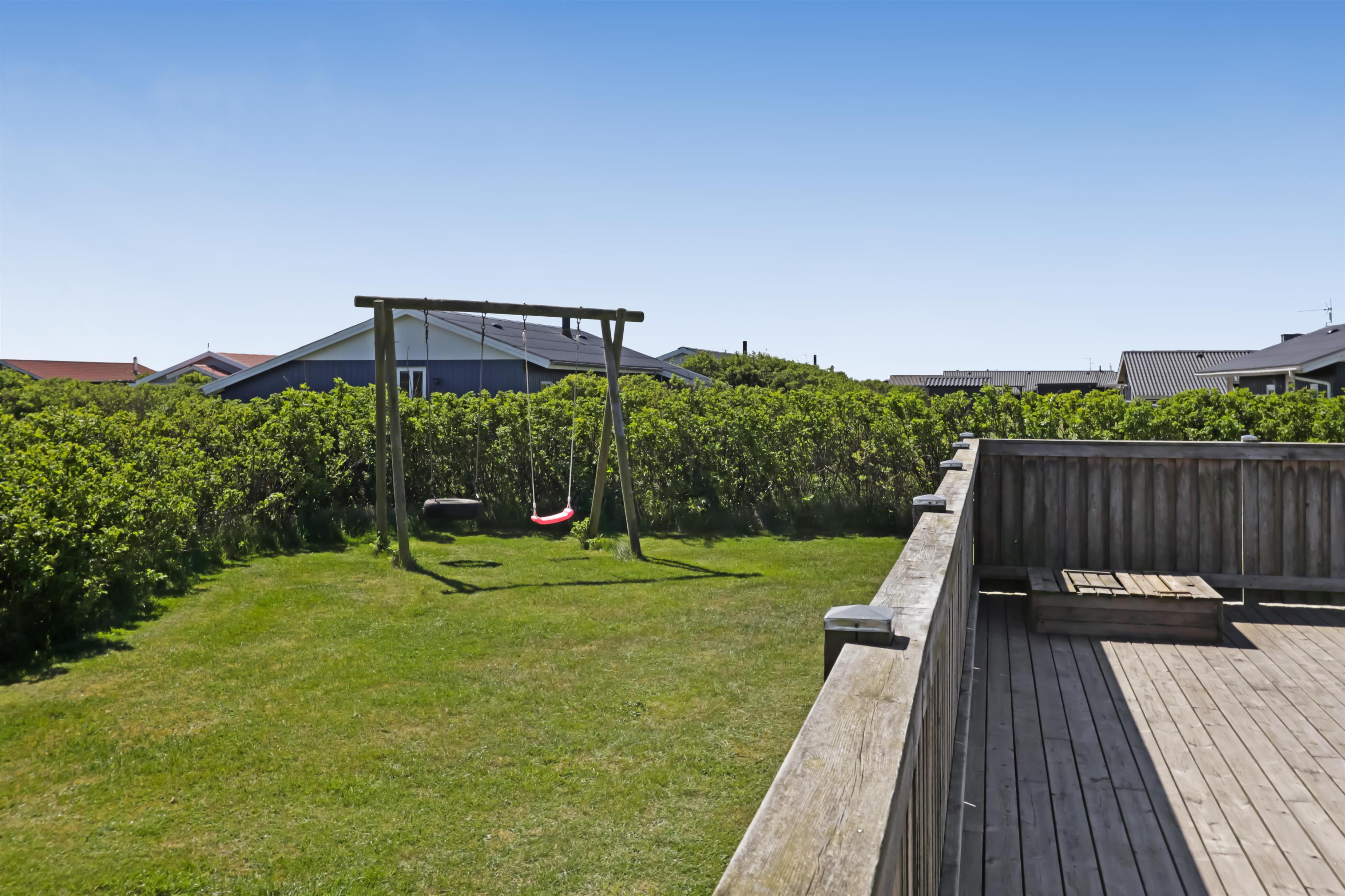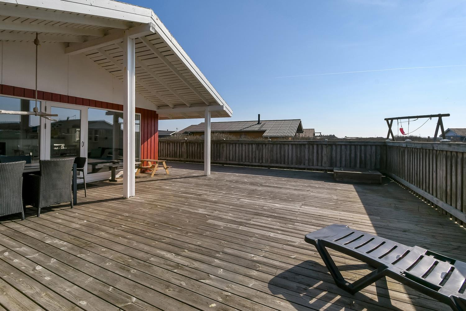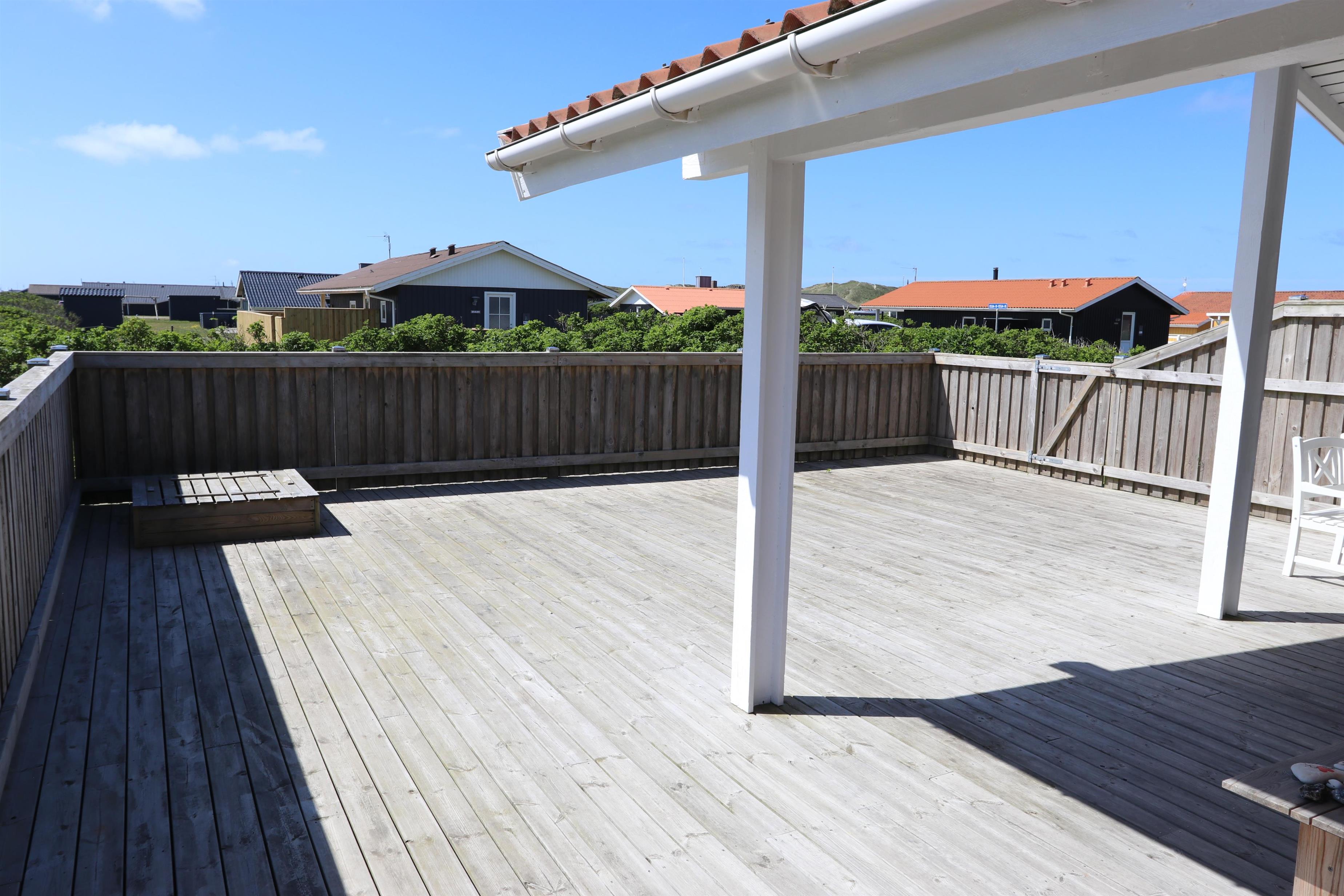 Udgang til flot, stor og delvis overdækket træterrasse med havemøbler, solvogne og grill. Velholdt, indhegnet grund med gynger og sandkasse samt mange muligheder for udendørs aktivitet. Et flot feriehus med god plads og en fantastisk velplejet grund. Medbringes børn og husdyr, er det optimalt, at de kan løbe rundt på den indhegnede gund. Tæt ved restaurant, indkøb samt Vesterhavet. Området er karakteriseret med ekseptionel natur, som udover det brusende Vesterhav også byder på barske klitter og smukke lyngarealer.