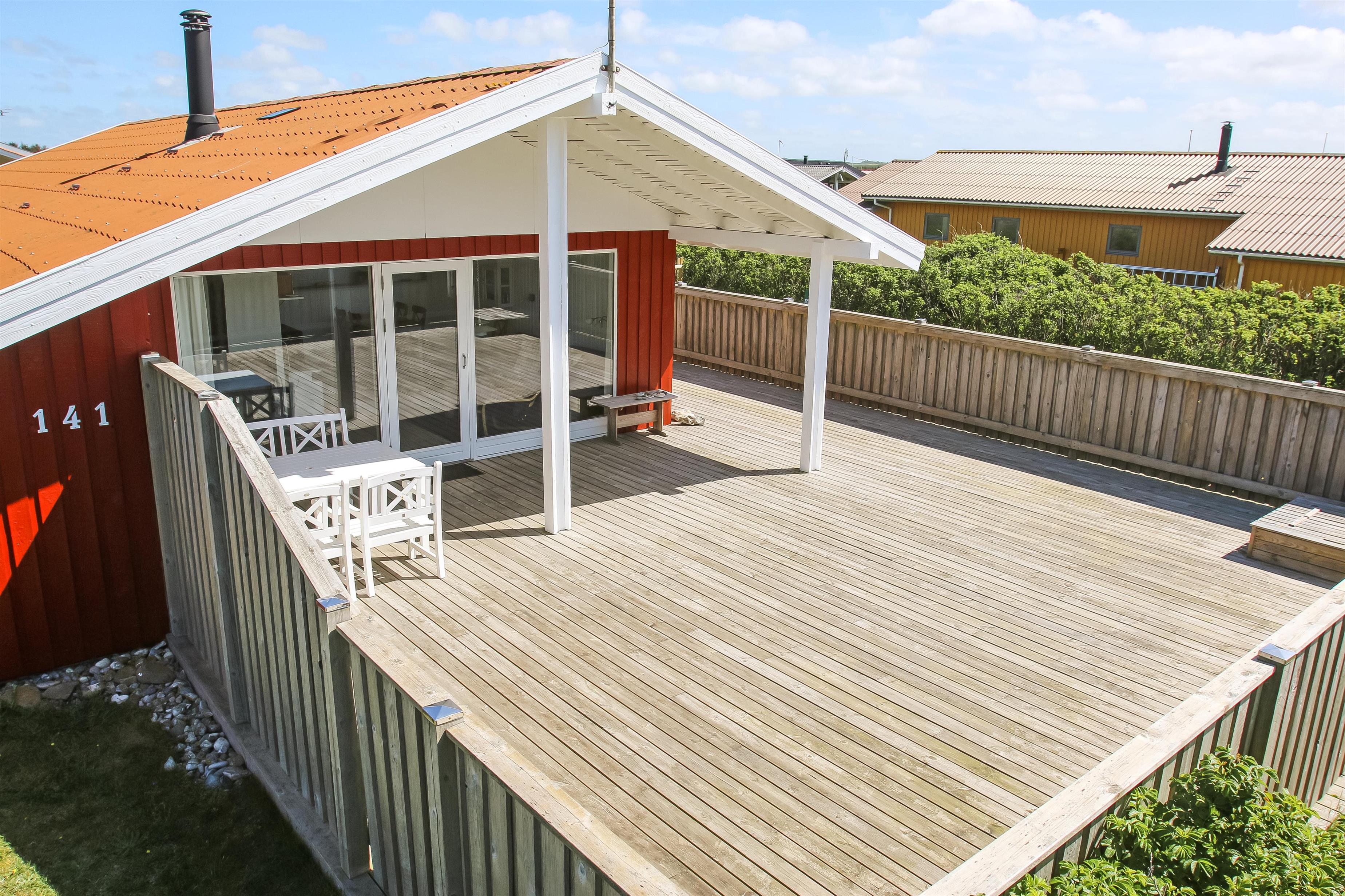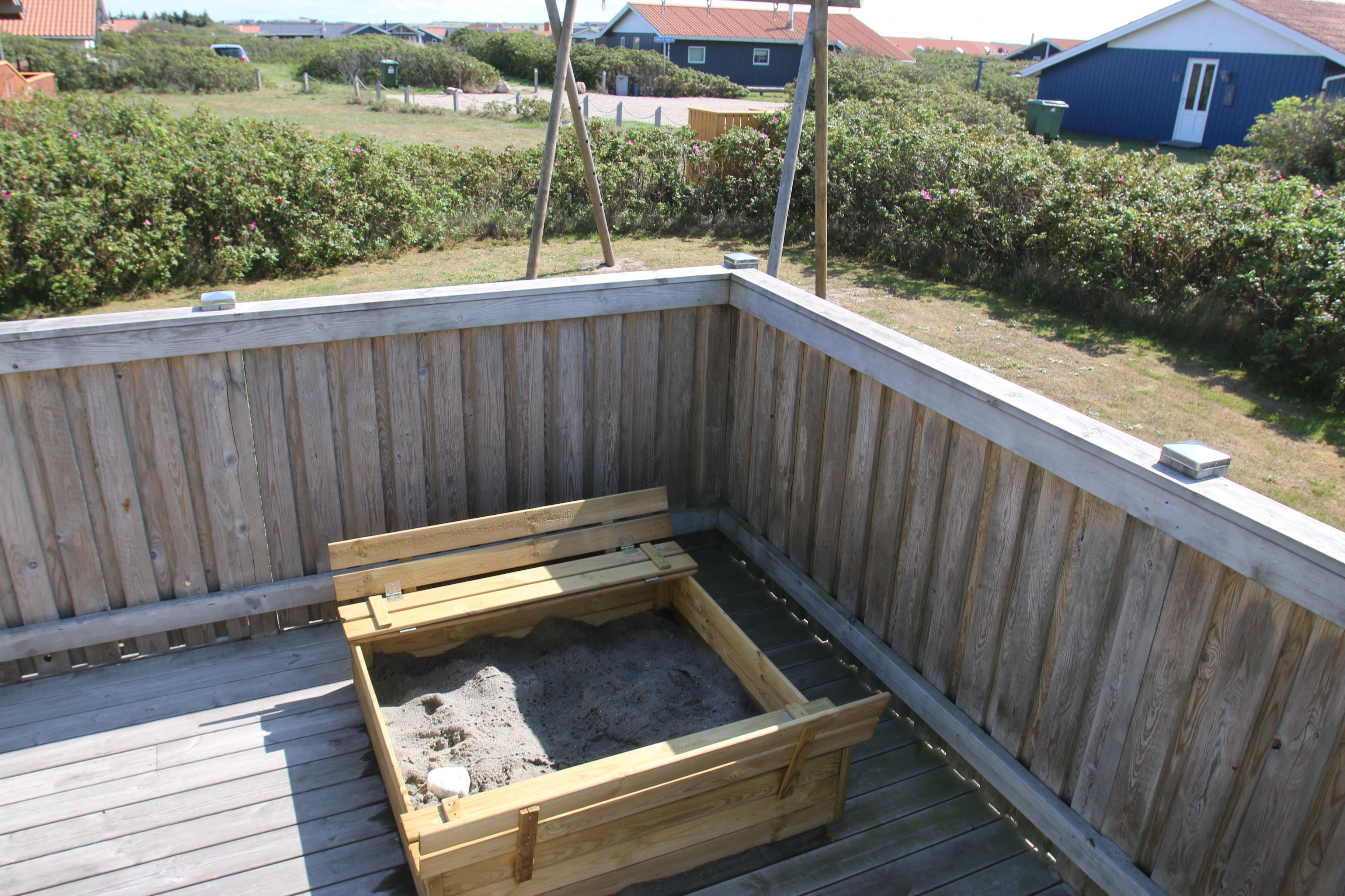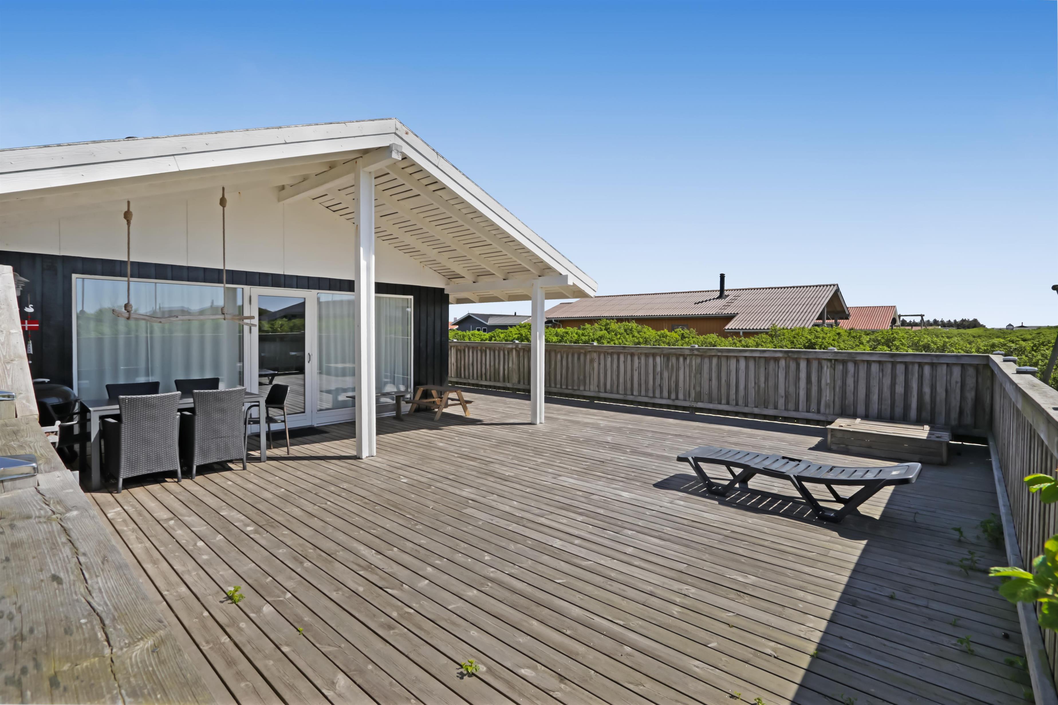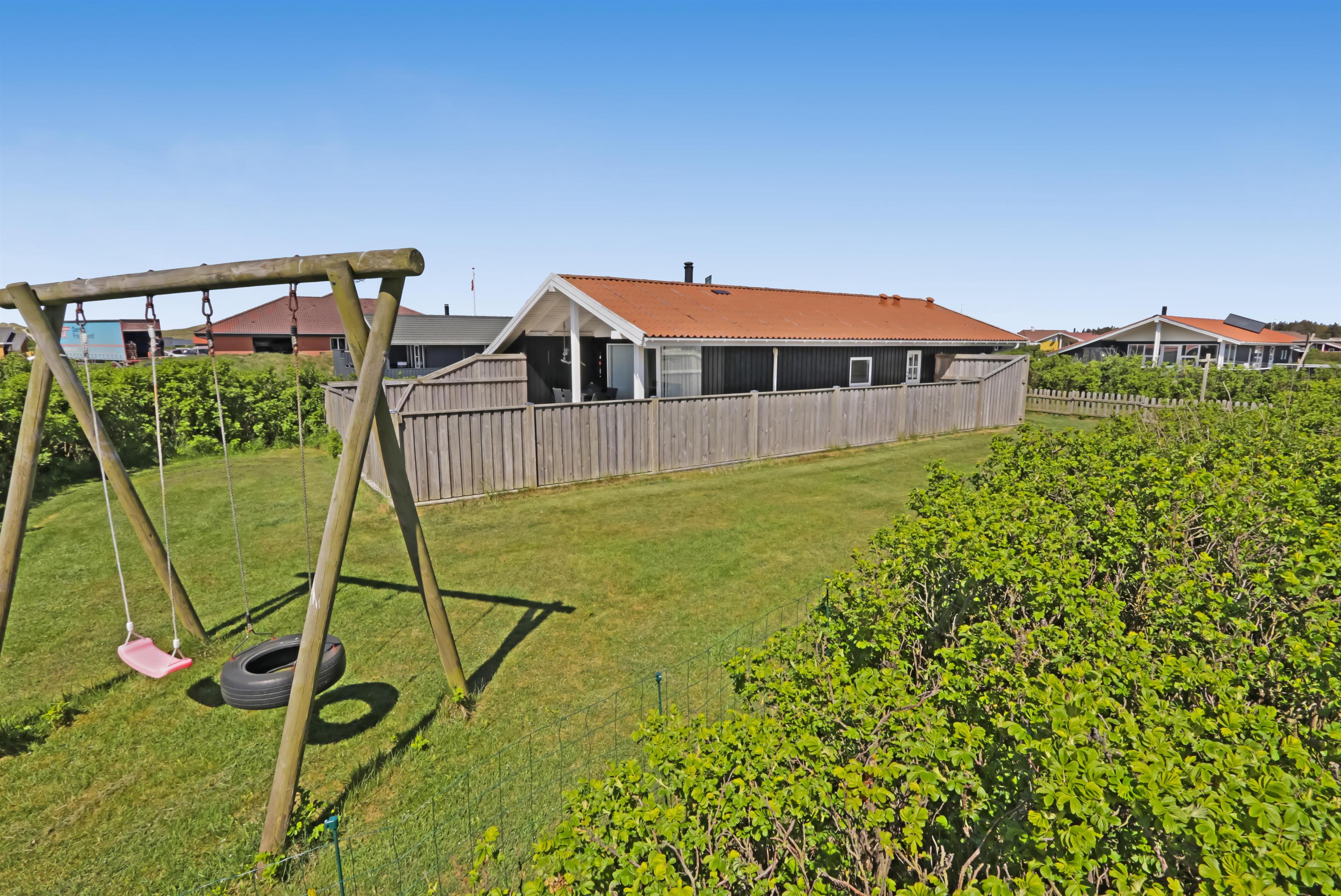 Udgang til flot, stor og delvis overdækket træterrasse med havemøbler, solvogne og grill. Velholdt, indhegnet grund med gynger og sandkasse samt mange muligheder for udendørs aktivitet. Et flot feriehus med god plads og en fantastisk velplejet grund. Medbringes børn og husdyr, er det optimalt, at de kan løbe rundt på den indhegnede gund. Tæt ved restaurant, indkøb samt Vesterhavet. Området er karakteriseret med ekseptionel natur, som udover det brusende Vesterhav også byder på barske klitter og smukke lyngarealer.