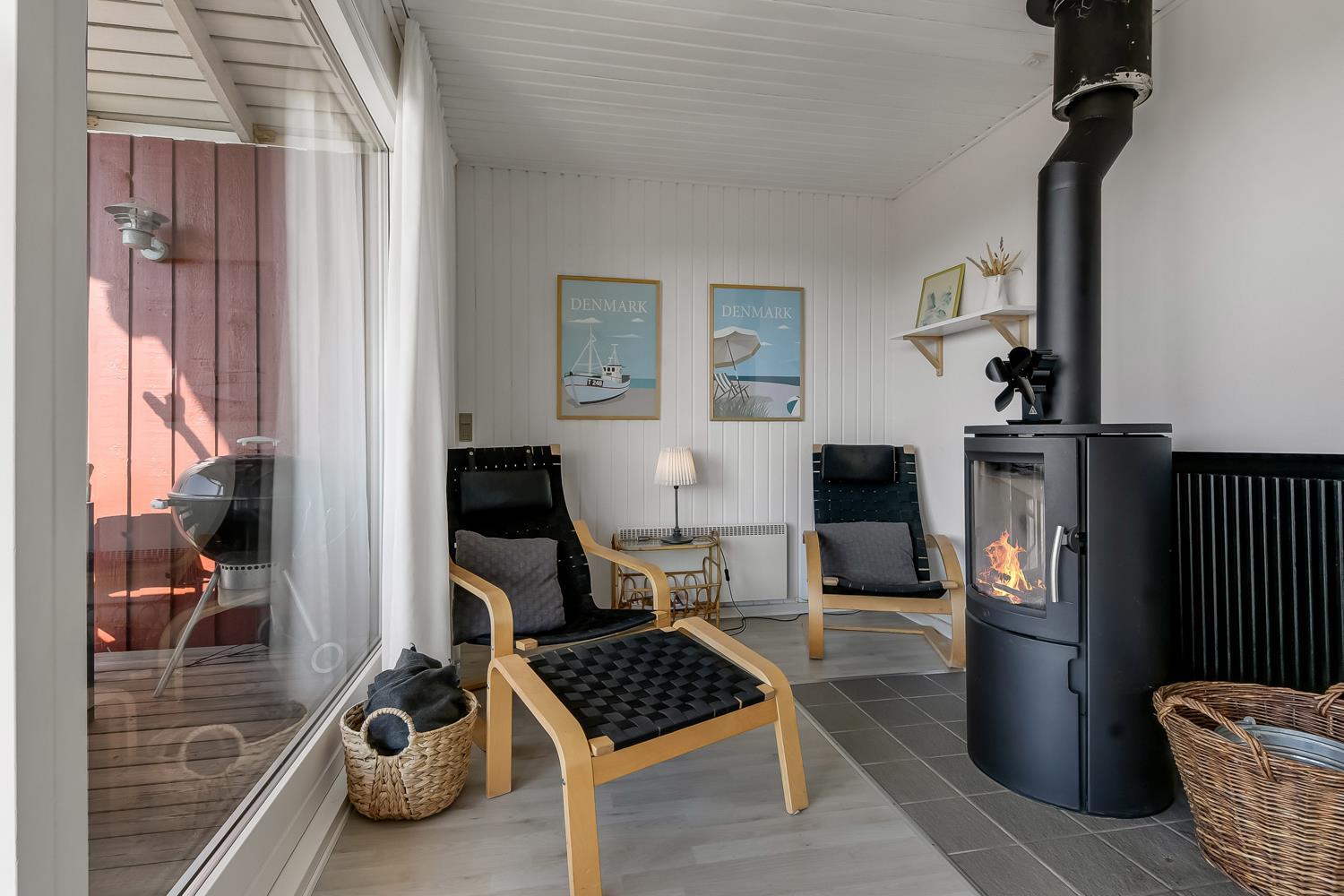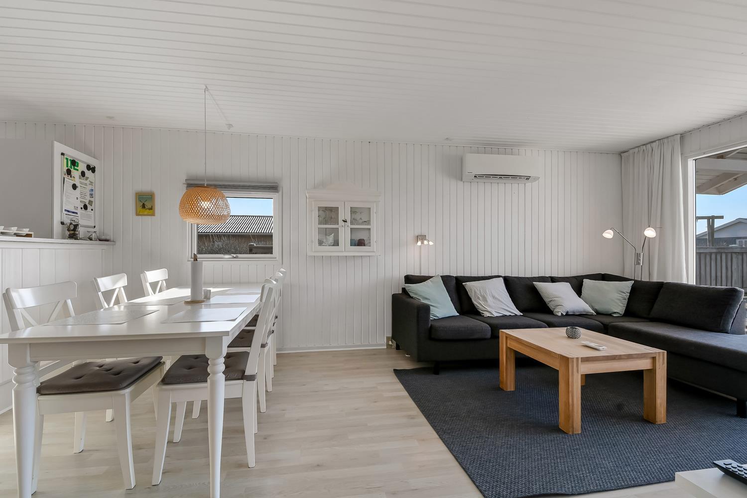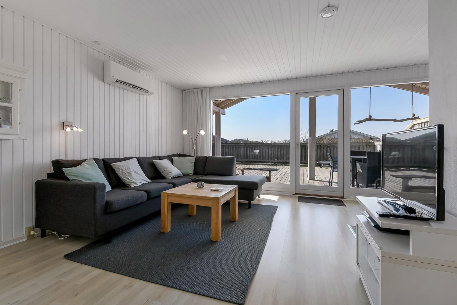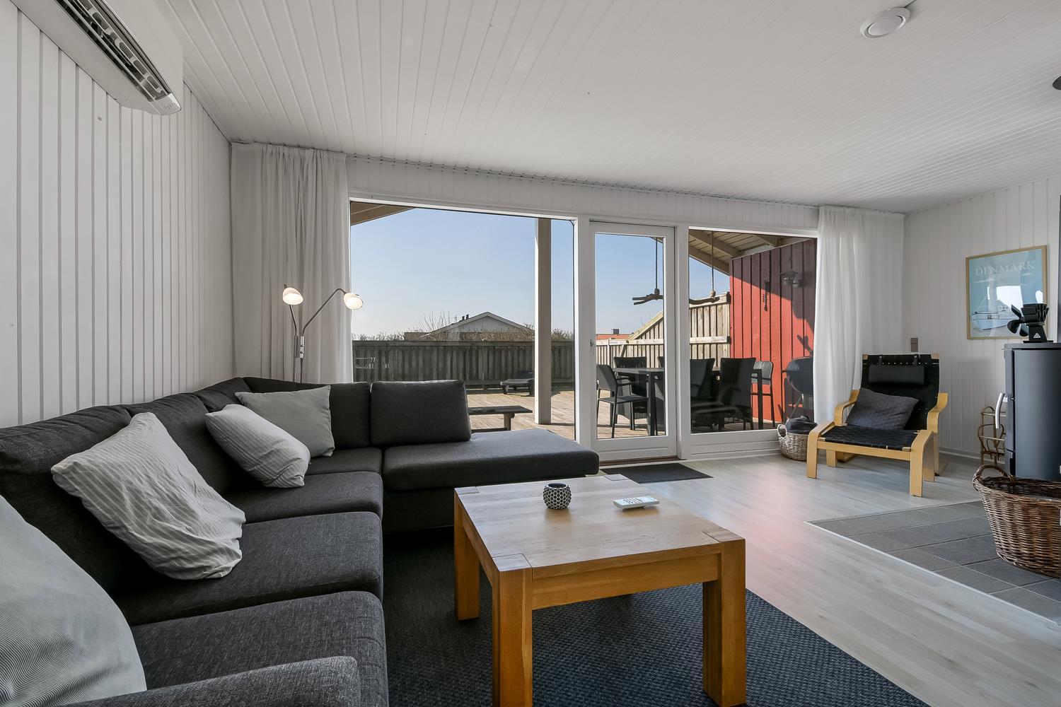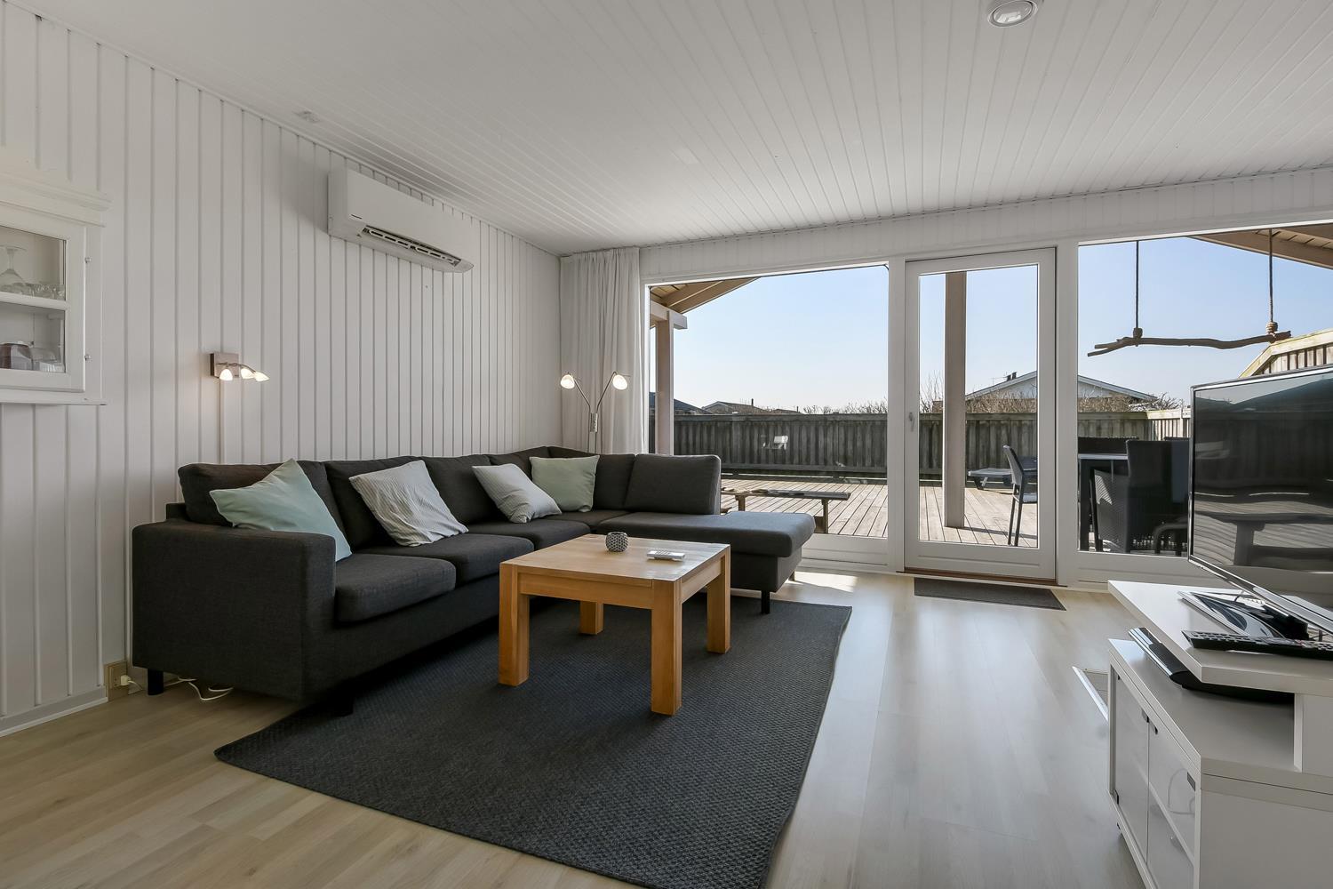 Udgang til flot, stor og delvis overdækket træterrasse med havemøbler, solvogne og grill. Velholdt, indhegnet grund med gynger og sandkasse samt mange muligheder for udendørs aktivitet. Et flot feriehus med god plads og en fantastisk velplejet grund. Medbringes børn og husdyr, er det optimalt, at de kan løbe rundt på den indhegnede gund. Tæt ved restaurant, indkøb samt Vesterhavet. Området er karakteriseret med ekseptionel natur, som udover det brusende Vesterhav også byder på barske klitter og smukke lyngarealer.