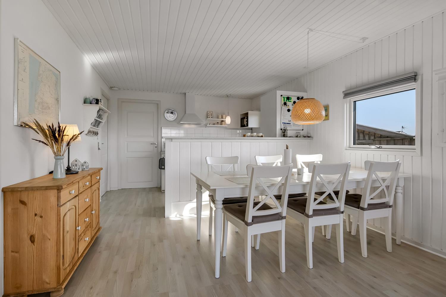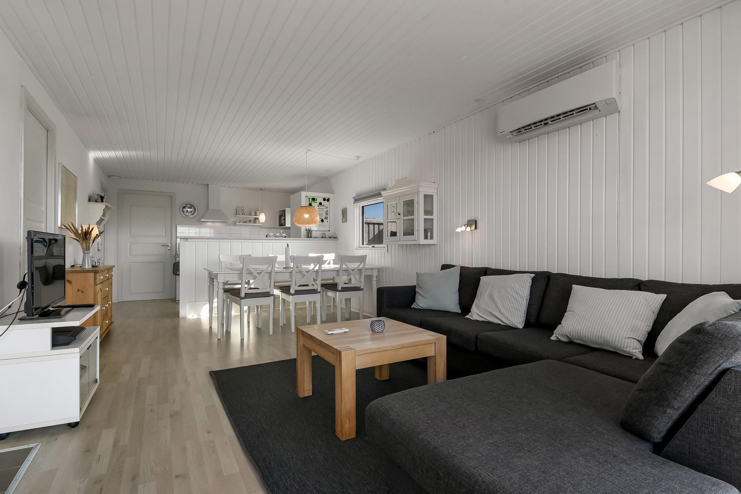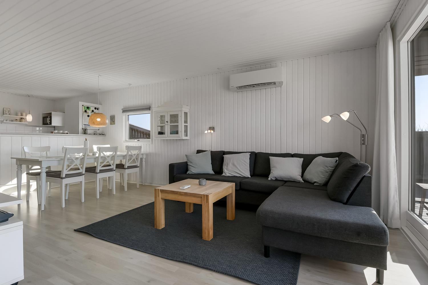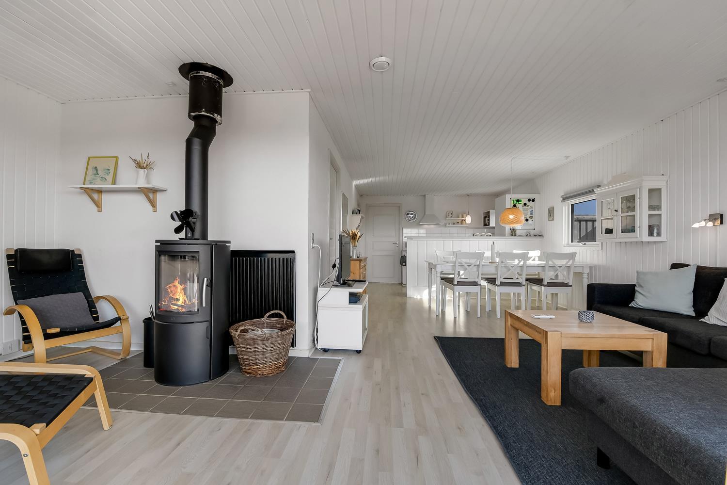 Udgang til flot, stor og delvis overdækket træterrasse med havemøbler, solvogne og grill. Velholdt, indhegnet grund med gynger og sandkasse samt mange muligheder for udendørs aktivitet. Et flot feriehus med god plads og en fantastisk velplejet grund. Medbringes børn og husdyr, er det optimalt, at de kan løbe rundt på den indhegnede gund. Tæt ved restaurant, indkøb samt Vesterhavet. Området er karakteriseret med ekseptionel natur, som udover det brusende Vesterhav også byder på barske klitter og smukke lyngarealer.