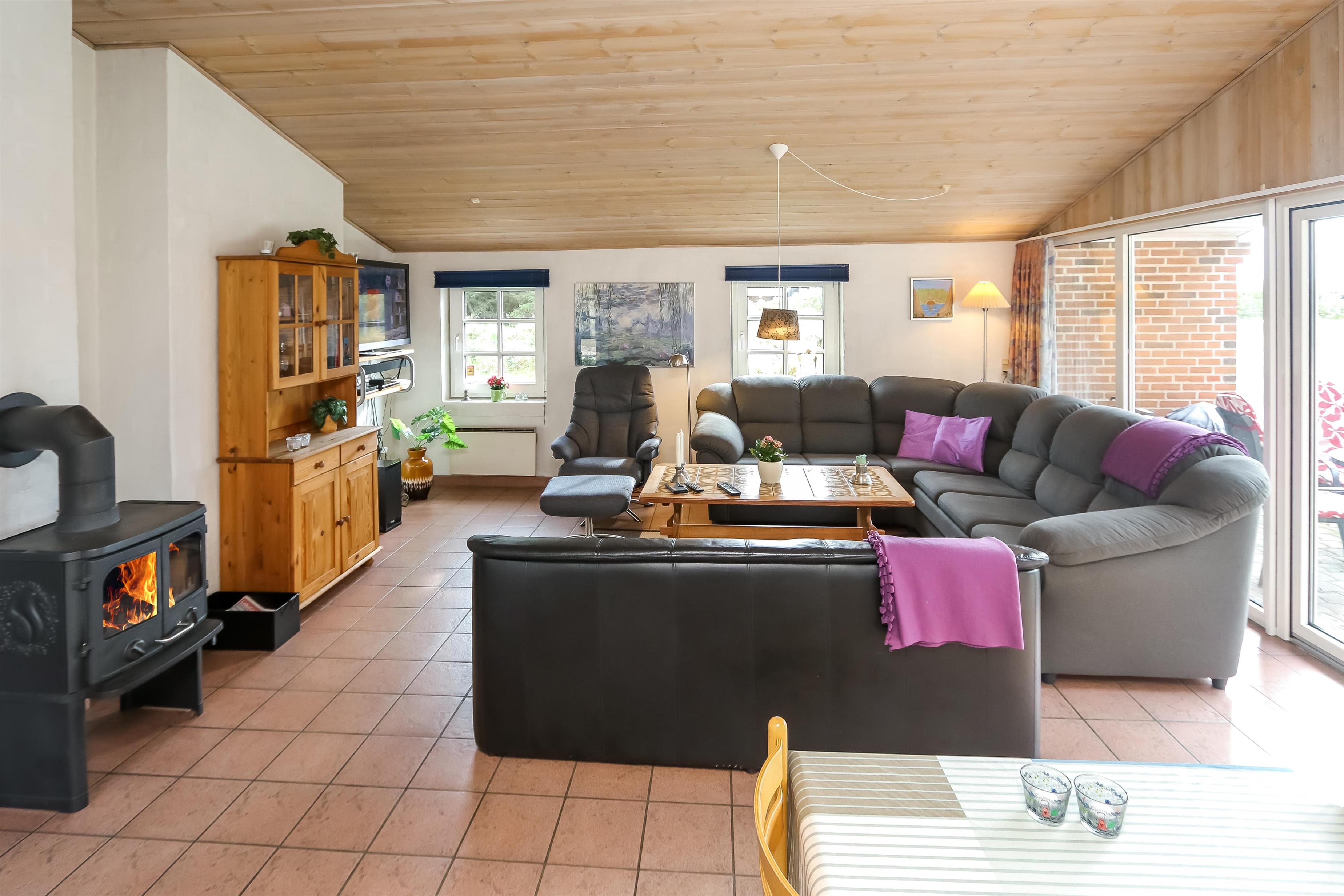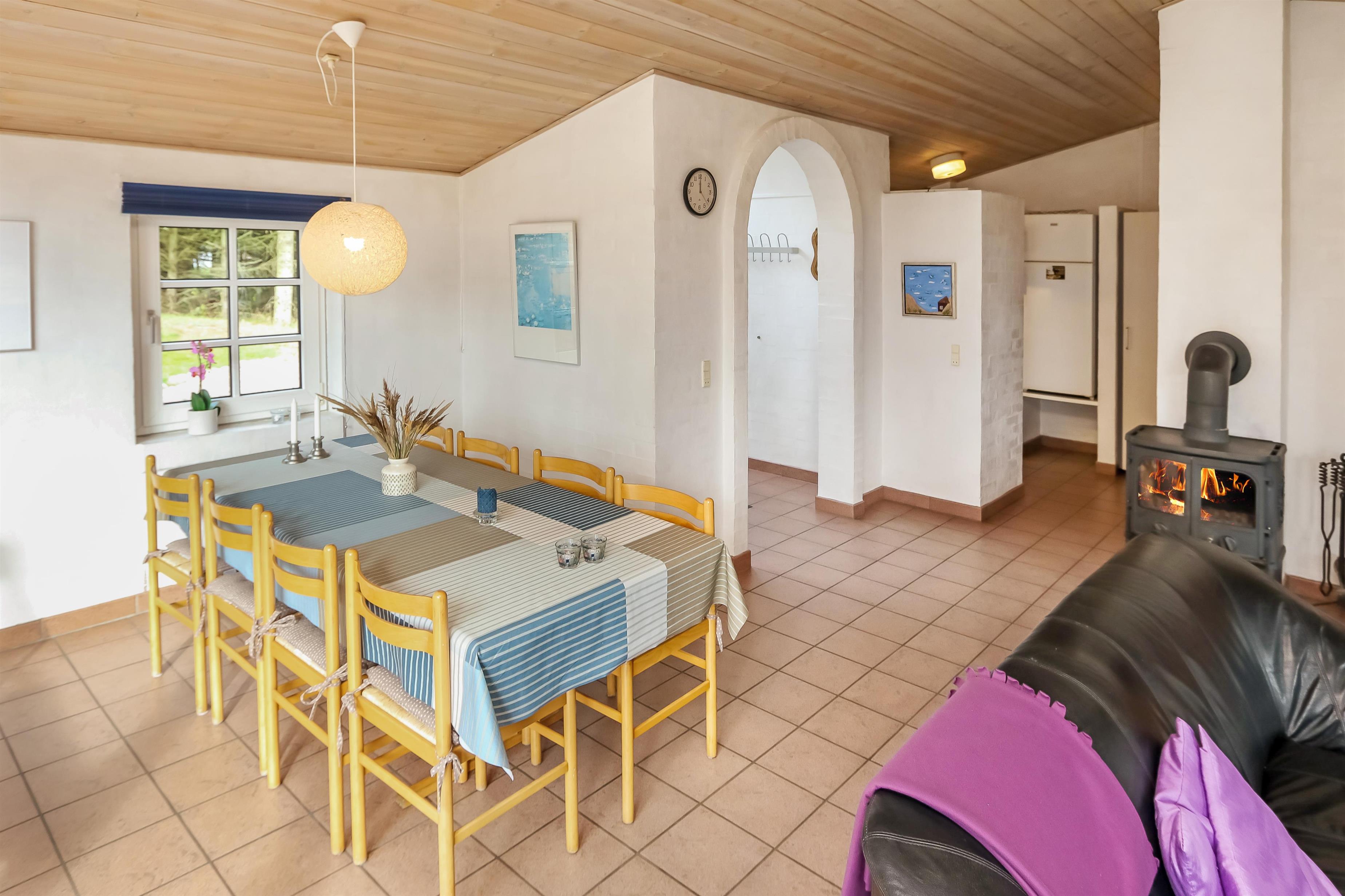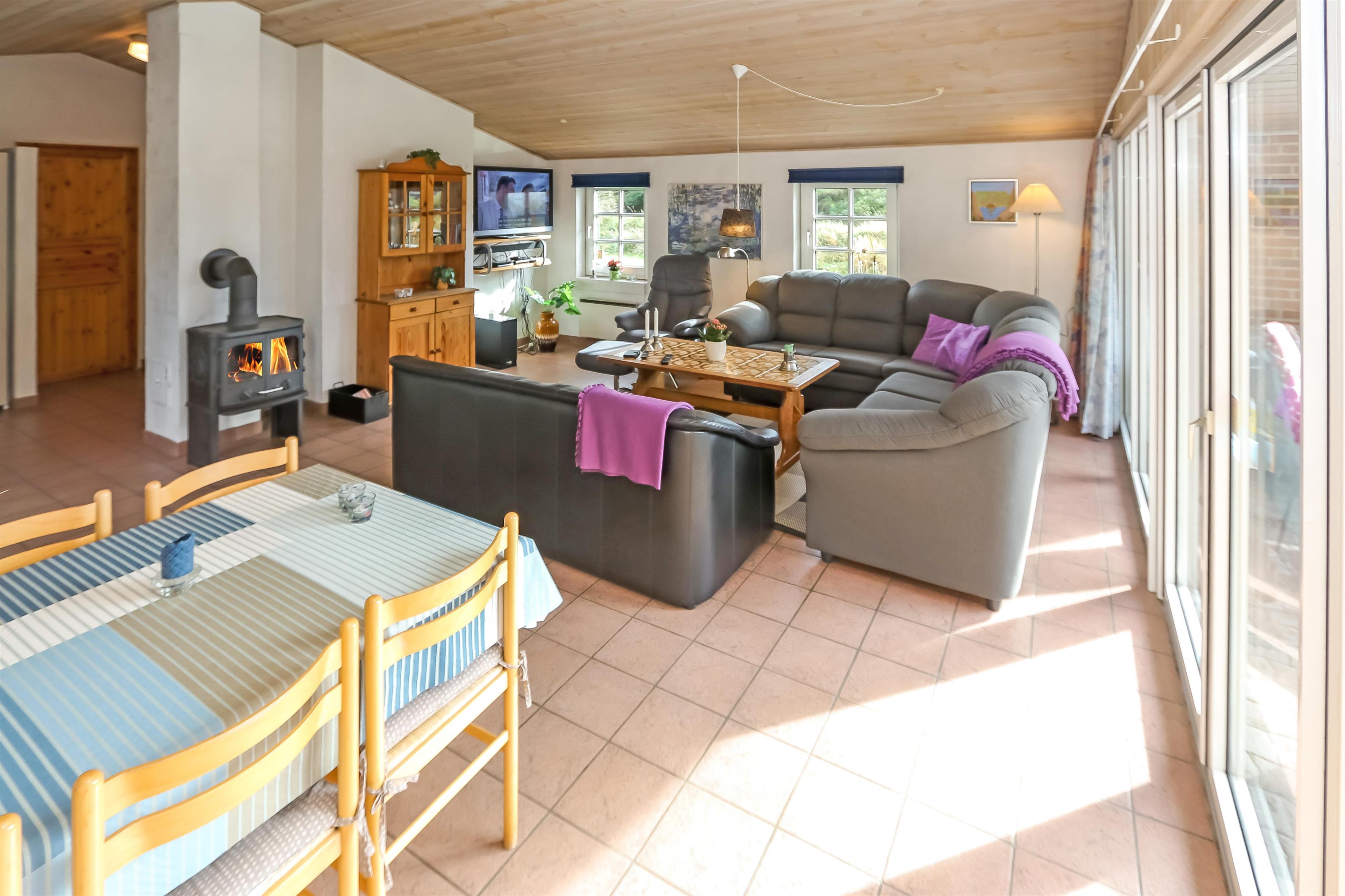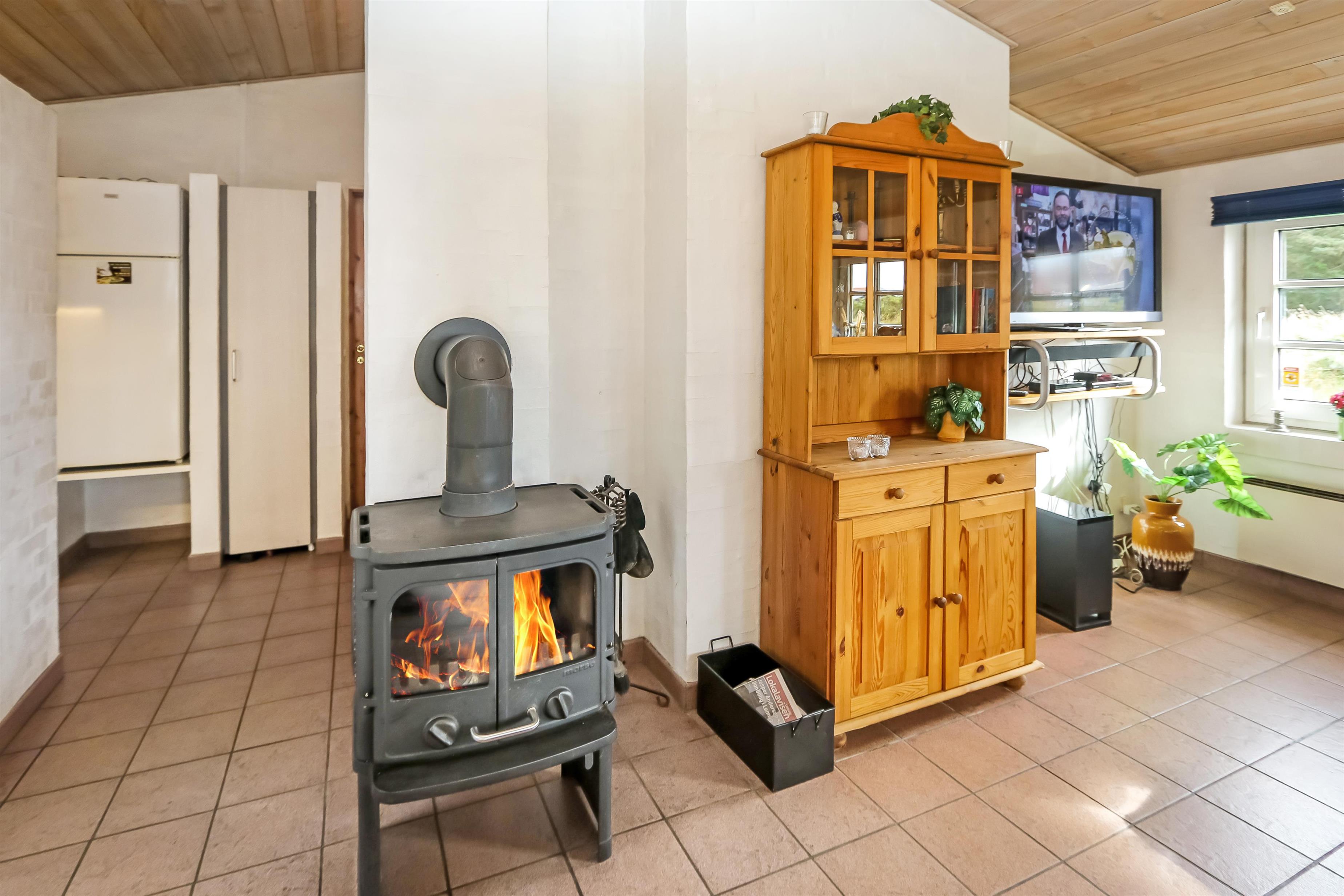 Når I træder ind i huset, mødes I af en rummelig og praktisk entre med god plads til overtøj og sko. Herfra går turen videre ind i det indbydende opholdsrum, hvor det veludstyrede køkken ligger i åben forbindelse med stuen. Køkkenet rummer alt, hvad I behøver til feriens madlavning, blandt andet opvaskemaskine, varmluftovn, mikrobølgeovn og fryser. Den lyse og rummelige stue med brændeovn, surroundanlæg, 55" TV med digital parabol og soundbar skaber en varm og hyggelig atmosfære, som indbyder til afslapning efter en dag ved havet. Husets indvendige stil er præget af vandskurede vægge, trælofter med synlige bjælker og dejlige opvarmede klinkegulve.
