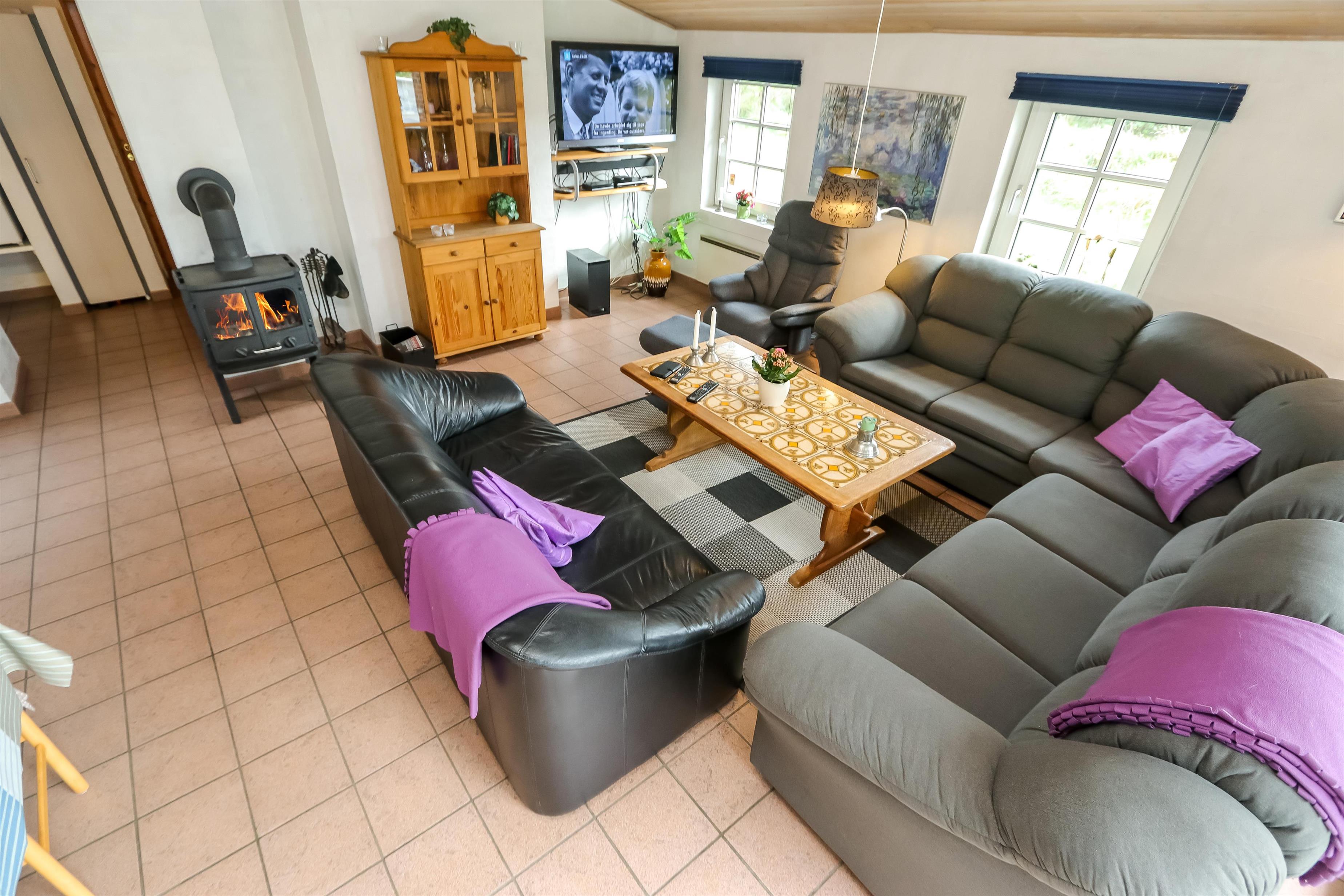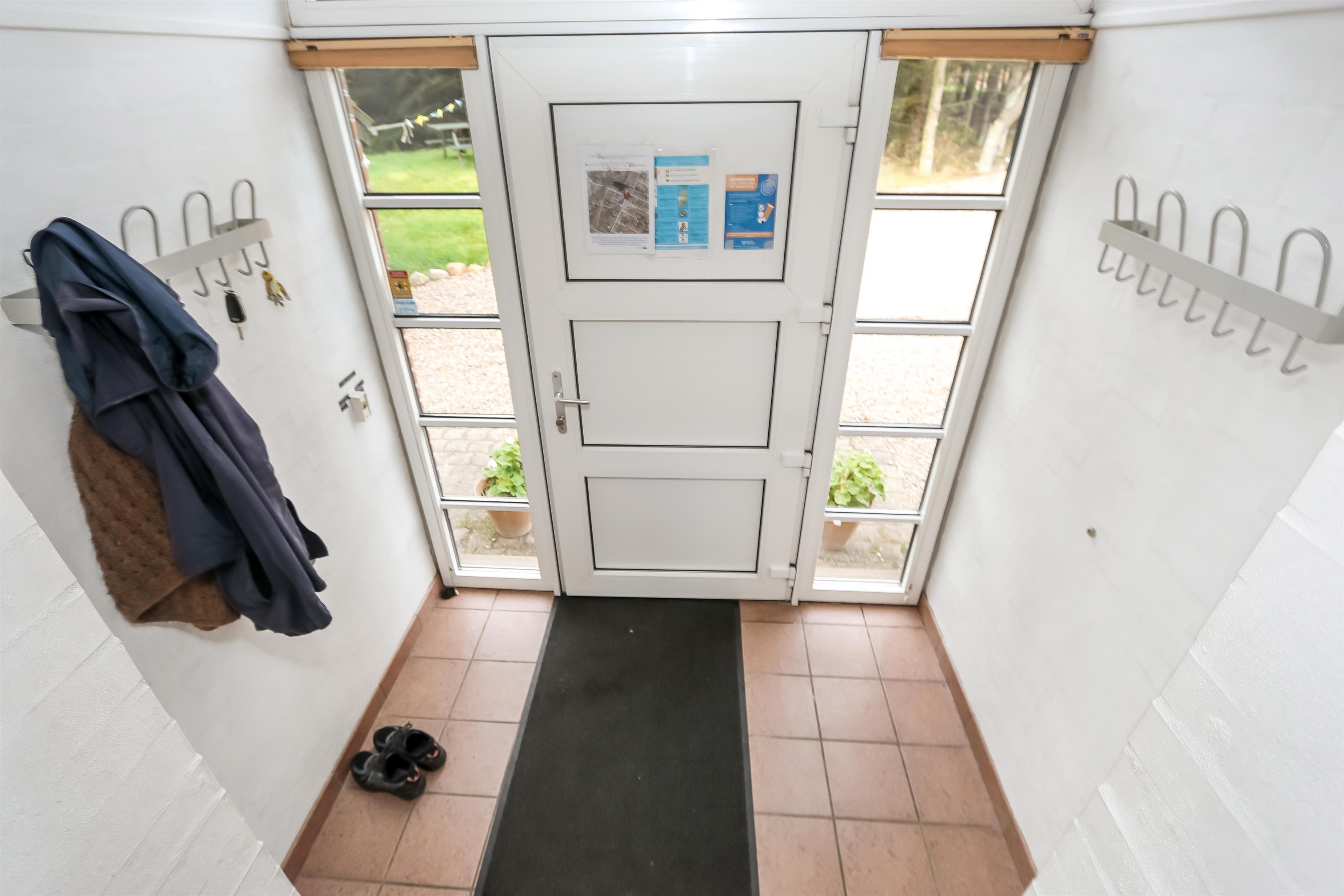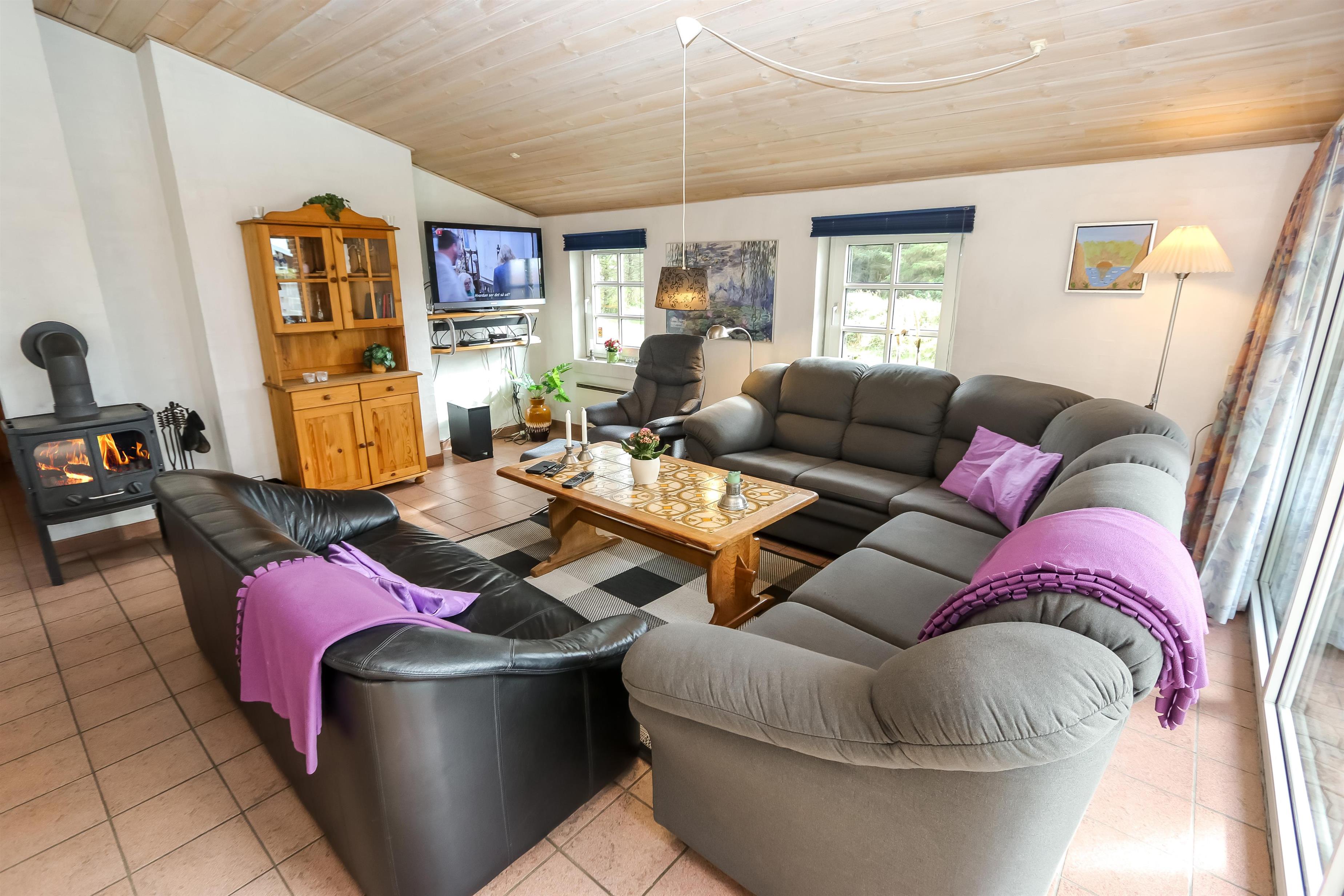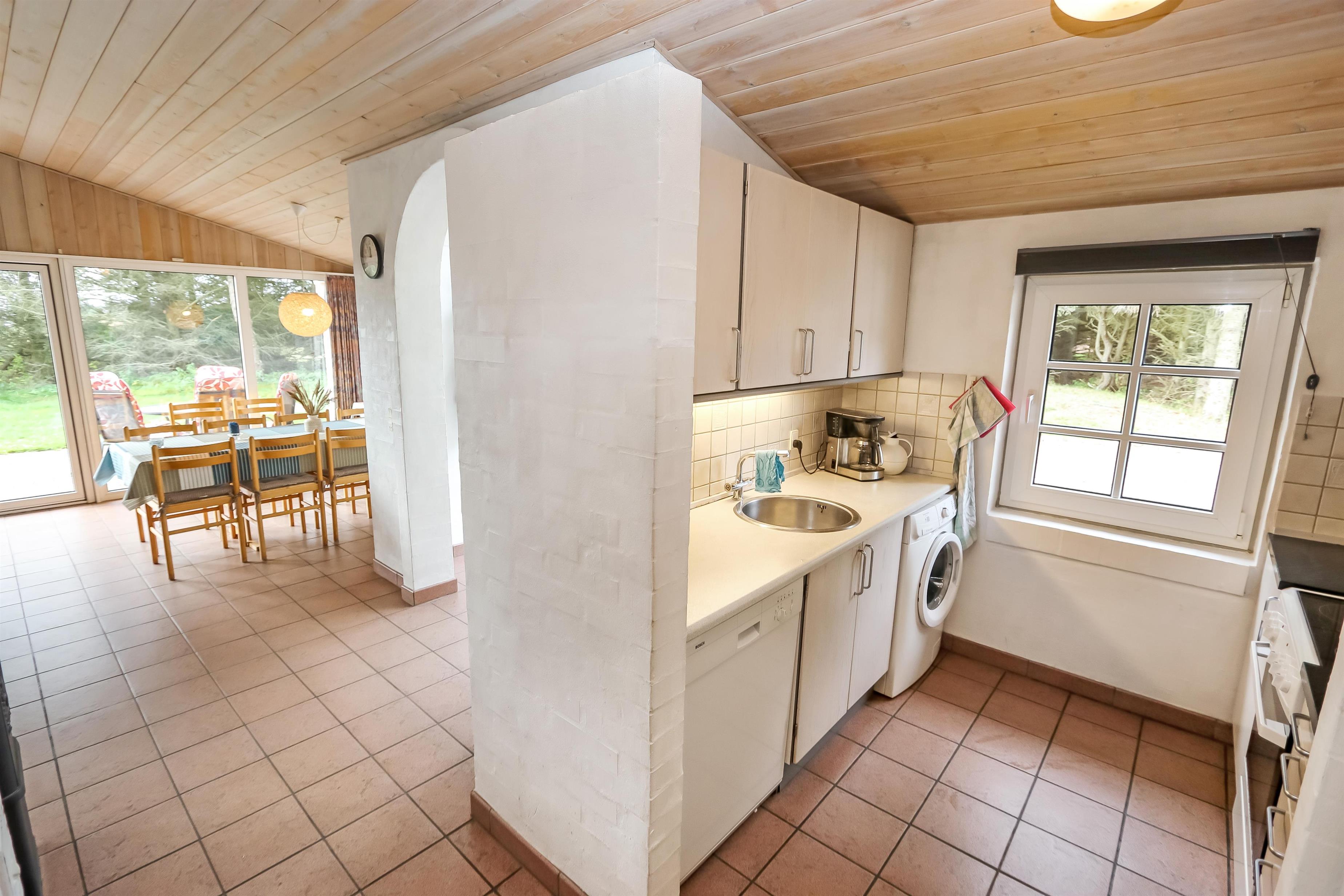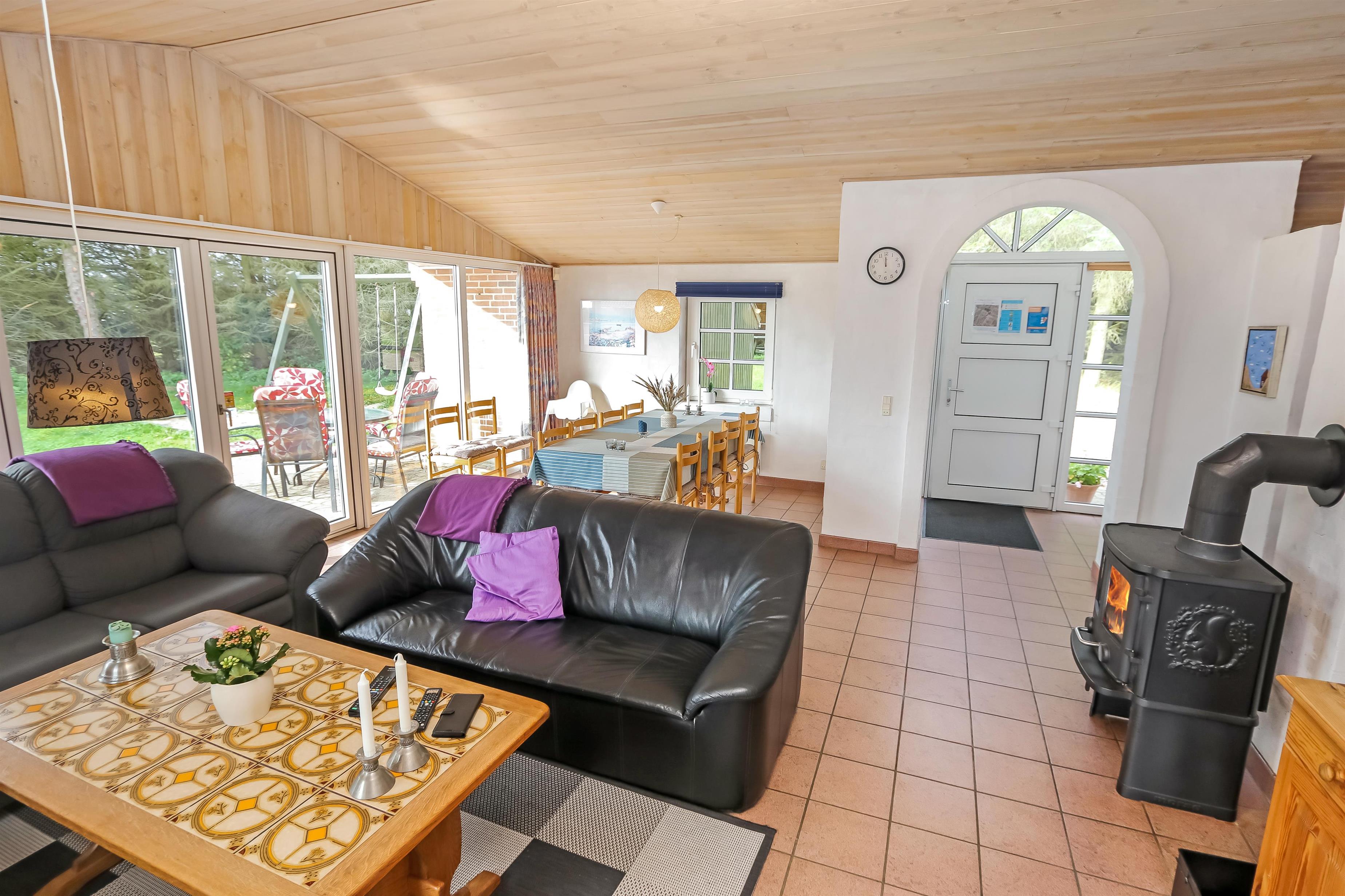 Når I træder ind i huset, mødes I af en rummelig og praktisk entre med god plads til overtøj og sko. Herfra går turen videre ind i det indbydende opholdsrum, hvor det veludstyrede køkken ligger i åben forbindelse med stuen. Køkkenet rummer alt, hvad I behøver til feriens madlavning, blandt andet opvaskemaskine, varmluftovn, mikrobølgeovn og fryser. Den lyse og rummelige stue med brændeovn, surroundanlæg, 55" TV med digital parabol og soundbar skaber en varm og hyggelig atmosfære, som indbyder til afslapning efter en dag ved havet. Husets indvendige stil er præget af vandskurede vægge, trælofter med synlige bjælker og dejlige opvarmede klinkegulve.