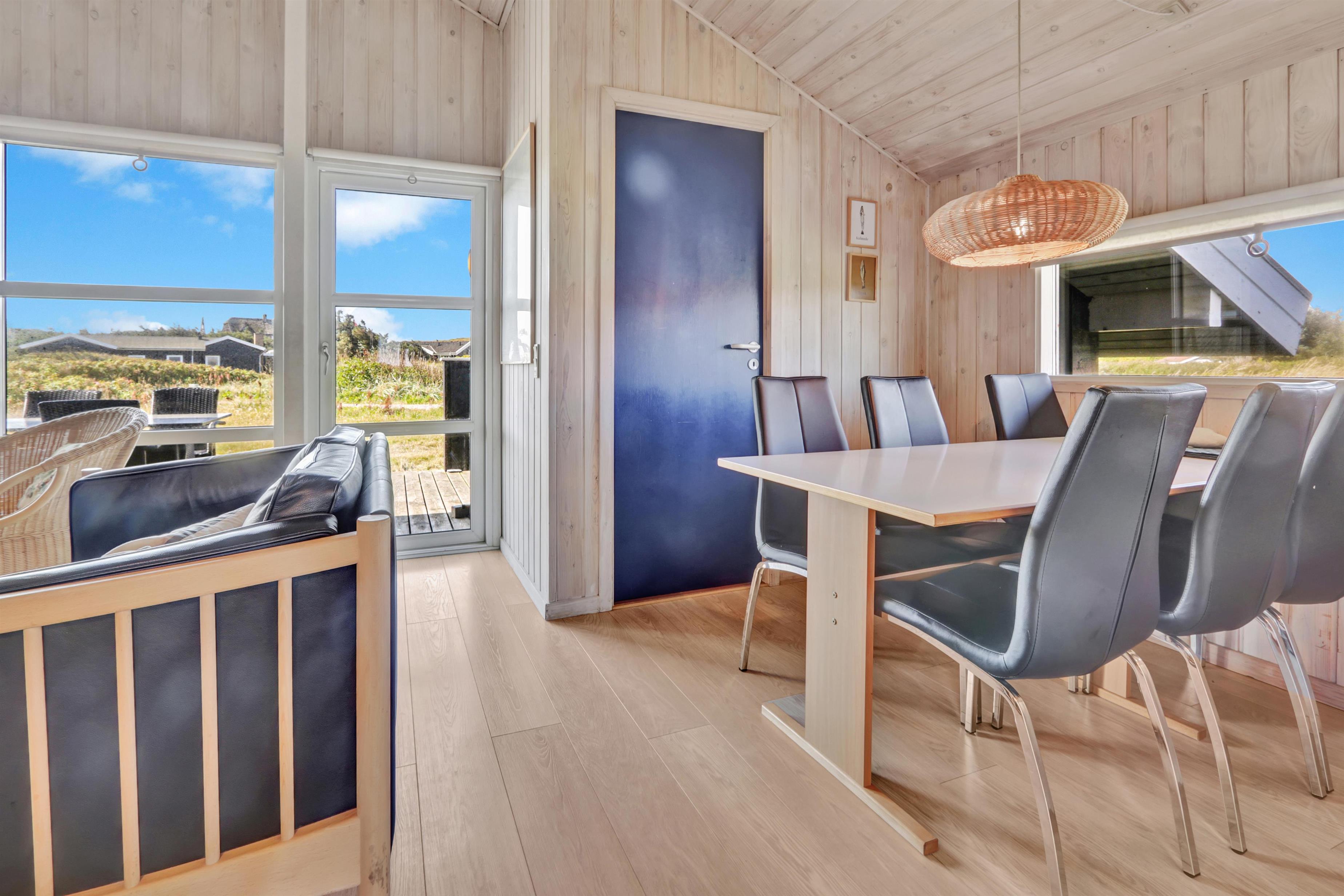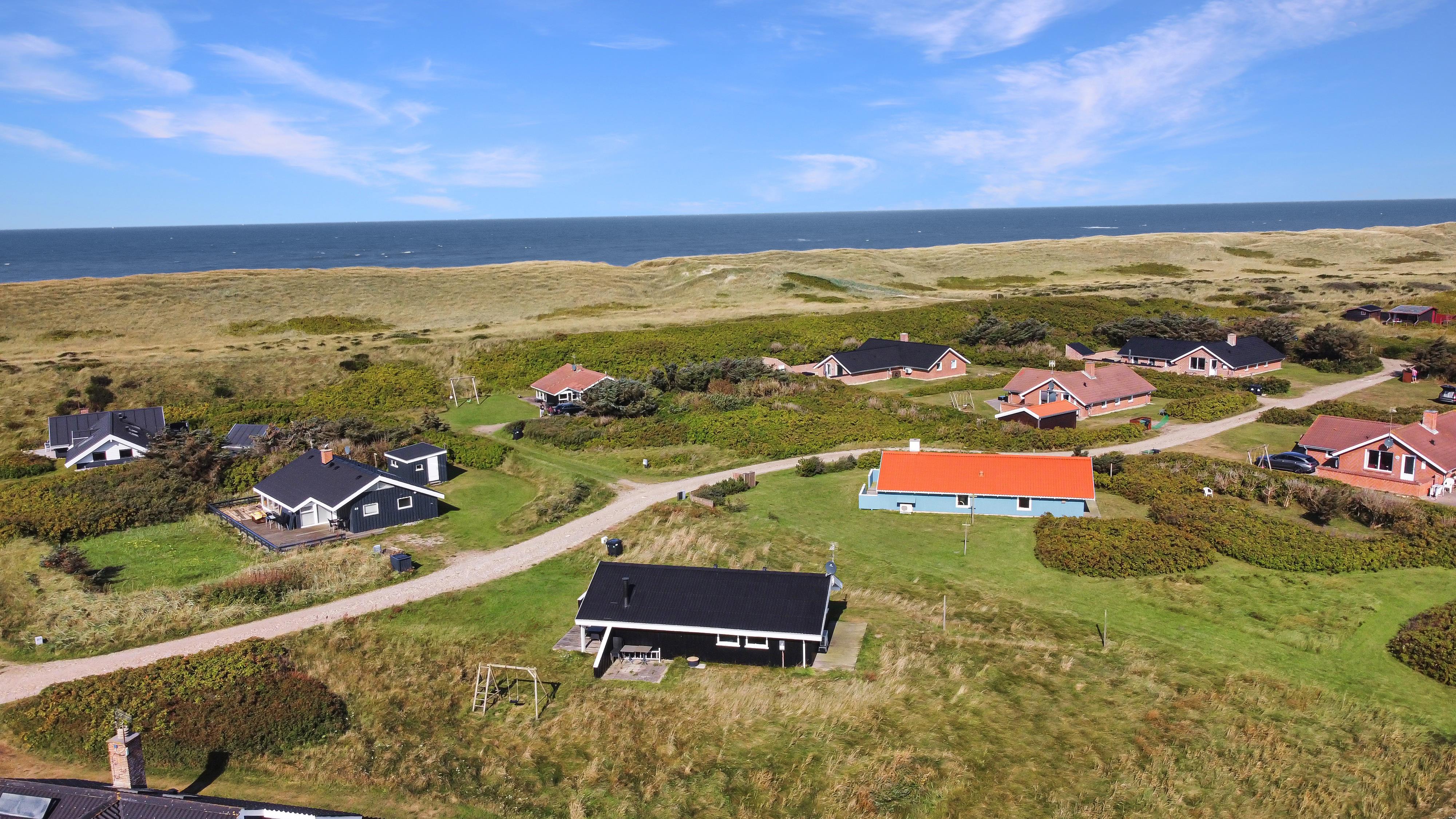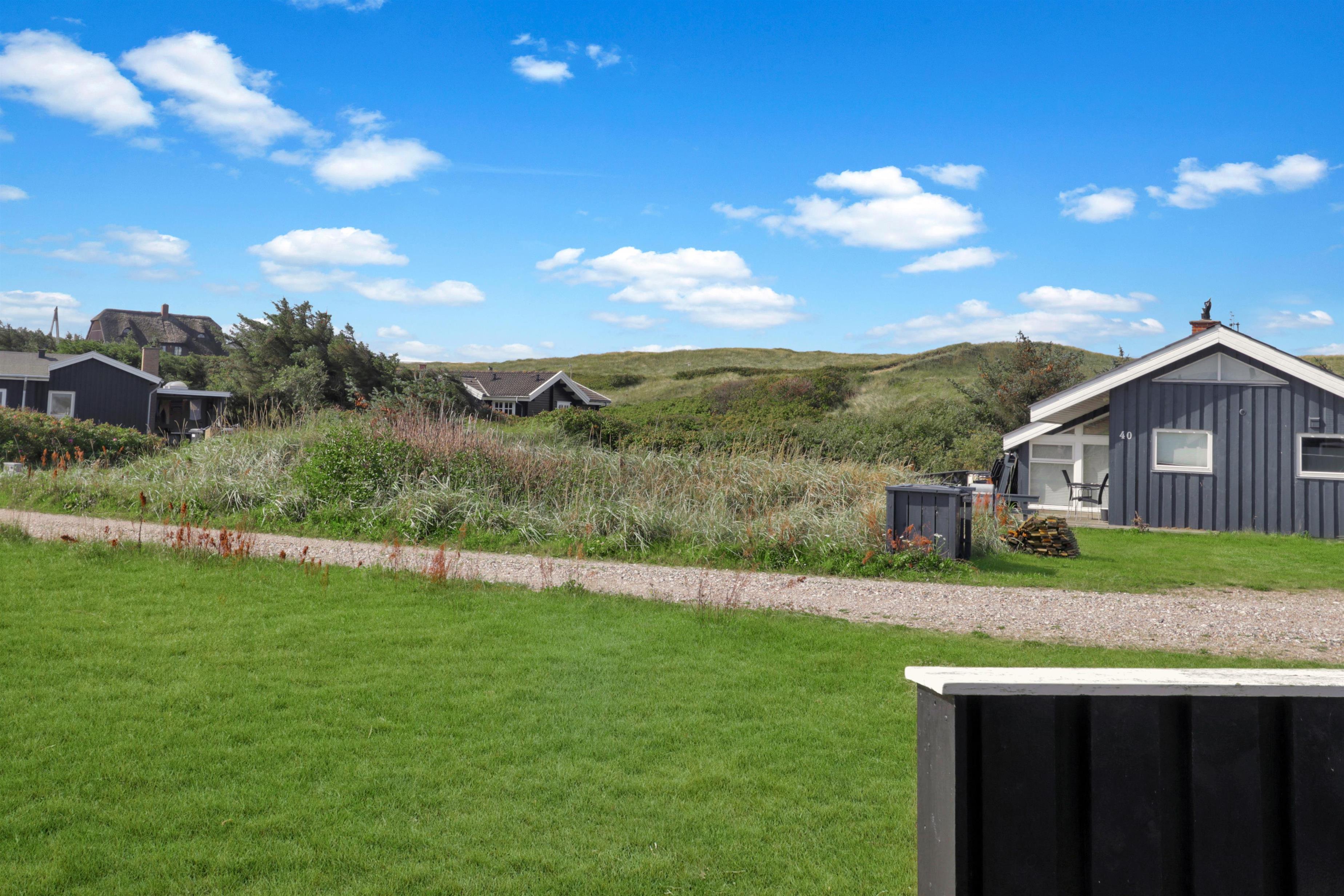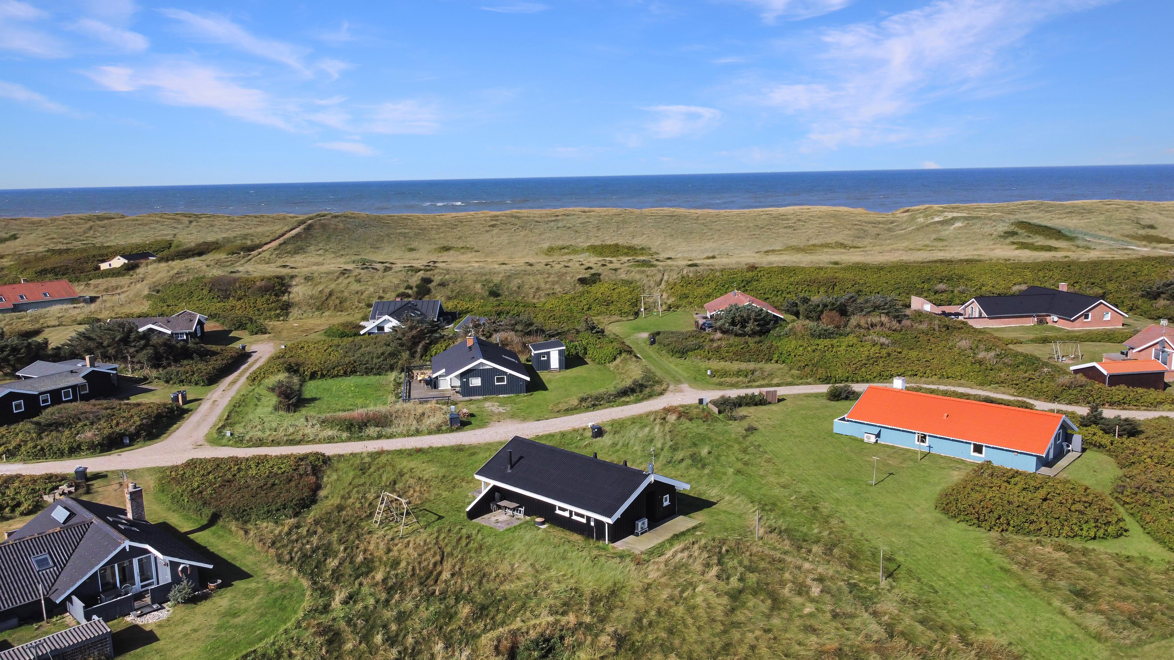 Sommerhuset er beliggende på en meget stille og rolig, blind vej, hvor det brusende Vesterhav kan høres fra de tre forskellige terrasser, som er placeret, så man får sol stort set hele dagen og aftenen med. Der er gode muligheder for læ, ligeledes på flere sider af huset. Der er komfortable havemøbler, samt to solvogne, grill og gyngestativ til børnene. Ligeledes er man ikke langt til cykelstien langs Strandvejen hvorfra man kan udnytte områdets mange cykelmuligheder. Benyt endelig også stranden til badning, drageflyvning, byg et sandslot eller gå en lang tur og få ro i sjælen.