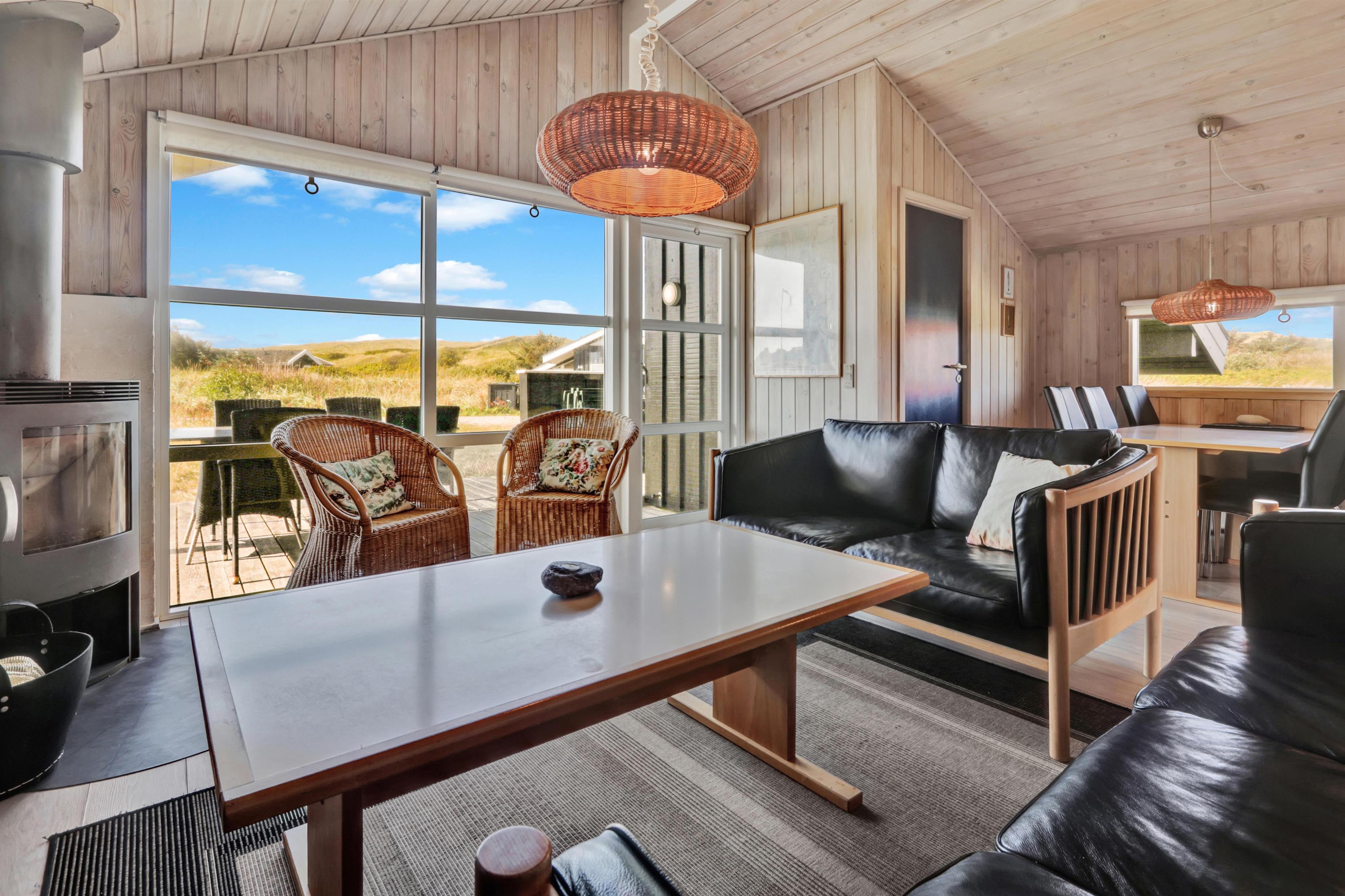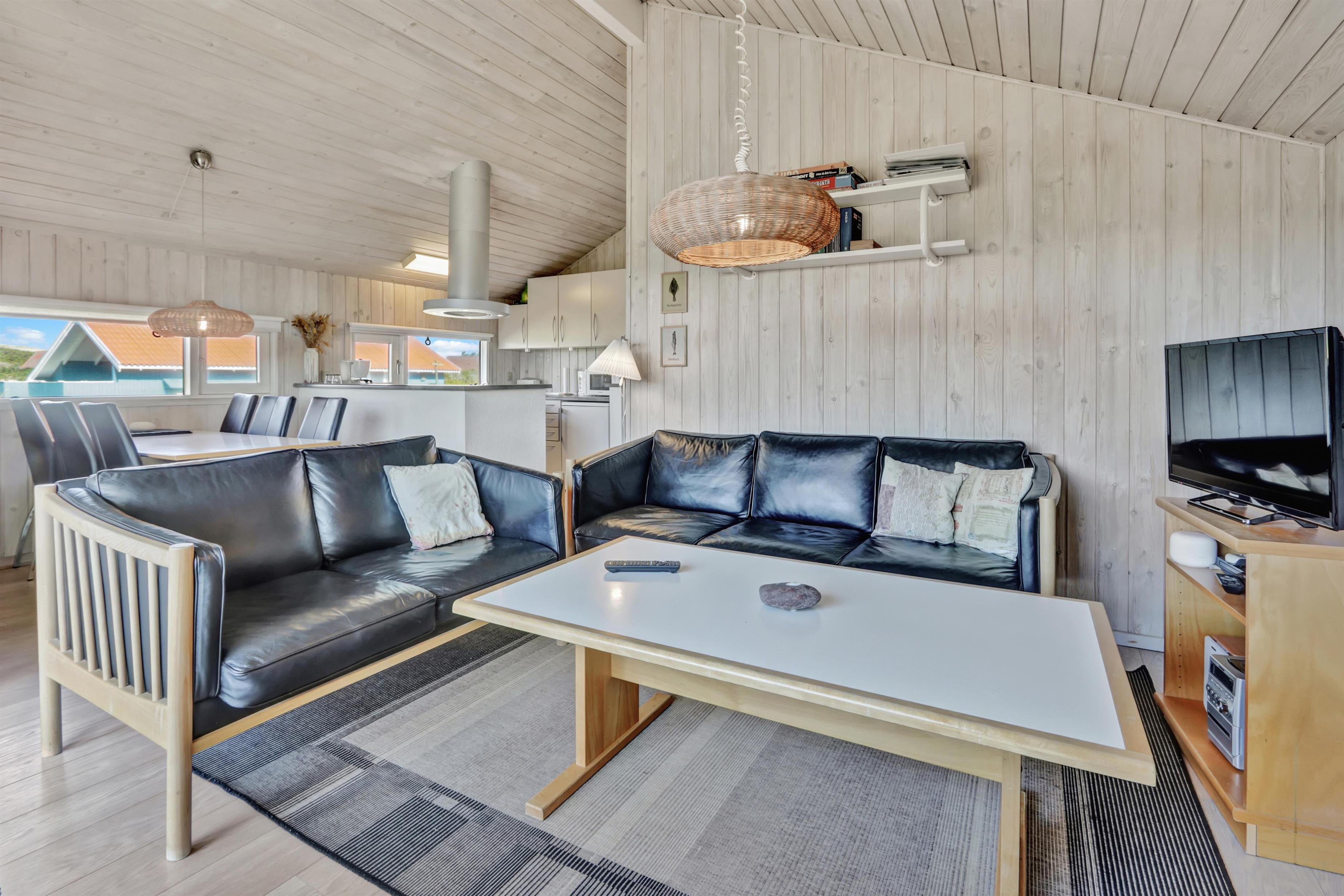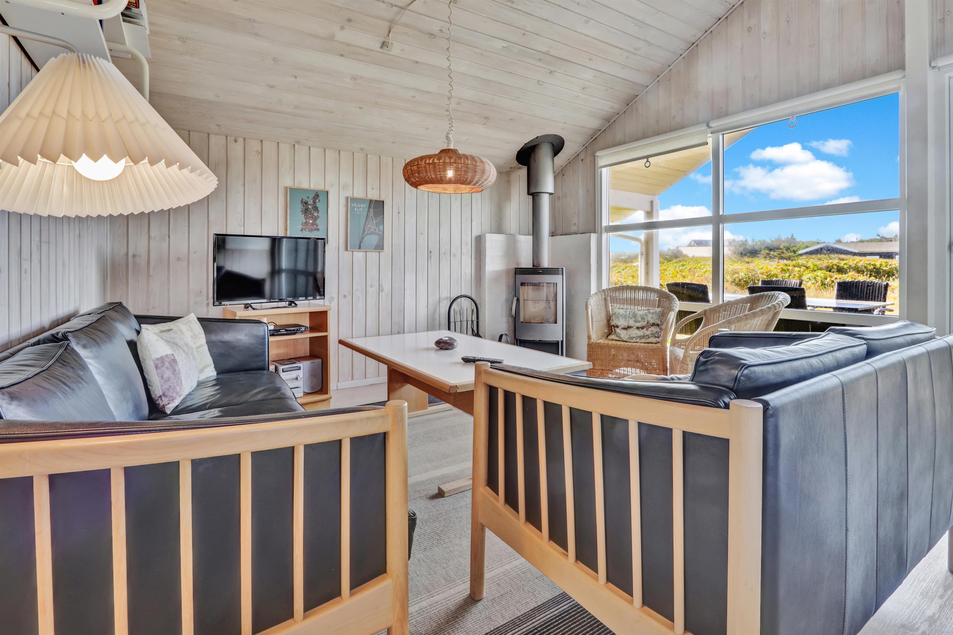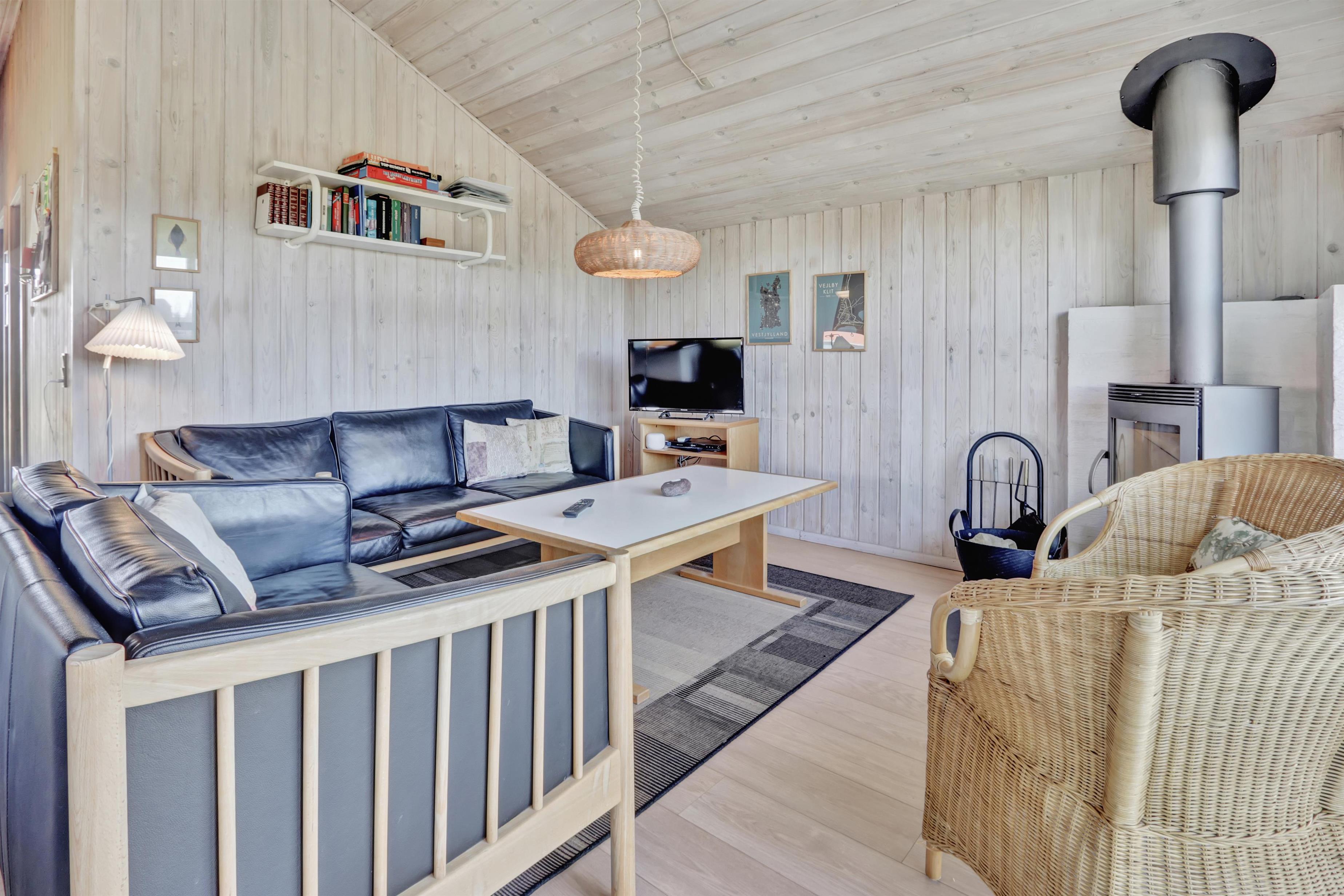 Stue og køkken er med trægulv og er klassisk sommerhusindrettet med loft til kip. Fra stuen er der et større vinduesparti mod vest, som både lyser stuen op, men også "tager" naturen og vejret ind i stuen. Stuen er indrettet med lækre lædermøbler og brændeovn. I stuen findes fladskærm med flere tyske kanaler. Herudover er der gratis internet (fibernet), DVD-afspiller, radio og CD-afspiller i huset.
