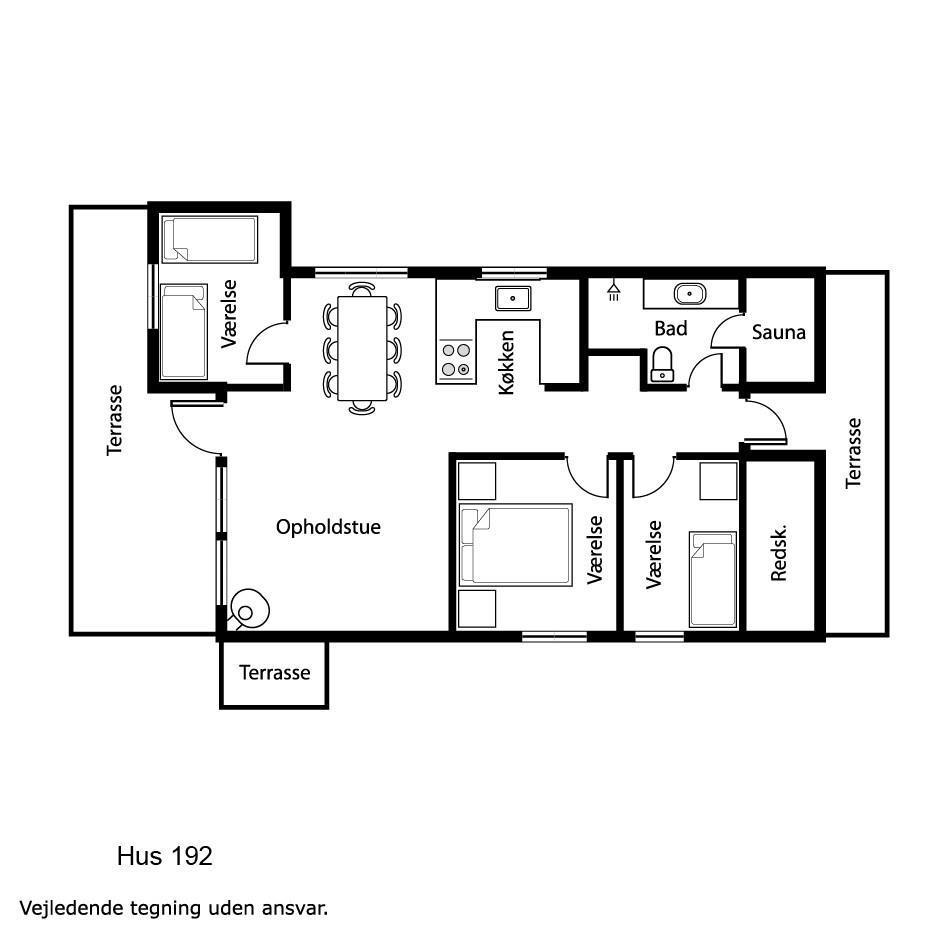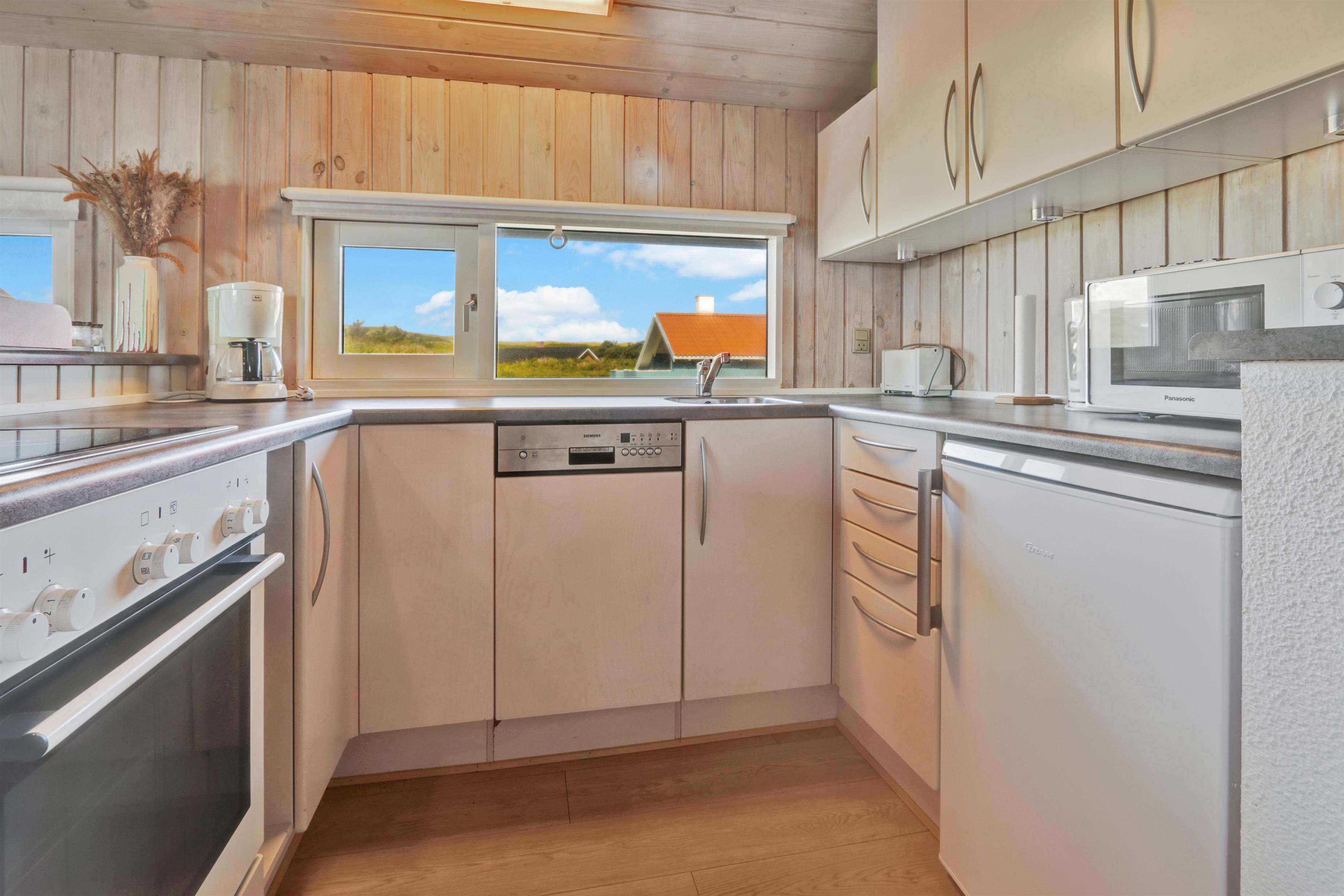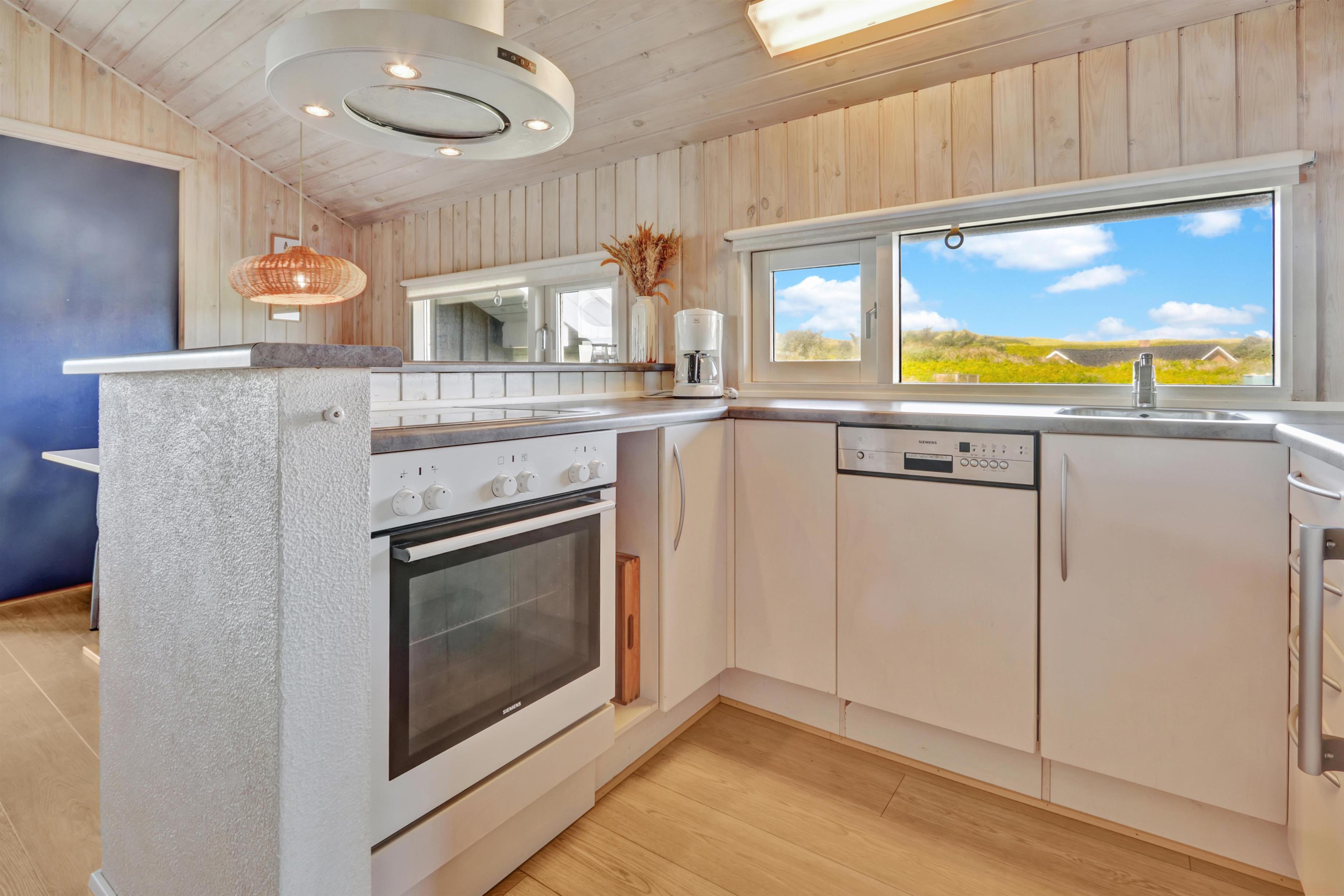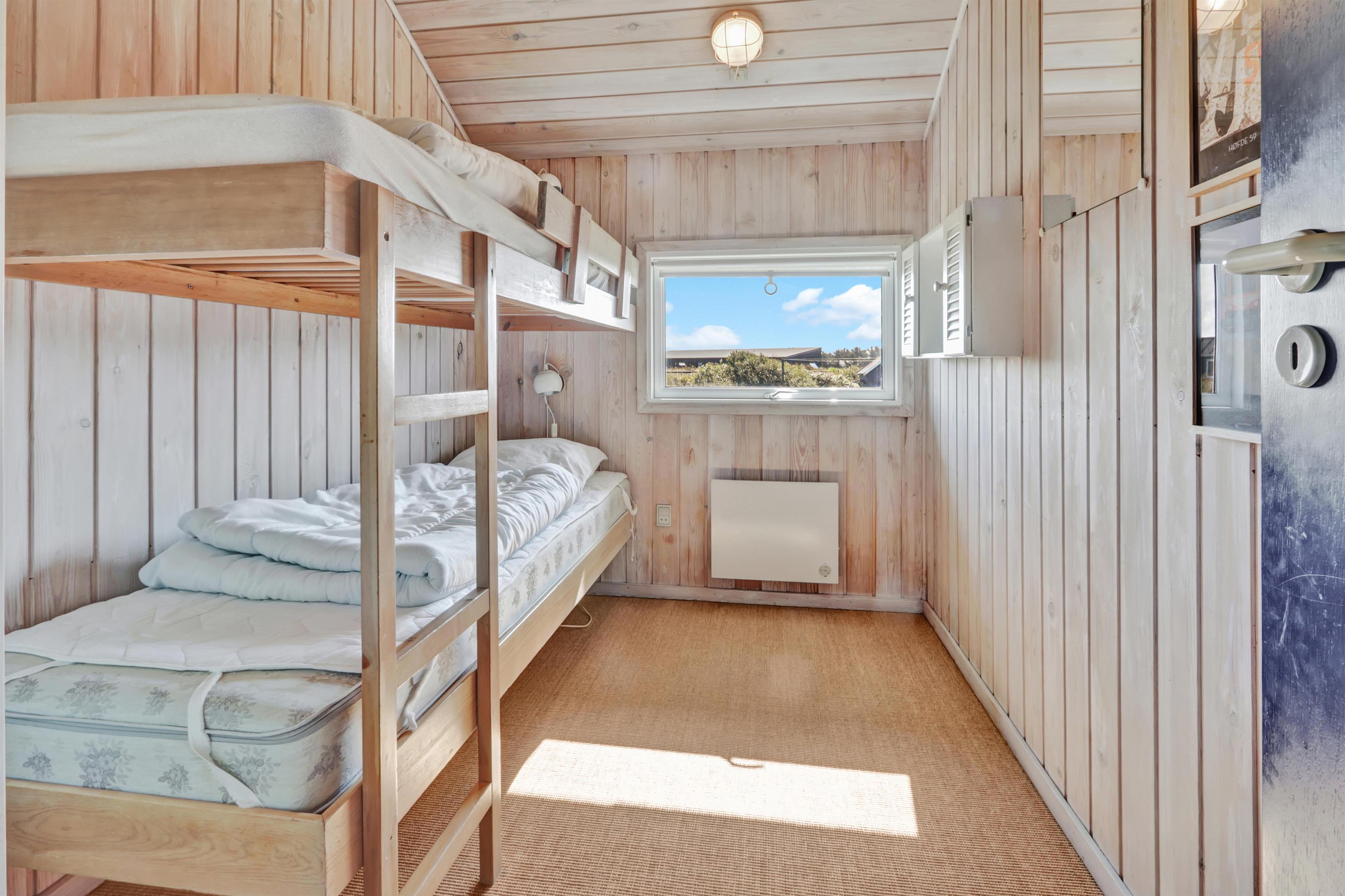 Køkkenet byder på glaskeramisk komfur, køle/fryseskab, mikrobølgeovn og opvaskemaskine. Der er 3 soveværelser i huset bestående af et værelse med dobbeltseng og 2 værelser med henholdsvis 1 køjesenge og 2 enkeltsenge. Herudover er der en barneseng i huset til fri afbenyttelse. Badeværelset er beklædt med træ og her findes bruser, håndvask og toilet. Herfra er der også indgang til husets sauna.