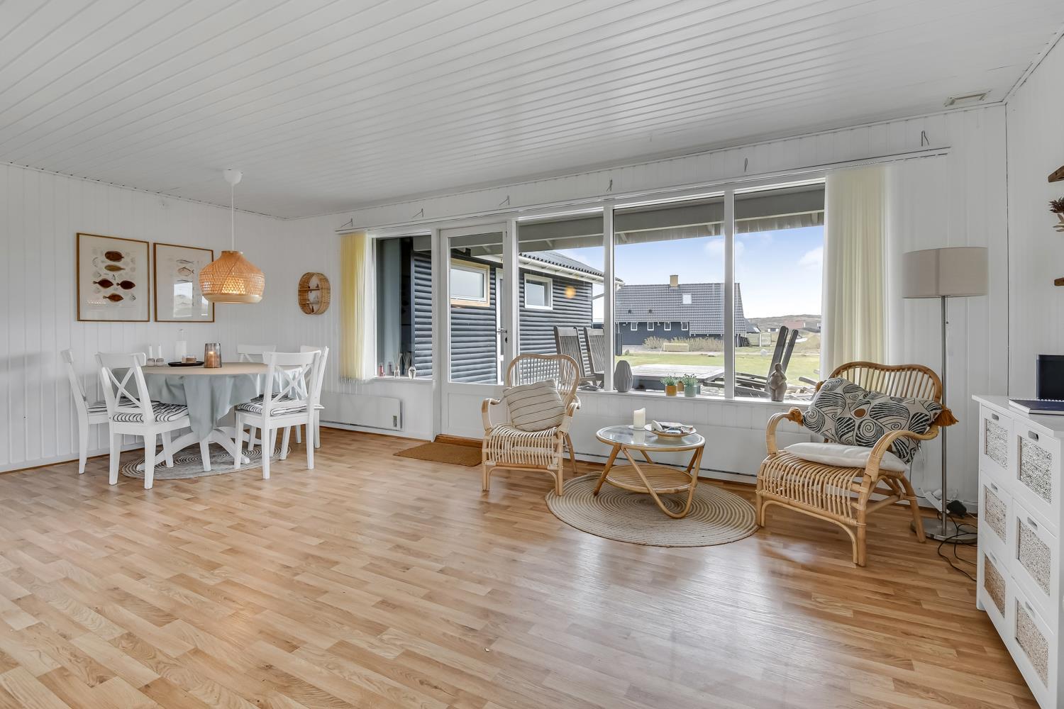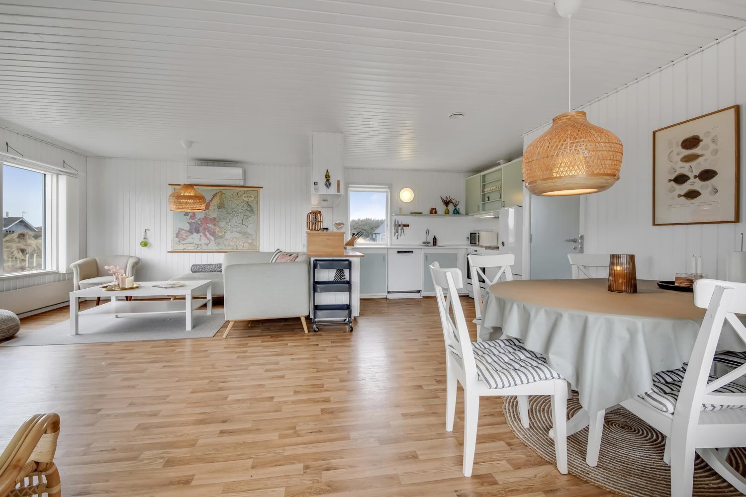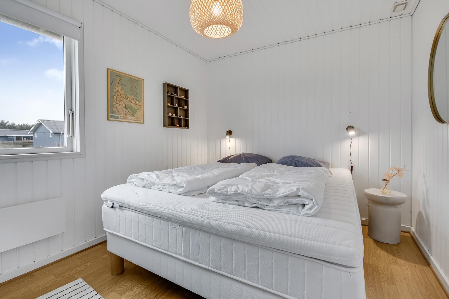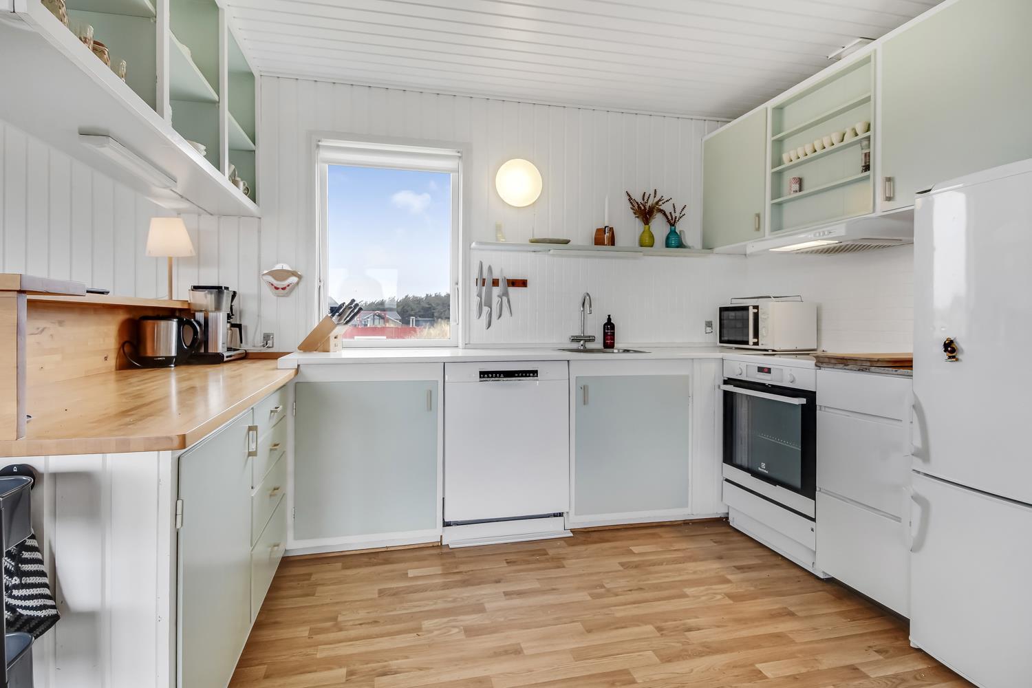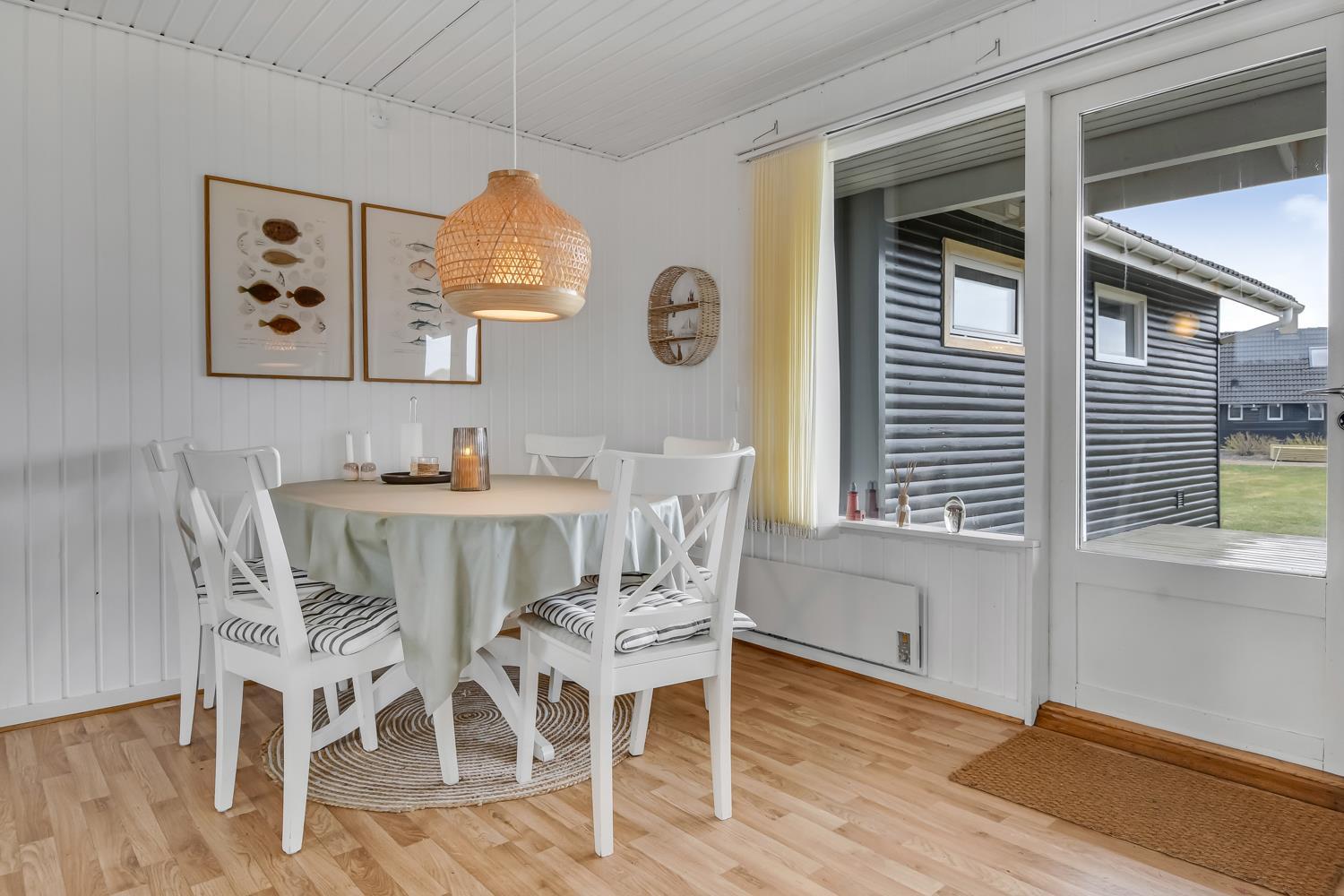 103 m2 stort sommerhus, som byder på ægte dansk hygge. Huset er godt indrettet med 3 soverum (1DS, 2ES, 2KS). Opholdsstuen er pænt møbleret med gode møbler, spiseplads, TV med tyske og danske kanaler samt Streamingsmuligheder via Chromecast, og Sonos Bluethooth højtalere. Varmepumpe sørger for et godt indeklima og at man kan holde varmen til en billig pris året rundt. Køkkenhjørne med glaskeramisk komfur, emhætte, opvaskemaskine, mikroovn og køleskab med lille fryseboks. Praktiske hårde gulve i hele huset. Lækkert badeværelse med store, lyse klinker og flot bruser. Anneks med tilgang fra terrassen med sauna, ekstra bruser, vaskemaskine og tørretumbler. Dette hus har gratis adgang til Harboøre centret. Husdyr ikke tilladt. Ikke ryger hus.