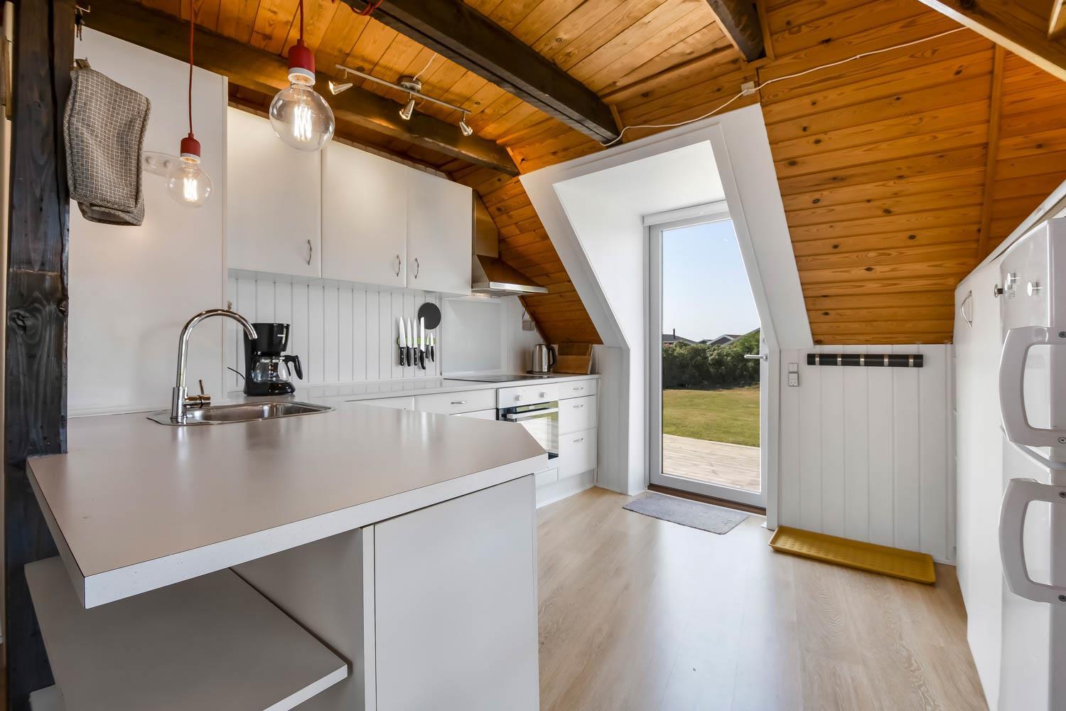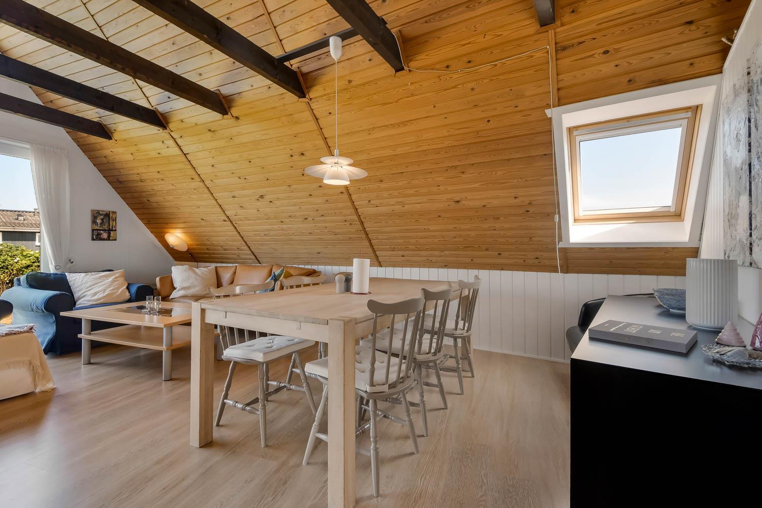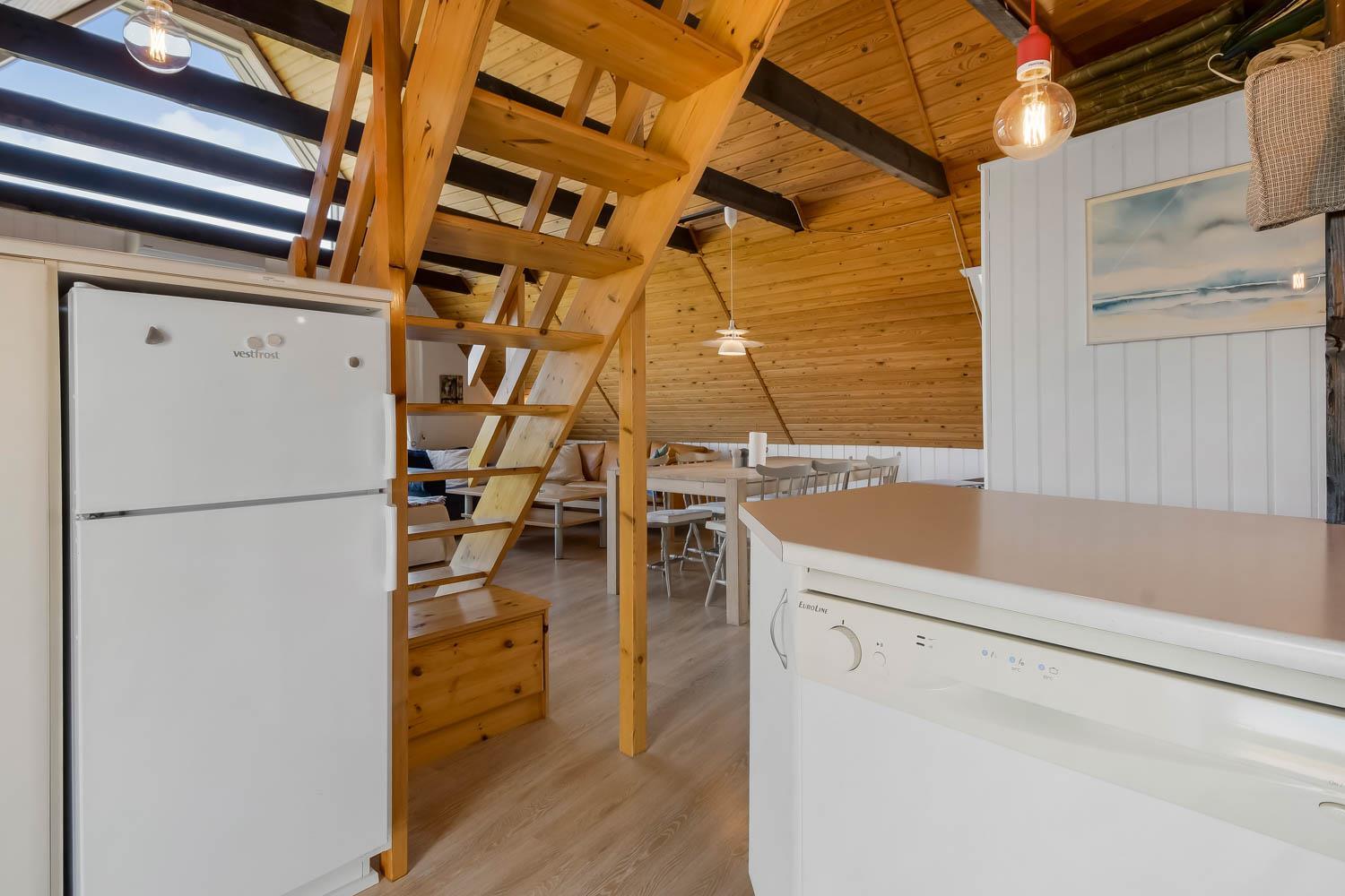 Huset er 112 m2 stort. Hyggelige opholdsstue med lædermøbler, stort smart-TV med danske og tyske kanaler, samt mulighed for streaming af TV/radio/Apps via Chromecast, CD-afspiller og Radio og et stort spisebord. Der er desuden en dejlig ny brændeovn som sammen med varmepumpen sørger for en behagelig varme og er med til at spare på forbruget. Fra stuen er der via en god trappe adgang til en stor hems med siddeplads, 2 ekstra sovepladser med fantastisk udsigt over Ferring Sø. Køkkenhjørne med opvaskemaskine, el-kogeplader, emhætte, indbygningsovn, køleskab med fryseboks og mikrobølgeovn. 2 soveværelser (180x200, 140x200). badeværelse med bruser, håndvask, toilet, vaskemaskine. Det er ikke et rygerhus. Max 2 husdyr tilladt.