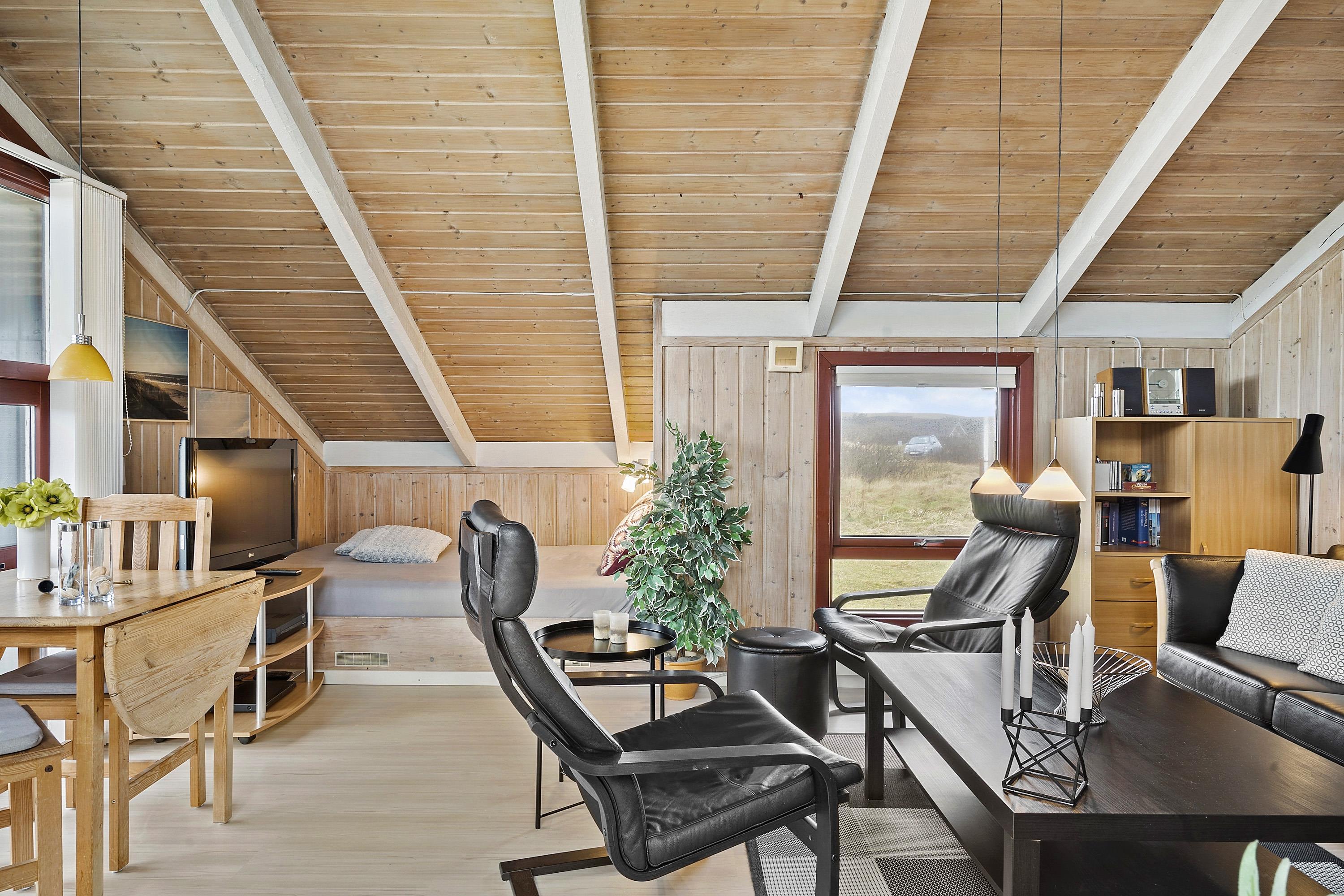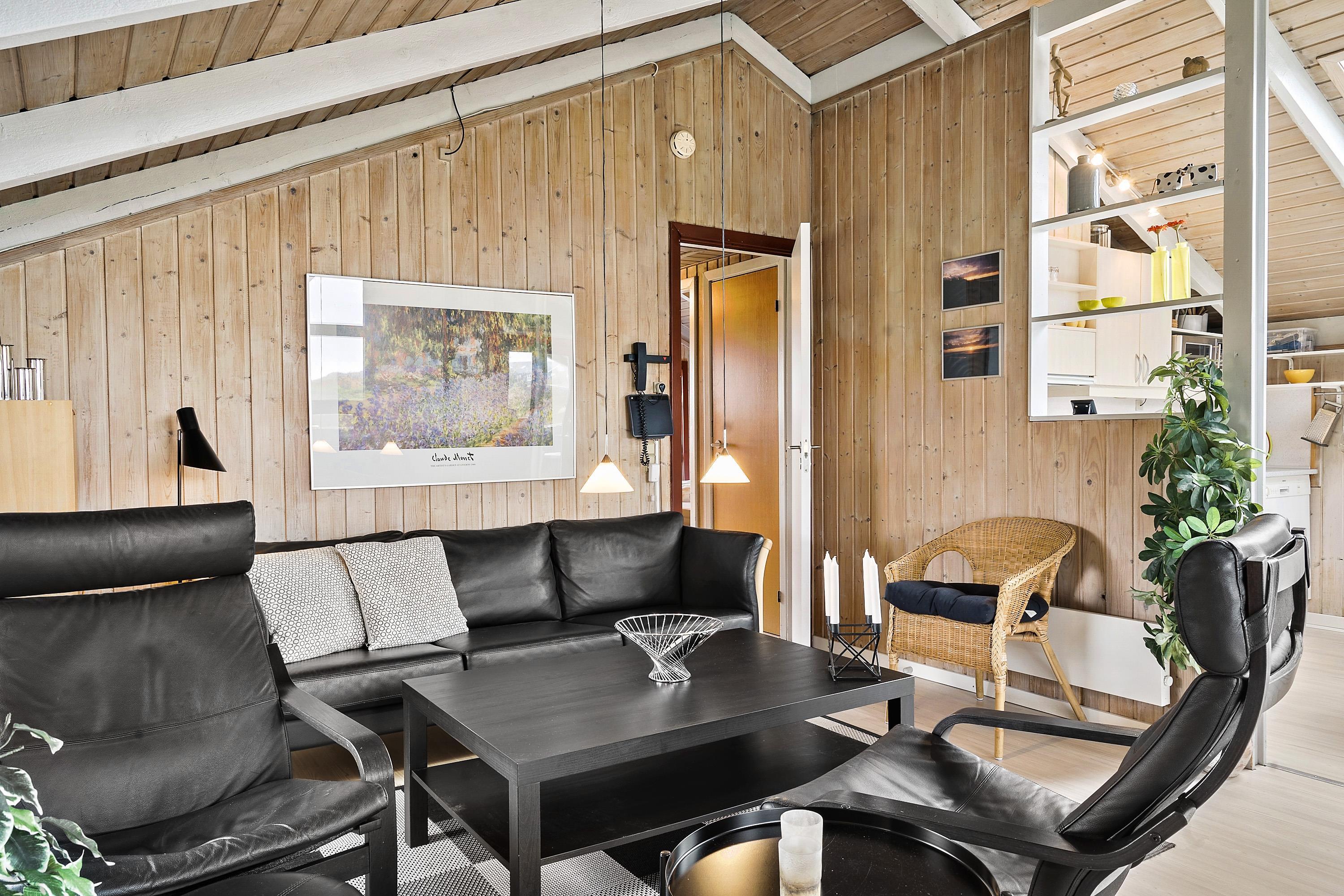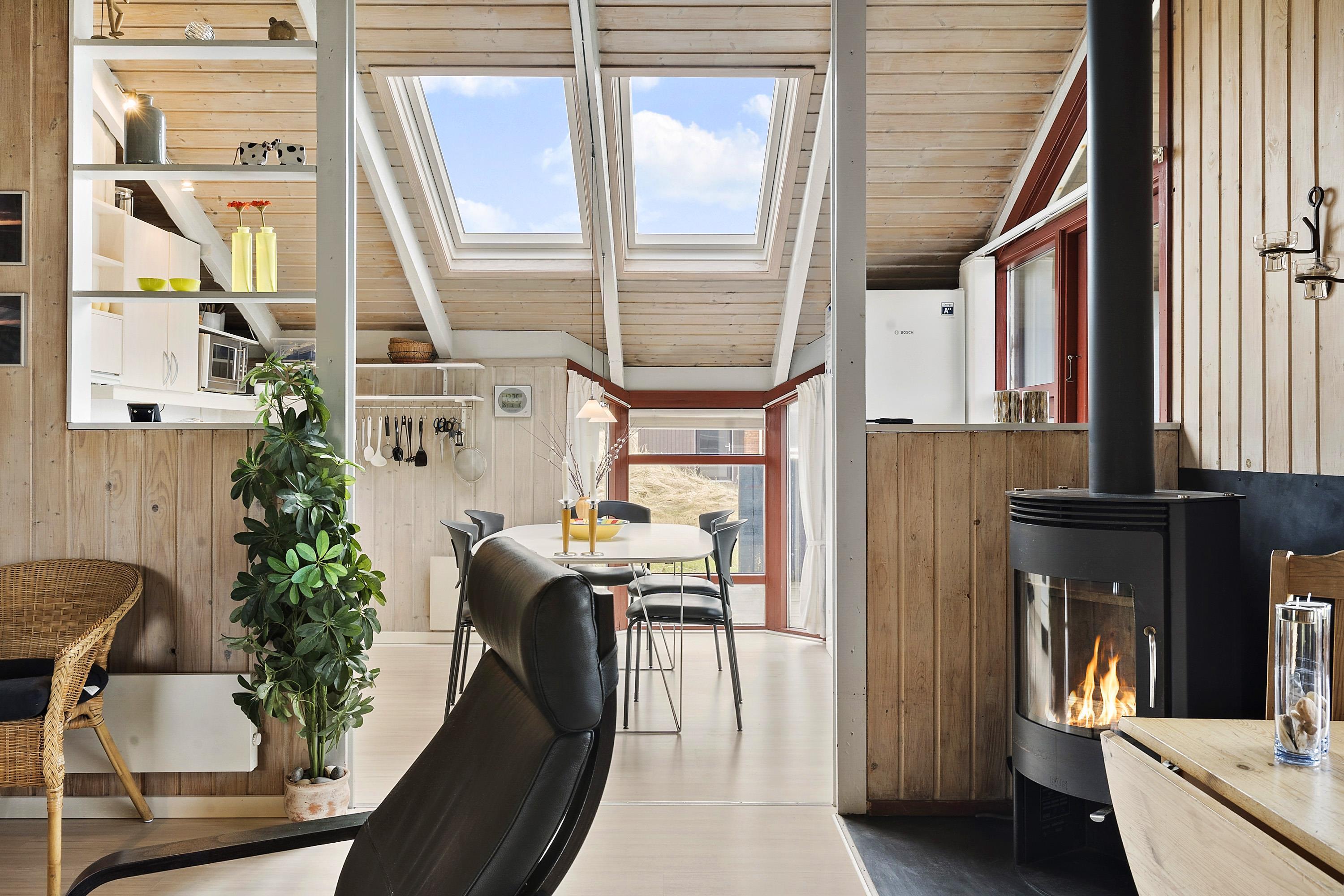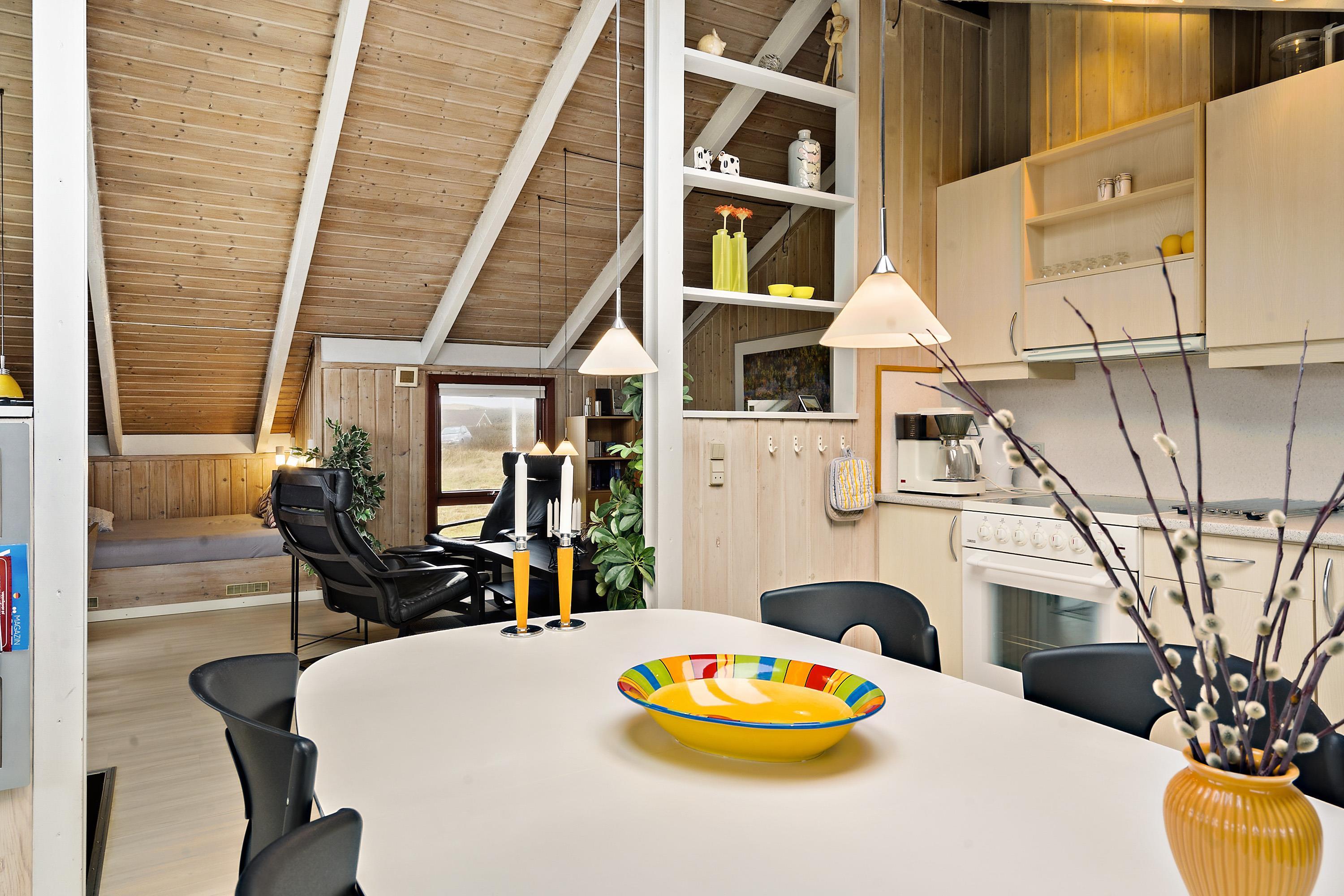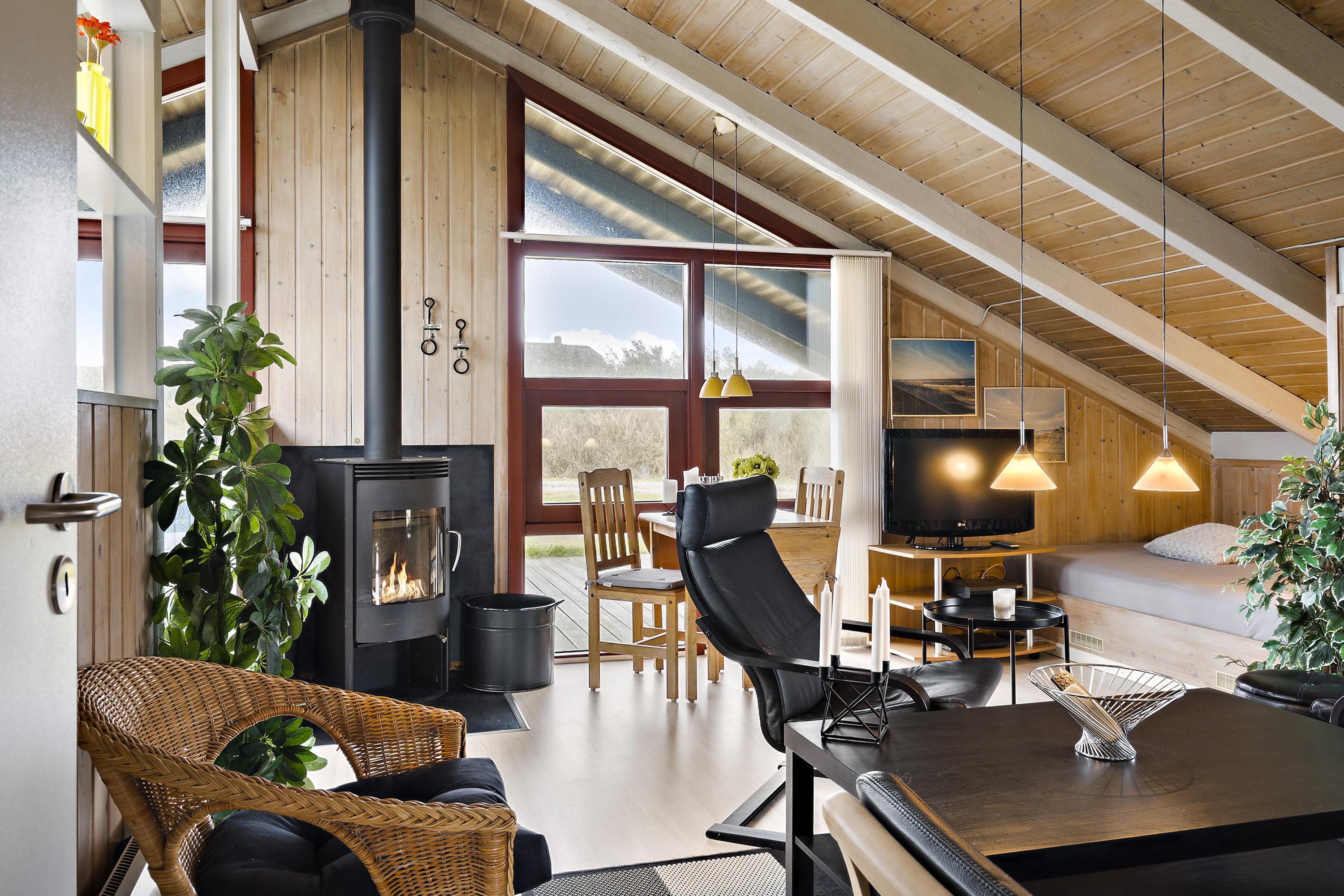 Huset er typisk indrettet med en sove- og badeafdeling og et større fællesrum. Køkken og stue er nemlig kombineret og udgør samlingsstedet i huset. Fra stuen er der store vinduespartier hvorfra man kan gå direkte ud til den vestvendte terrasse. Stuen har brændeovn, sofagruppe med sofabord, spisebord samt radio og fladskærm med DR og TV2. Herudover er der 2 sovemuligheder i stuen i et hjørne bygget ind i huset. Køkkenet har glaskeramisk komfur, køleskab, mirkobølgeovn og opvaskemaskine.