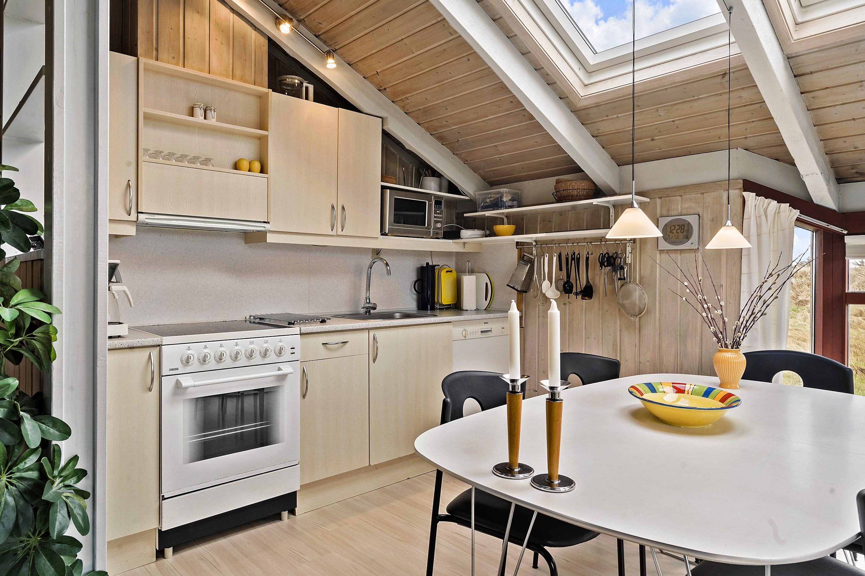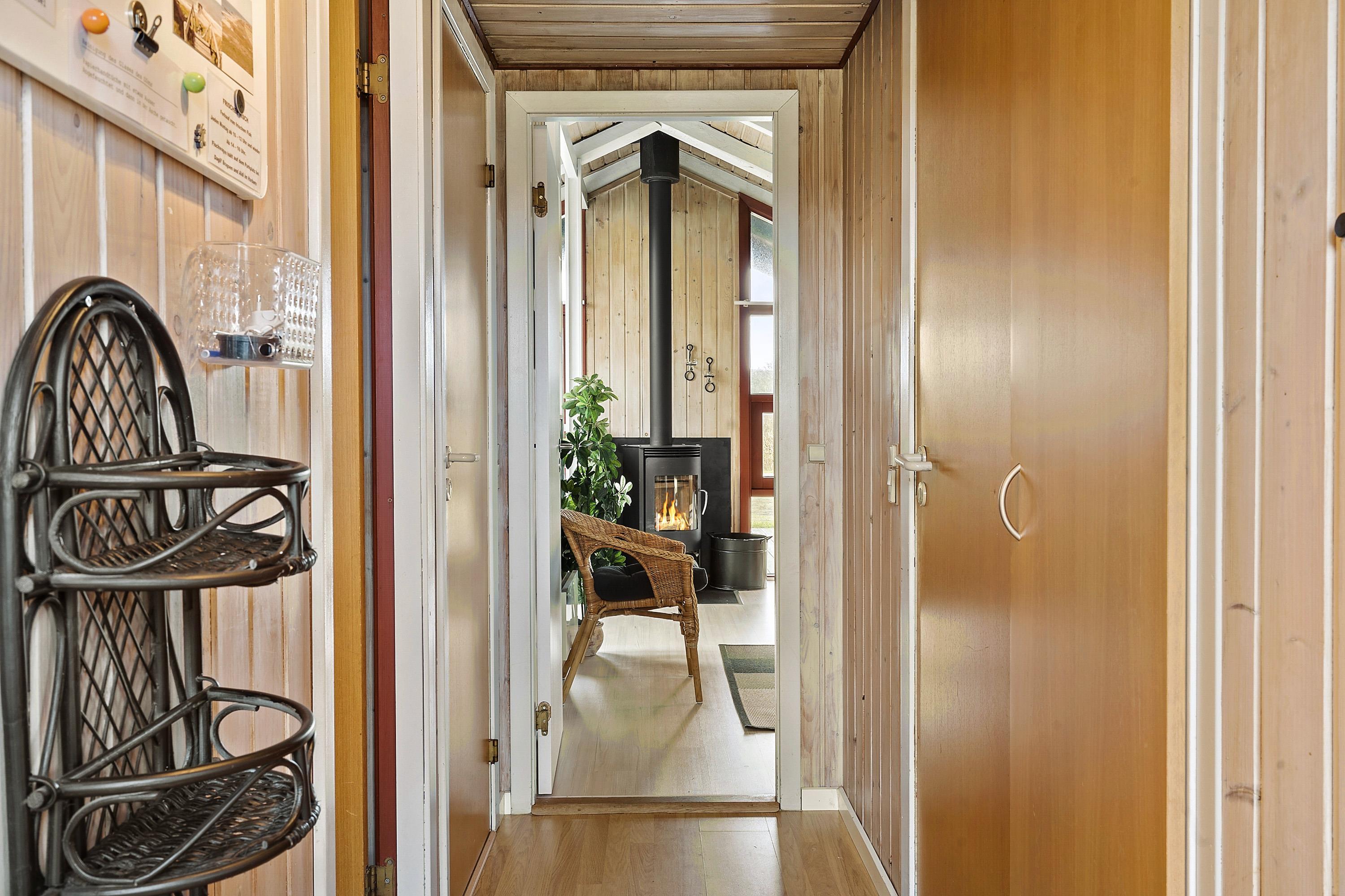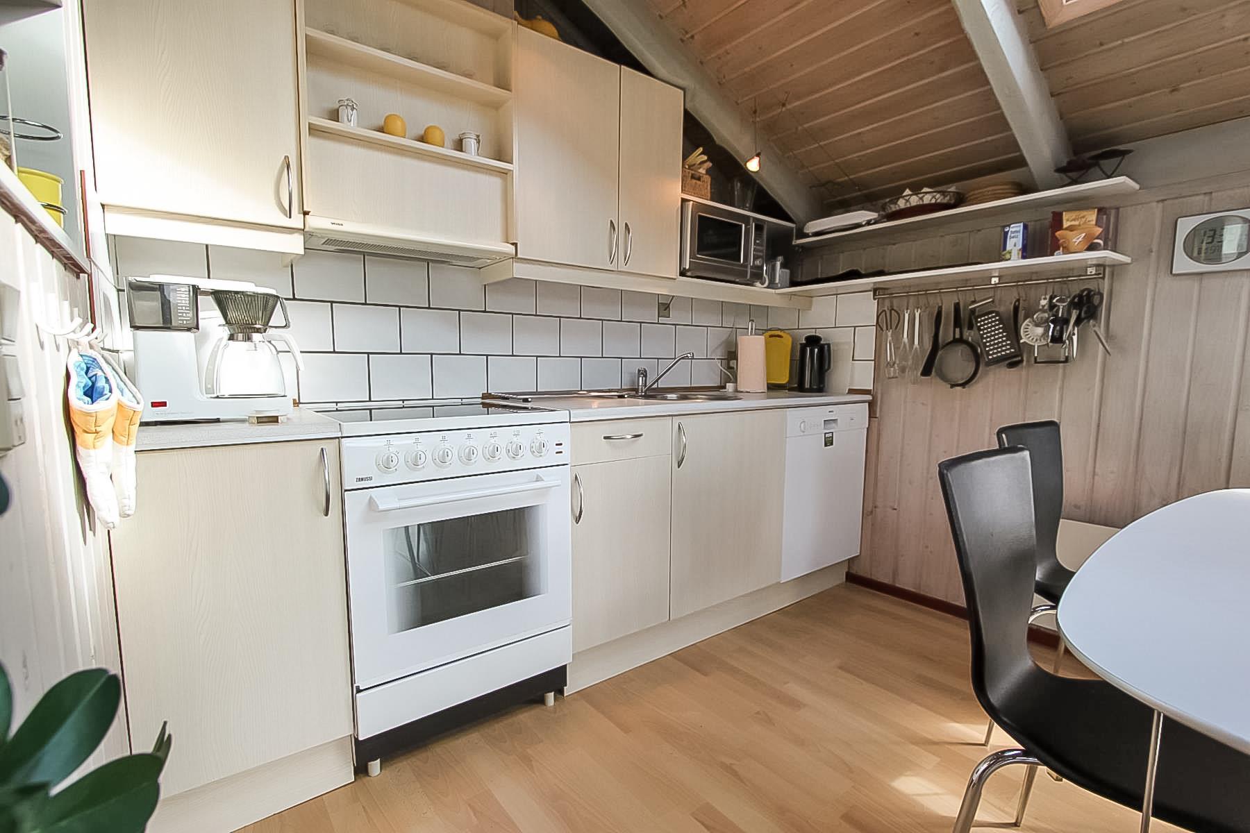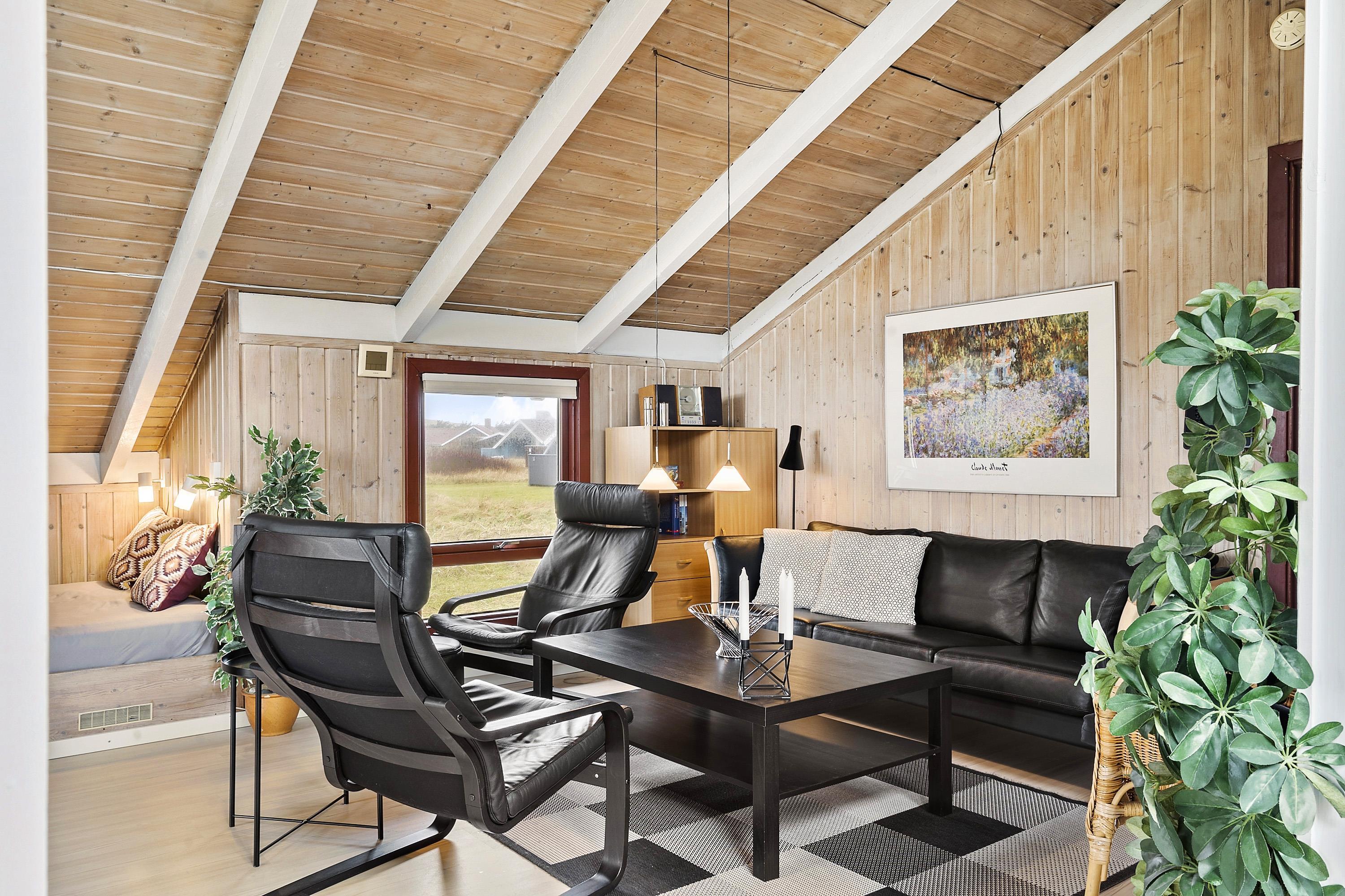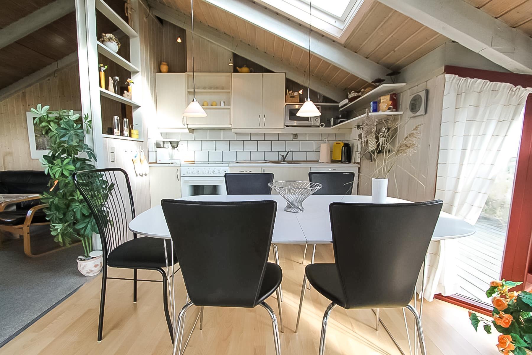 Huset er typisk indrettet med en sove- og badeafdeling og et større fællesrum. Køkken og stue er nemlig kombineret og udgør samlingsstedet i huset. Fra stuen er der store vinduespartier hvorfra man kan gå direkte ud til den vestvendte terrasse. Stuen har brændeovn, sofagruppe med sofabord, spisebord samt radio og fladskærm med DR og TV2. Herudover er der 2 sovemuligheder i stuen i et hjørne bygget ind i huset. Køkkenet har glaskeramisk komfur, køleskab, mirkobølgeovn og opvaskemaskine.