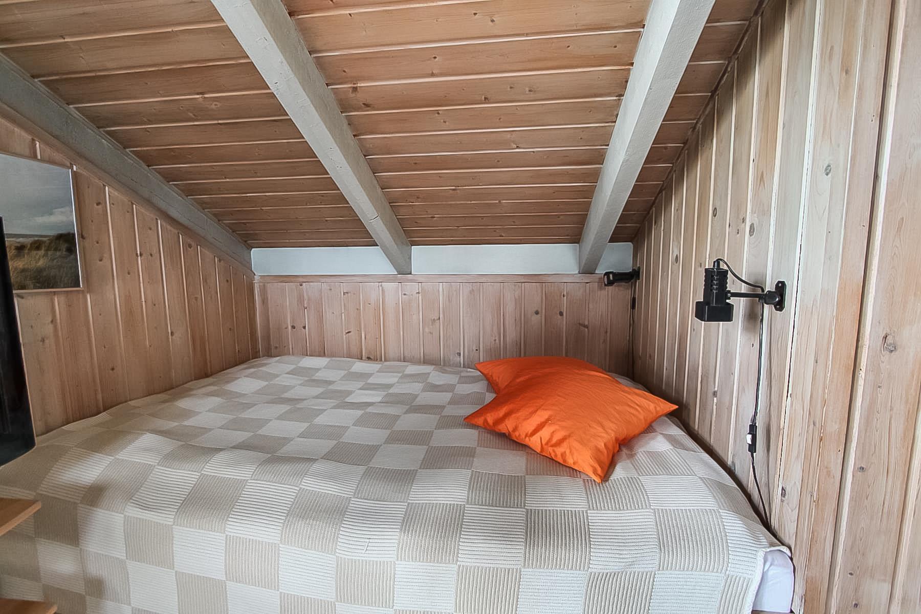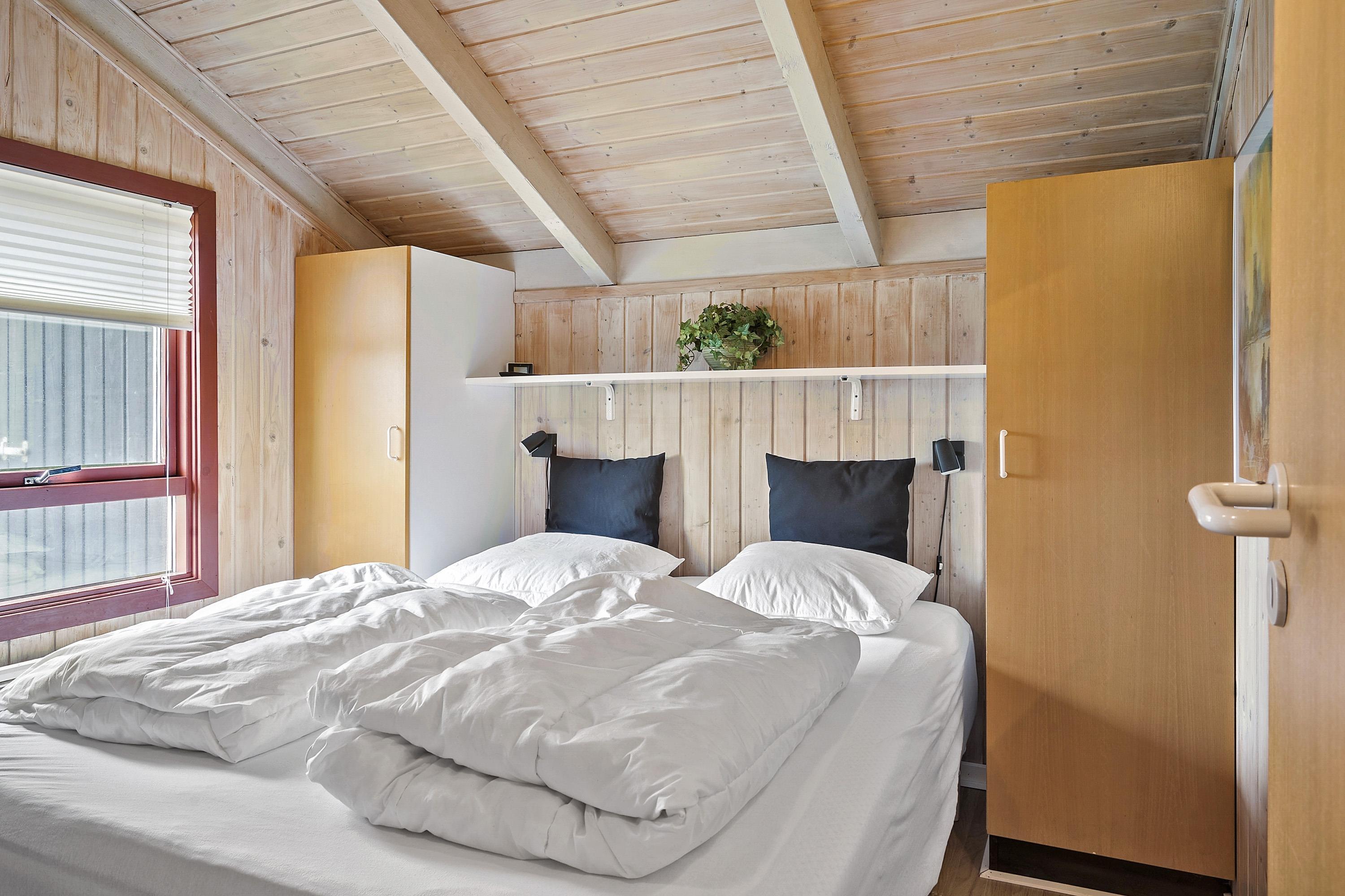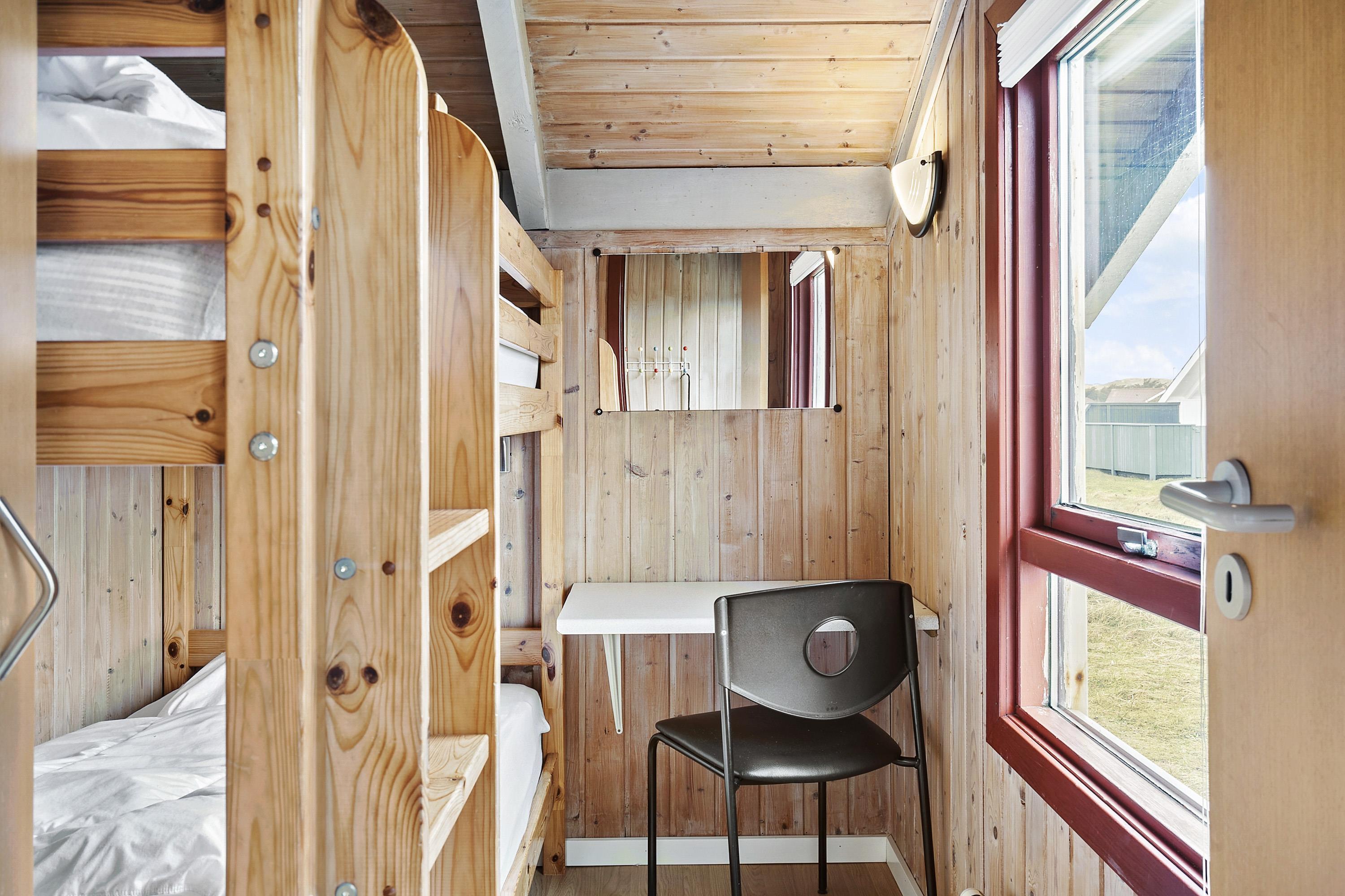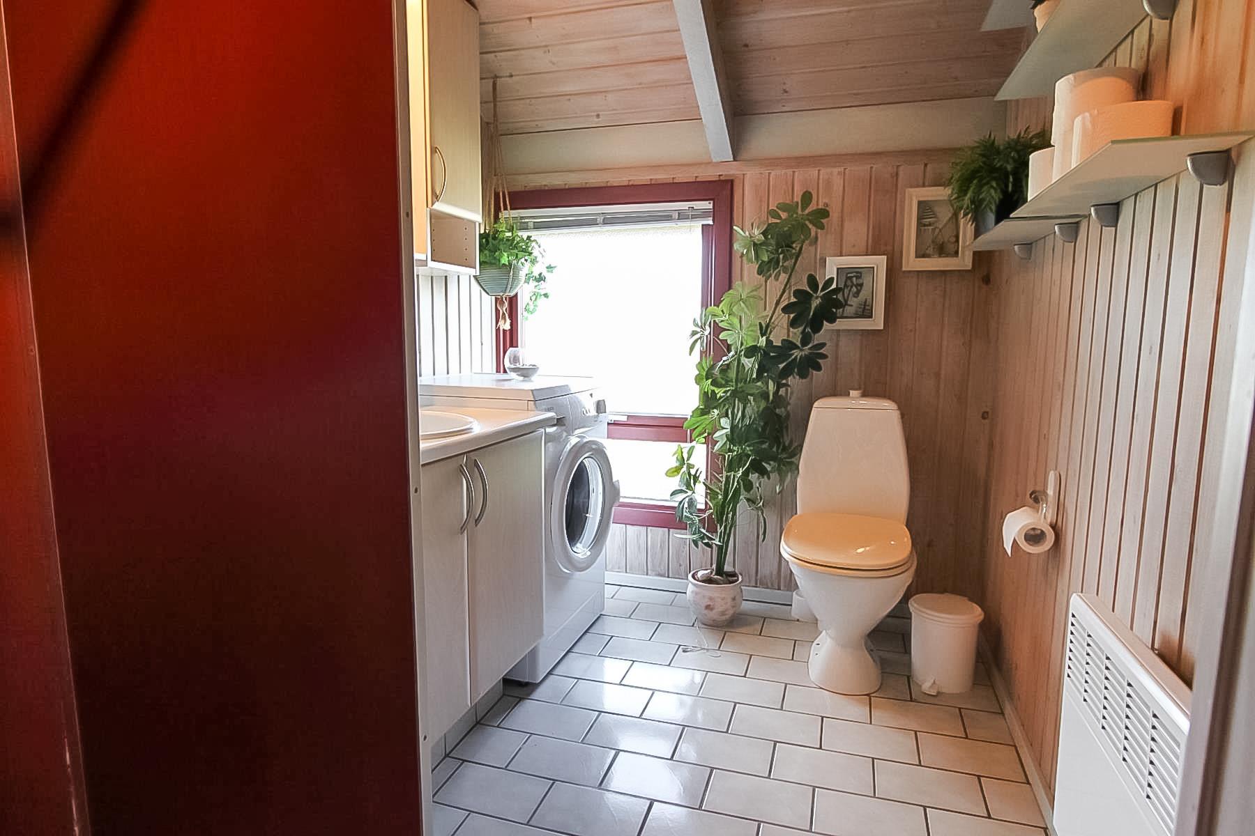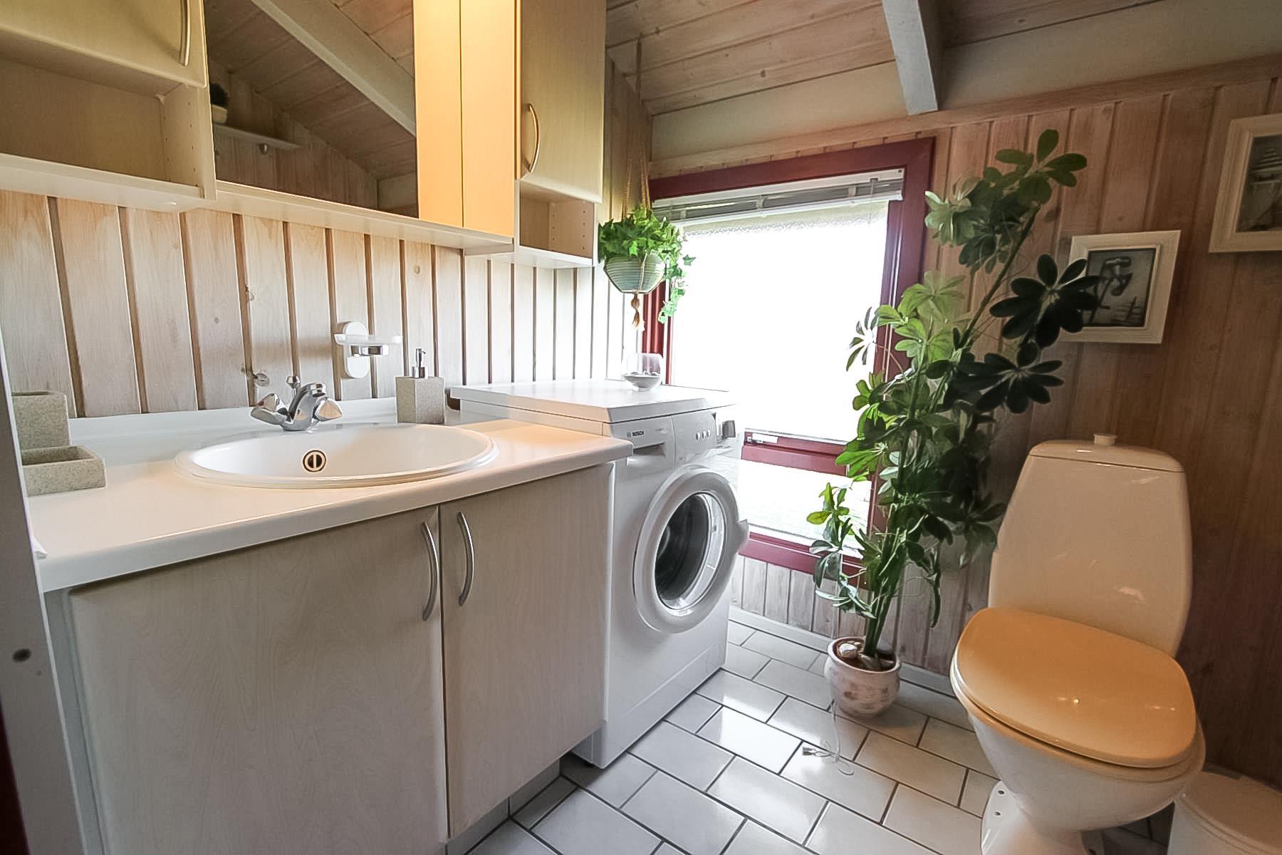Badeværelset har toilet, bruser og håndvask plus en vaskemaskine. Herudover er der 2 soveværelser med et værelse med dobbeltseng og tv og et værelse med 2 køjesenge.
