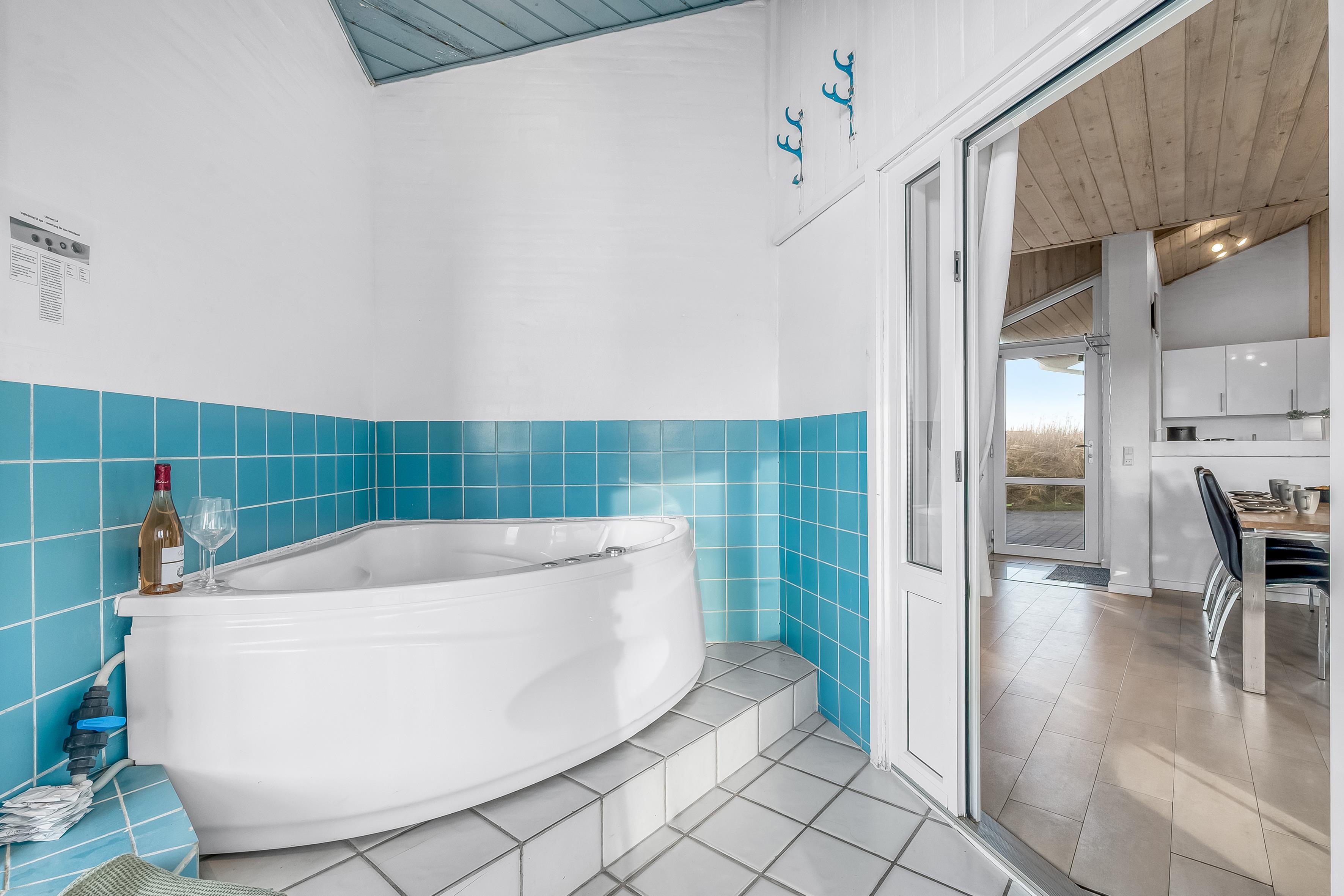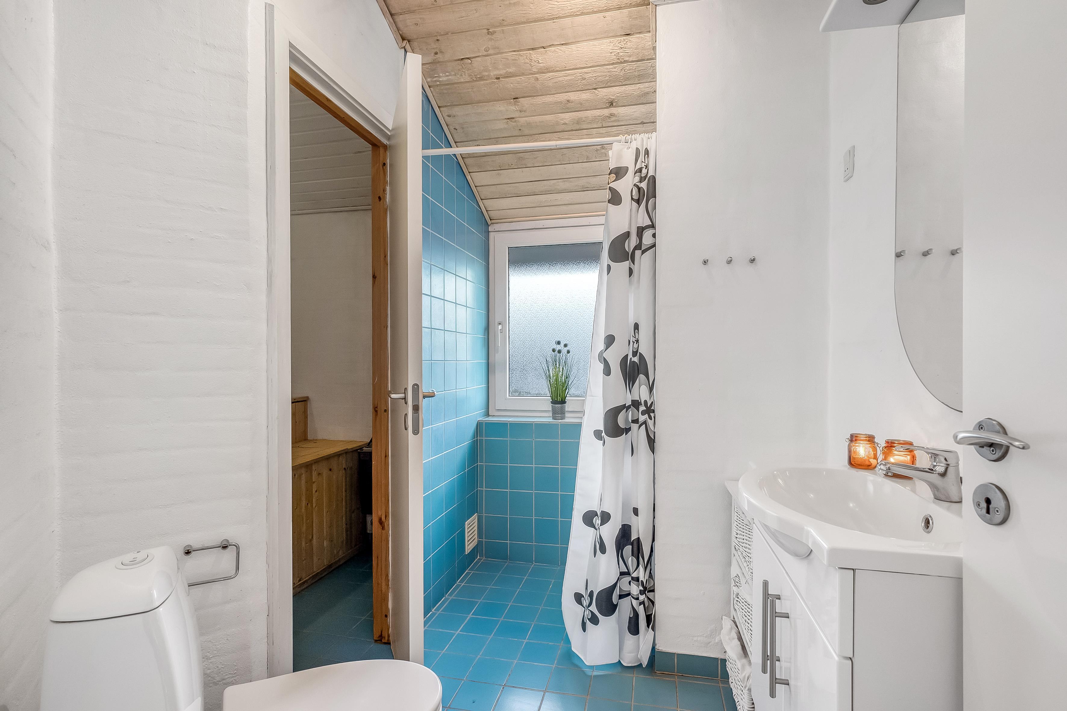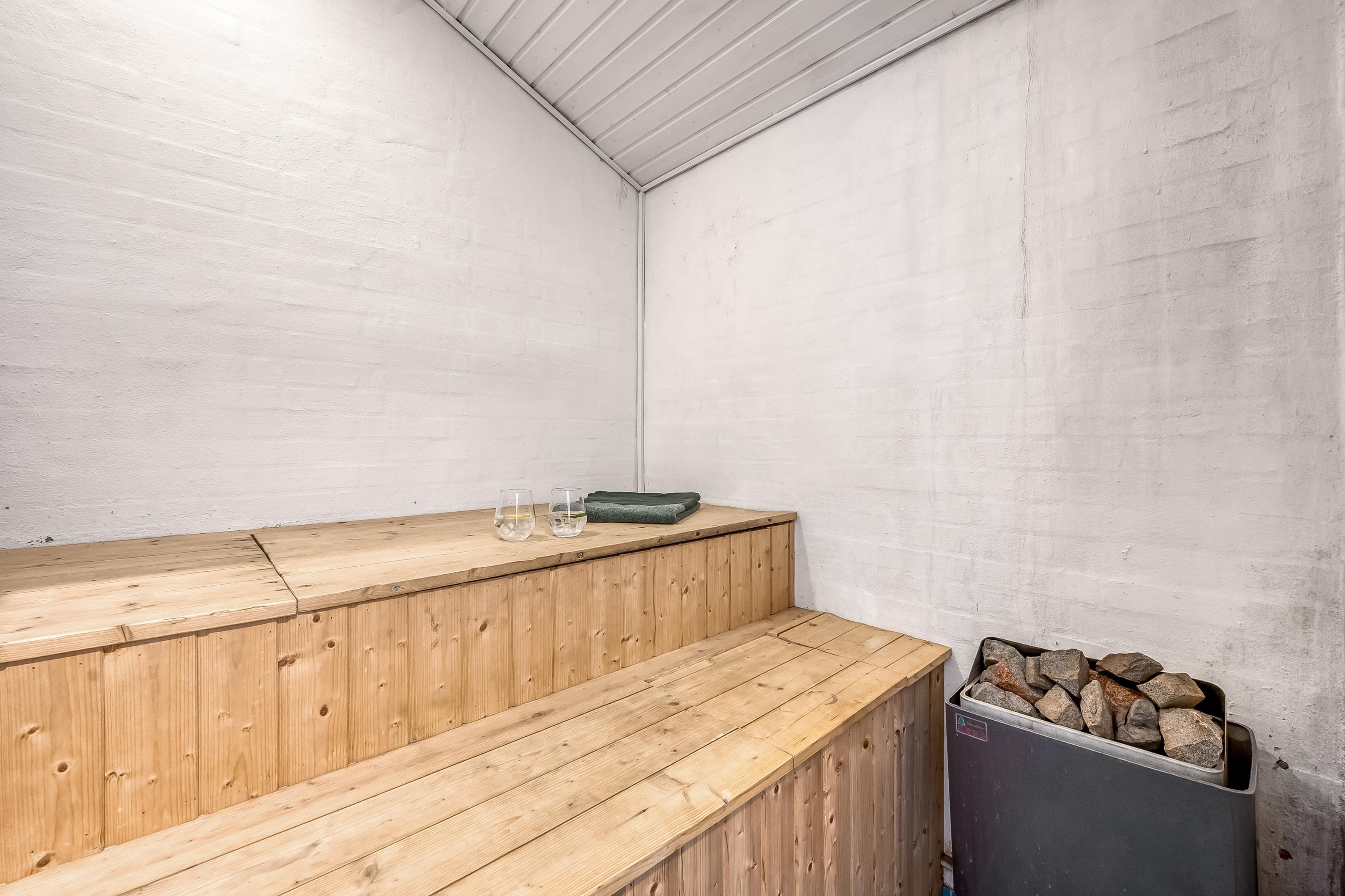 Når det kommer til badeværelser, tilbyder boligen to moderne faciliteter, der er udstyret med gulvvarme, hvilket sikrer en behagelig temperatur, selv på de koldere dage. For dem, der ønsker lidt ekstra luksus, er der også en indendørs sauna og et spa, der kan rumme op til 2 personer - perfekt til at slappe af efter en lang dag ved stranden eller på opdagelse i området.