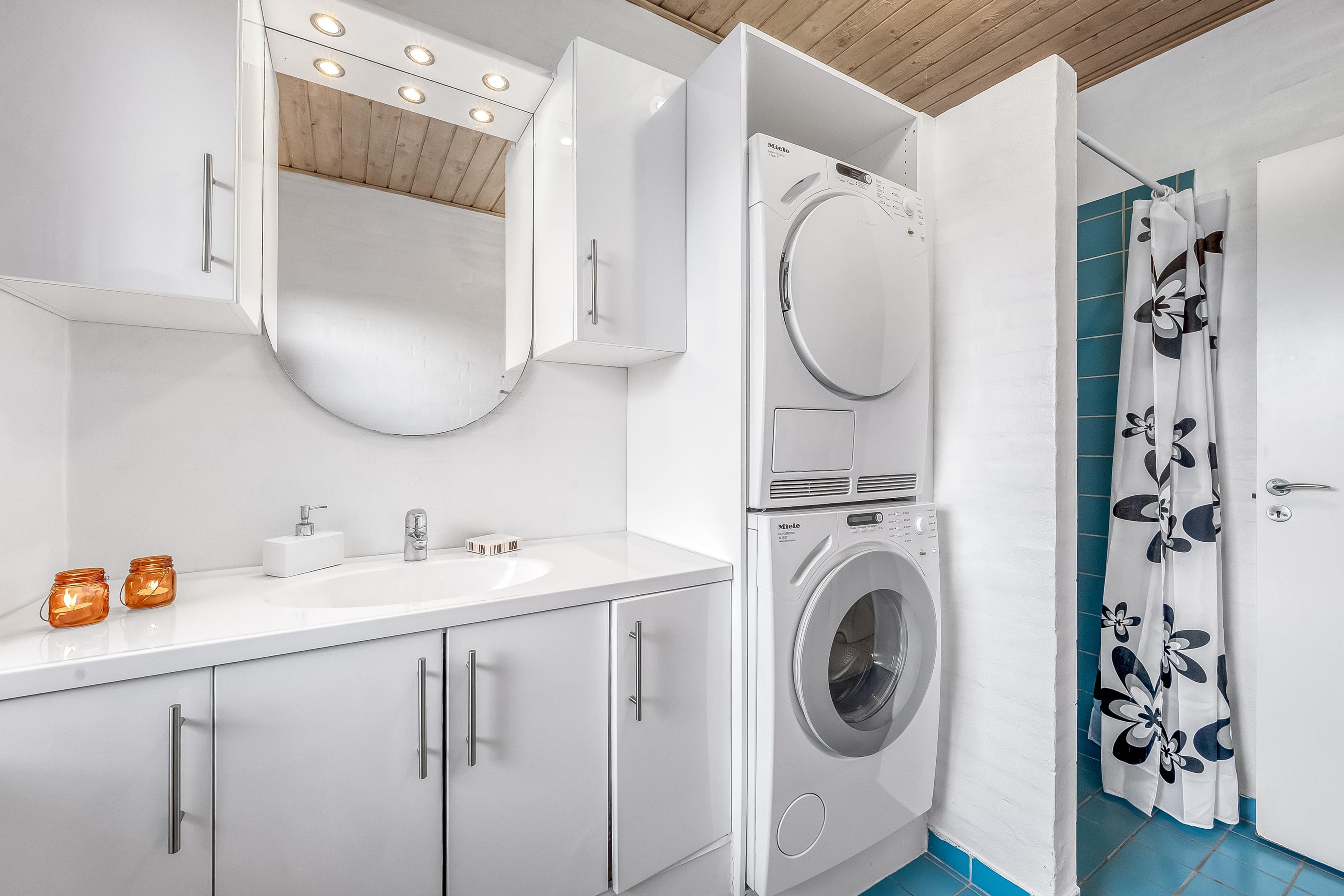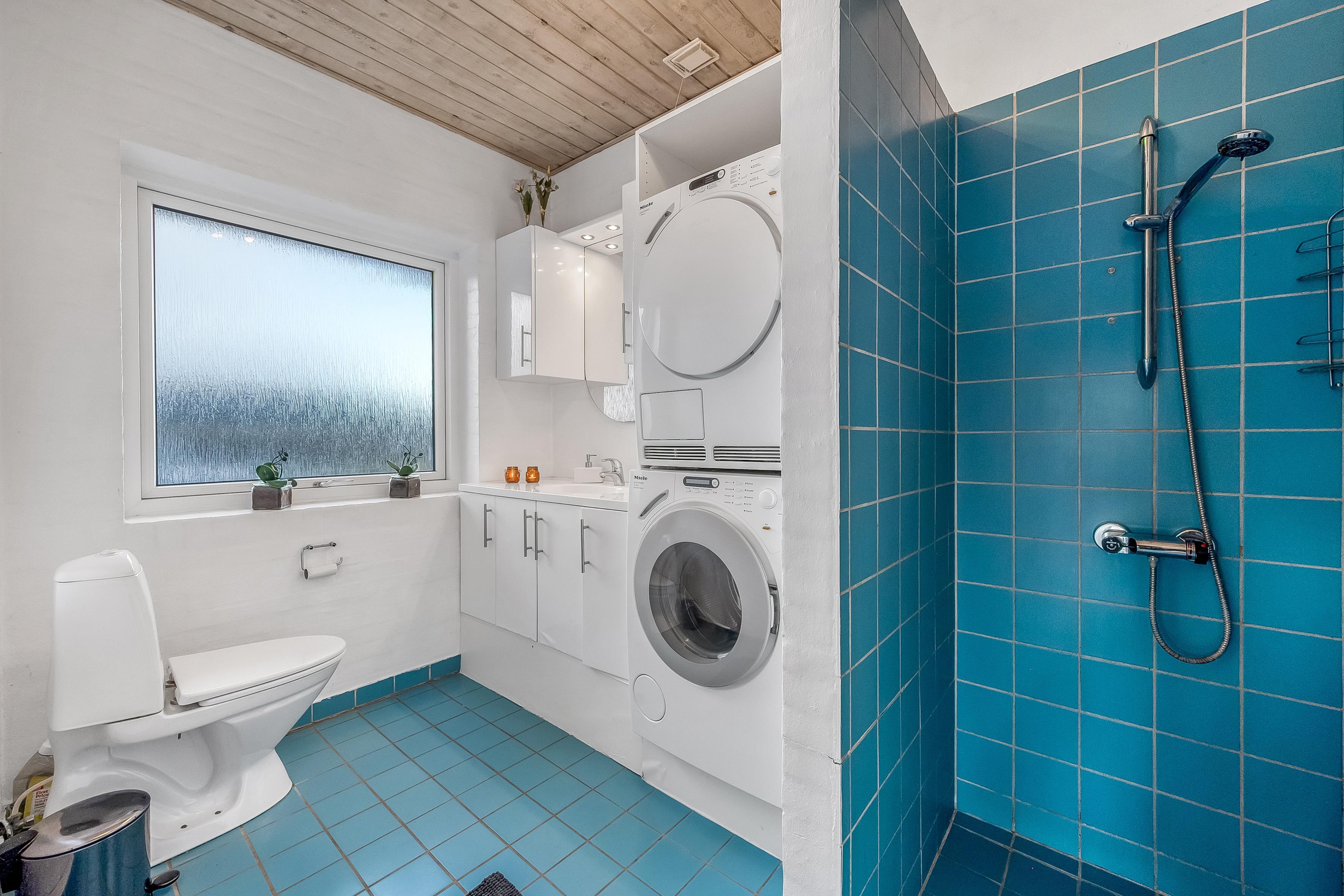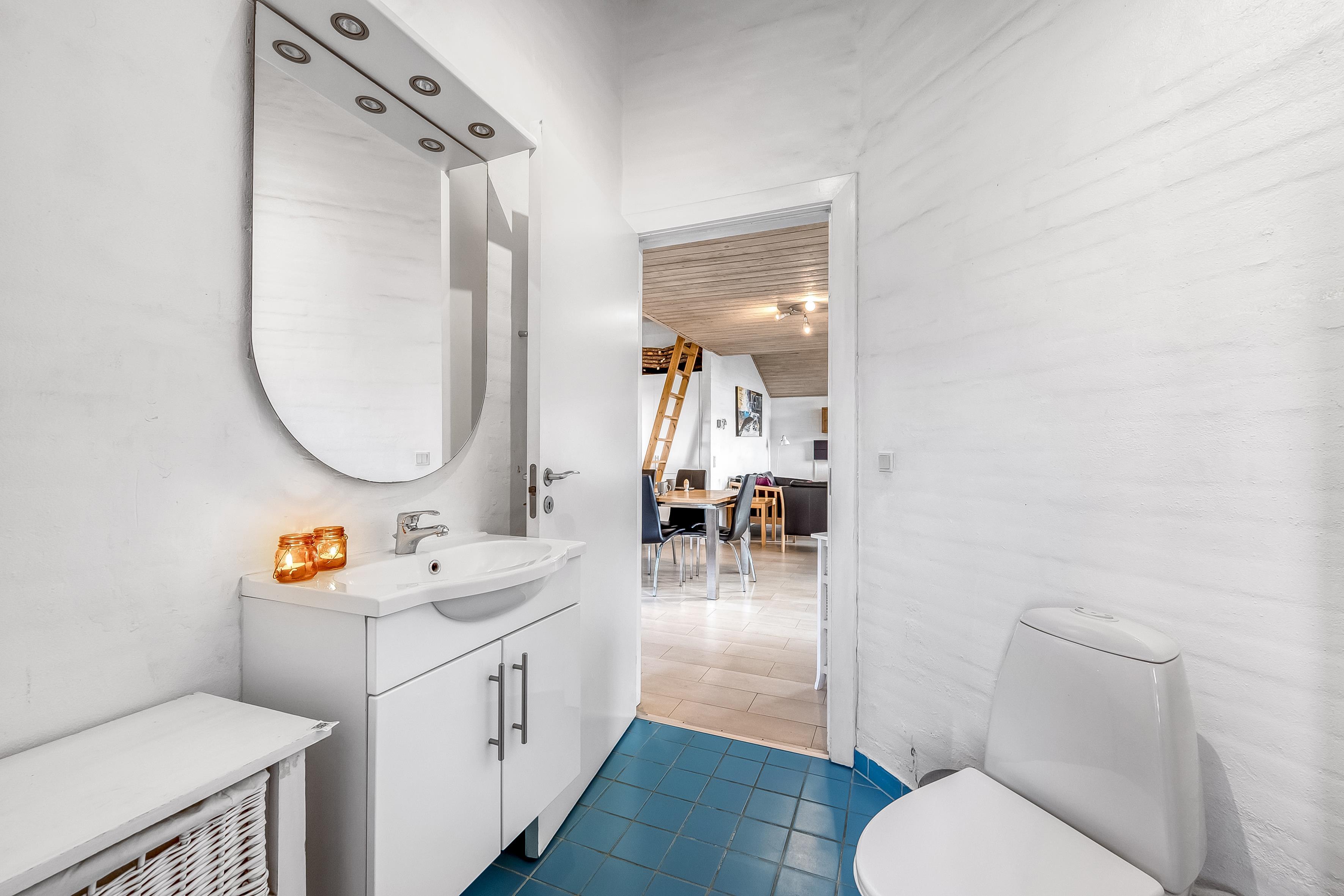 Når det kommer til badeværelser, tilbyder boligen to moderne faciliteter, der er udstyret med gulvvarme, hvilket sikrer en behagelig temperatur, selv på de koldere dage. For dem, der ønsker lidt ekstra luksus, er der også en indendørs sauna og et spa, der kan rumme op til 2 personer - perfekt til at slappe af efter en lang dag ved stranden eller på opdagelse i området.