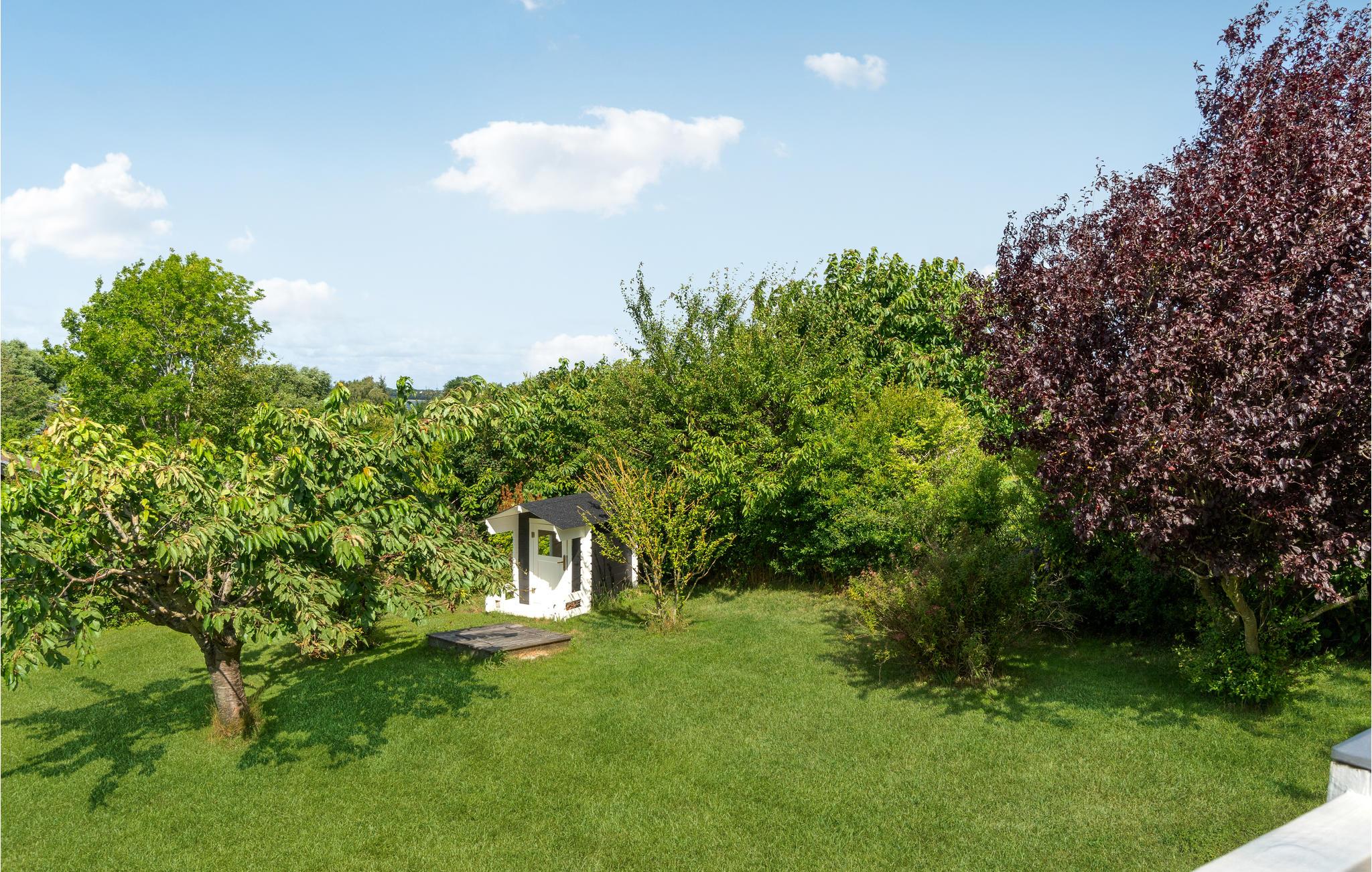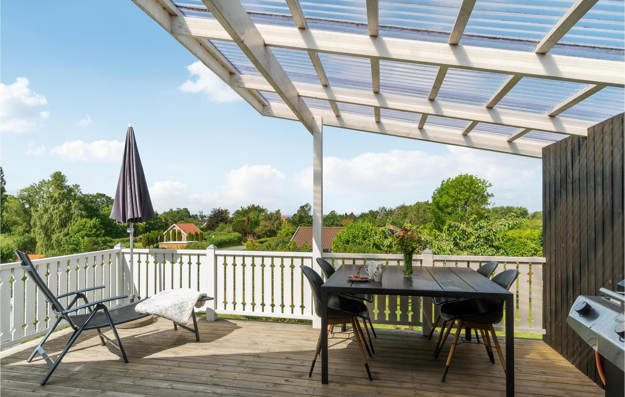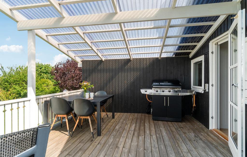 Udendørs finder I flere træterrasser, hvoraf den ene har en rutsjebane direkte ned i haven – et sikkert hit for alle børn. På terrassen står havemøbler, grill og parasol til rådighed, og her er også et overdækket område, så grillmiddagen kan nydes ude, uanset vejret. Haven har masser af plads til leg og spil, og de yngste vil få mange timer til at gå, blandt andet i sandkassen.