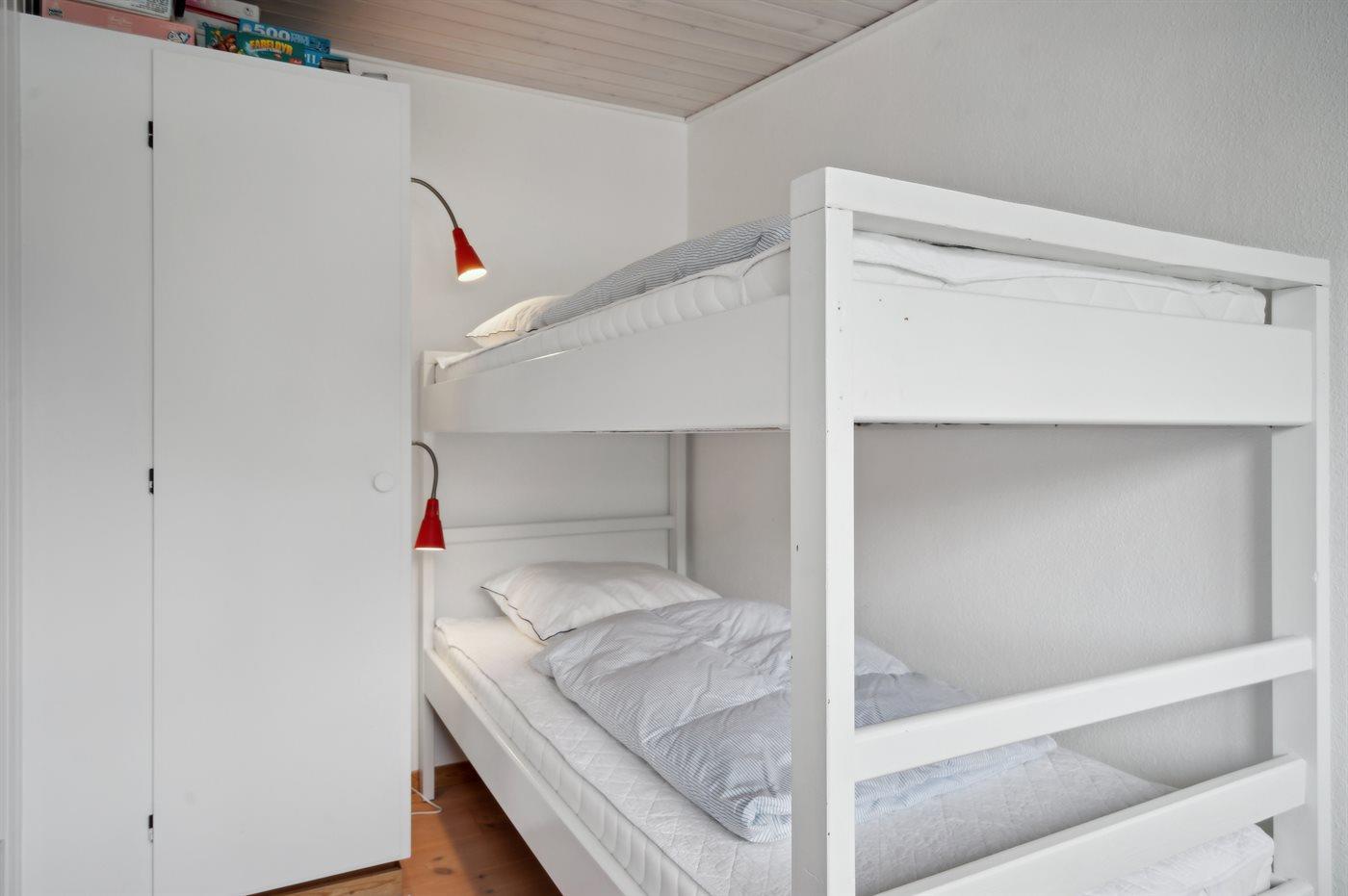 Der er i alt 3 soveværelser. Sovepladserne fordeler sig på: 2 sovepladser i dobbeltseng. 1 soveplads i enkeltseng. 2 sovepladser i køjeseng.