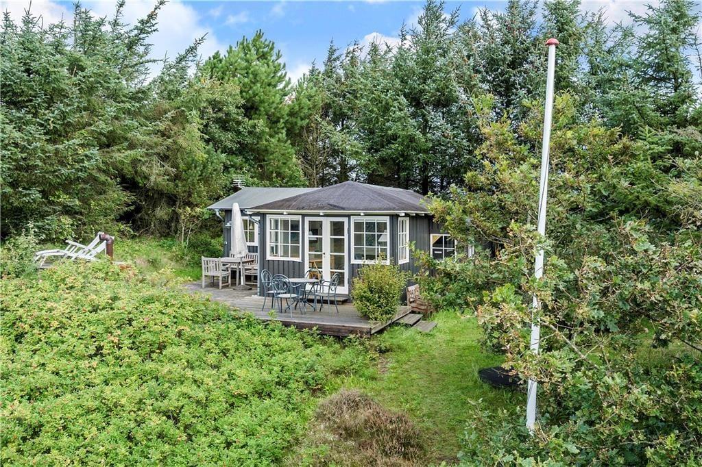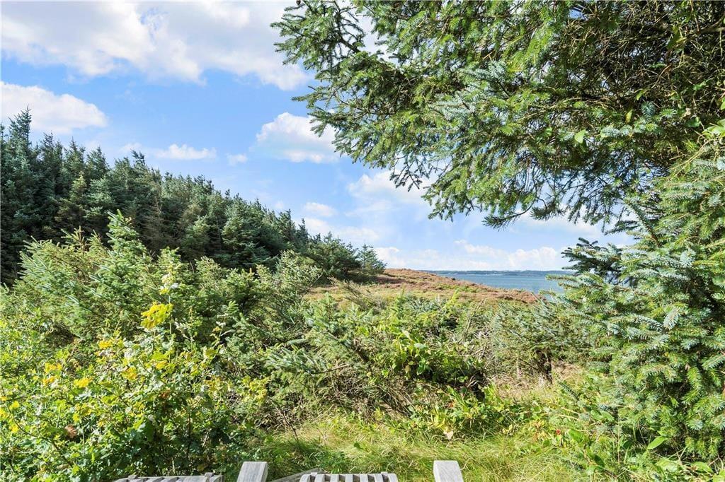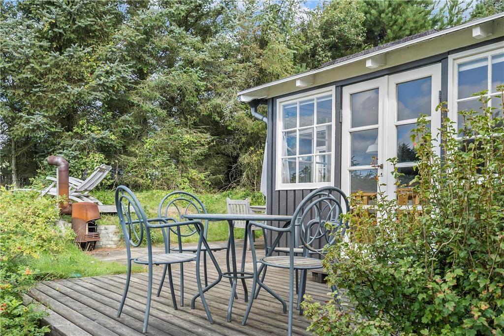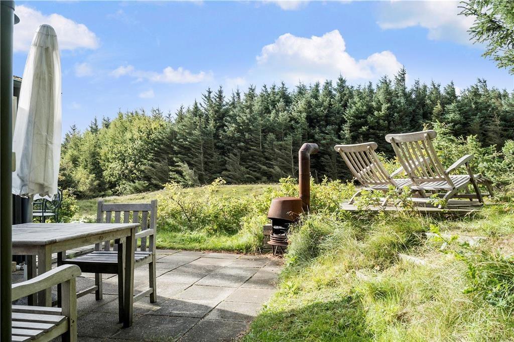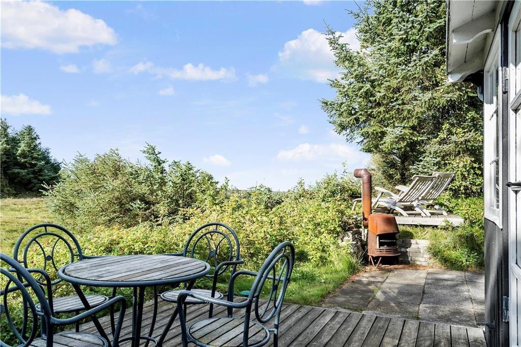 Fra både stuen og køkkenet har I direkte udgang til sommerhusets sydvendte terrassemiljø. Sanserne vækkes, når fuglene kvidrer fra trætoppene, hybenbuskene dufter, og I mærker en svag brise i sommersolen. Fra udsigtspladsen har I det flotteste vue over kysten og vandet, og der er havemøbler, liggestole, parasol og grill til rådighed, så der er lagt op til mange skønne afslapningsstunder.