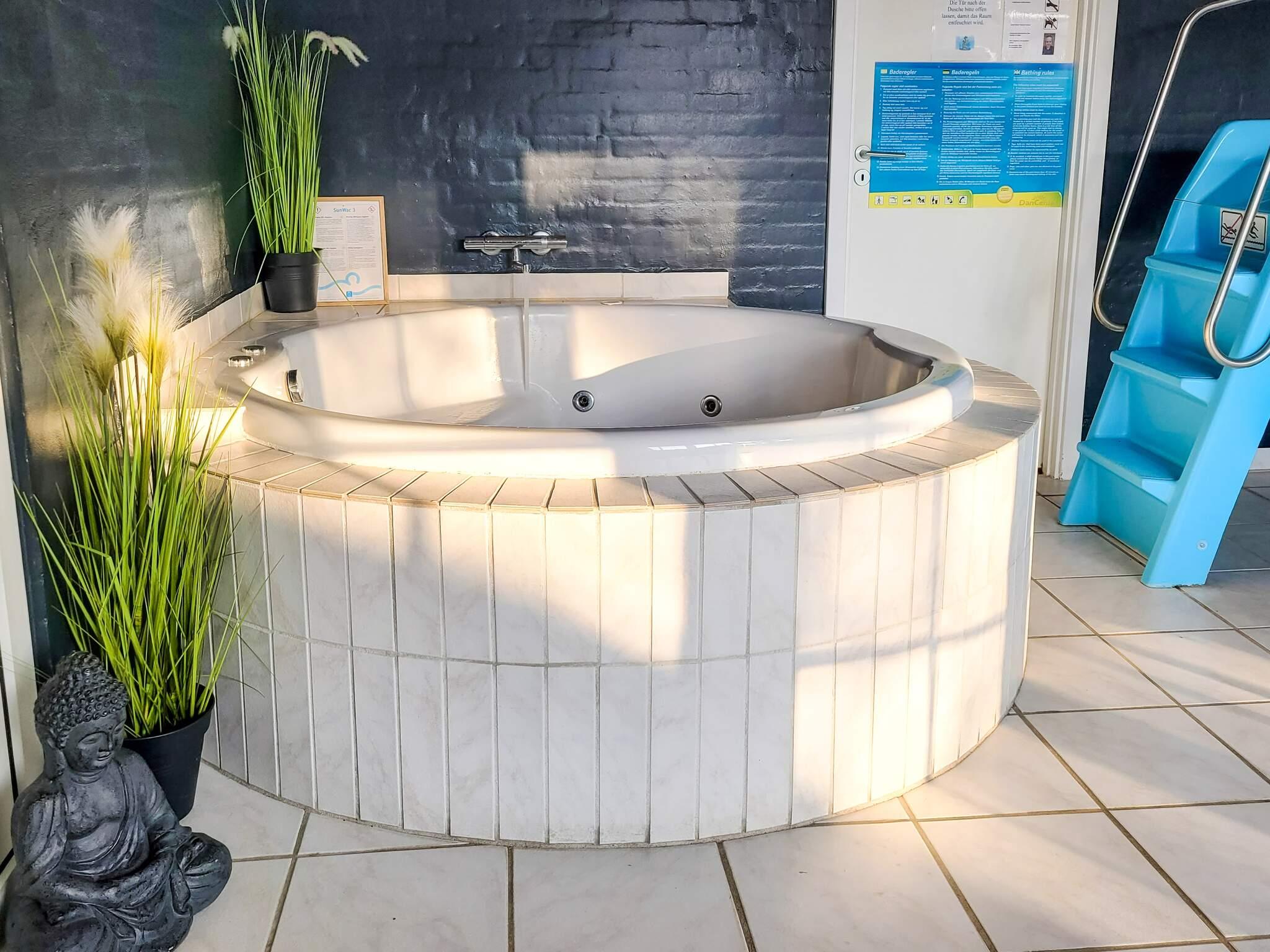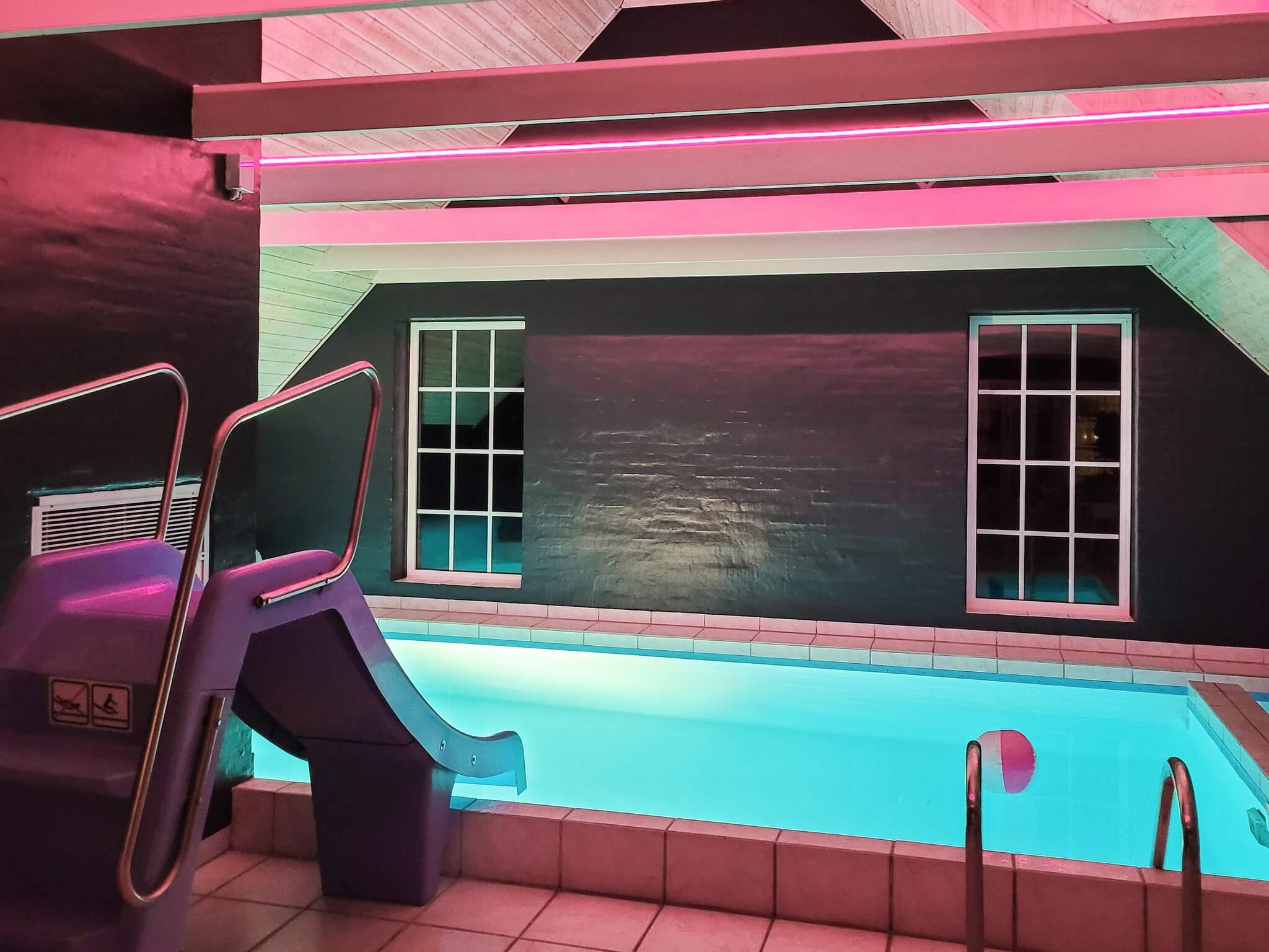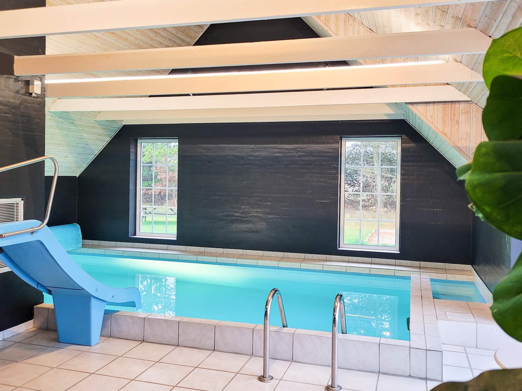 Poolafdelingen er yderst indbydende med en 20 m² pool med modstrømsanlæg og rutsjebane samt separat børnebassin. Der findes også et 5-personers spabad, sauna og direkte adgang til ét af husets tre badeværelser. Rummet har farveskiftende lys, der giver en festlig stemning.