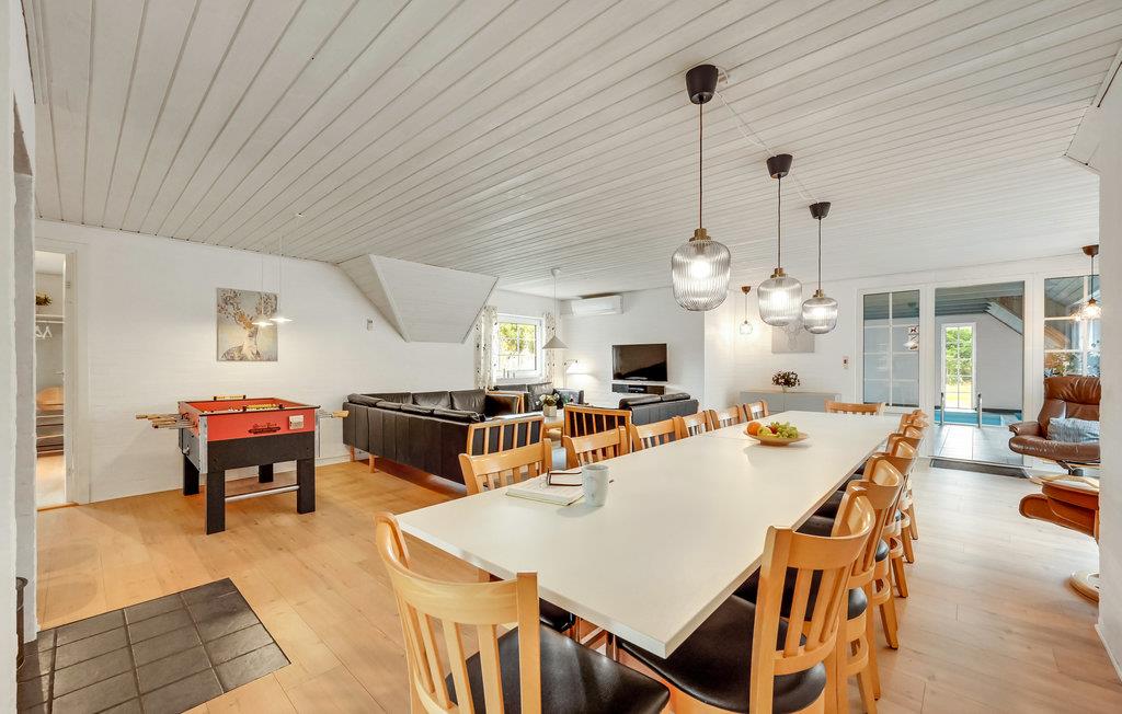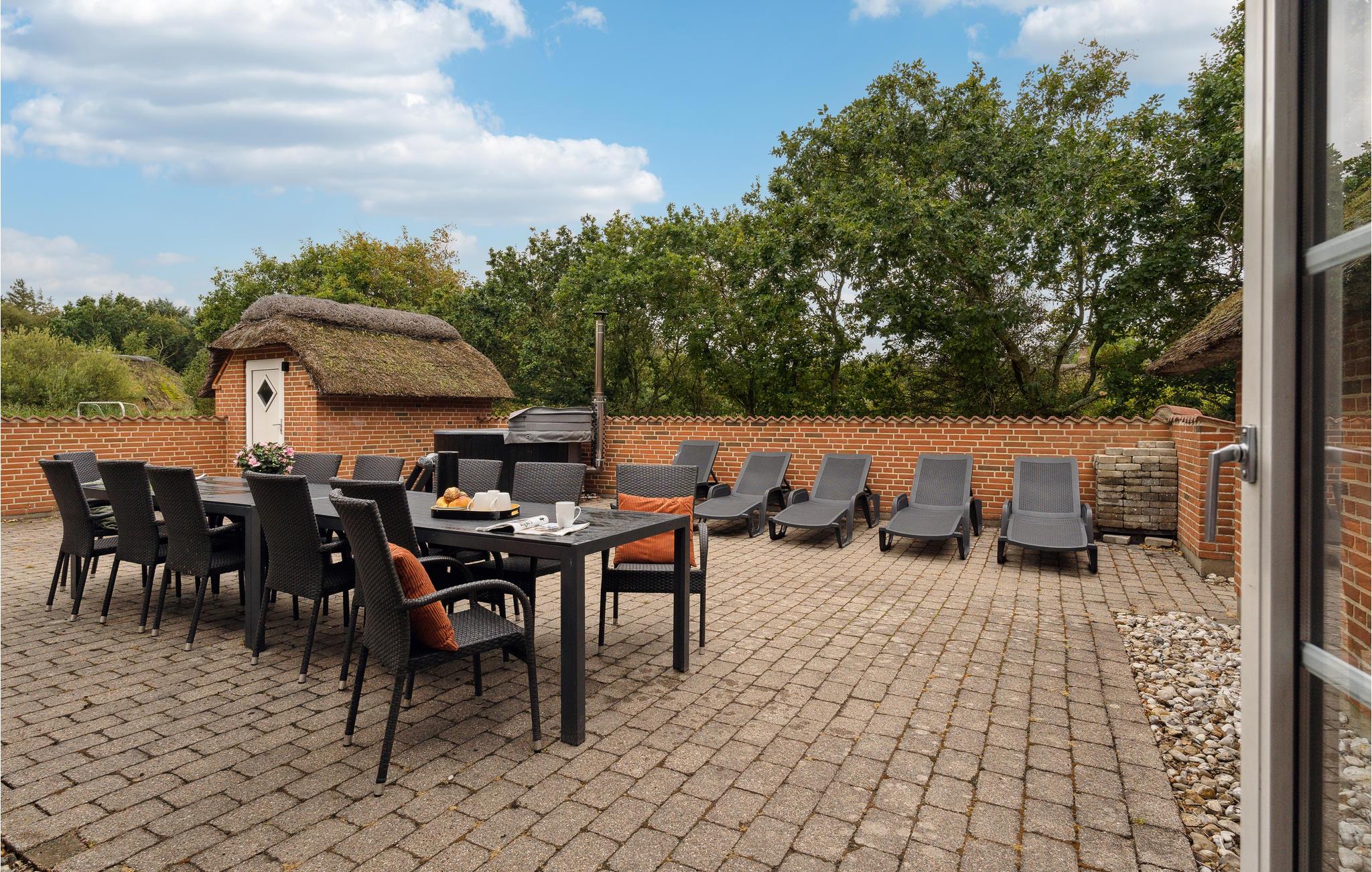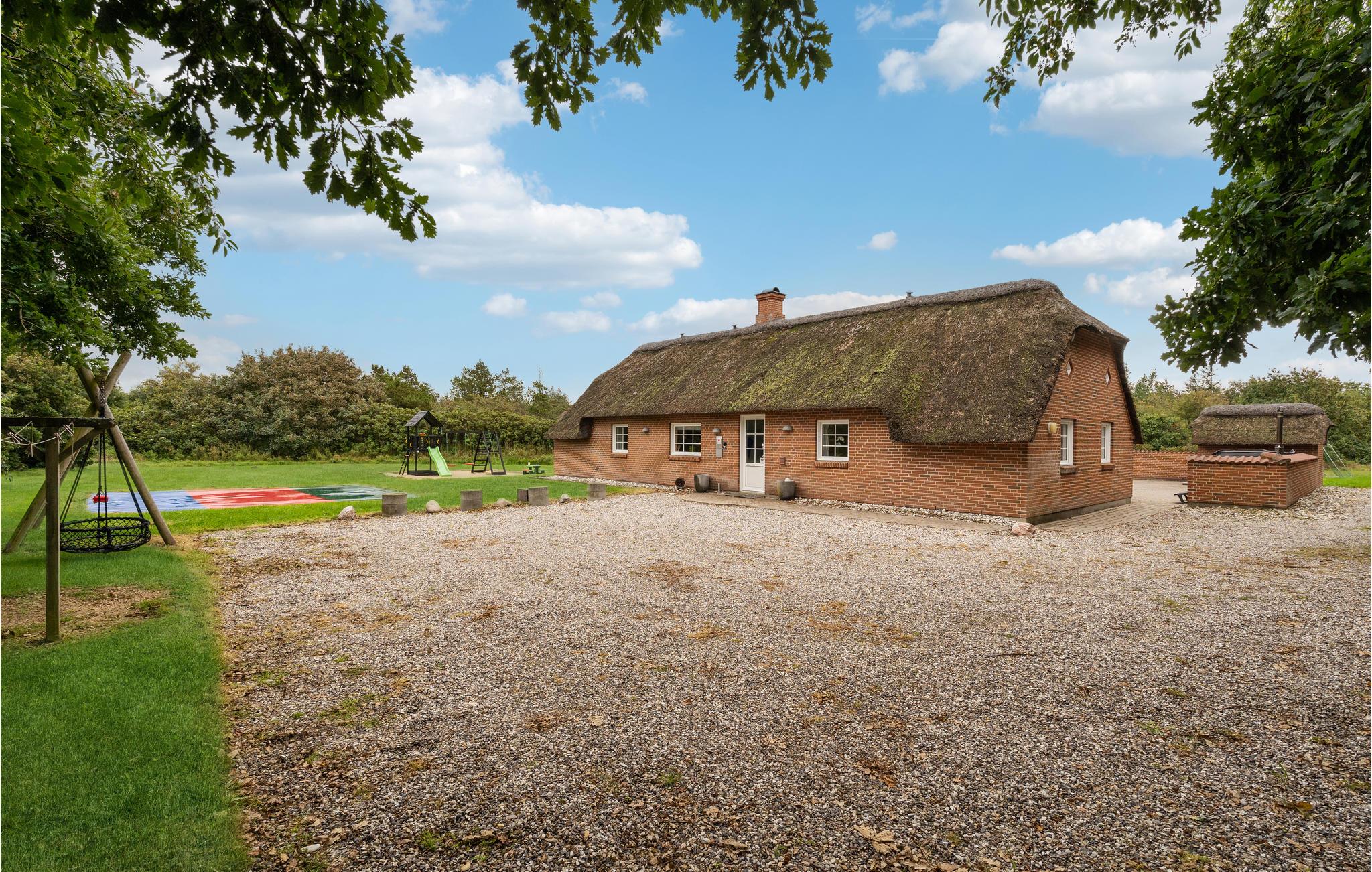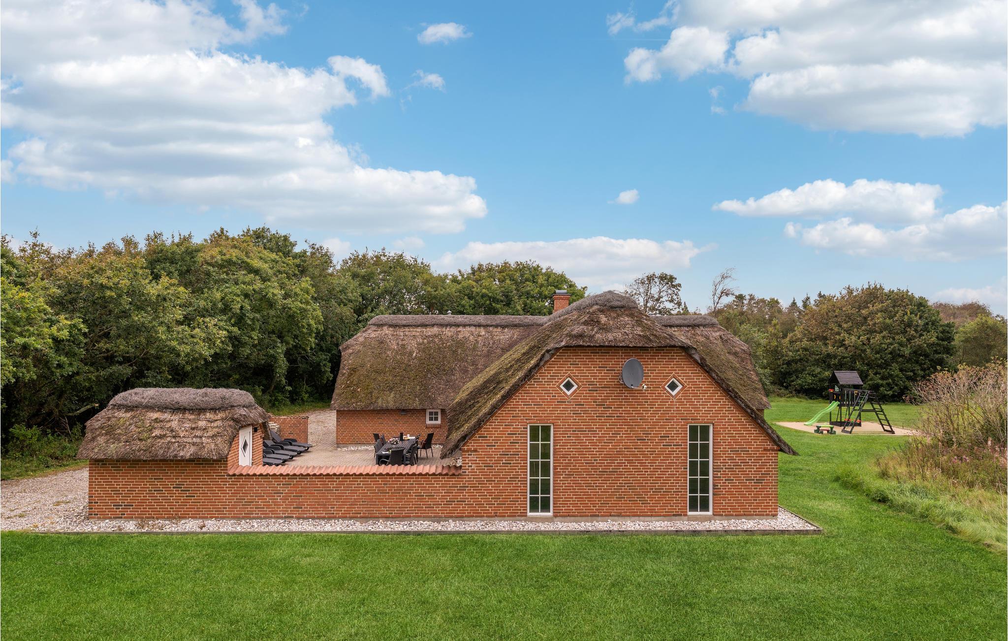 Mellem Søndervig og Thorsminde, på en stor grund i et gammelt klit- og plantageområde, ligger dette rustikke sommerhus med pool og det, for området, så karakteristiske stråtag. Huset er indrettet med ikke mindre end seks soverum, tre badeværelser, et hyggeligt køkken som går i ét med stuen, hvorfra I har direkte adgang til terrassen, som er omgivet af en læ mur og til det dejlige poolrum med rutsjebane, spabad og sauna. Området er ideelt til lange vandre-, cykel- og løbeture på de afmærkede stier, der bl.a. fører ud til Vesterhavet. Uanset hvornår I vælger at holde ferie i det vestjyske, bør I opleve Vesterhavet, som er meget fascinerende. I området ligger der bl.a. flere små lokale havne, hvor I kan nyde roen, lege på legepladsen, som varierer fra havn til havn og måske opleve de lokale komme ind med dagens fangst. I Husby ligger der en mindre hundeskov, hvor de firebenede kan boltre sig med ligesindede. Kører I mod nord, kommer I til Thorsminde, som ligger ganske unikt på en tange mellem Nissum fjord og Vesterhavet. Her kan I opleve det lokale havnemiljø, smide snøren ud og fange en fisk, og lykkes det ikke, kan I købe friske fisk på havnen. På havnen finder I også strandingsmuseet Sct. George, som har en stor samling af effekter, som dykkere har hentet op fra vragene fra bl.a. de to engelske krigsskibe, som forliste i julen 1811, hvor kun 17 overlever ud af en besætning på ca. 1.400 medlemmer.