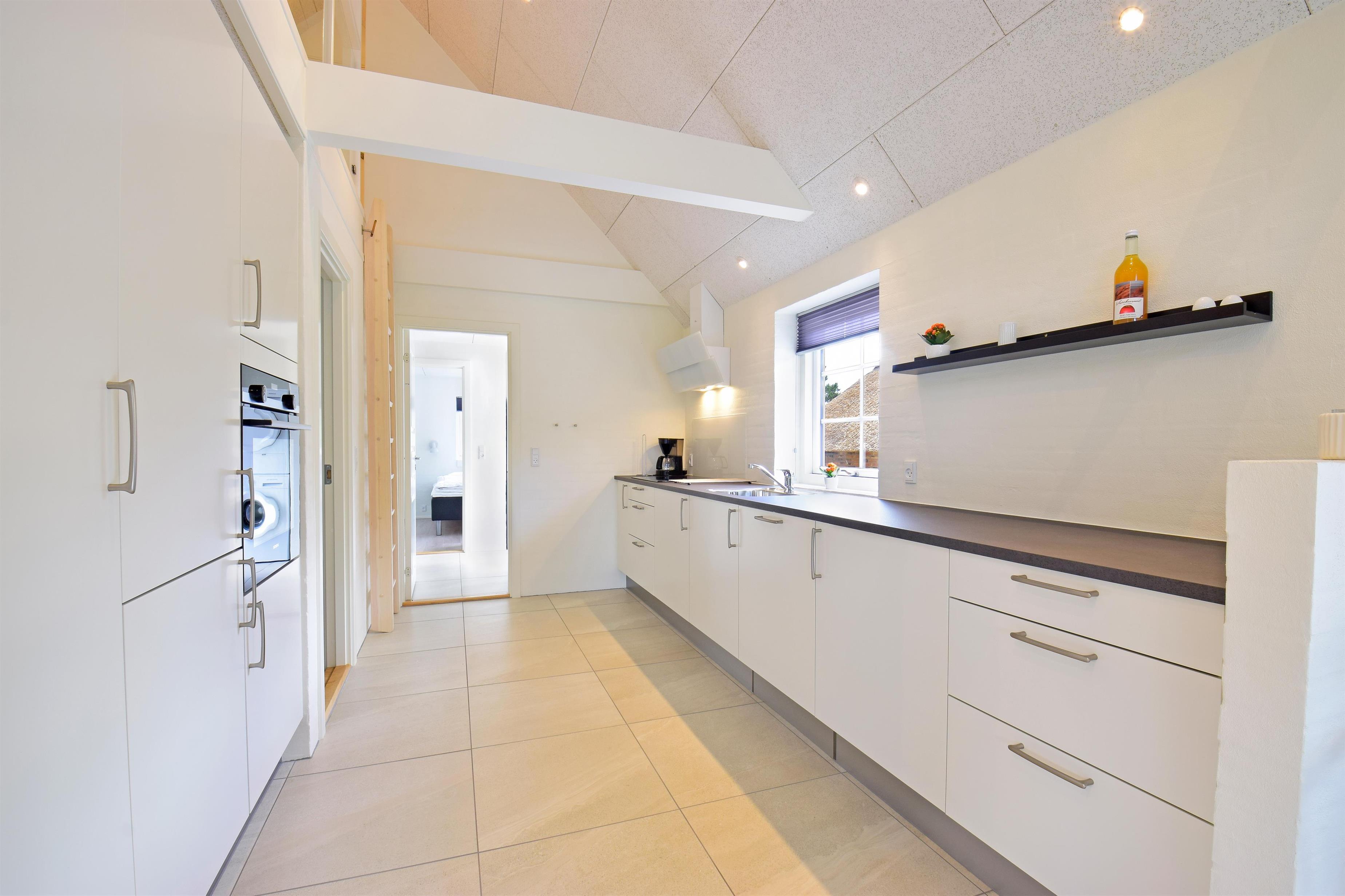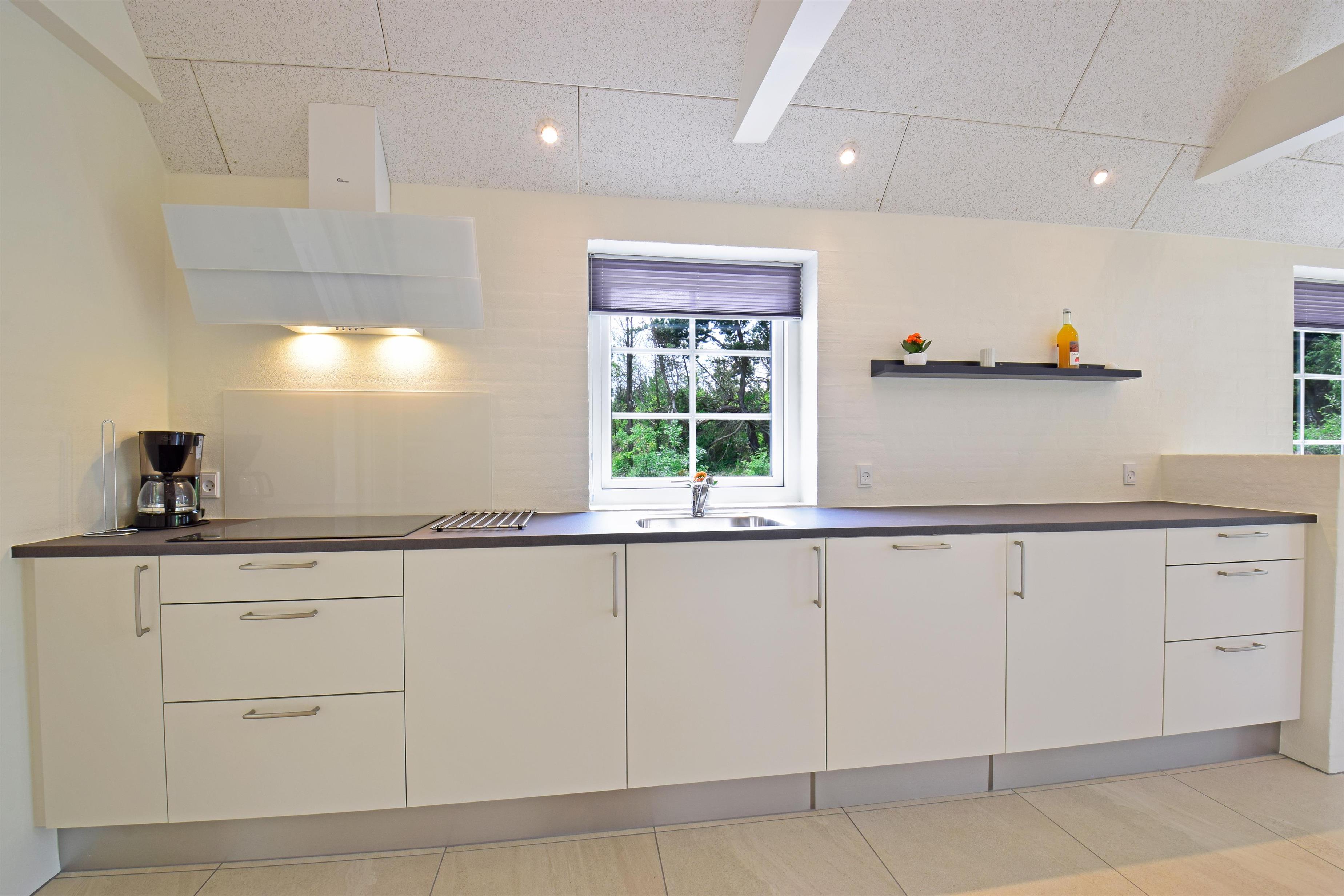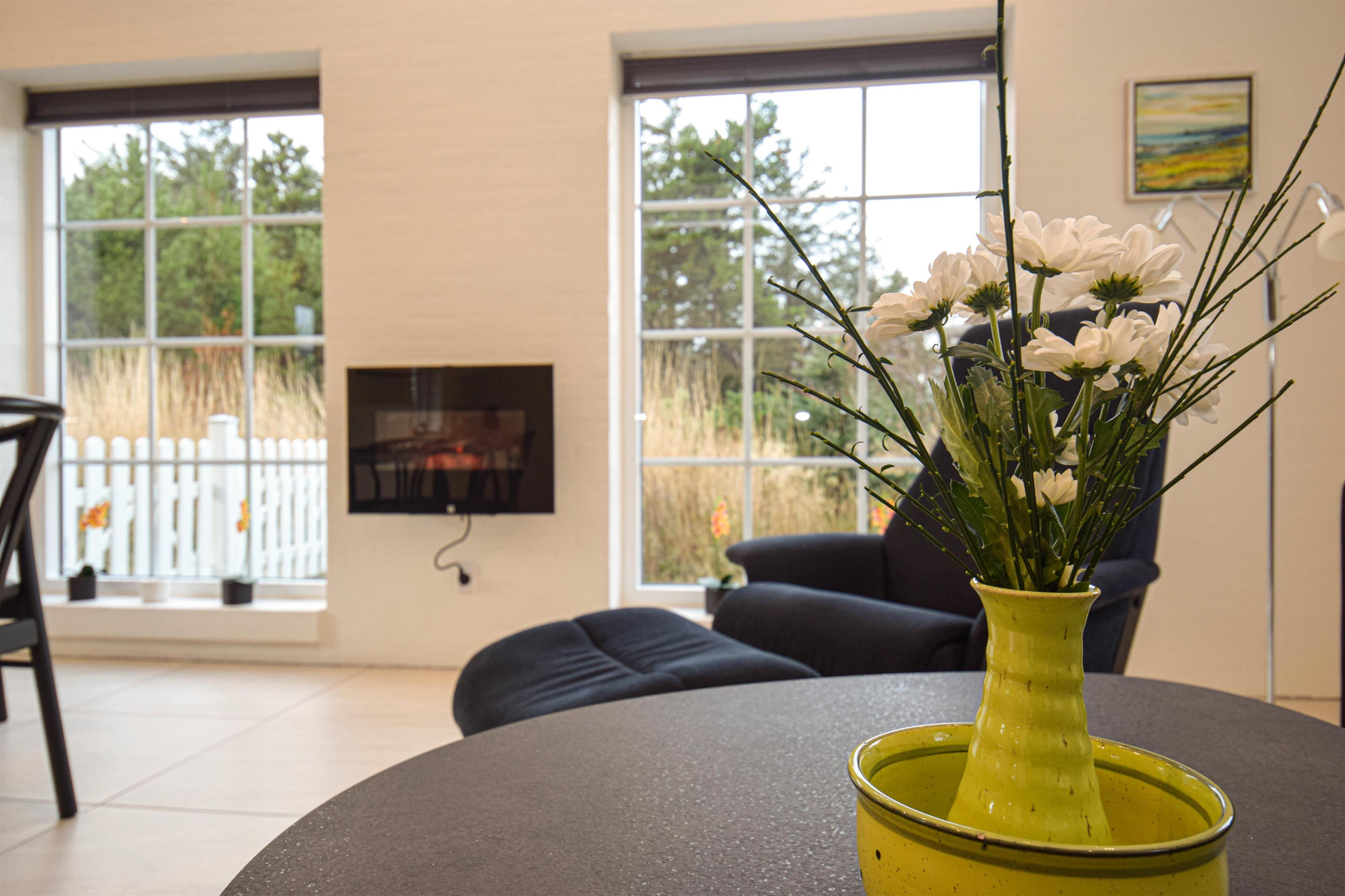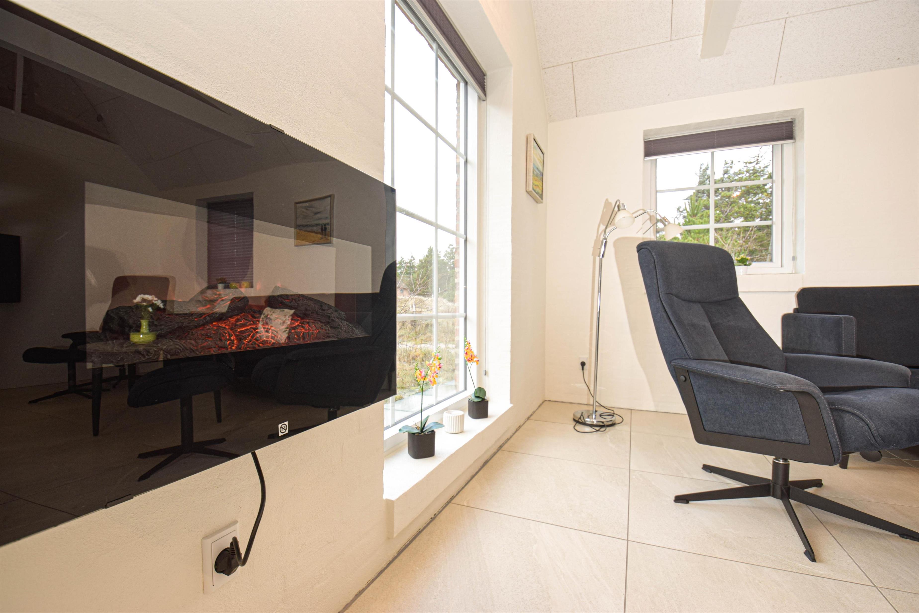 Den elektriske pejs spreder ekstra hygge på kølige dage, og i køkkenet er alt, hvad der behøves til en afslappet ferie.