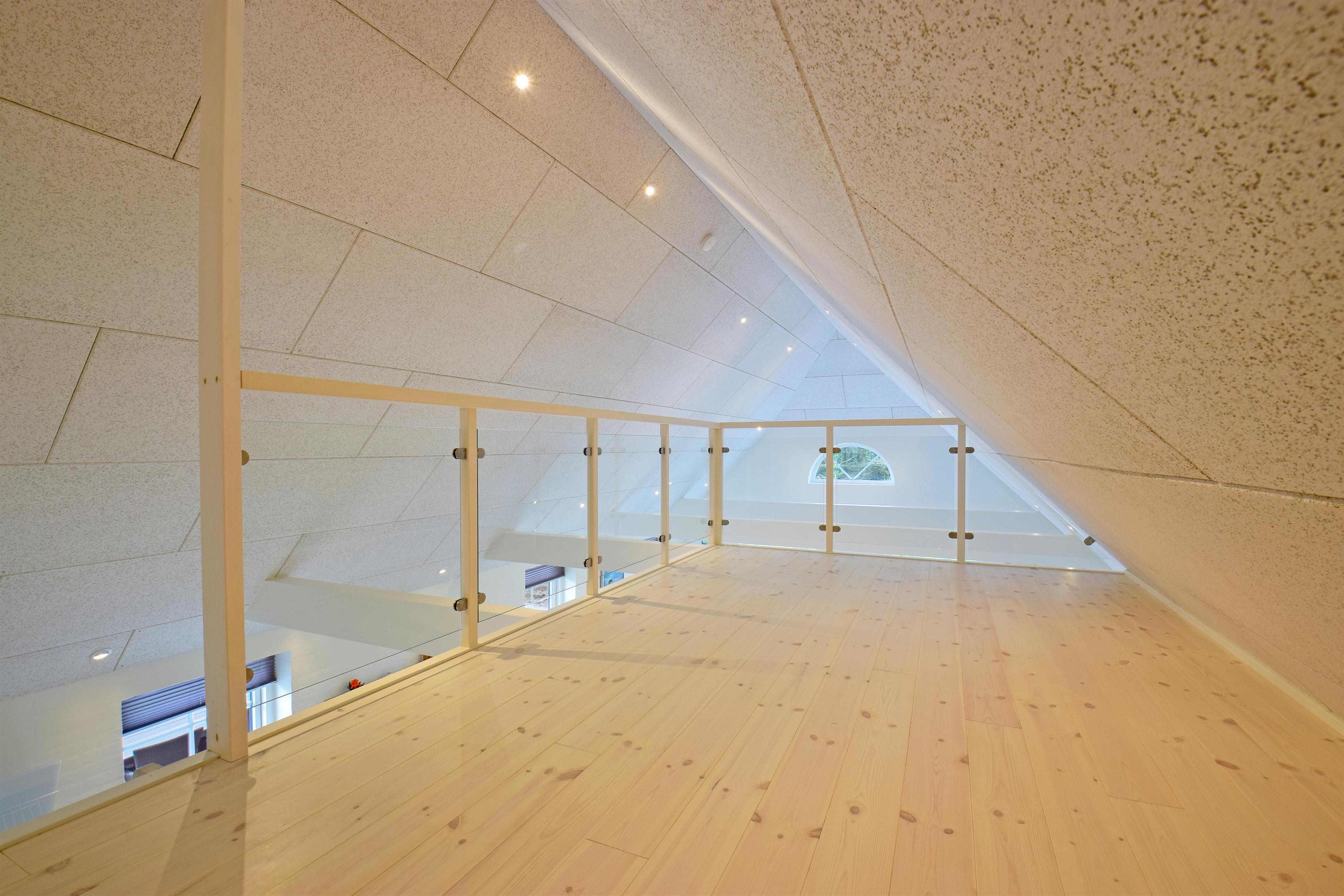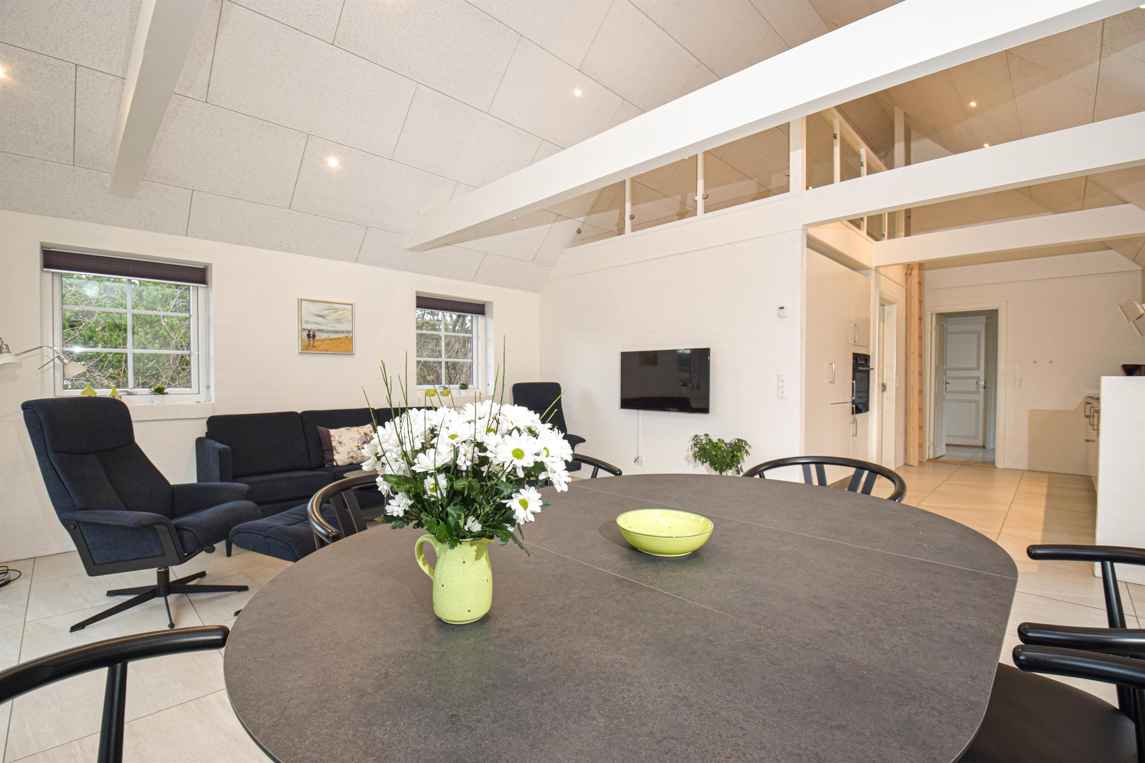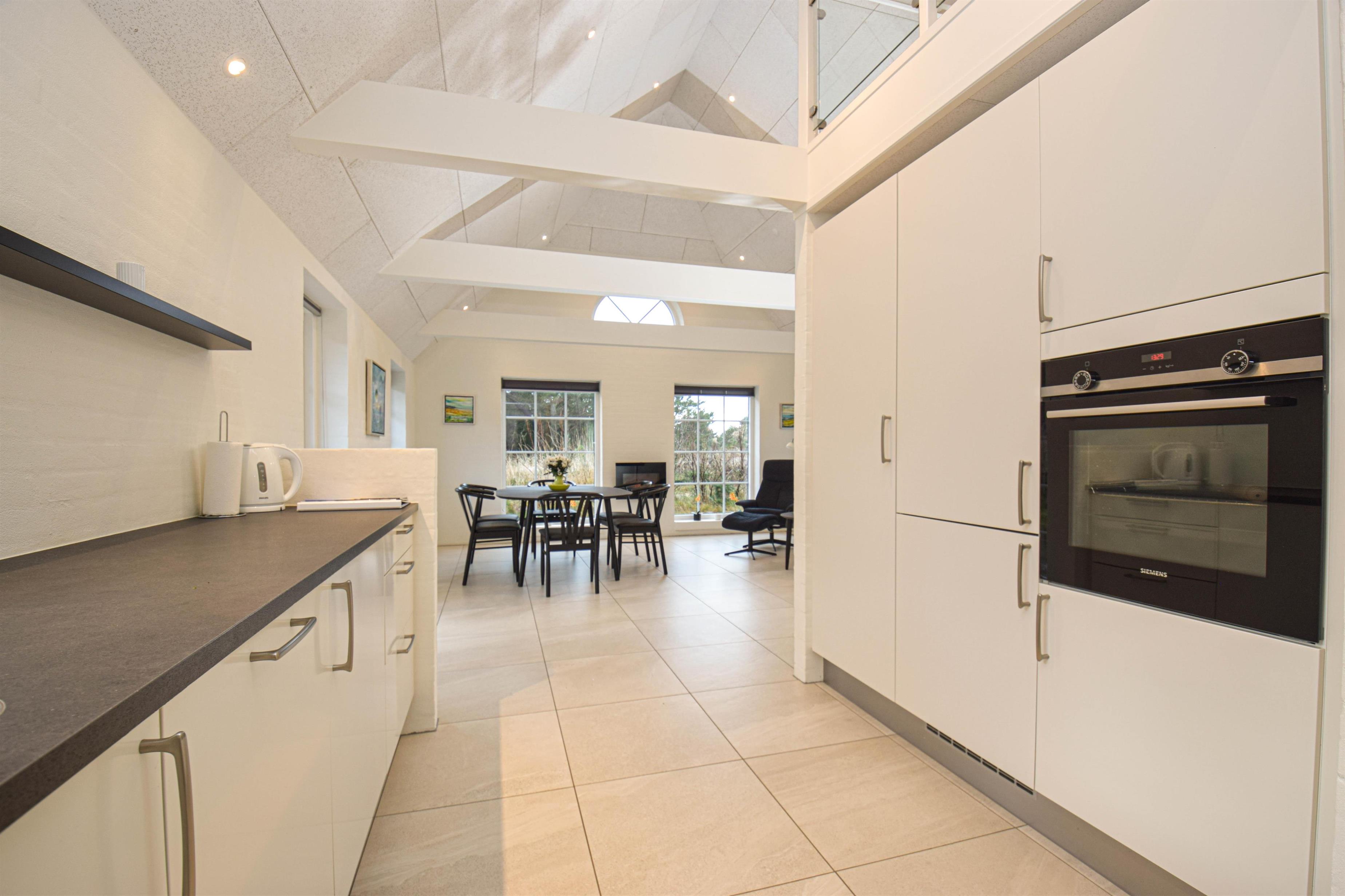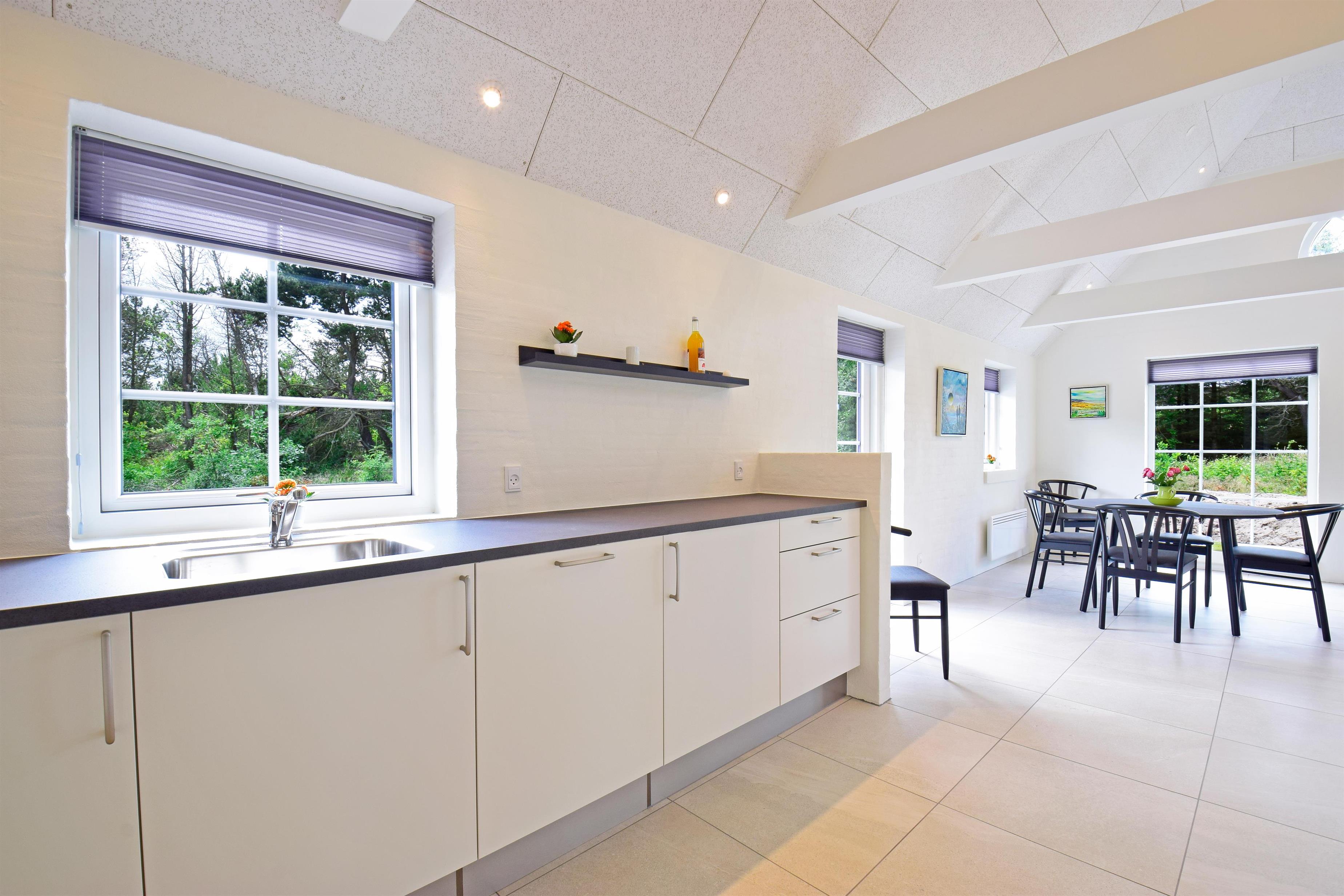 De store vinduespartier mod vest sikrer et skønt lysindfald og en flot udsigt over naturen, mens lofterne til kip giver rummelighed og luft i stue og køkken.
