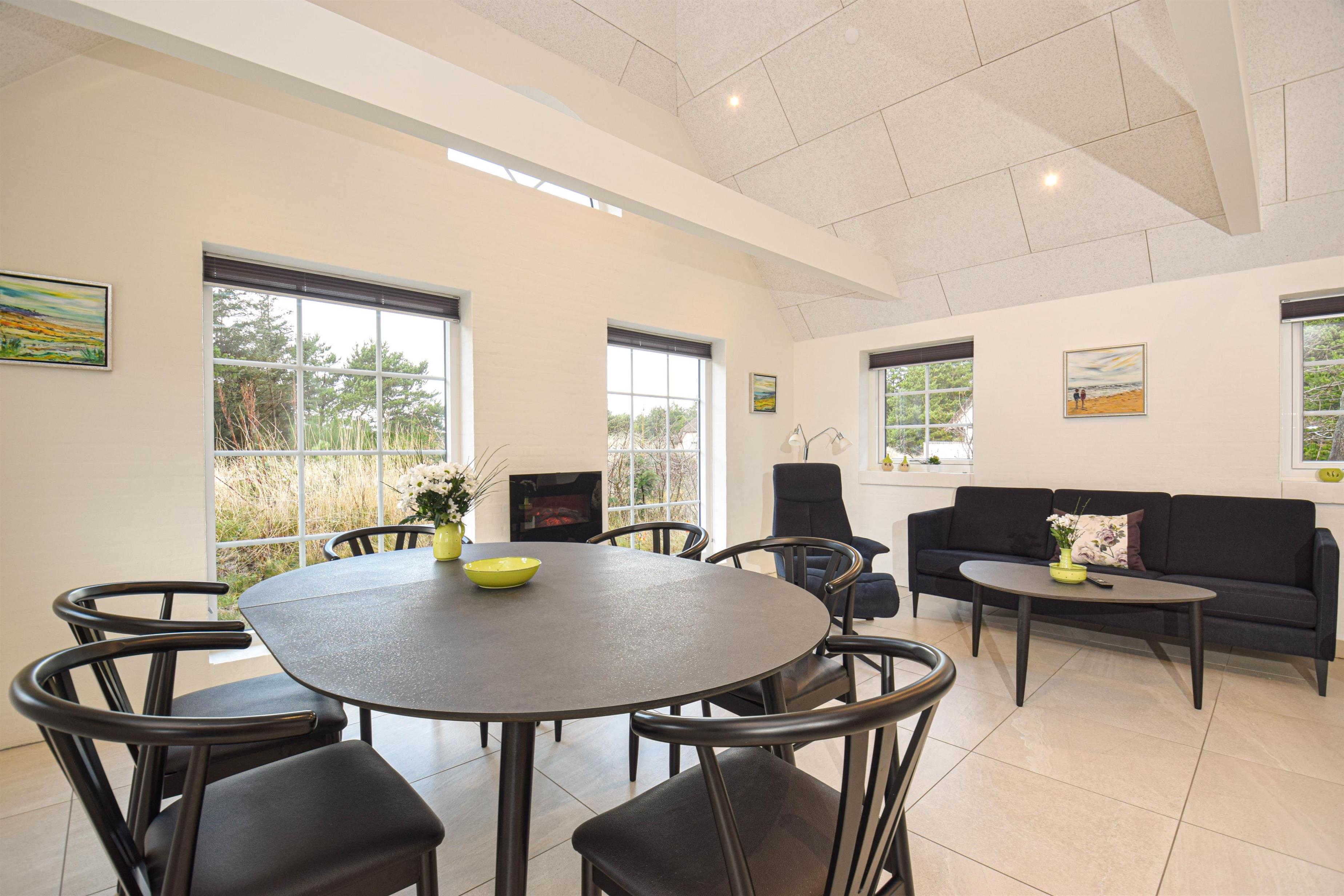 Stue med spiseplads, sofagruppe, elpejs og store vinduer mod vest