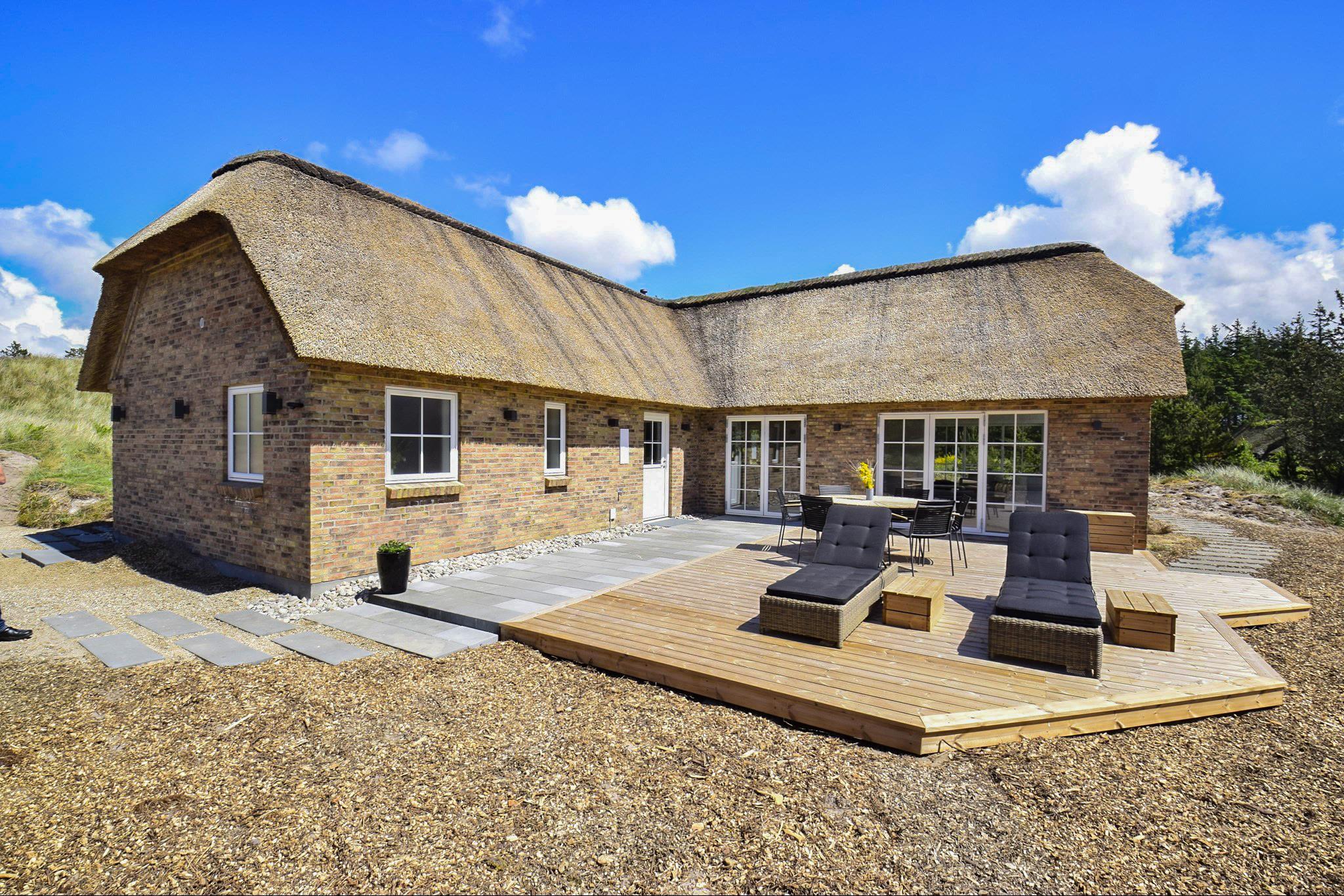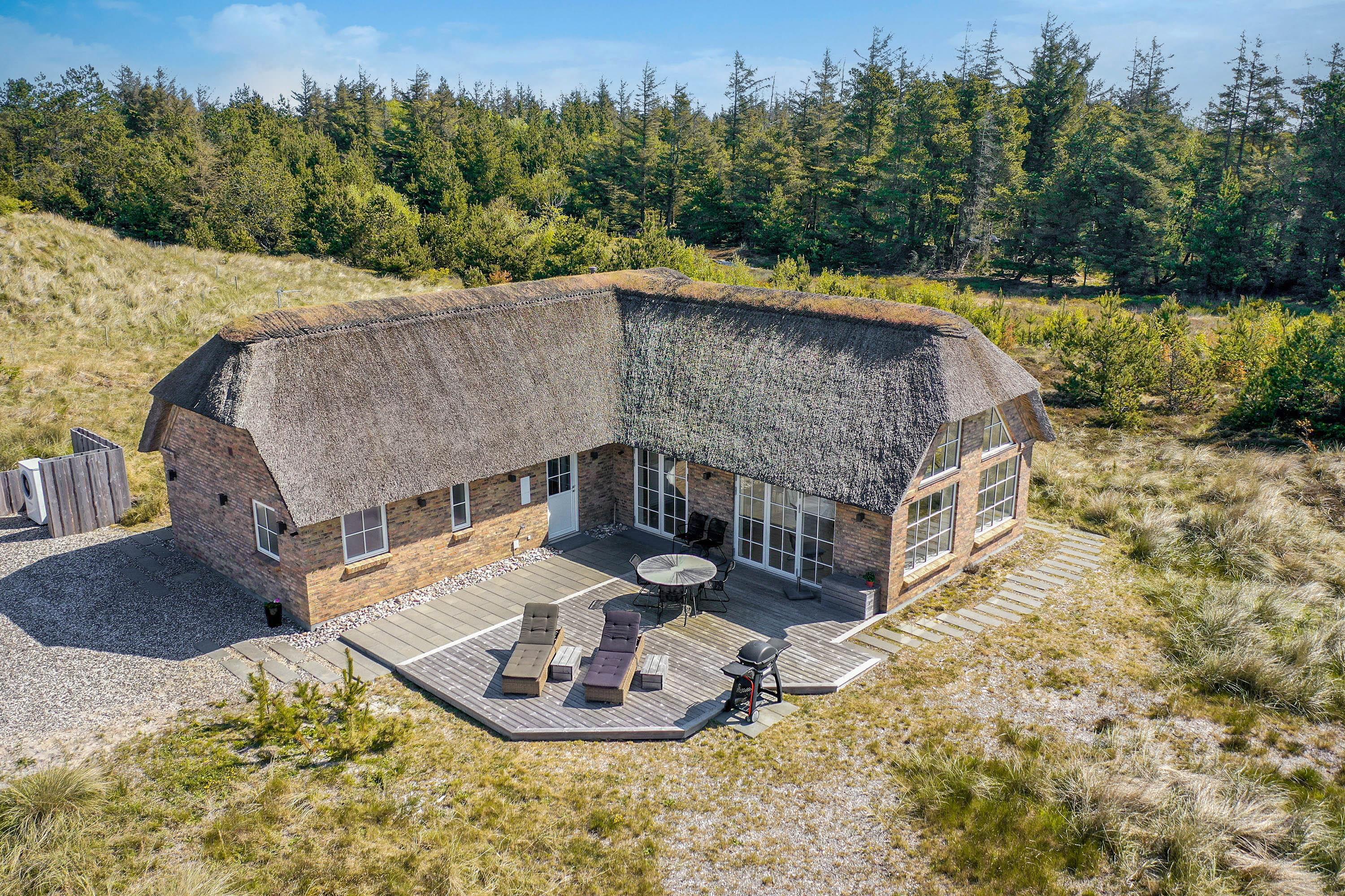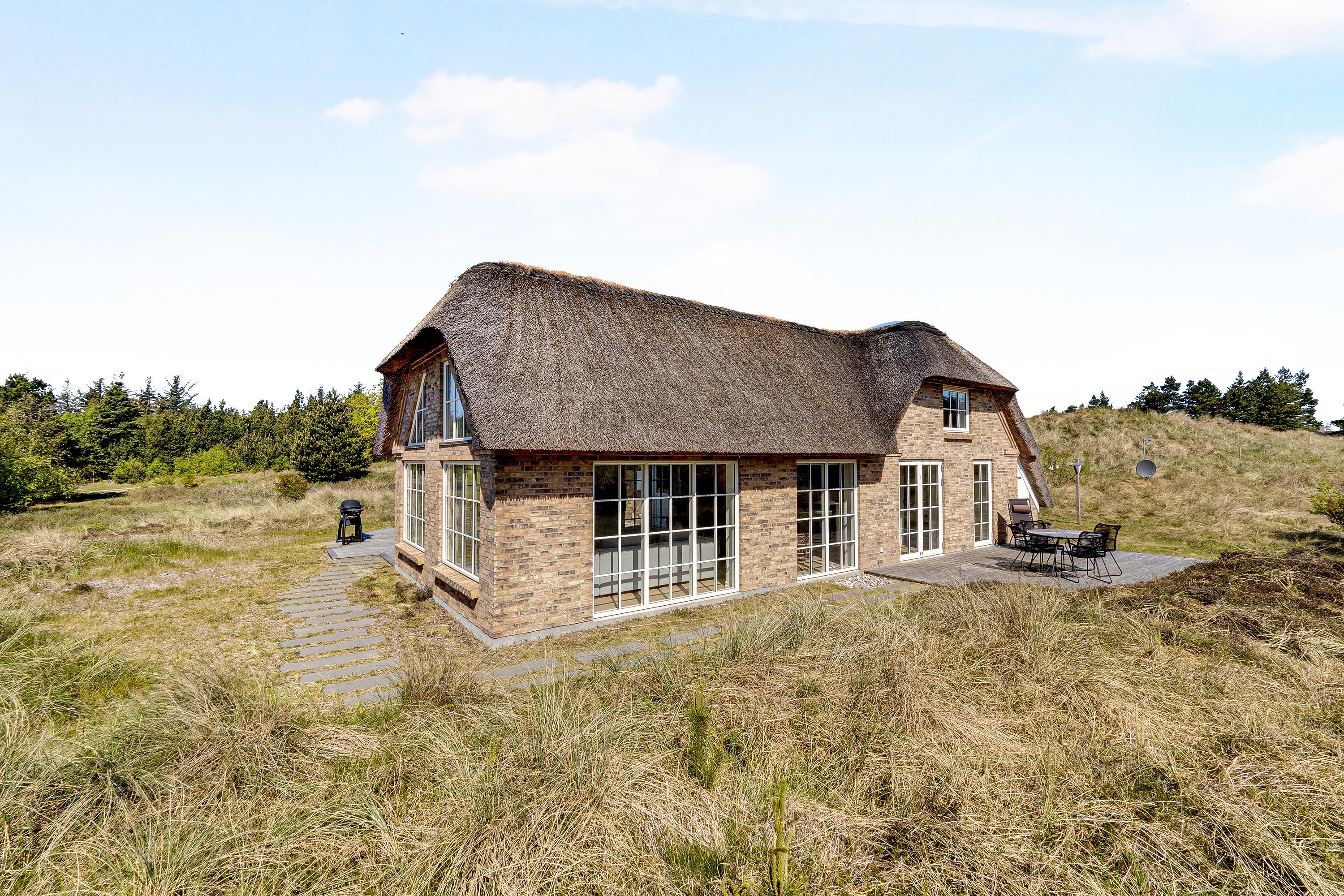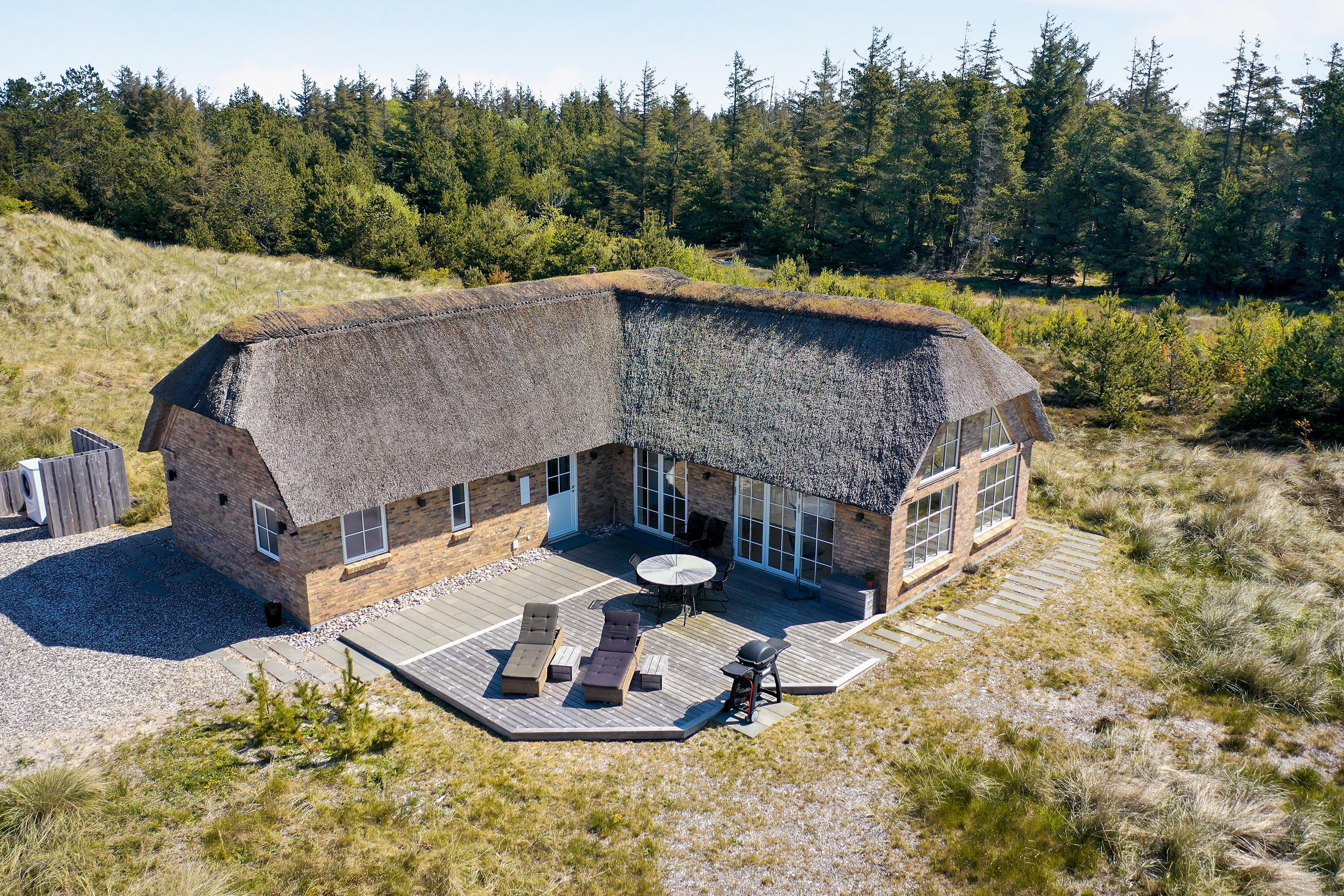 Dette flotte nye feriehus er beliggende på en smuk kuperet klitgrund med lyng planter og marehalm. Huset er bygget med bl.a. store vinduespartier så det smukke klitlandskab kan nydes både ude og inde.Rundt om huset er der gode terrasser, så man altid kan finde et hjørne med læ og nyde udelivet med havets brusen i baggrunden.