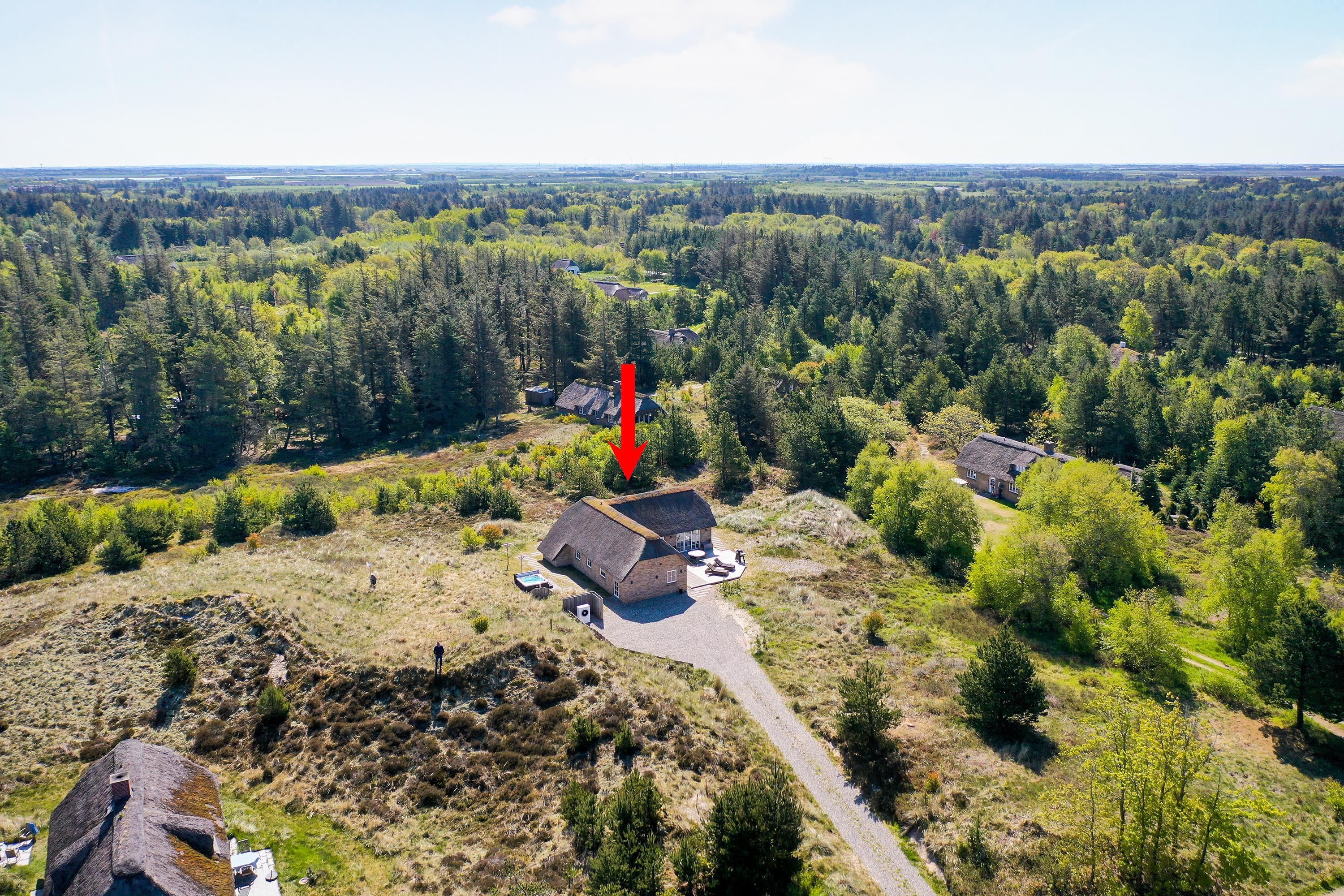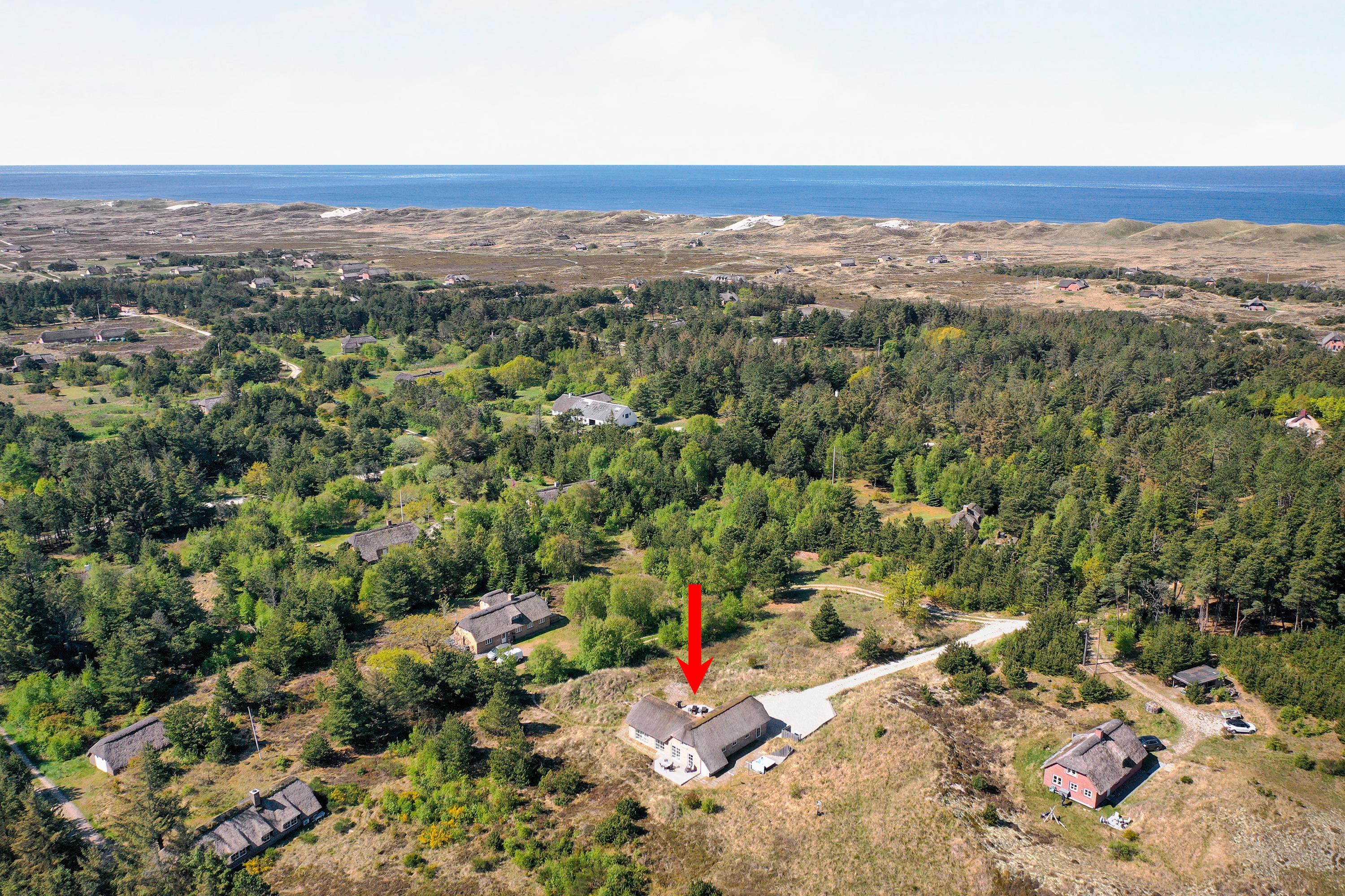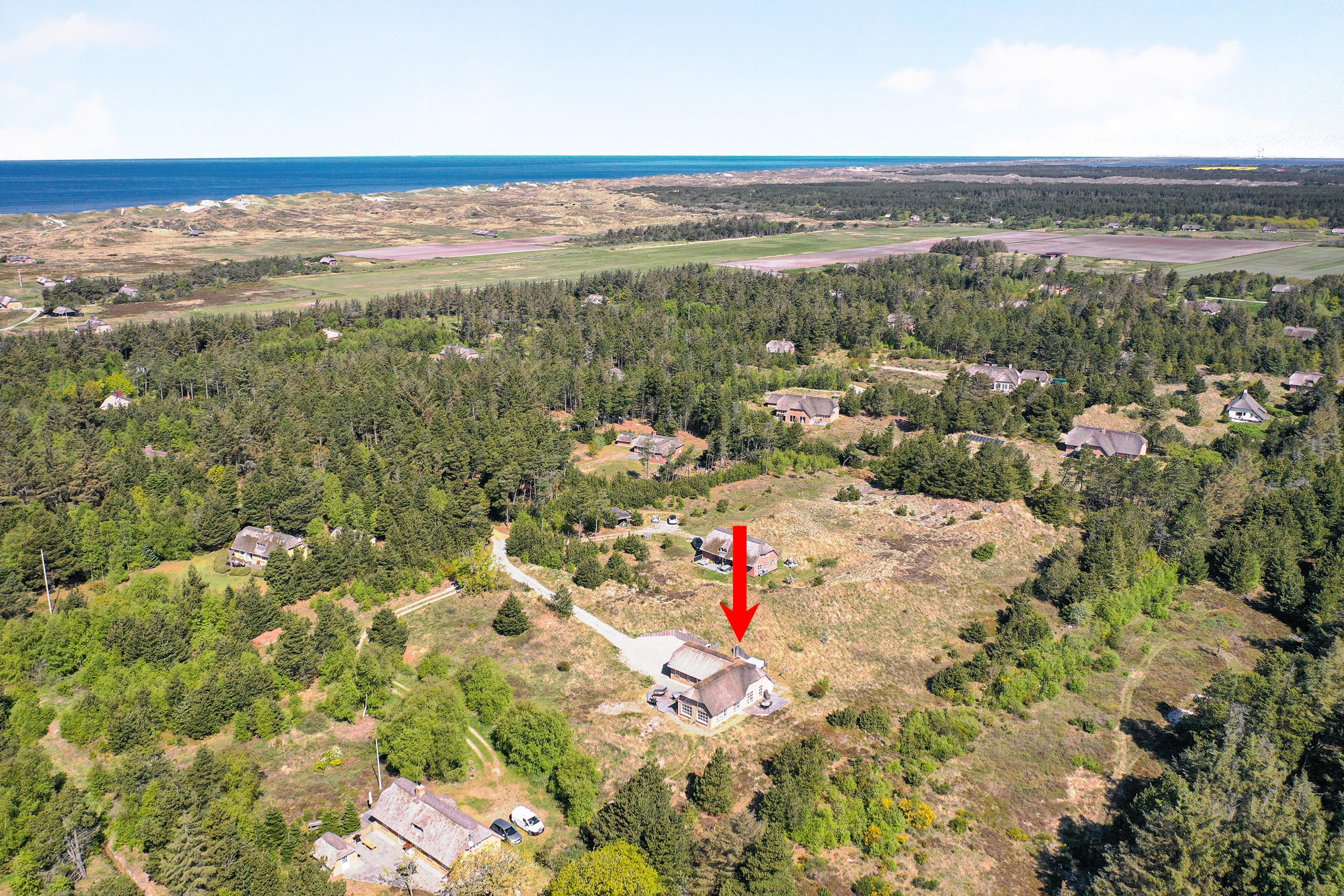 Dette flotte nye feriehus er beliggende på en smuk kuperet klitgrund med lyng planter og marehalm. Huset er bygget med bl.a. store vinduespartier så det smukke klitlandskab kan nydes både ude og inde.Rundt om huset er der gode terrasser, så man altid kan finde et hjørne med læ og nyde udelivet med havets brusen i baggrunden.