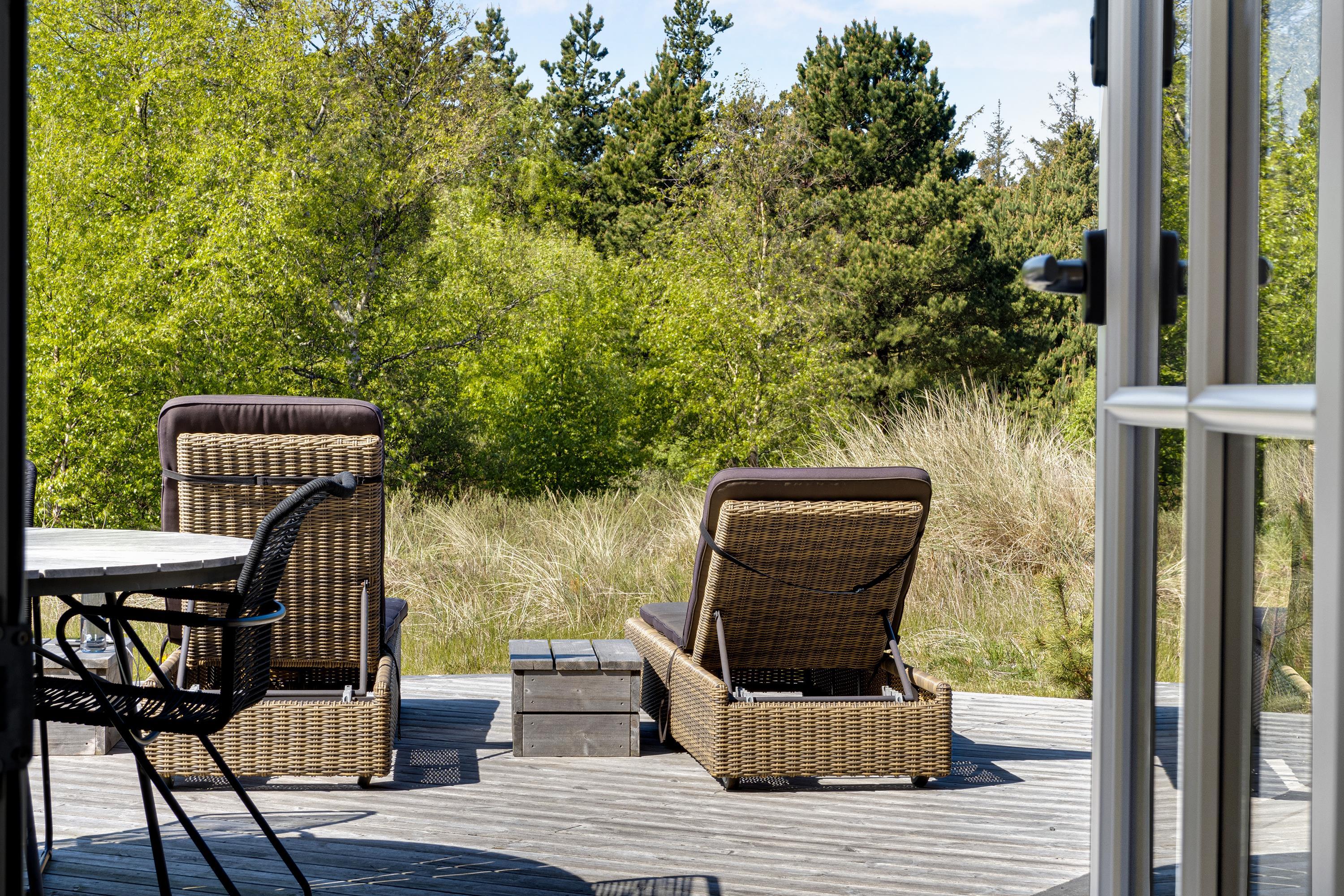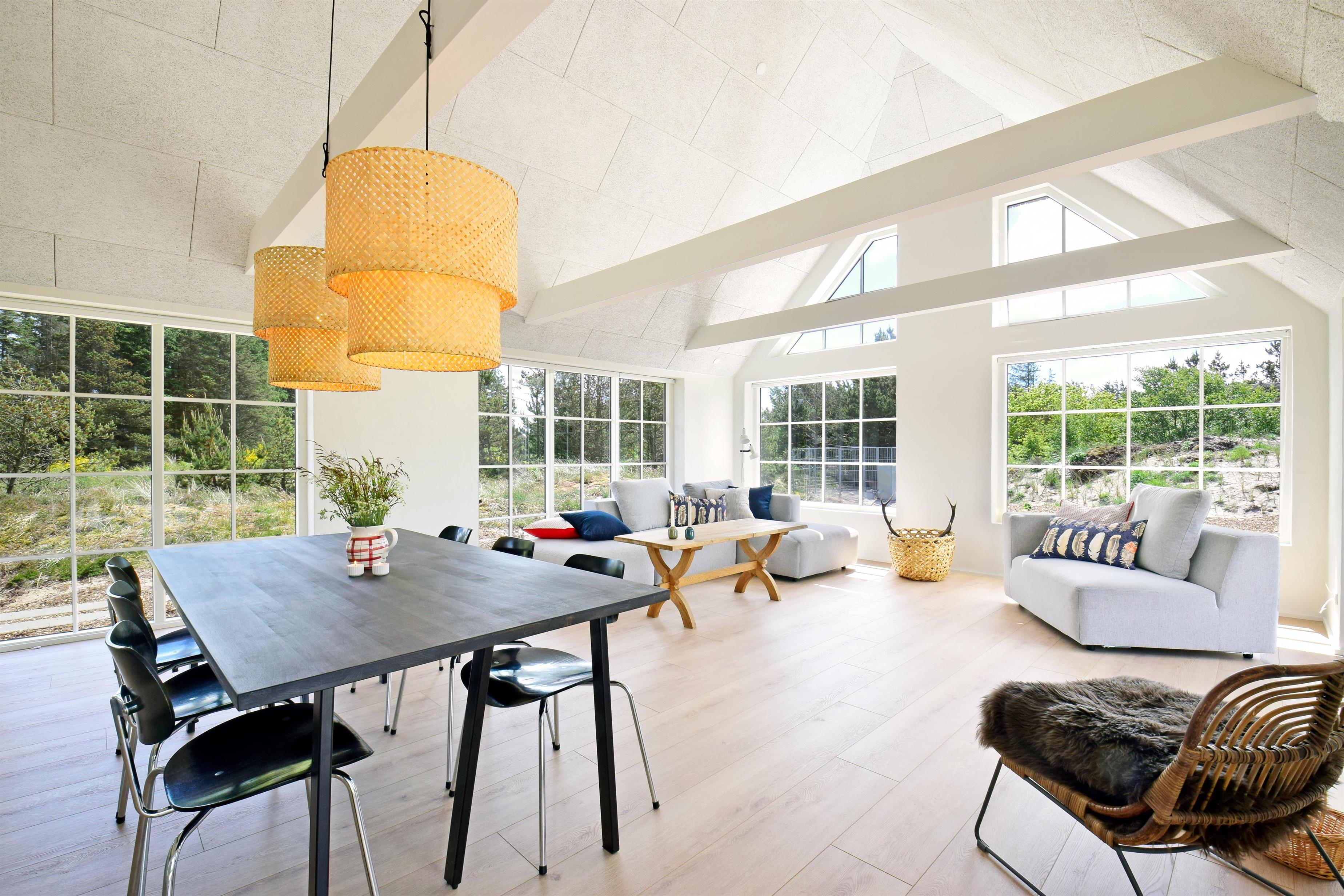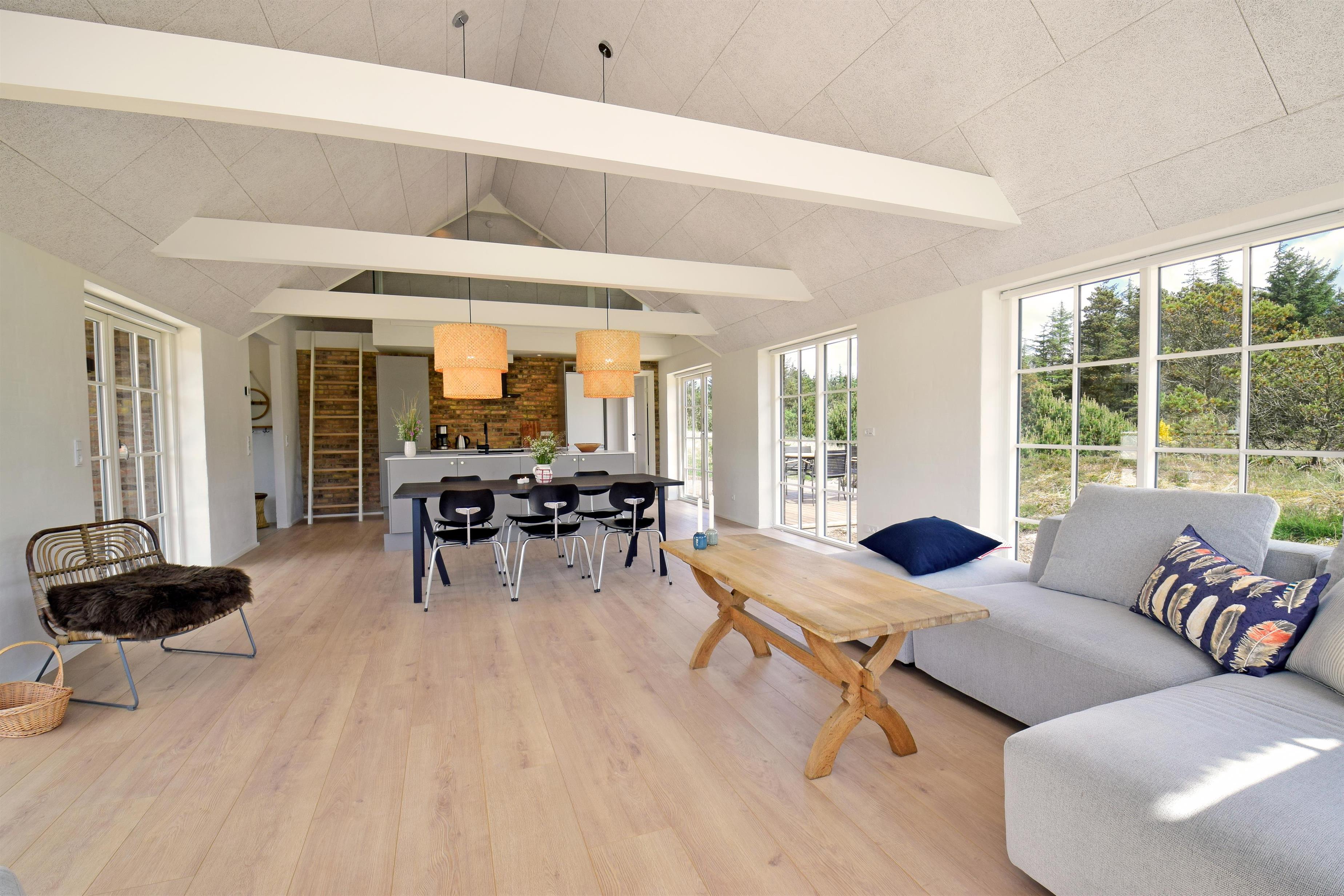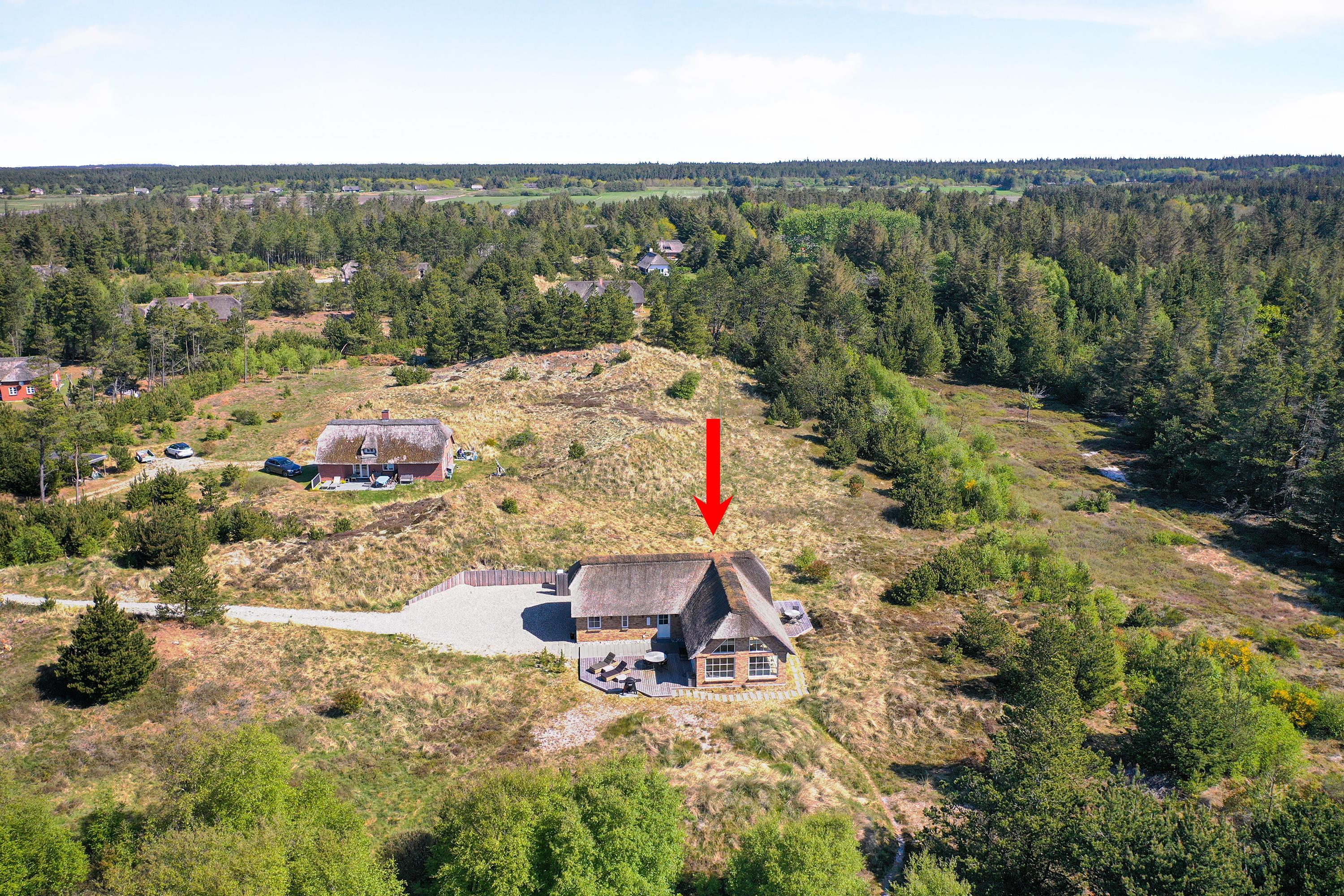 Dette flotte nye feriehus er beliggende på en smuk kuperet klitgrund med lyng planter og marehalm. Huset er bygget med bl.a. store vinduespartier så det smukke klitlandskab kan nydes både ude og inde.Rundt om huset er der gode terrasser, så man altid kan finde et hjørne med læ og nyde udelivet med havets brusen i baggrunden.